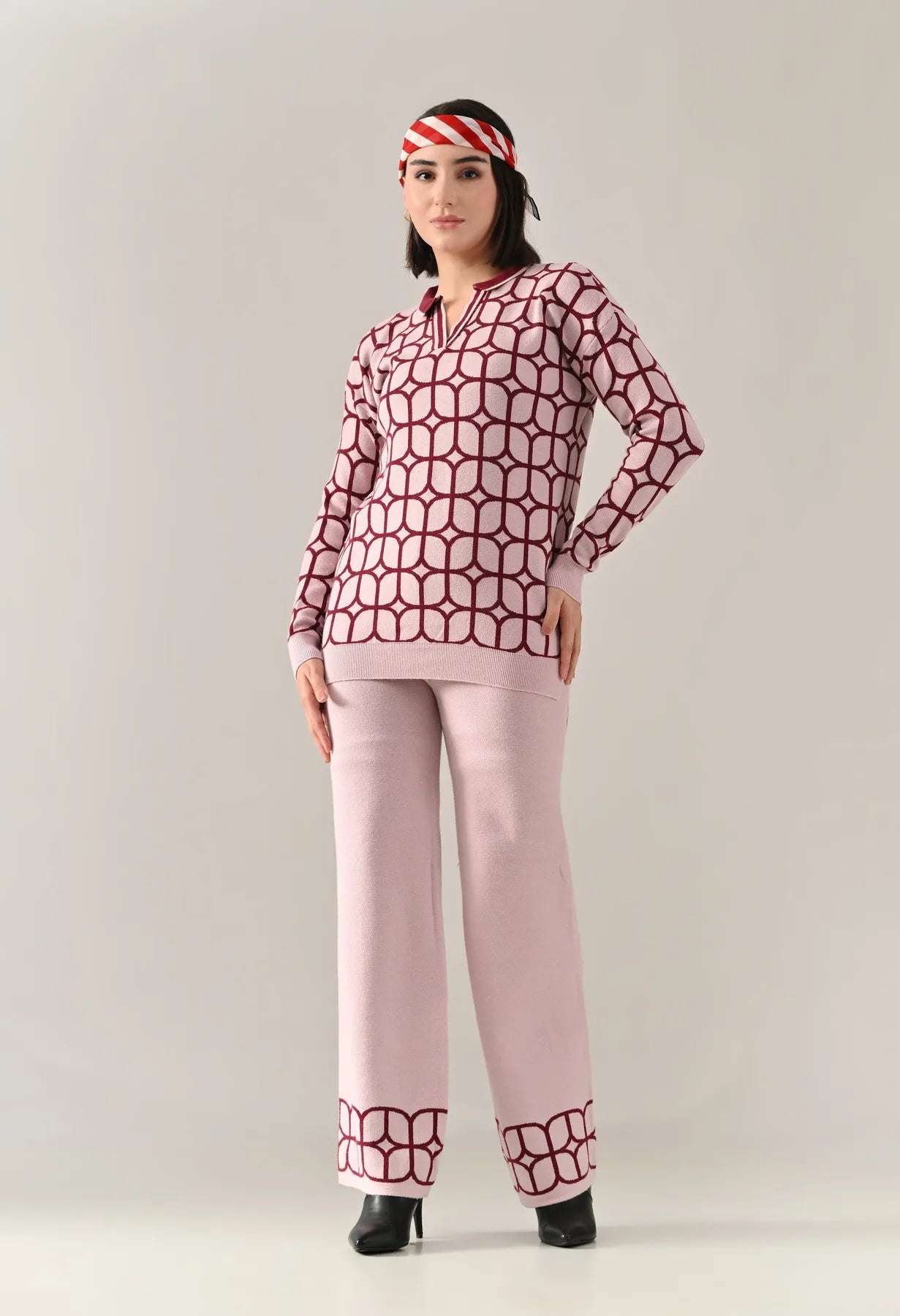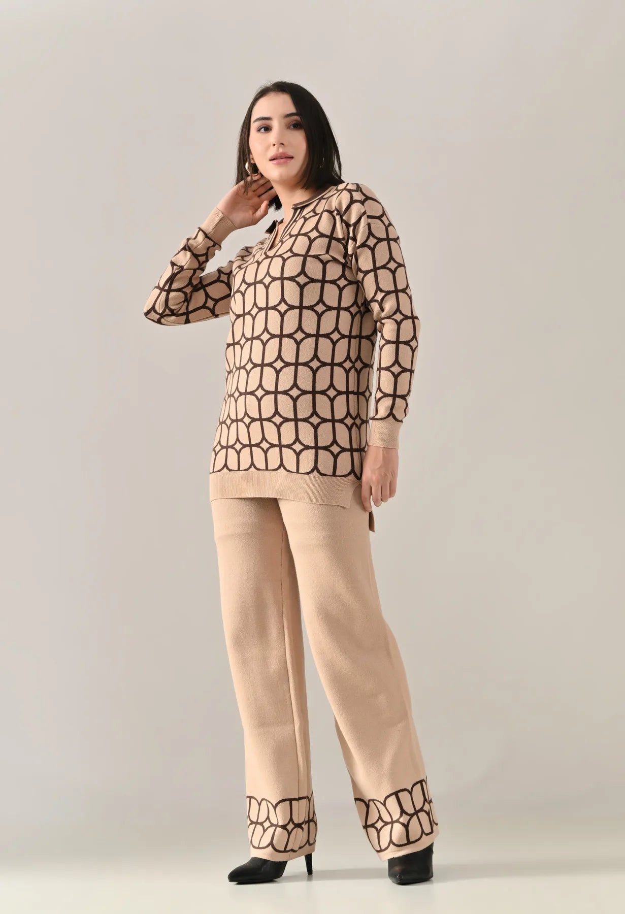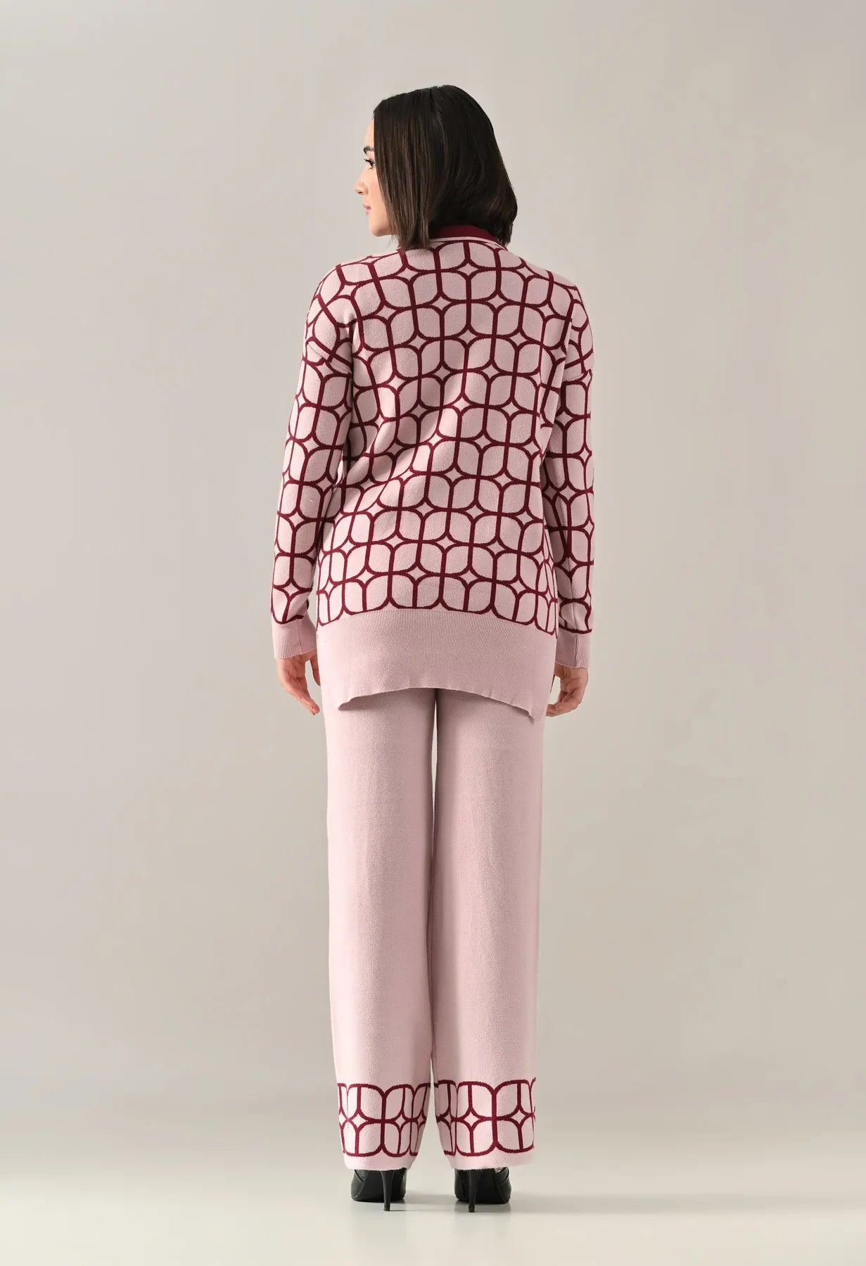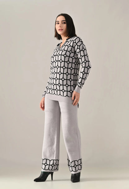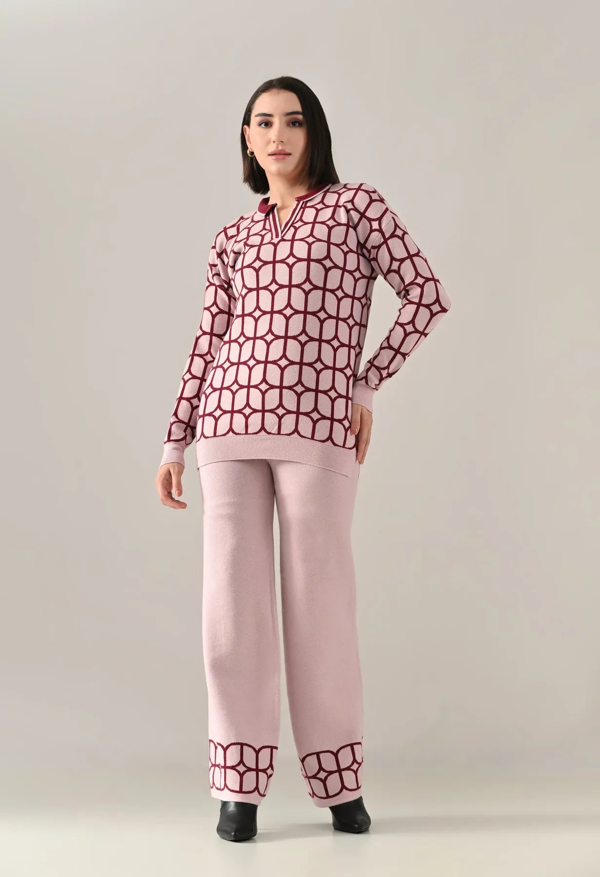 A chic sweater-knitted co-ord set featuring a collared V-neck top with long fitted sleeves and rib detailing at the hem and sleeve openings. Designed with a high-low front and back hem and side slits for a modern silhouette. The straight solid lower include a broad elasticated waist and ribbed hem, offering a perfect blend of style and comfort. Showcasing geometric pattern, this set is crafted from soft, comfortable, and stretchable fabric, ideal for a cozy yet elegant look.
