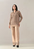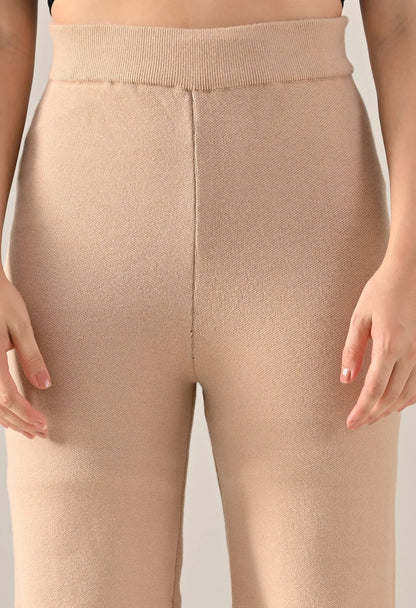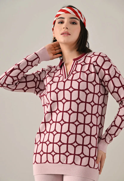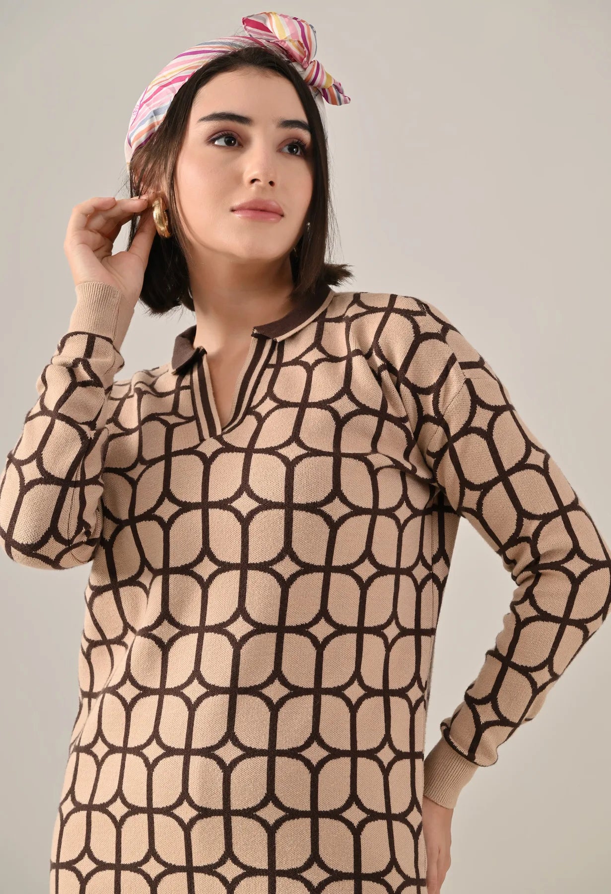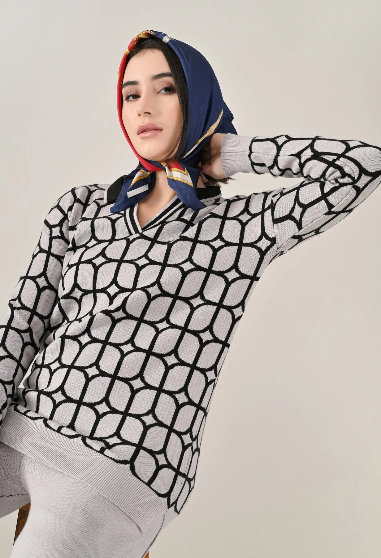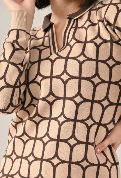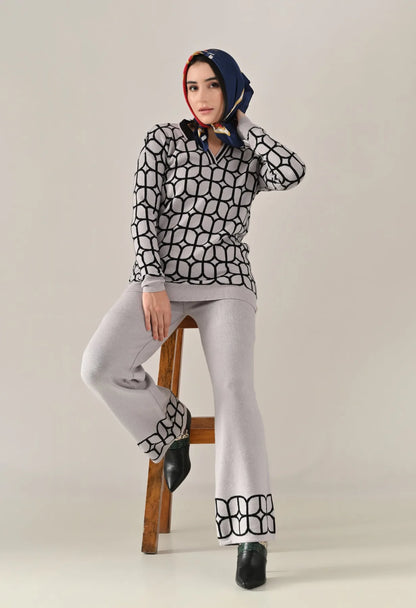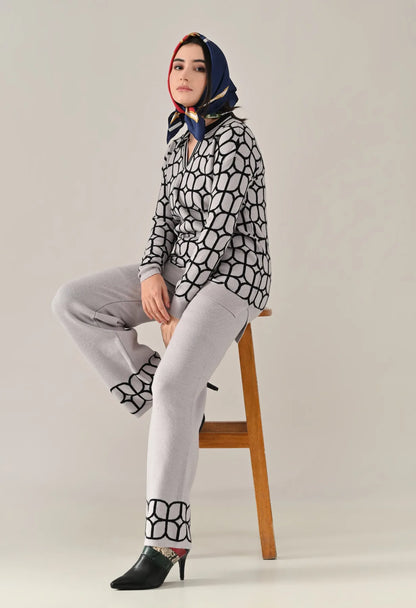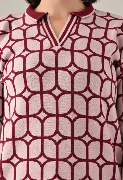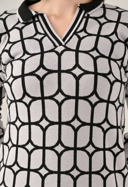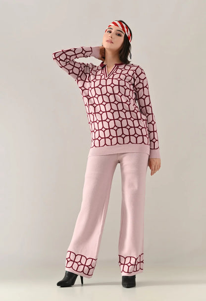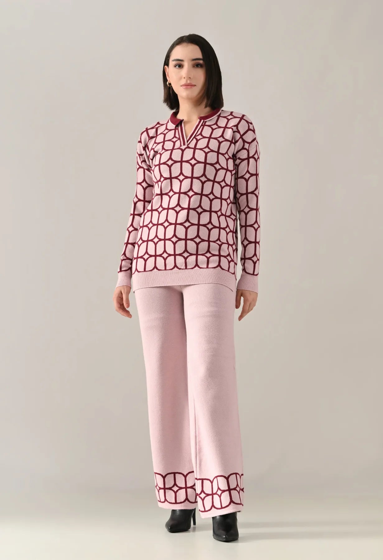 A chic sweater-knitted co-ord set featuring a collared V-neck top with long fitted sleeves and rib detailing at the hem and sleeve openings. Designed with a high-low front and back hem and side slits for a modern silhouette. The straight solid lower include a broad elasticated waist and ribbed hem, offering a perfect blend of style and comfort. Showcasing geometric pattern, this set is crafted from soft, comfortable, and stretchable fabric, ideal for a cozy yet elegant look.