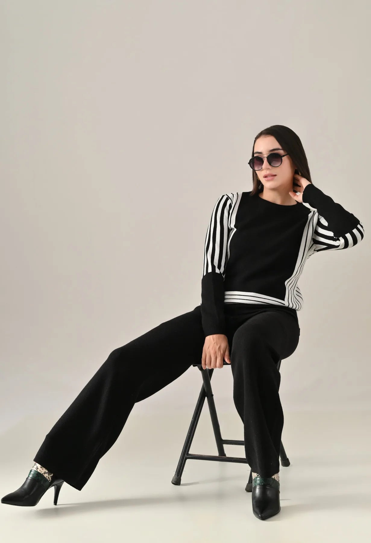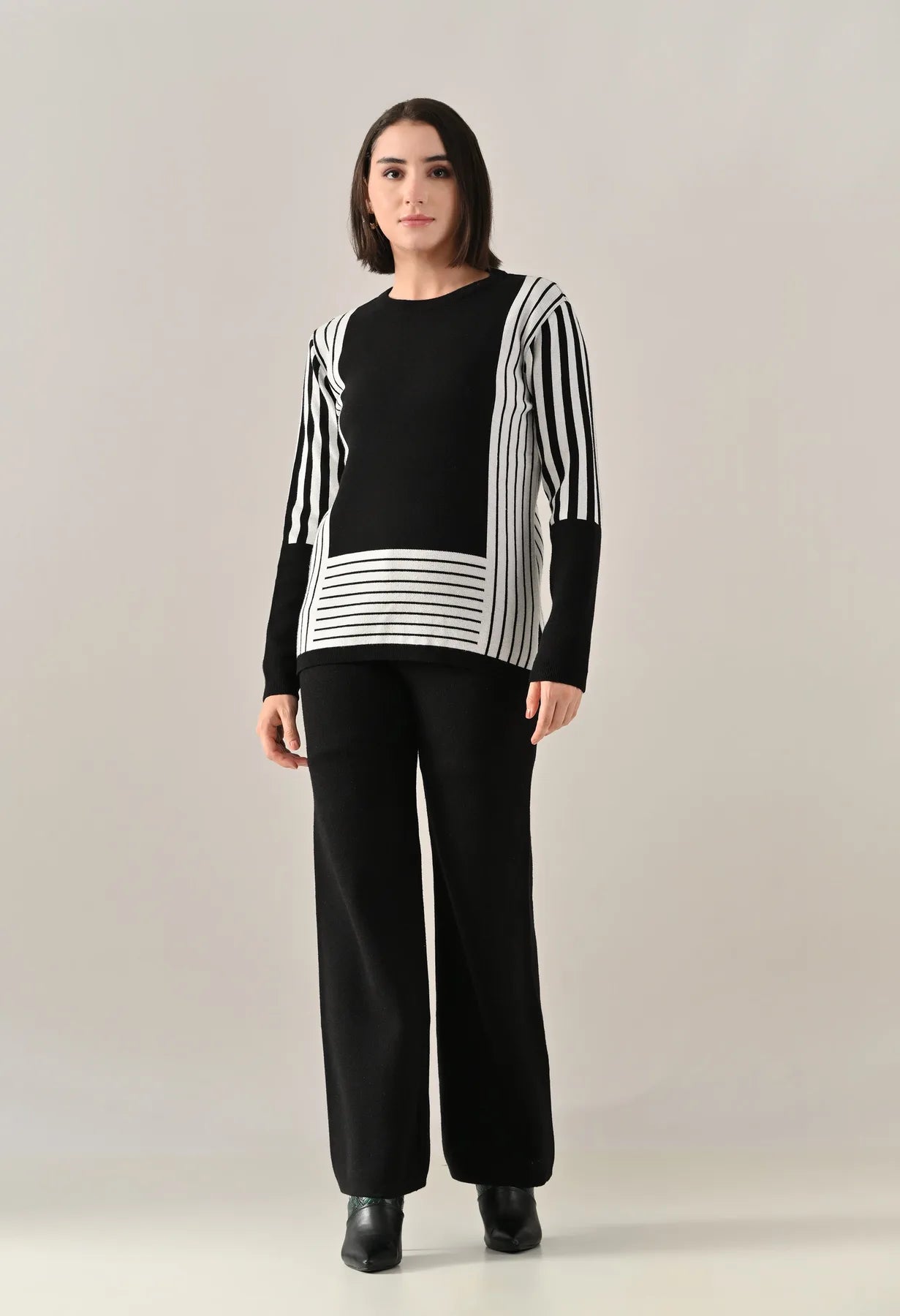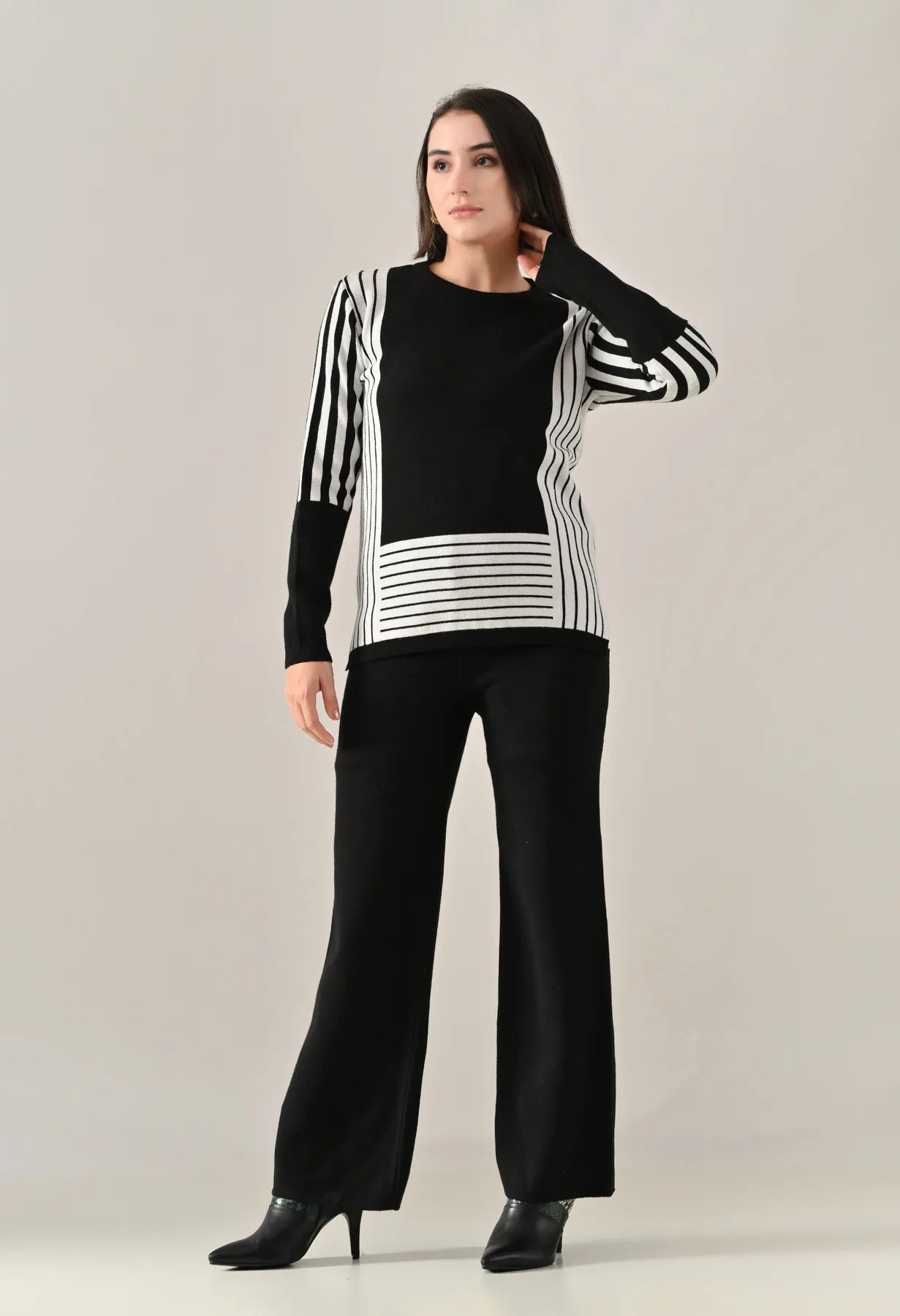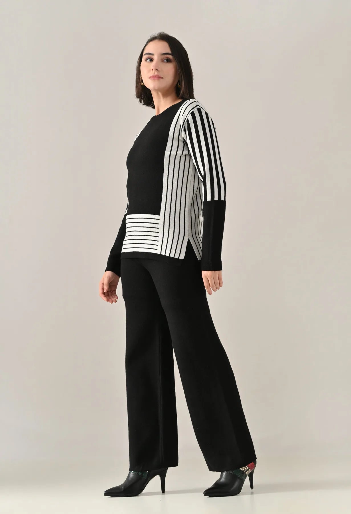 Elevate your everyday look with this sweater-knitted co-ord set, blending sleek design with cozy comfort. The top features a round neckline with rib detailing, long fitted sleeves, and a regular length enhanced with side slits for ease of movement. Ribbed hem and sleeve openings add a neat, structured finish. The coordinated lower comes with a broad elasticated waistband and a straight, comfortable fit, showcasing a white stripe pattern on the top that adds a modern, sporty touch. Made from soft, stretchable fabric, this set ensures a perfect balance of style, warmth, and all-day comfort.