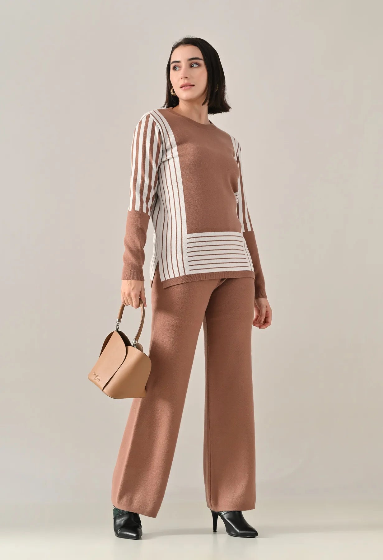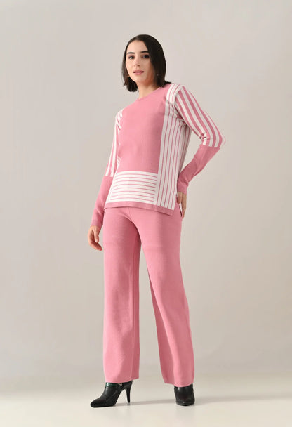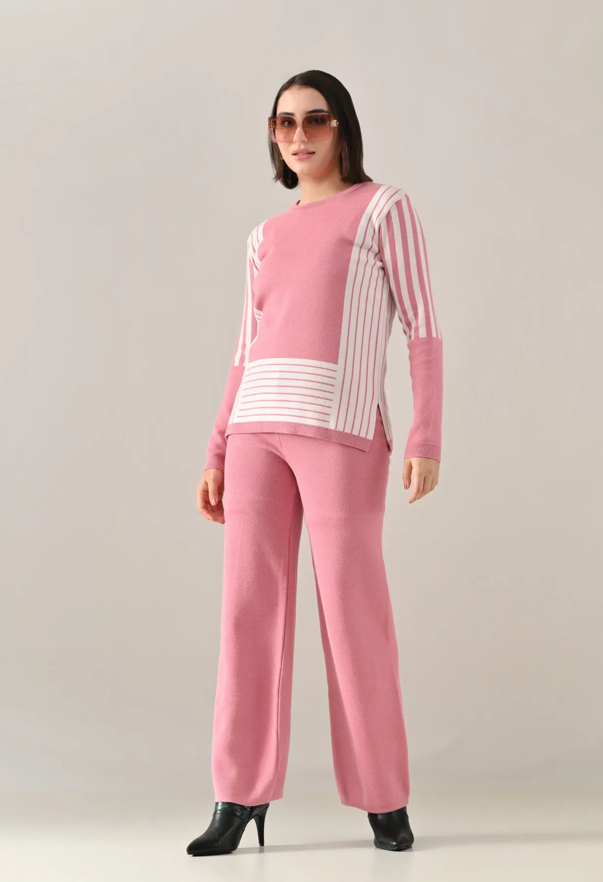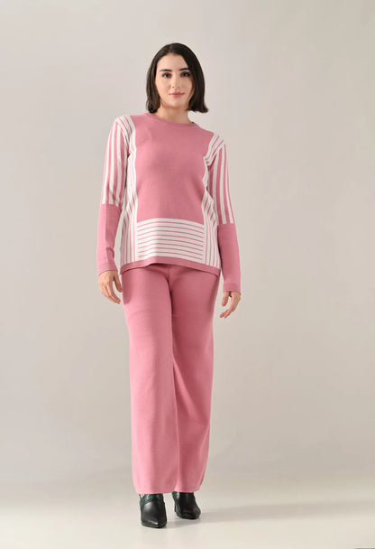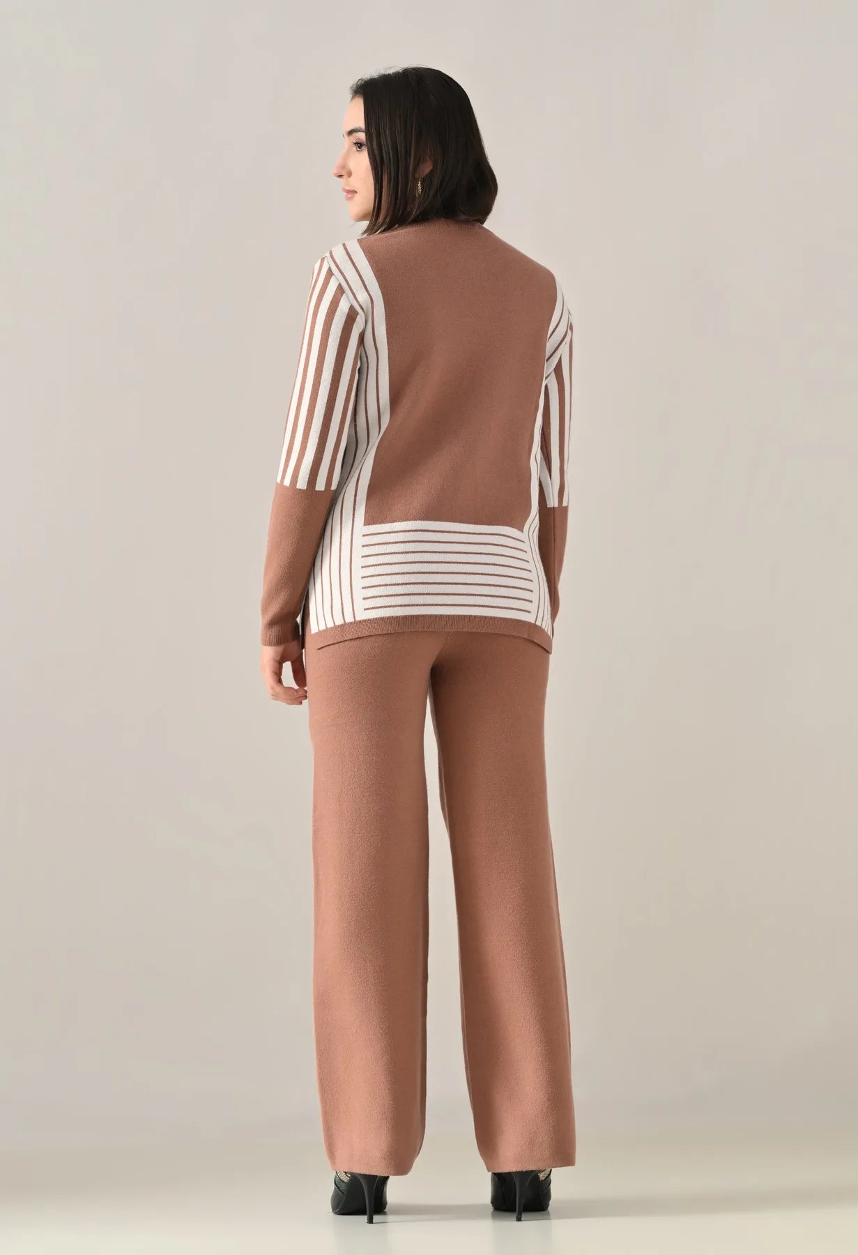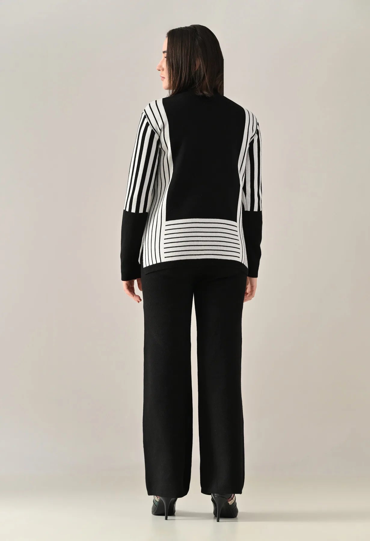 Elevate your everyday look with this sweater-knitted co-ord set, blending sleek design with cozy comfort. The top features a round neckline with rib detailing, long fitted sleeves, and a regular length enhanced with side slits for ease of movement. Ribbed hem and sleeve openings add a neat, structured finish. The coordinated lower comes with a broad elasticated waistband and a straight, comfortable fit, showcasing a white stripe pattern on the top that adds a modern, sporty touch. Made from soft, stretchable fabric, this set ensures a perfect balance of style, warmth, and all-day comfort.