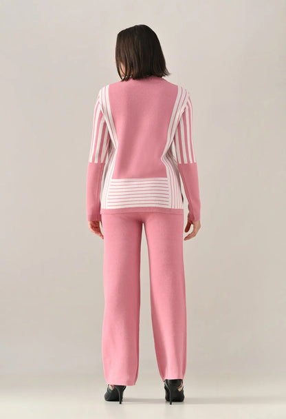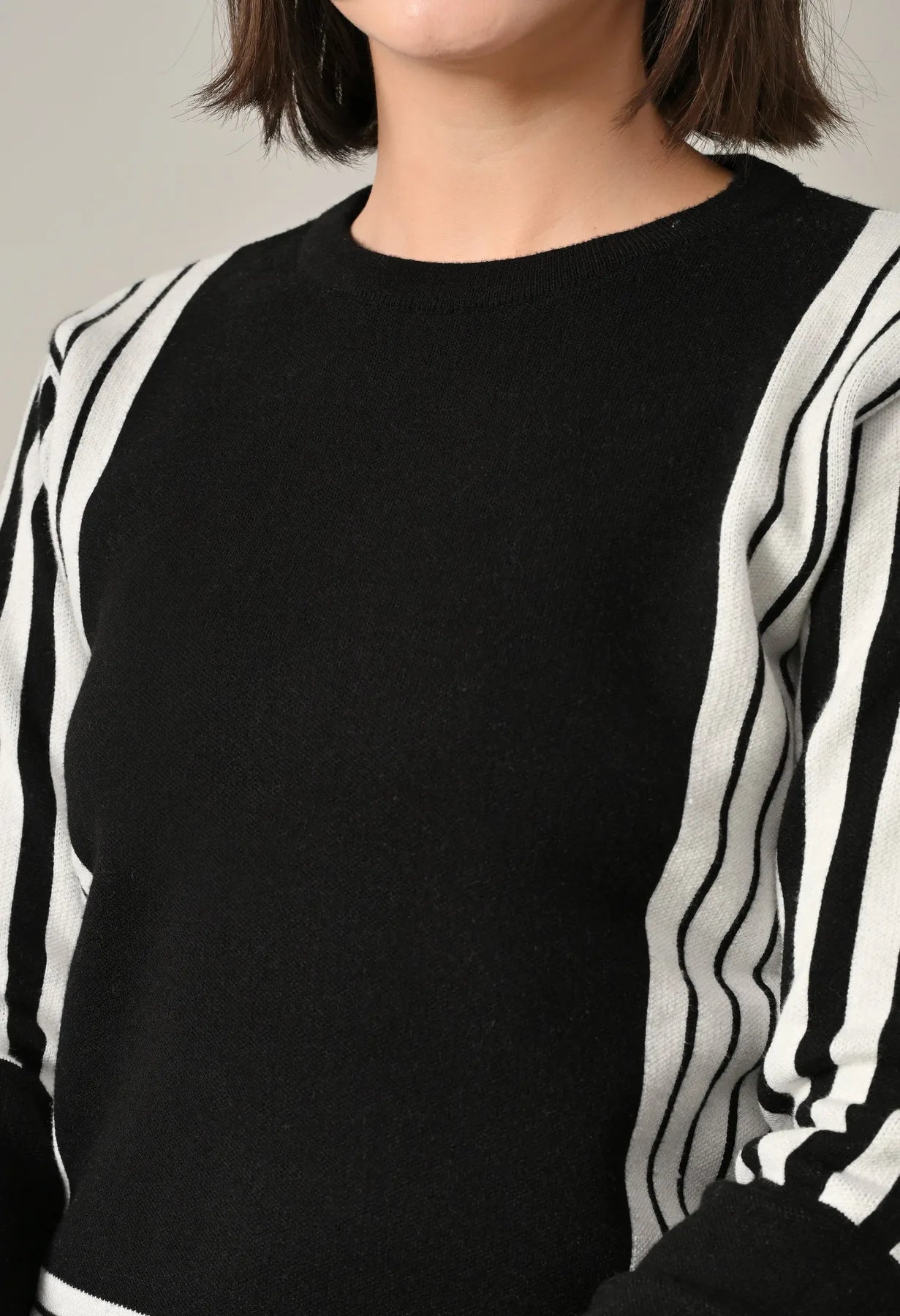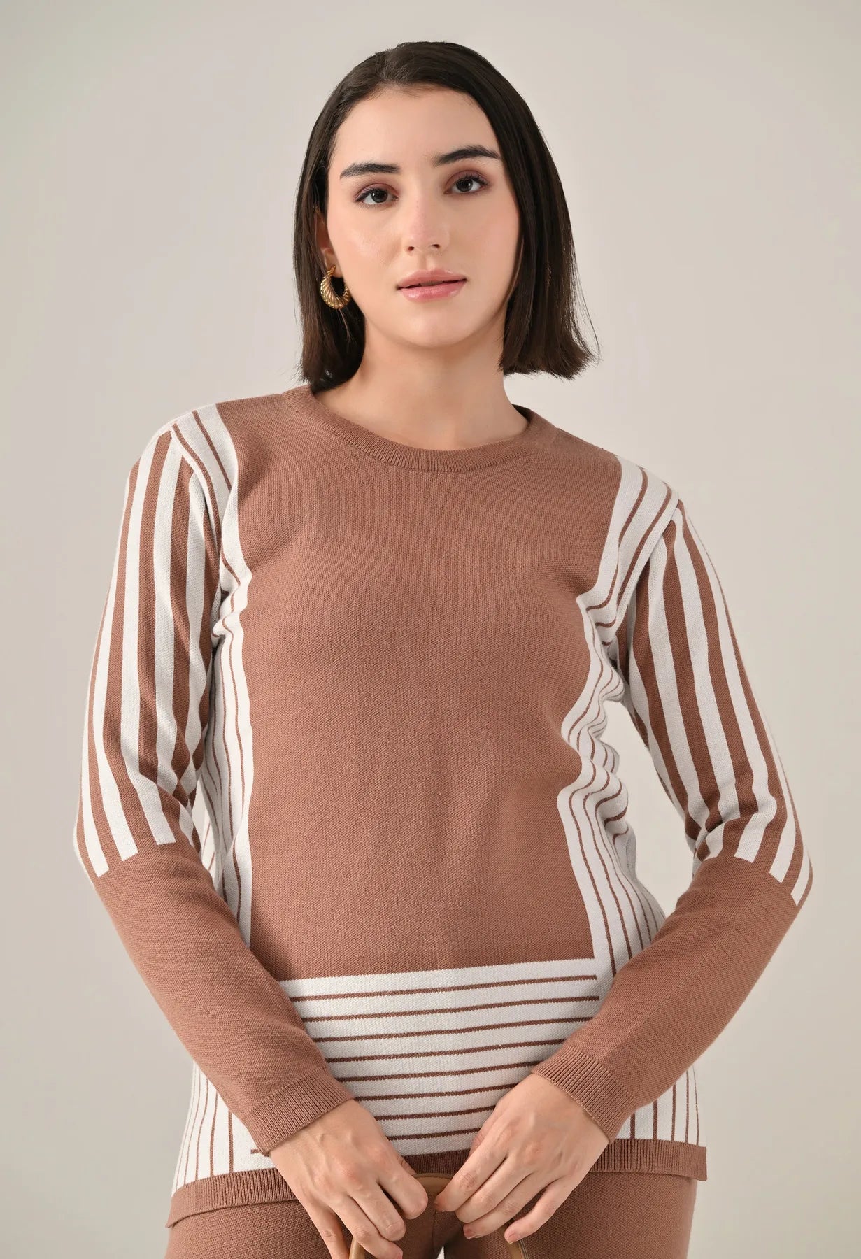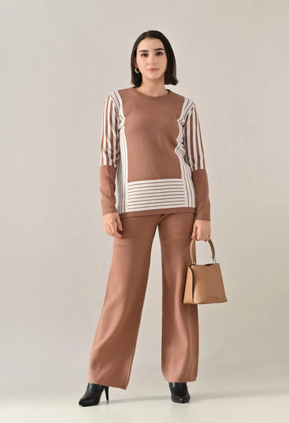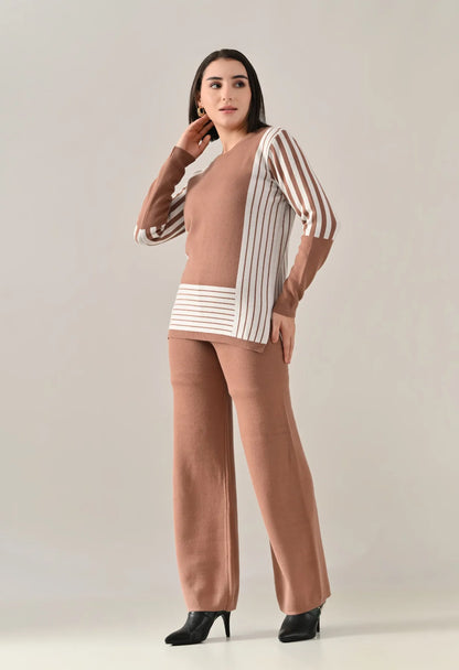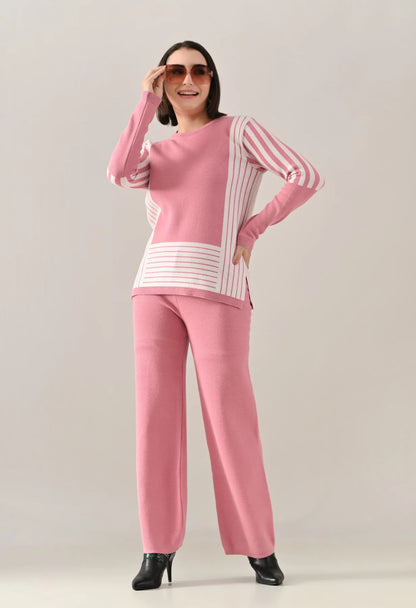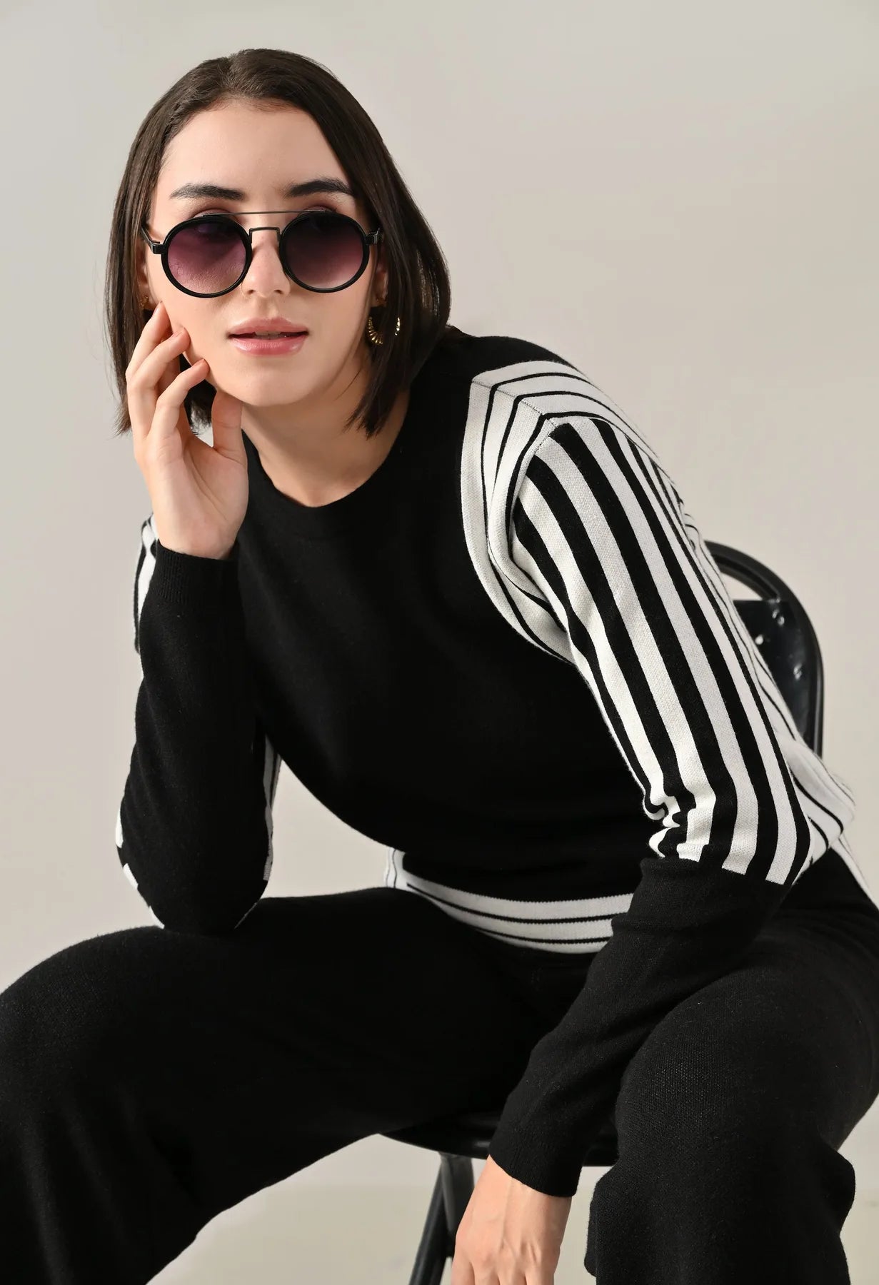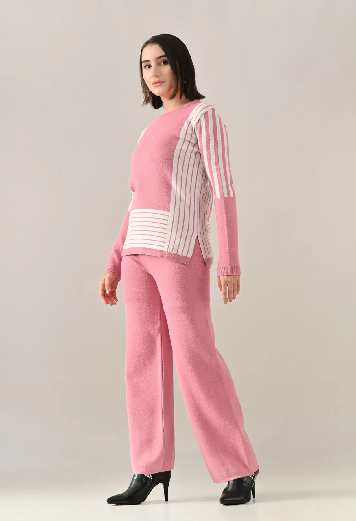 Elevate your everyday look with this sweater-knitted co-ord set, blending sleek design with cozy comfort. The top features a round neckline with rib detailing, long fitted sleeves, and a regular length enhanced with side slits for ease of movement. Ribbed hem and sleeve openings add a neat, structured finish. The coordinated lower comes with a broad elasticated waistband and a straight, comfortable fit, showcasing a white stripe pattern on the top that adds a modern, sporty touch. Made from soft, stretchable fabric, this set ensures a perfect balance of style, warmth, and all-day comfort.