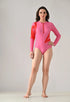 Turn heads in this pink and red abstract print monokini featuring full sleeves and a sleek zip-up front. Blending sporty edge with elegant flair, it offers the perfect mix of coverage and style. Crafted for comfort and performance, it’s ideal for active beach days or relaxed poolside lounging. Comes with a matching sarong for a seamless surf-to-resort transition.