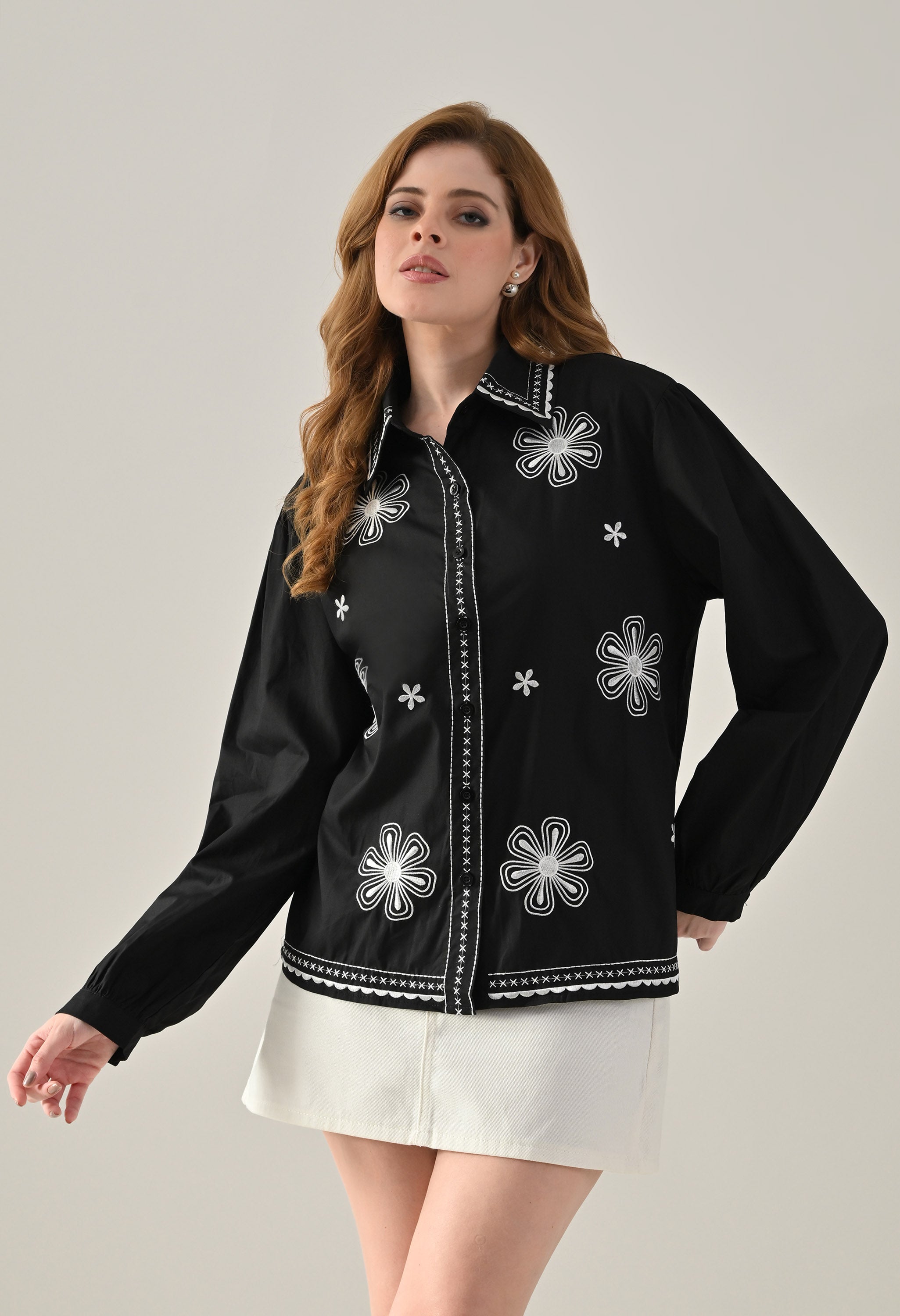 The Bloom Embroidered Shirt is crafted in a relaxed fit with classic turn-down collars and full button closure from top to bottom. Featuring delicate embroidered floral motifs across the front and collar, this shirt brings a soft yet striking charm. Designed with comfortable full sleeves and a versatile silhouette, it’s a timeless piece with modern detailing, perfect to pair with skirts, trousers, or denim for effortless day-to-night style.