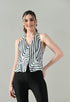 Elevate your wardrobe with this bold and stylish halter top, designed to make a statement. Featuring a deep V-neckline and daring backless design, it’s finished in a striking black-and-white striped pattern. The front opens with elegant horn buttons, while an adjustable tie at the back ensures a tailored fit. Two showy pockets add a playful edge, and the soft taffeta lining keeps it comfortable against the skin. Perfect for pairing with high-waist trousers, skirts, or denims, this non-stretchable piece is your go-to for chic evening looks or standout day edits.