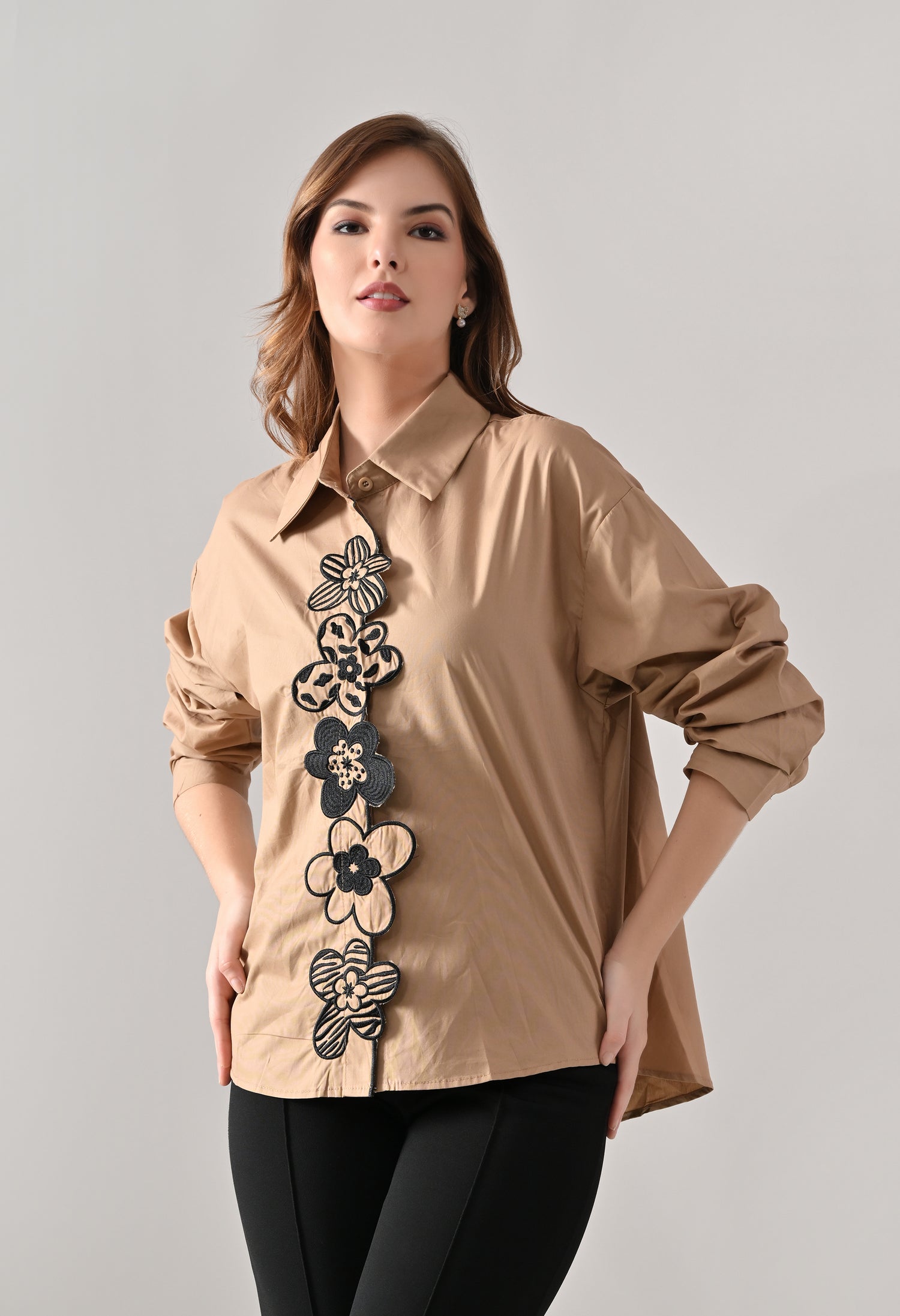 The Floral Panel Embroidered Shirt is a refined classic with a modern twist, highlighted by its intricate floral embroidery running down the front panel. With its soft non-stretch fabric, hidden button placket, and U-shaped hem, this versatile piece balances elegance and comfort—perfect for polished day looks or elevated evenings.