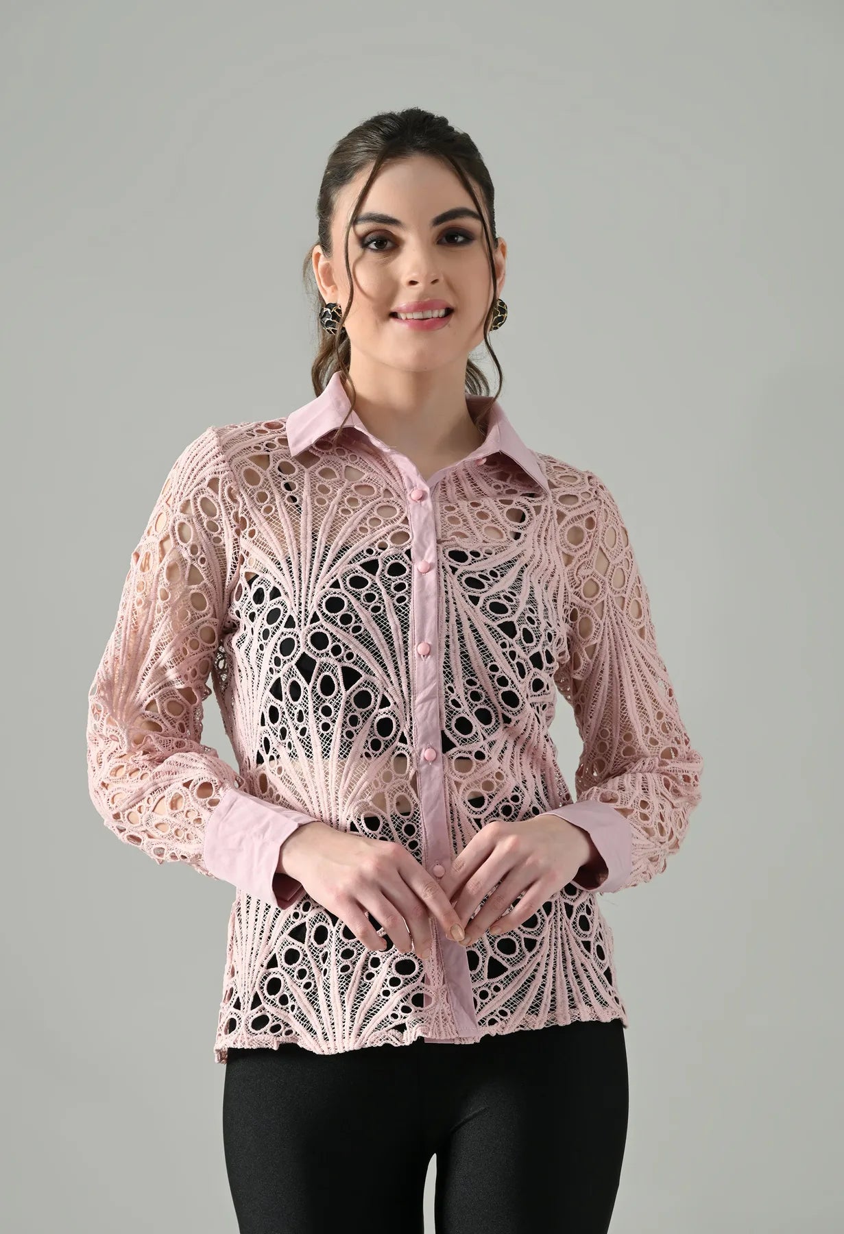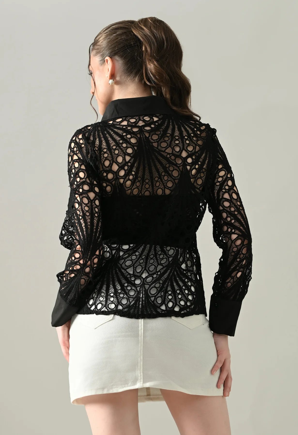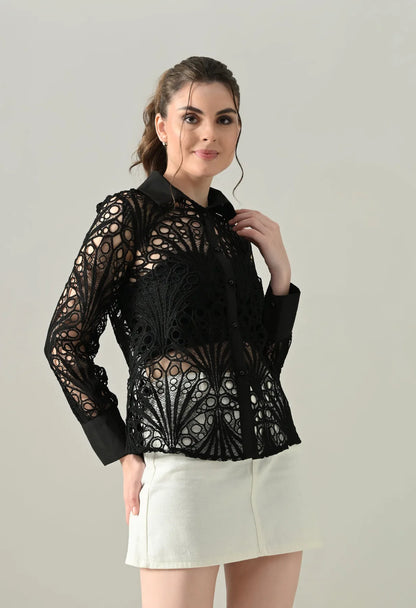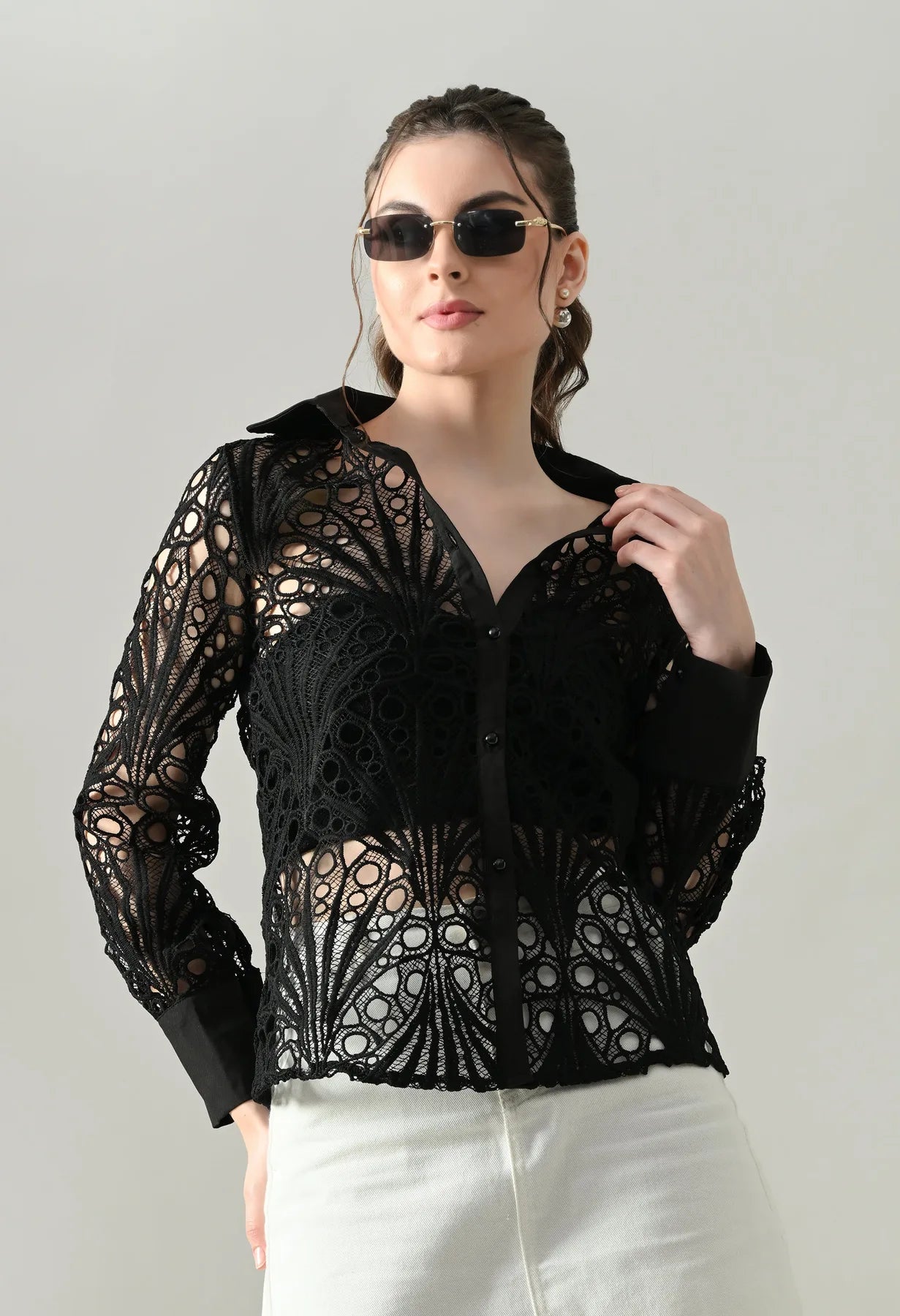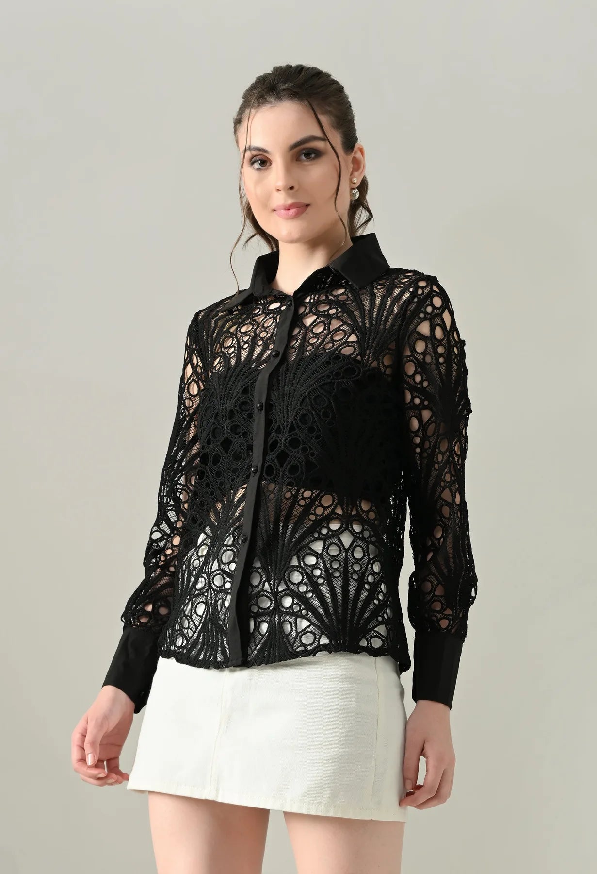 An elegant lace sheer shirt that blends sophistication with bold style. Featuring a sharp collar, front button placket, and full sleeves with broad cuffs, it’s finished with a straight hem for a clean silhouette. Crafted in non-stretch, unlined fabric, this piece offers a chic transparent look perfect for layering or statement styling.