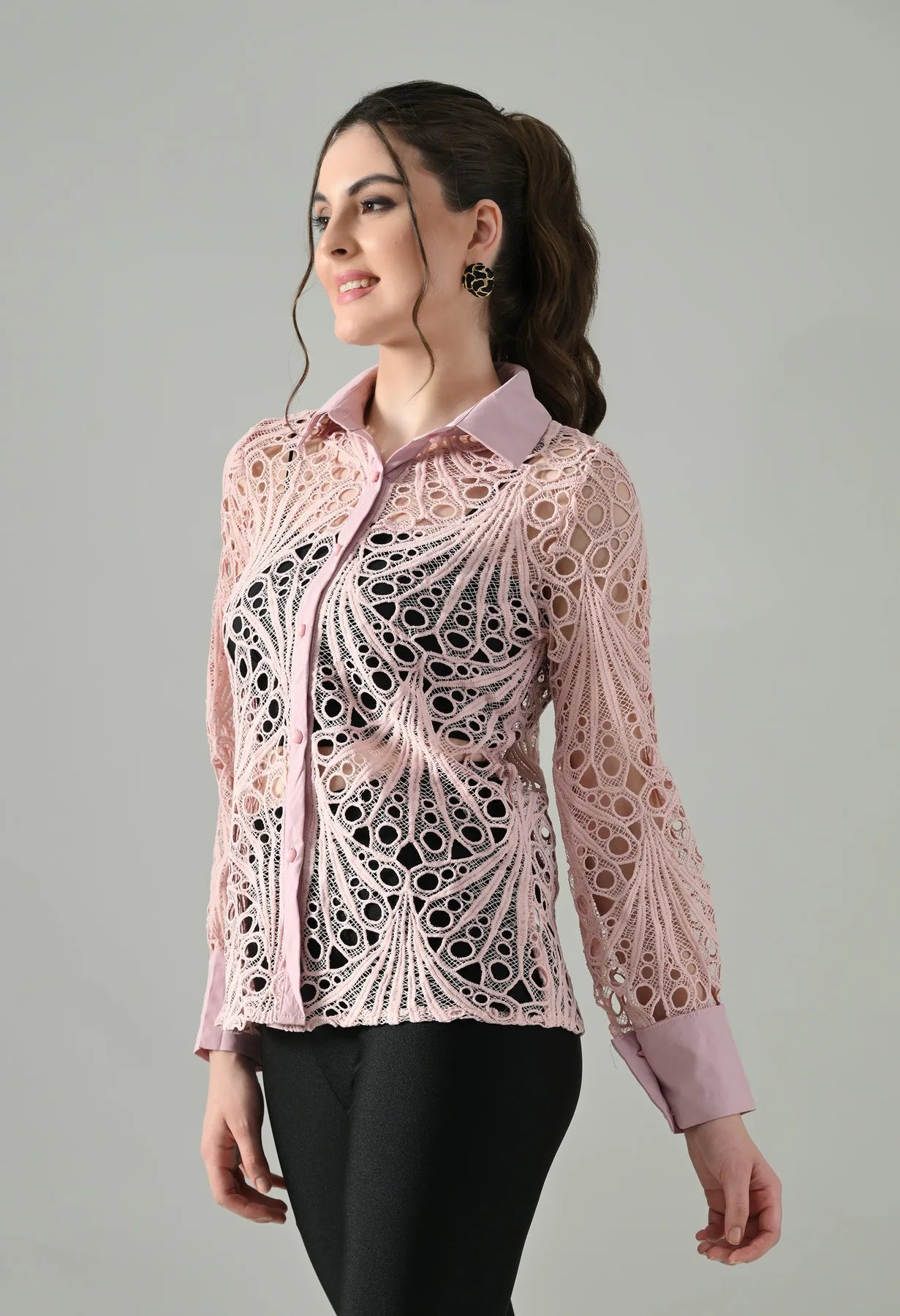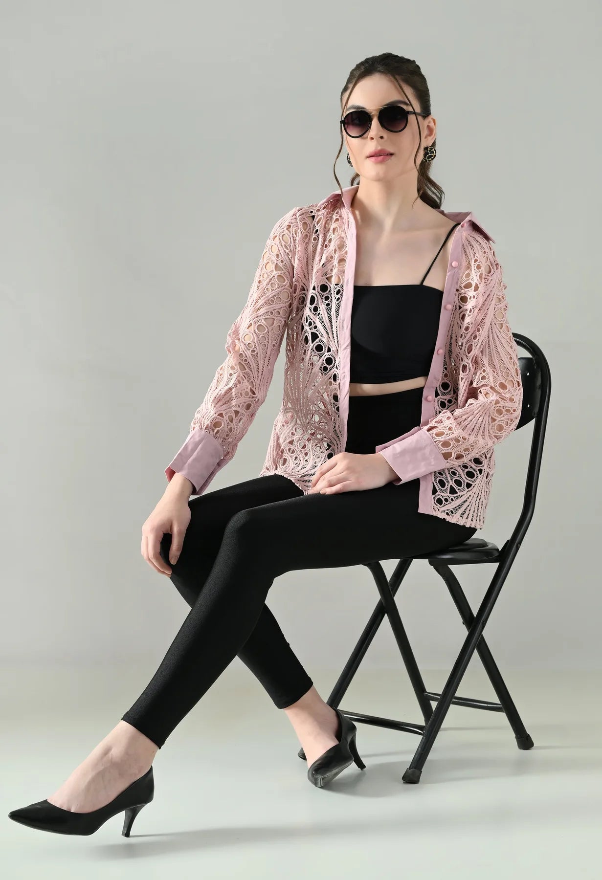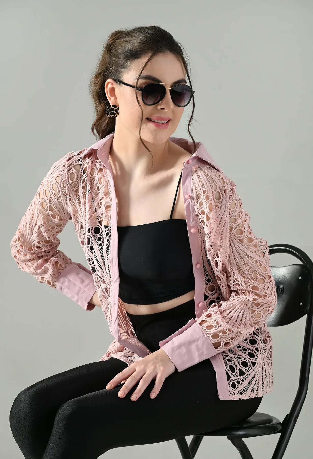 An elegant lace sheer shirt that blends sophistication with bold style. Featuring a sharp collar, front button placket, and full sleeves with broad cuffs, it’s finished with a straight hem for a clean silhouette. Crafted in non-stretch, unlined fabric, this piece offers a chic transparent look perfect for layering or statement styling.