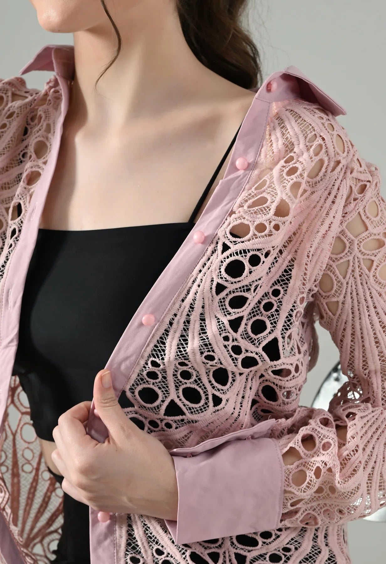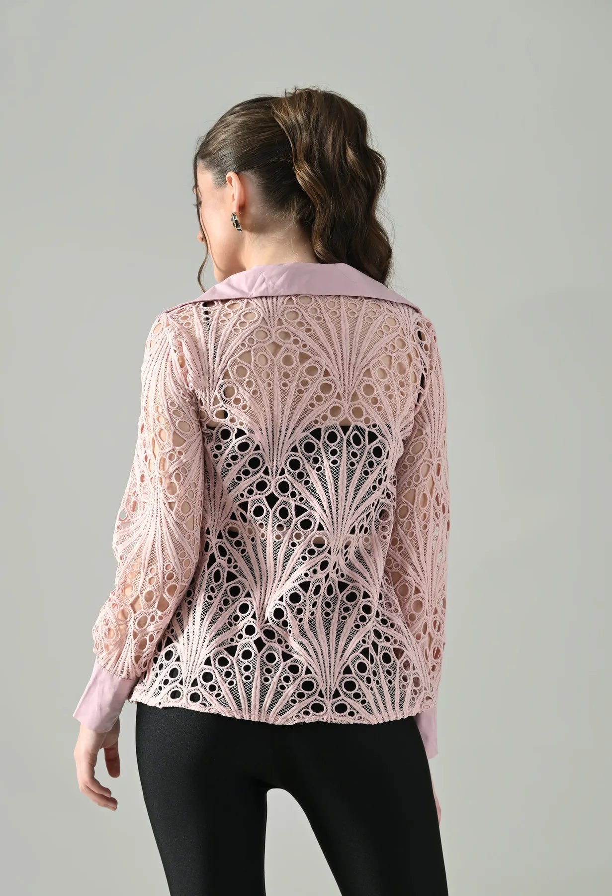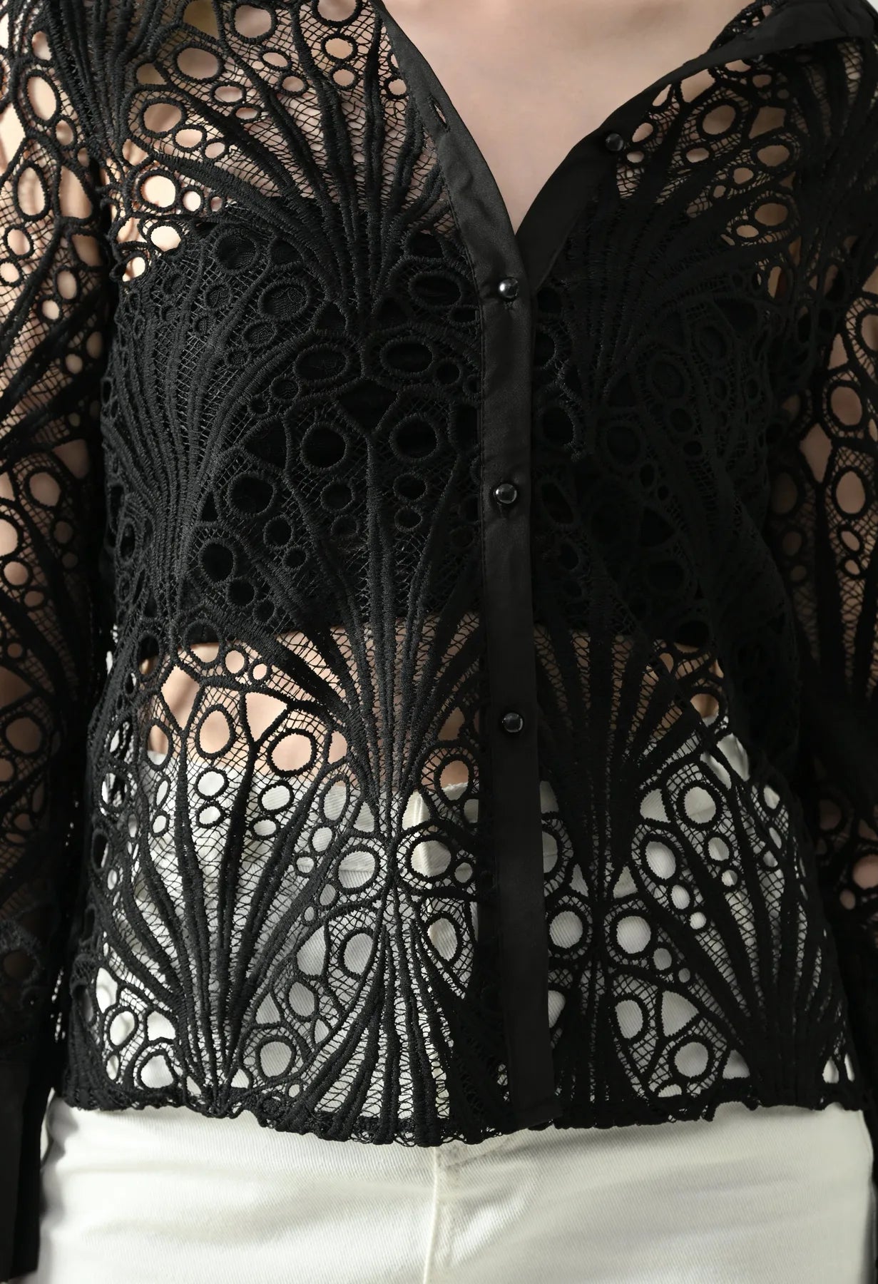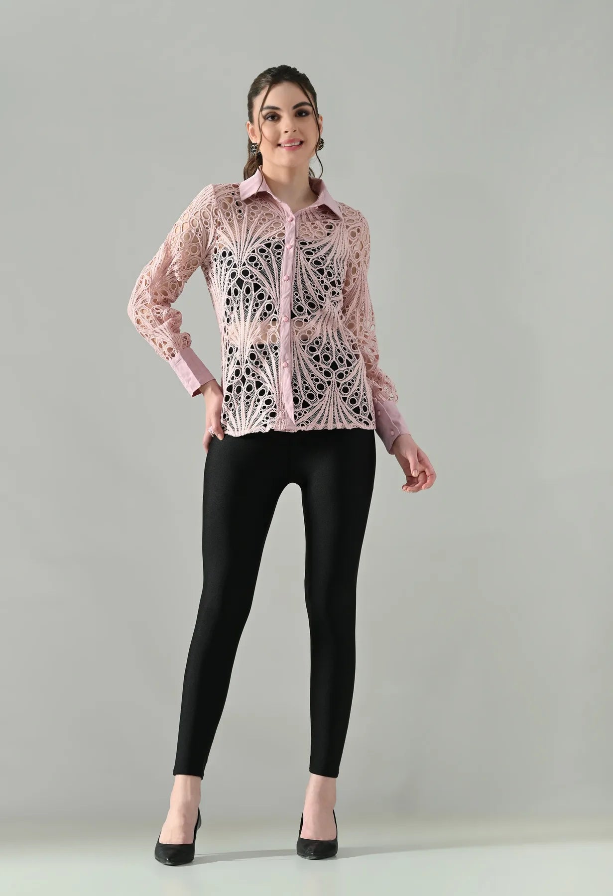 An elegant lace sheer shirt that blends sophistication with bold style. Featuring a sharp collar, front button placket, and full sleeves with broad cuffs, it’s finished with a straight hem for a clean silhouette. Crafted in non-stretch, unlined fabric, this piece offers a chic transparent look perfect for layering or statement styling.