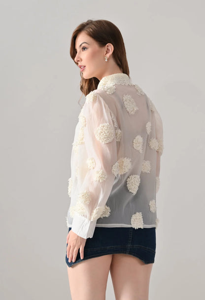Add a touch of elegance to your wardrobe with this blush shirt featuring delicate 3D floral appliqué detailing and sheer long sleeves. The embellished pearl and stone collar adds a luxe finish, while crystal button closures bring subtle sparkle. Perfect for pairing with tailored pants or skirts, this shirt blends feminine charm with contemporary sophistication.