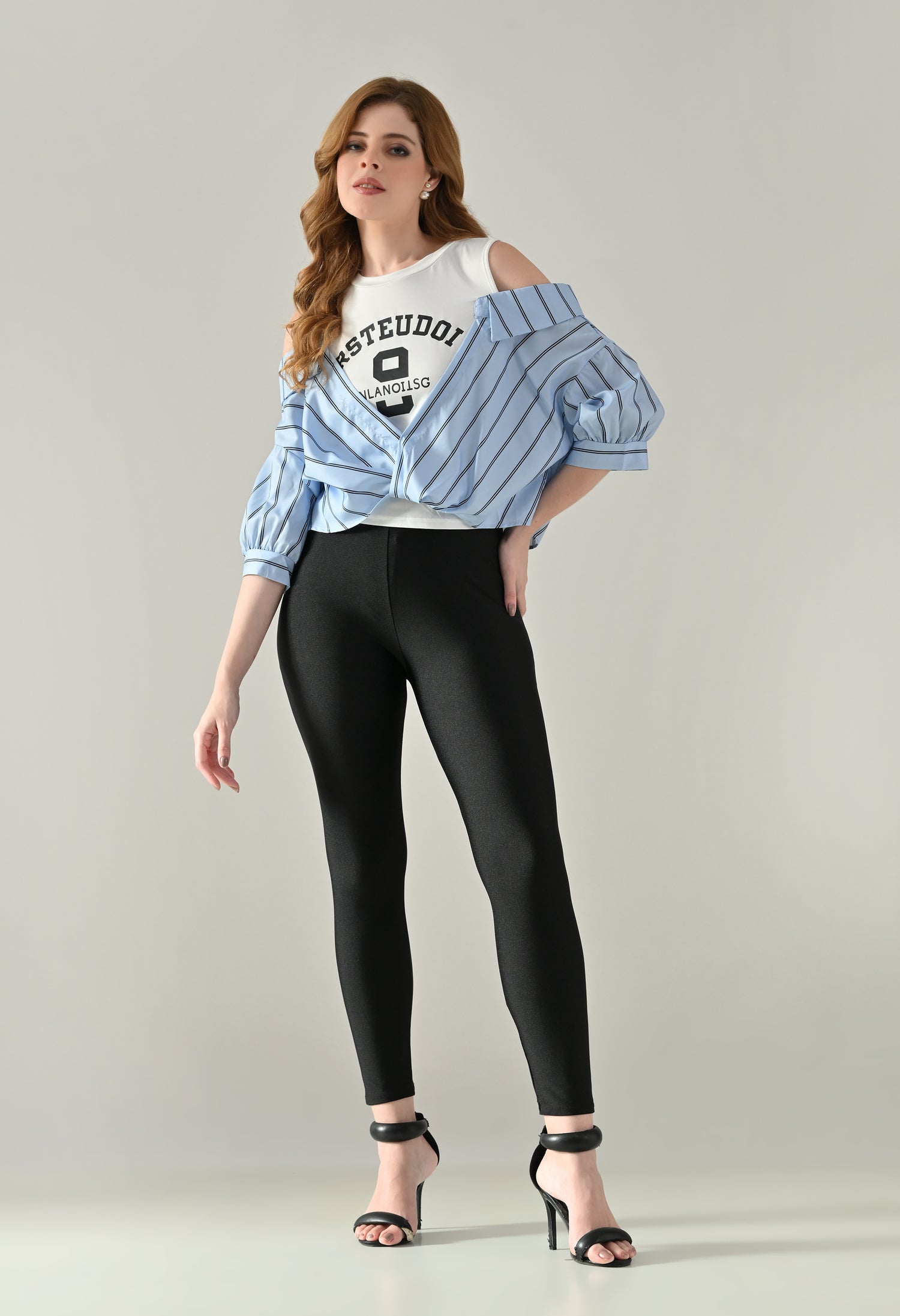 This unique design blends casual comfort with a fashionable twist. The inner layer comes with a trendy printed T-shirt, while the outer layer mimics a striped shirt for a smart layered effect. Featuring a classic round neck and three-fourth sleeves, it’s perfect for an effortlessly stylish everyday look or a polished street-style vibe.