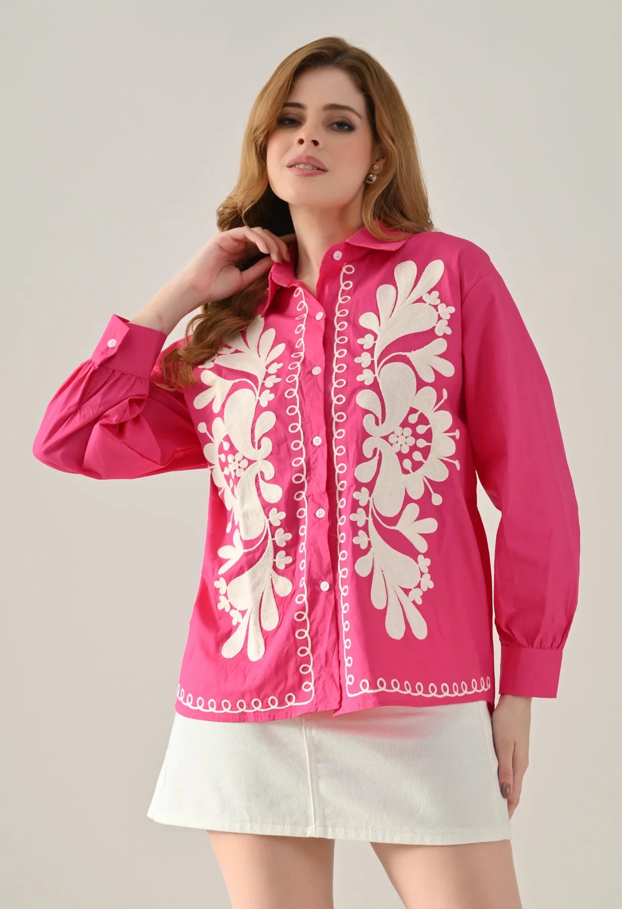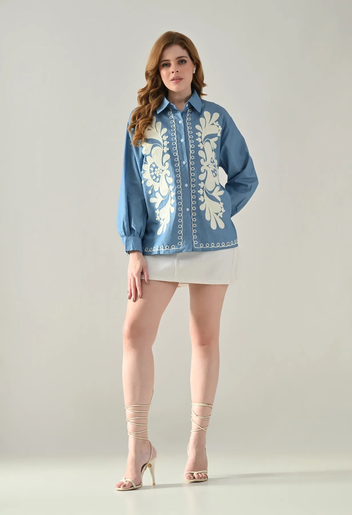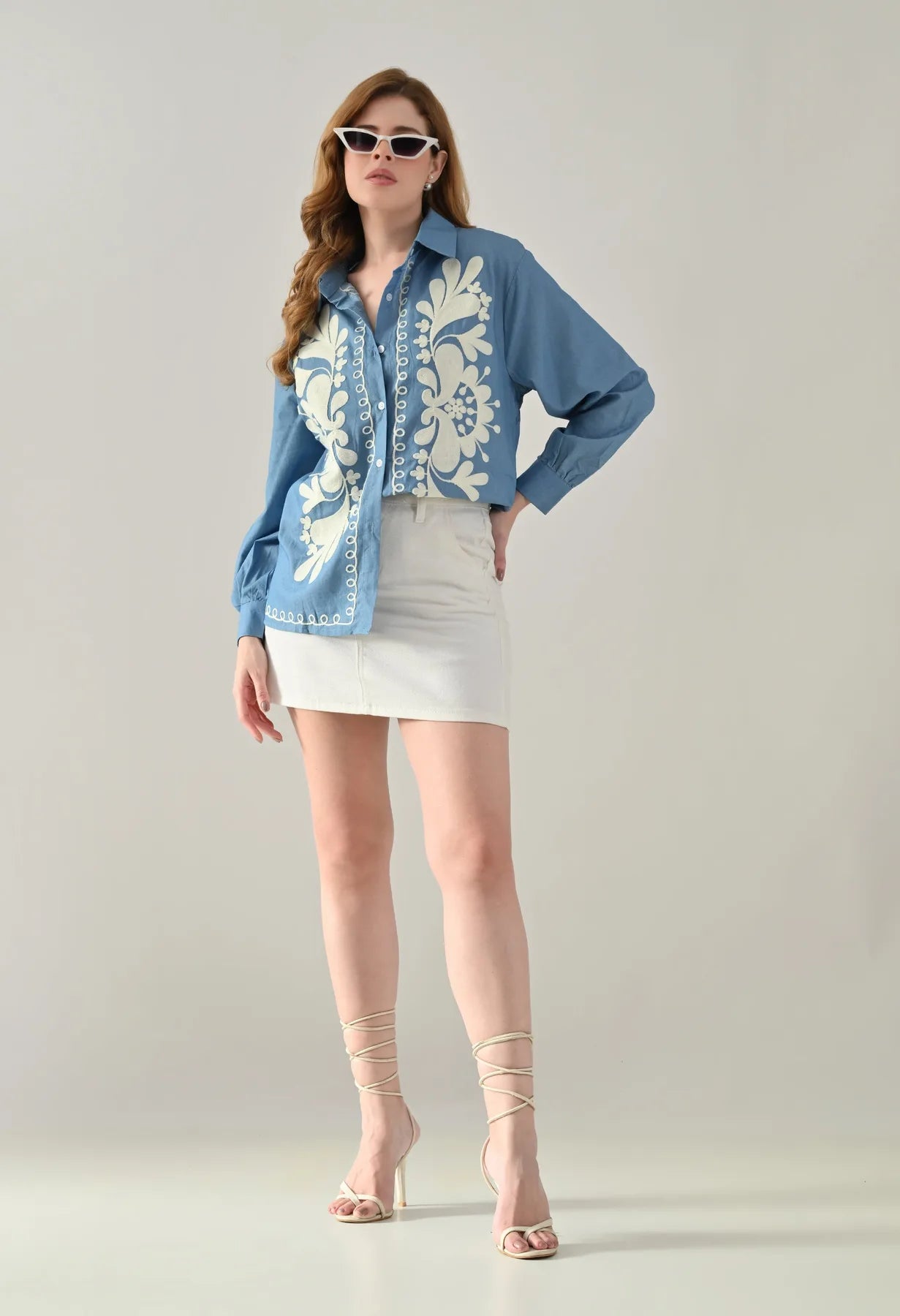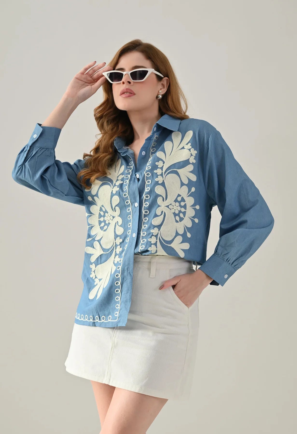Elevate your everyday style with this Threadwork Denim Shirt, featuring a spread collar and functional button placket for a structured look. Designed in a regular fit with full sleeves and buttoned cuffs, it offers both comfort and polish. The intricate threadwork embroidery on the front adds a striking touch, making this shirt a versatile pick for pairing with skirts, jeans, or trousers.