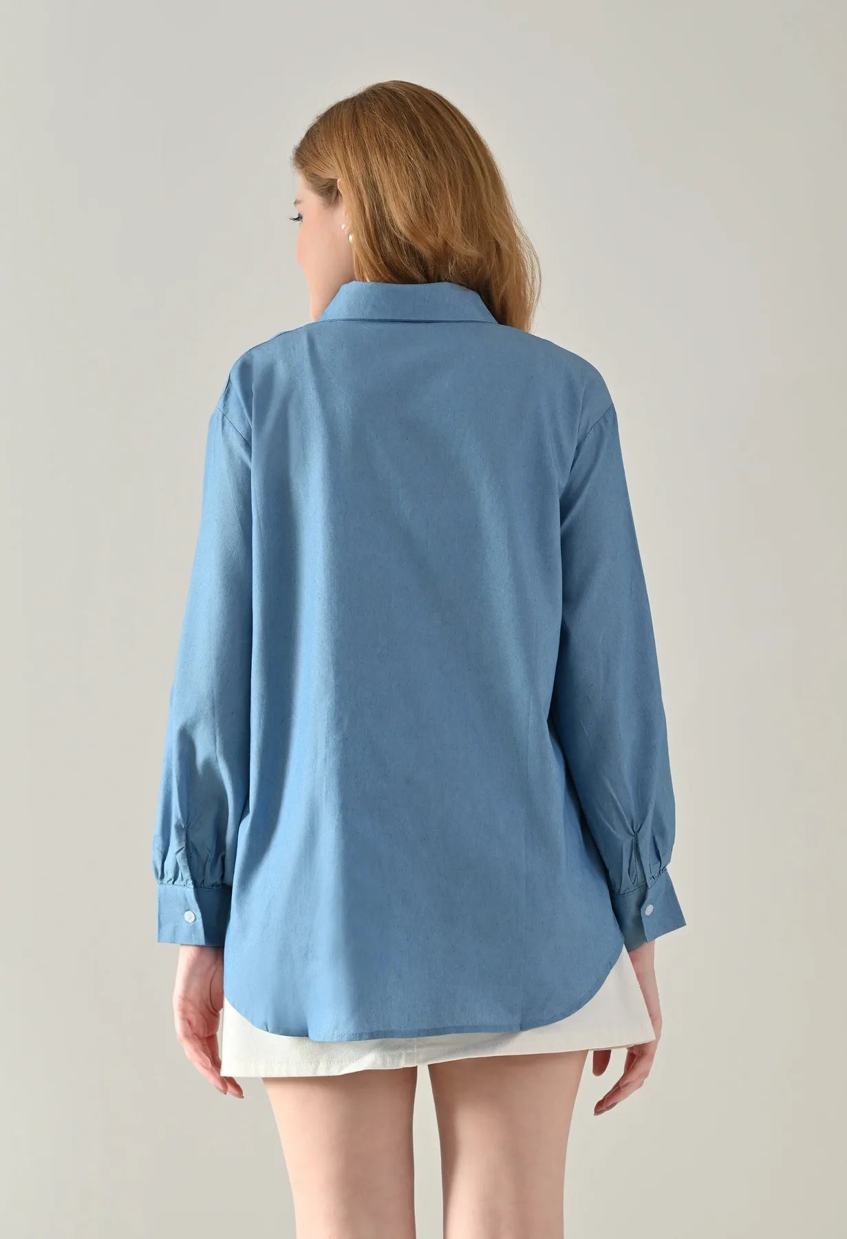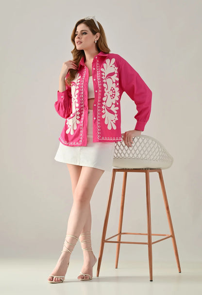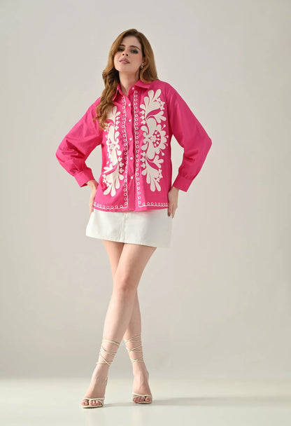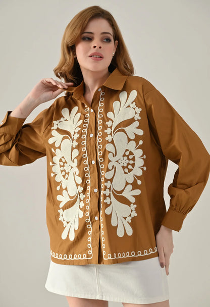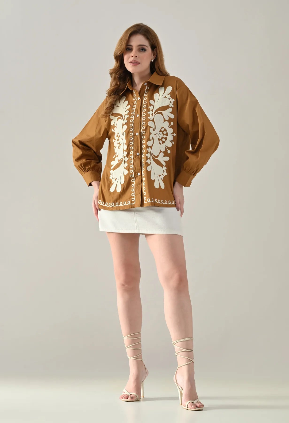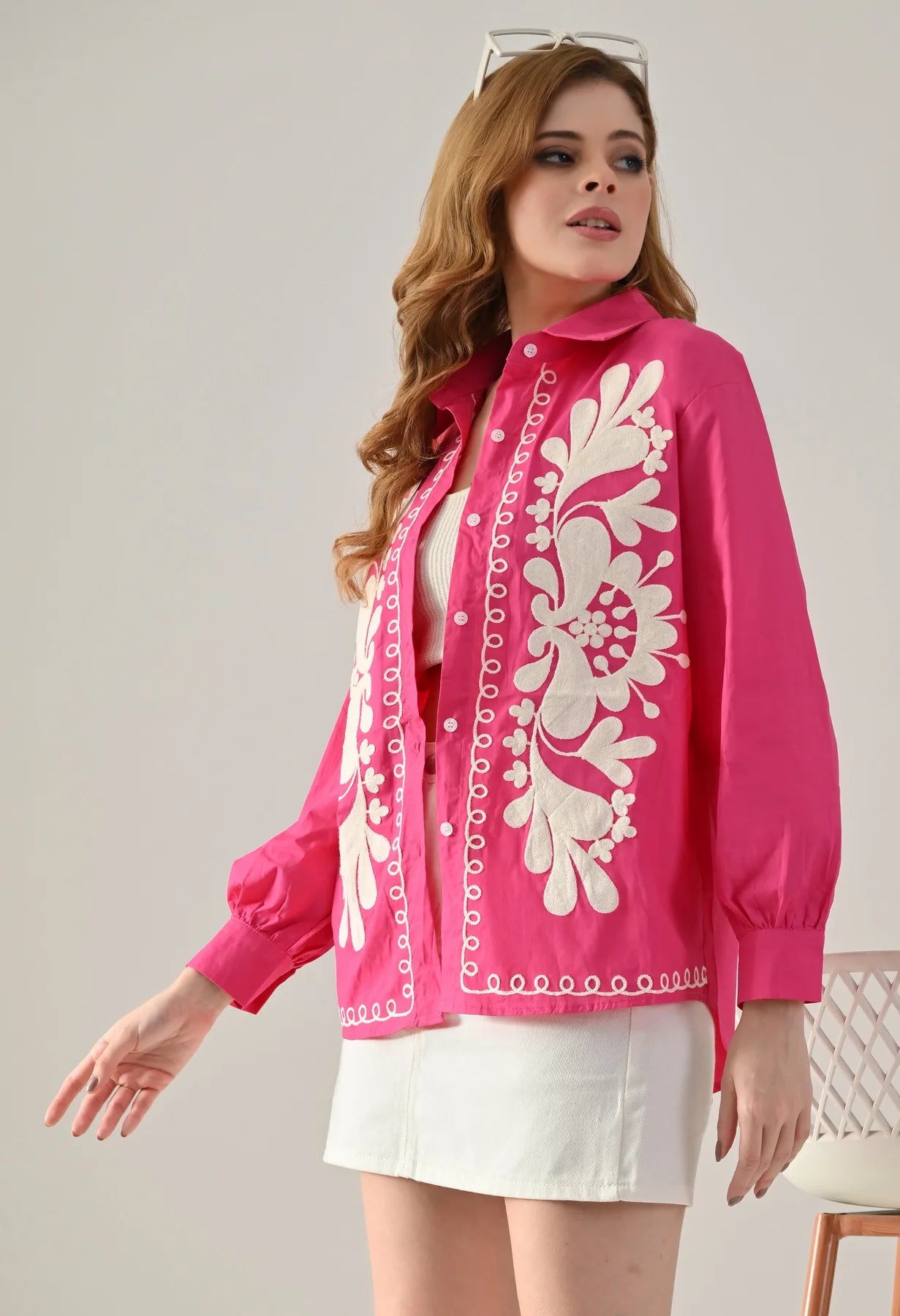Elevate your everyday style with this Threadwork Denim Shirt, featuring a spread collar and functional button placket for a structured look. Designed in a regular fit with full sleeves and buttoned cuffs, it offers both comfort and polish. The intricate threadwork embroidery on the front adds a striking touch, making this shirt a versatile pick for pairing with skirts, jeans, or trousers.