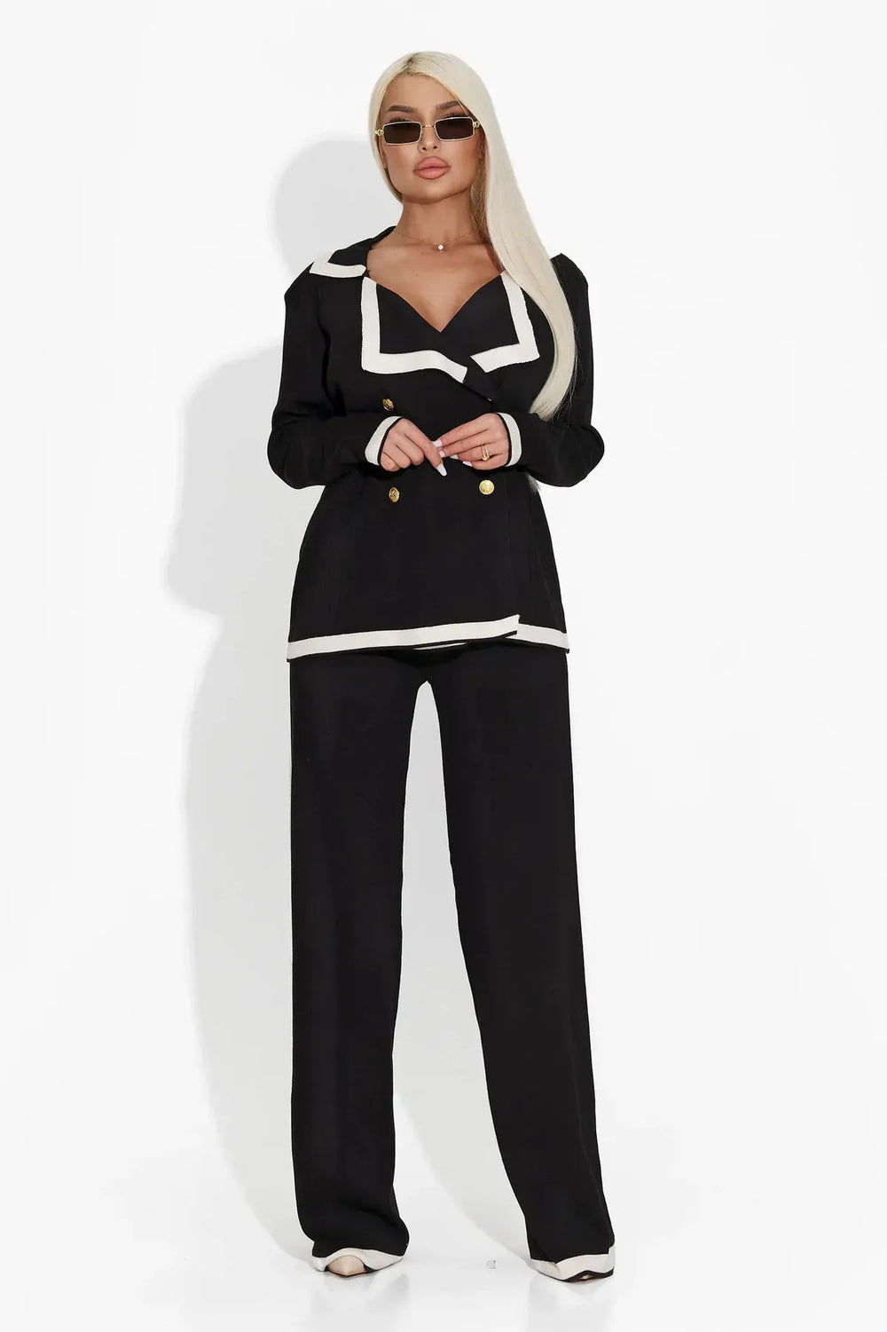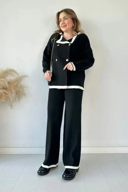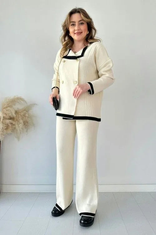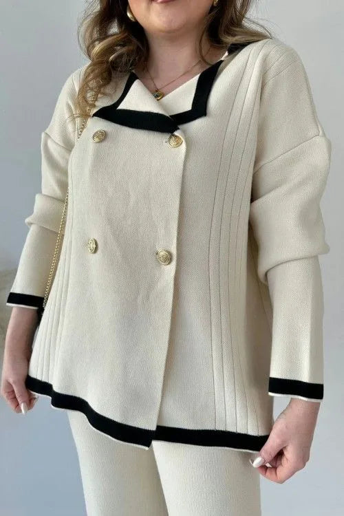This soft-knitted winter co-ord set is designed to offer warmth without compromising on structure. The double-breasted design adds a tailored edge, completed with polished gold buttons. Versatile and gracefully balanced, it’s the perfect choice for everything from a brunch outing to your 9-to-5 meetings.