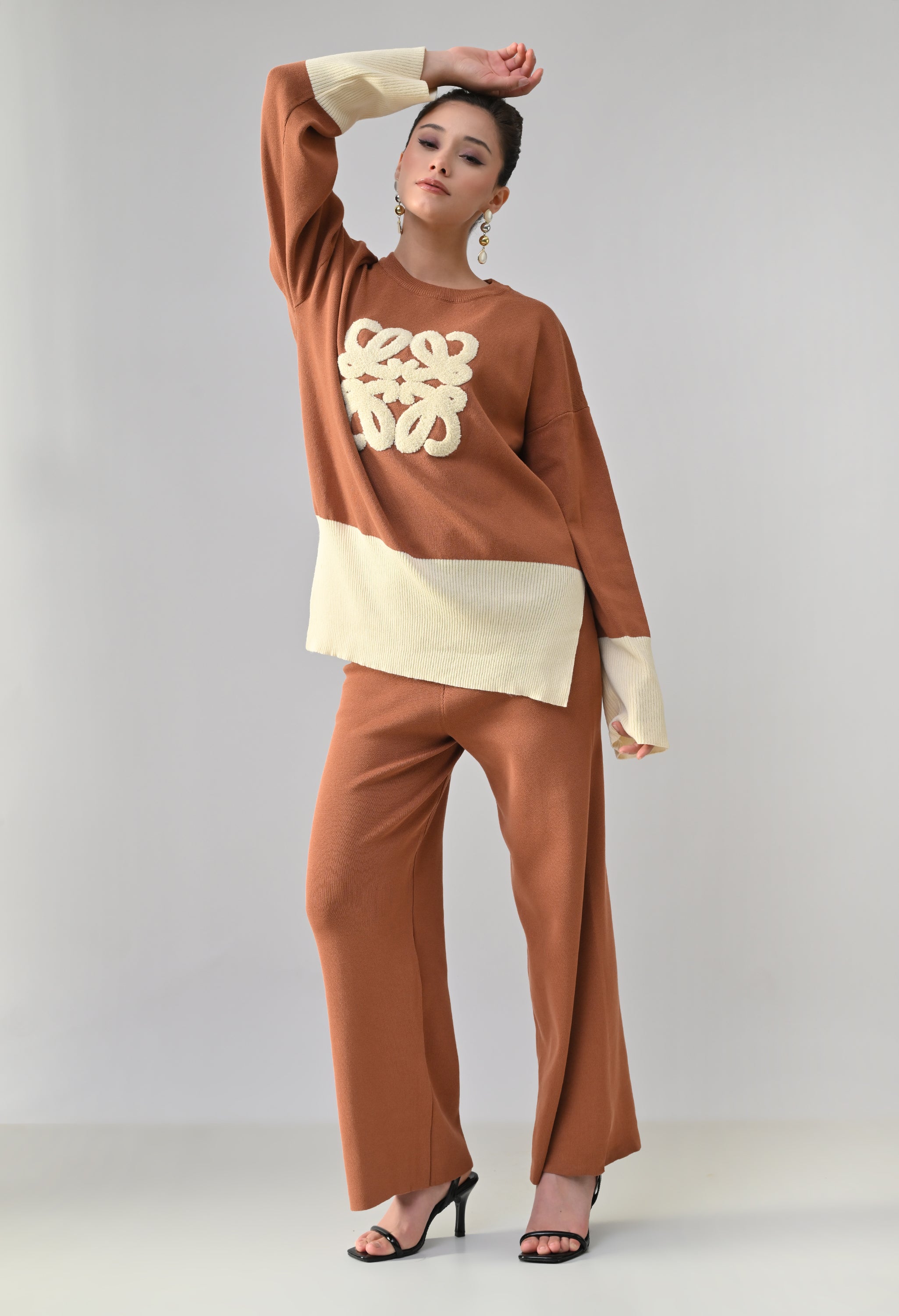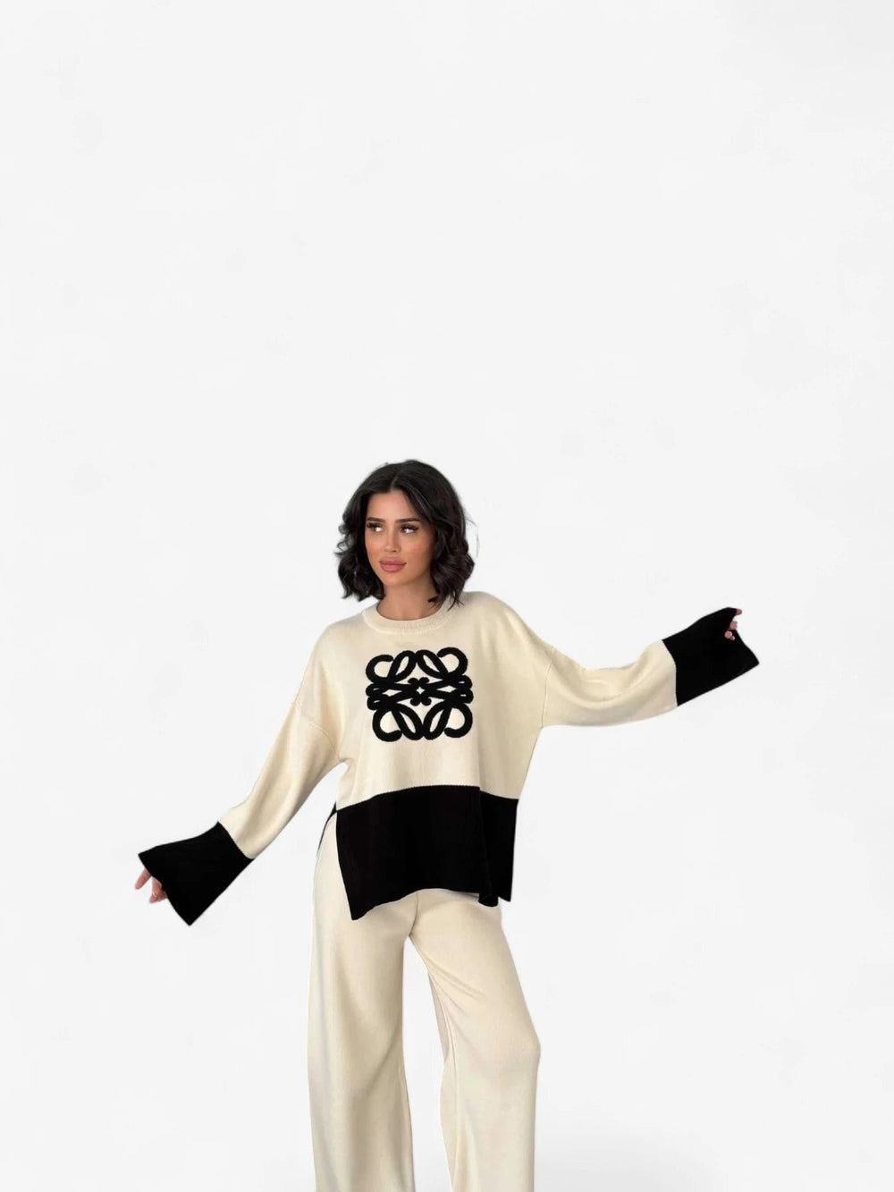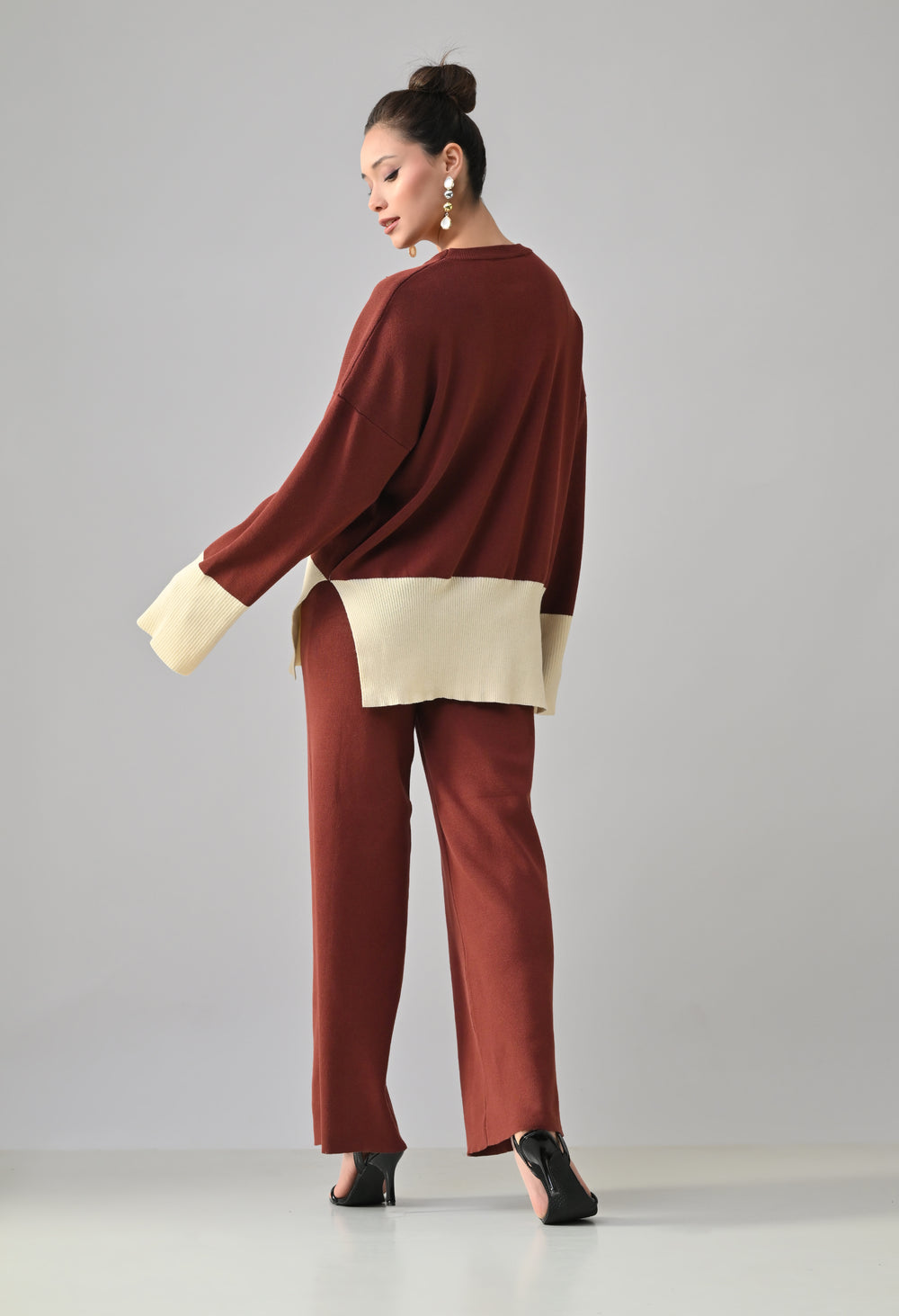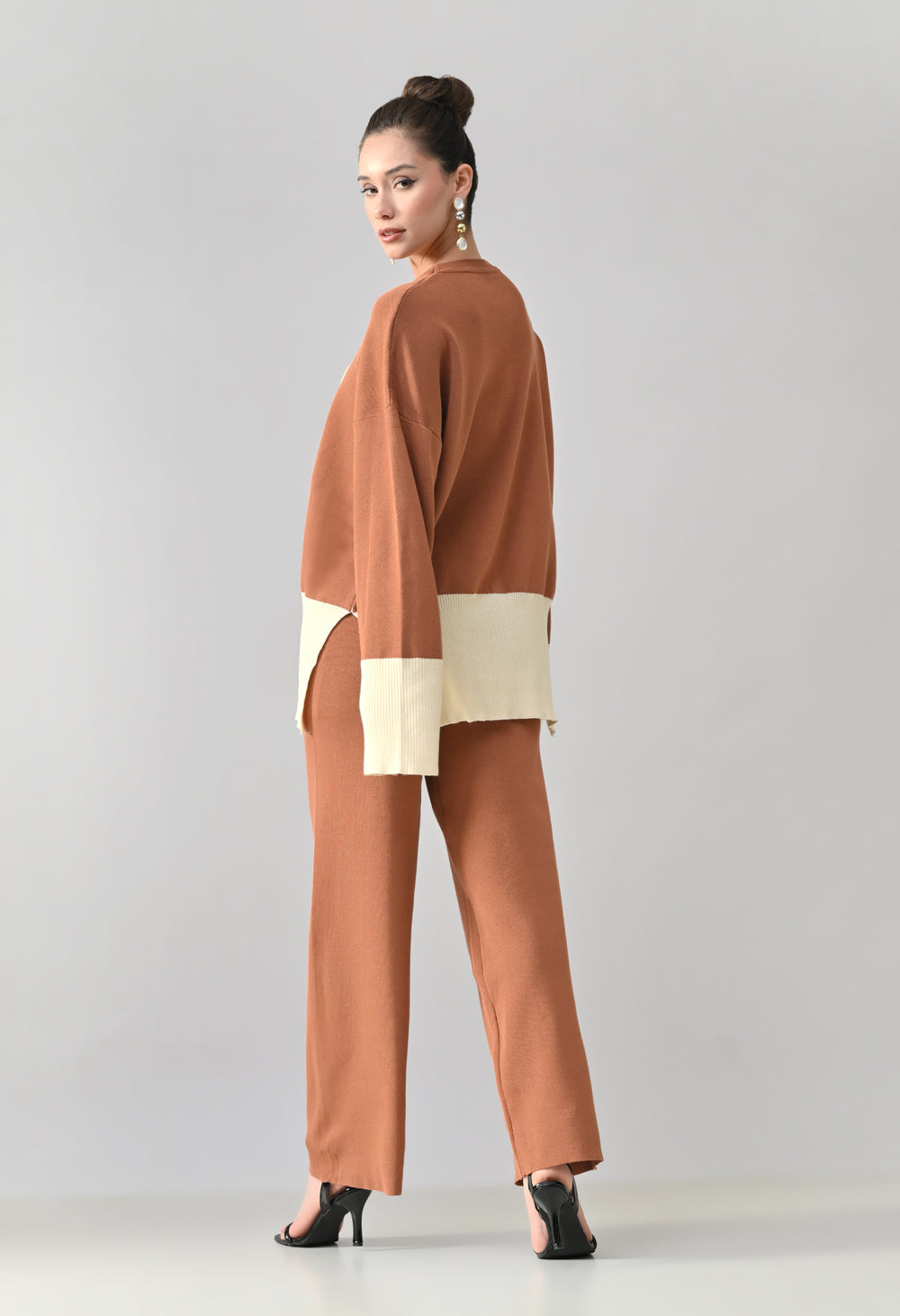 Elevate your style with our chic Colorblock Knitted Two-Piece Set – perfect for autumn and winter. Featuring a round neckline, side-slit top, and elasticated waistband pants, it’s your go-to for casual days, cozy evenings, or holiday lounging