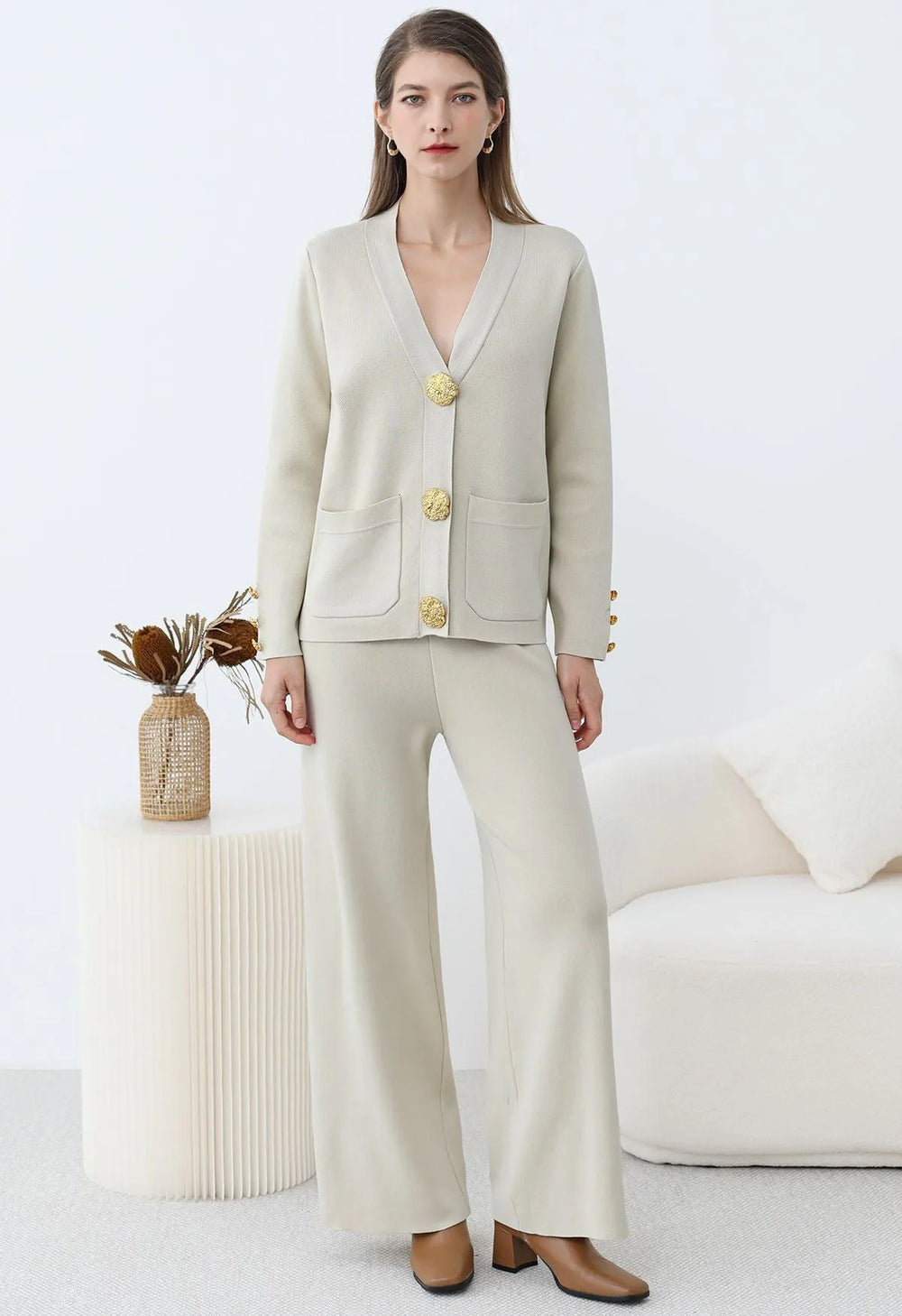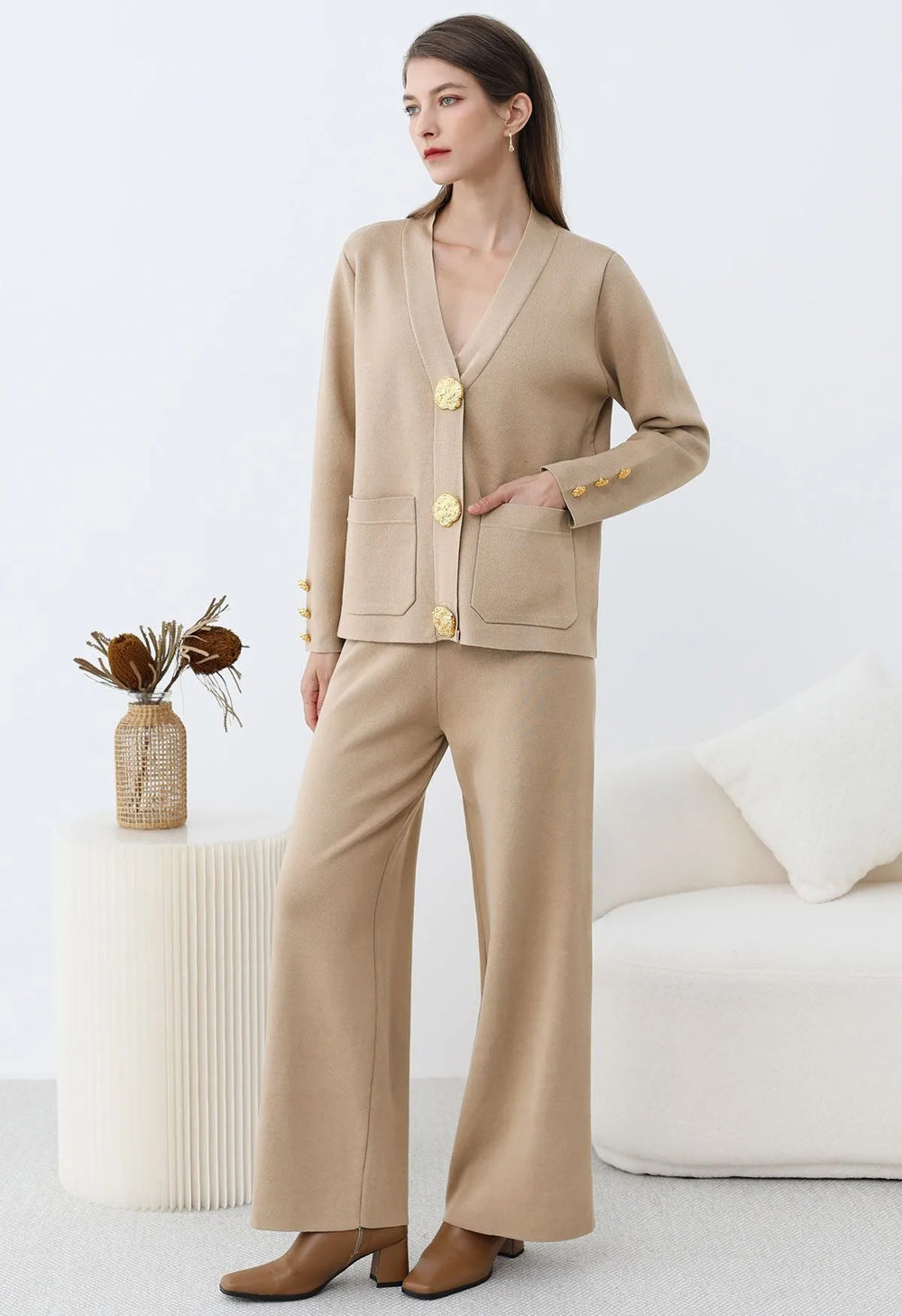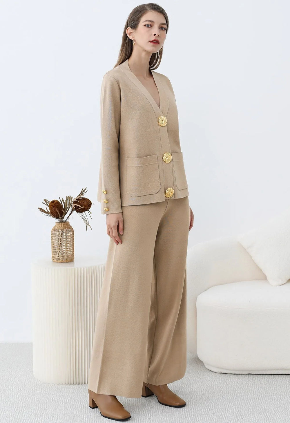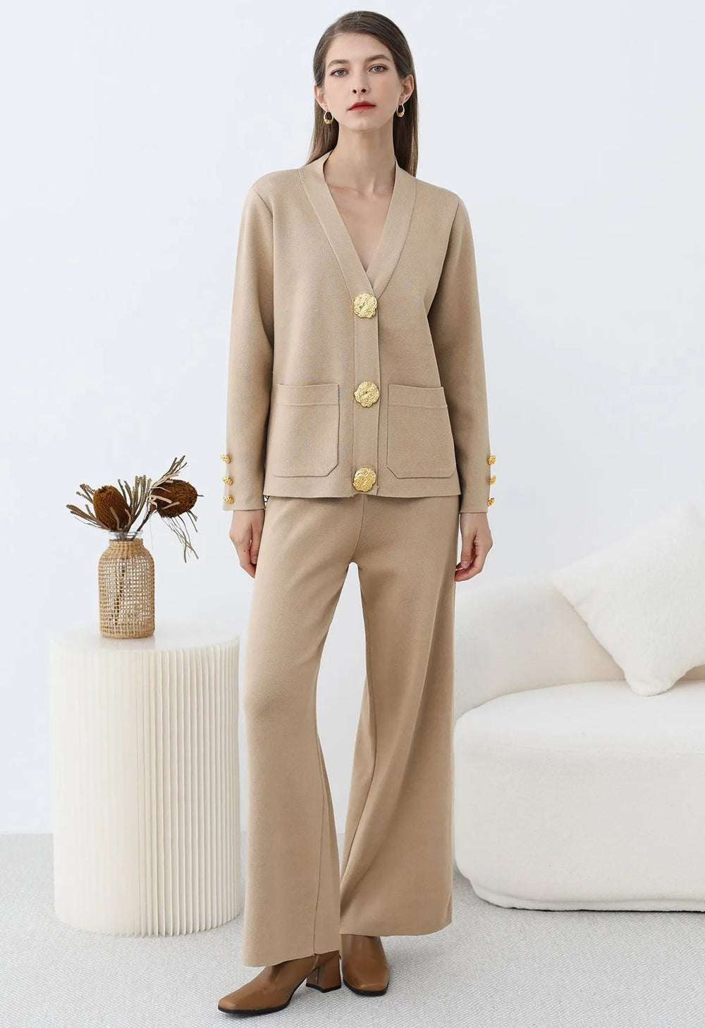 Elevate your winter wardrobe with this Golden Button Patch Pocket Knit Cardigan and Pants Set. The cardigan’s golden buttons and patch pockets evoke timeless elegance, while the soft knit fabric ensures effortless comfort. Paired with coordinating pants, this set blends classic charm with modern ease, making it a versatile choice for refined, everyday style.