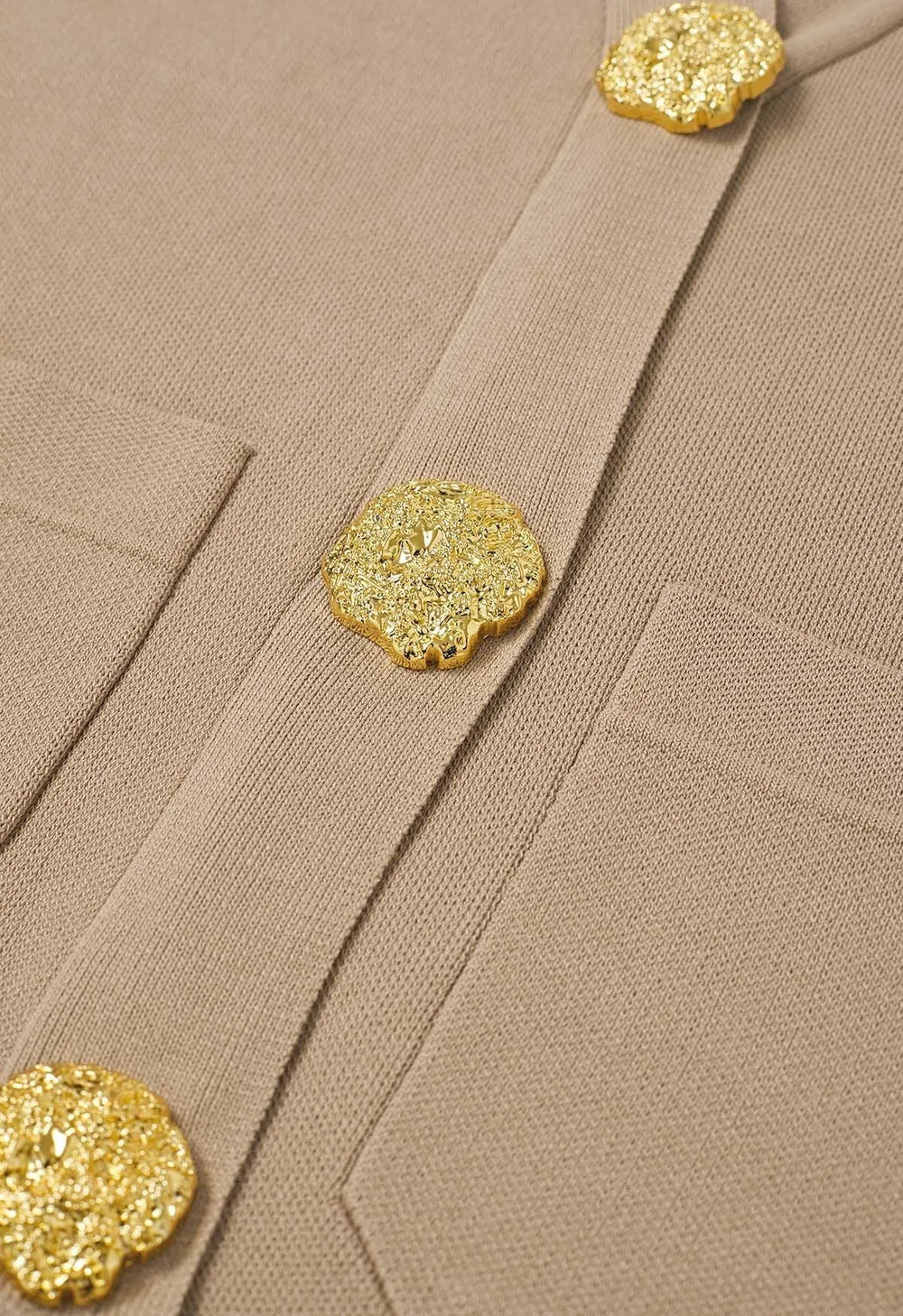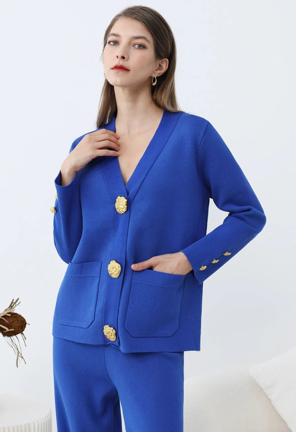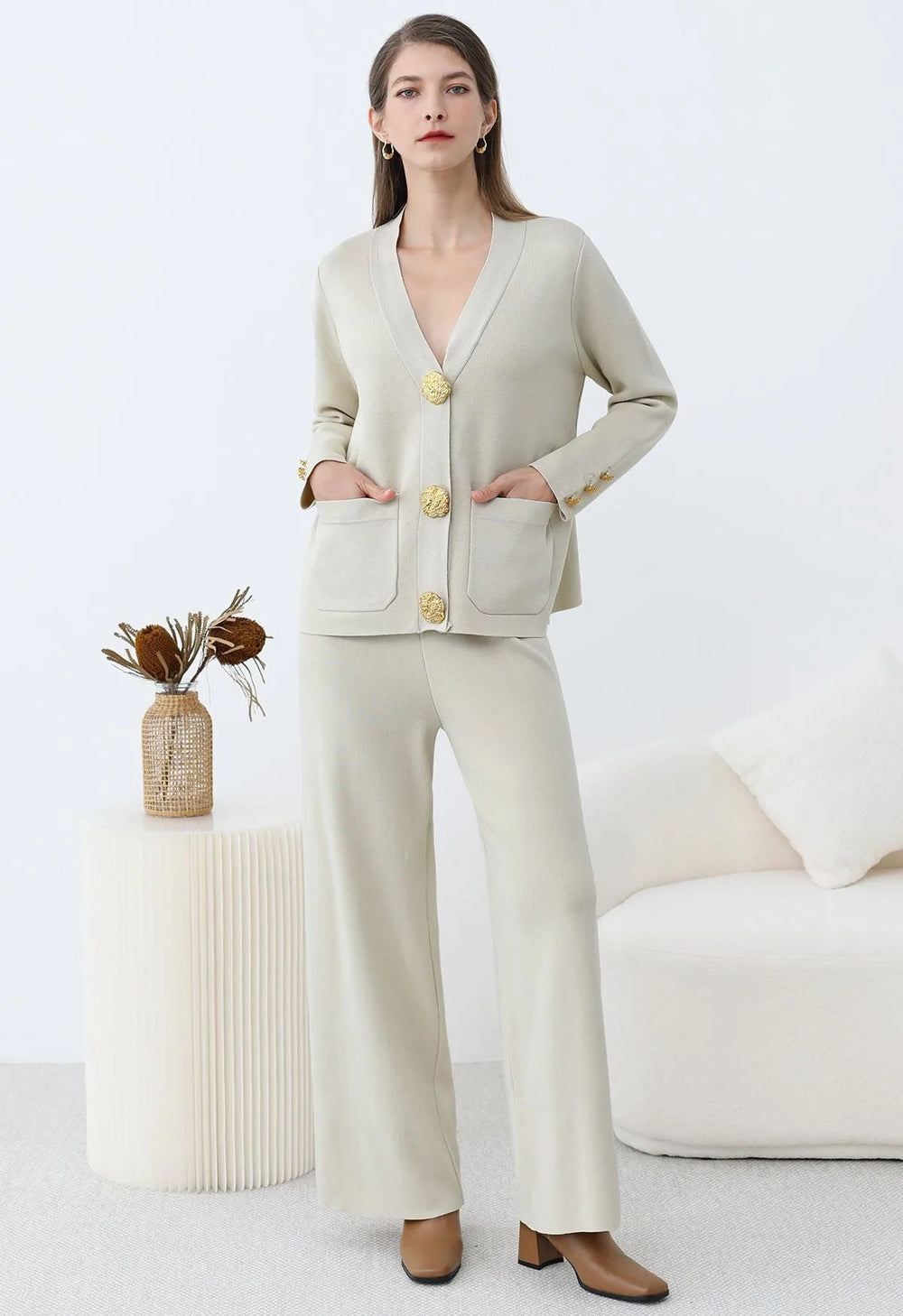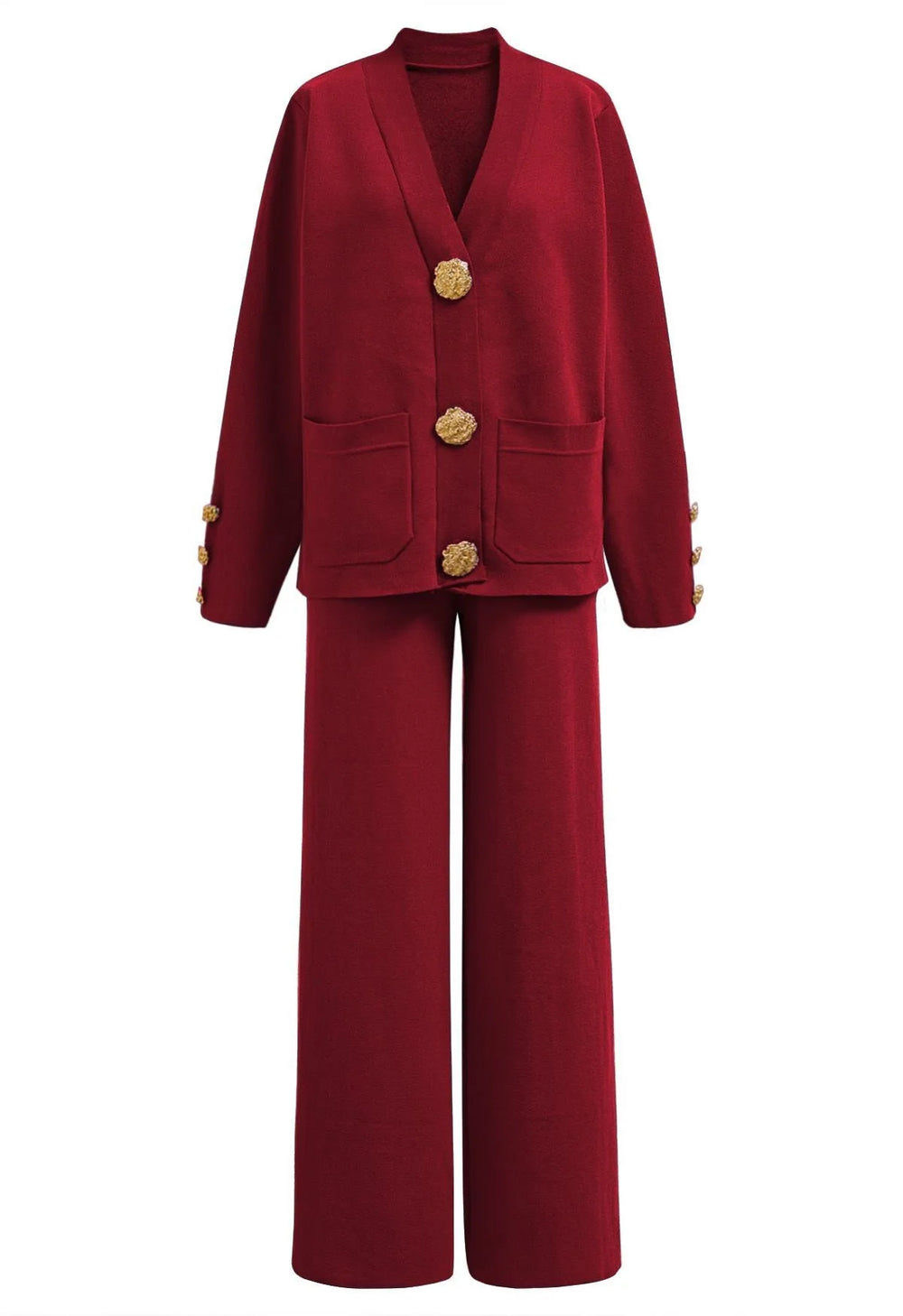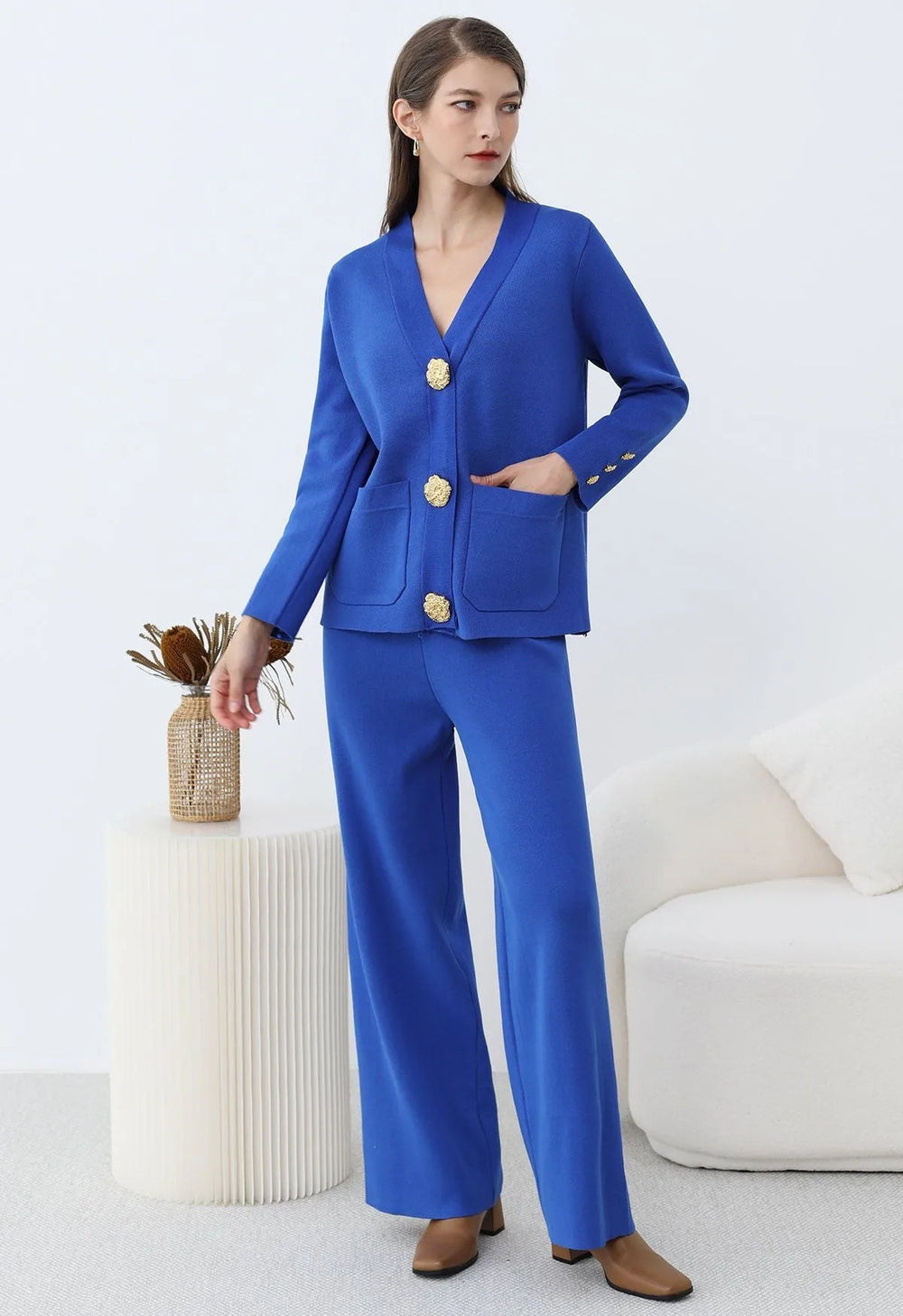 Elevate your winter wardrobe with this Golden Button Patch Pocket Knit Cardigan and Pants Set. The cardigan’s golden buttons and patch pockets evoke timeless elegance, while the soft knit fabric ensures effortless comfort. Paired with coordinating pants, this set blends classic charm with modern ease, making it a versatile choice for refined, everyday style.
