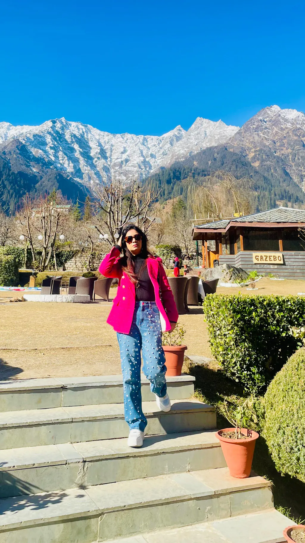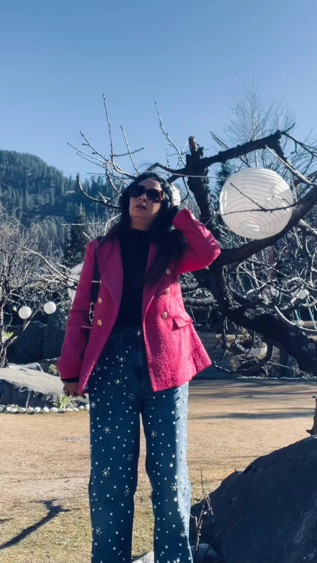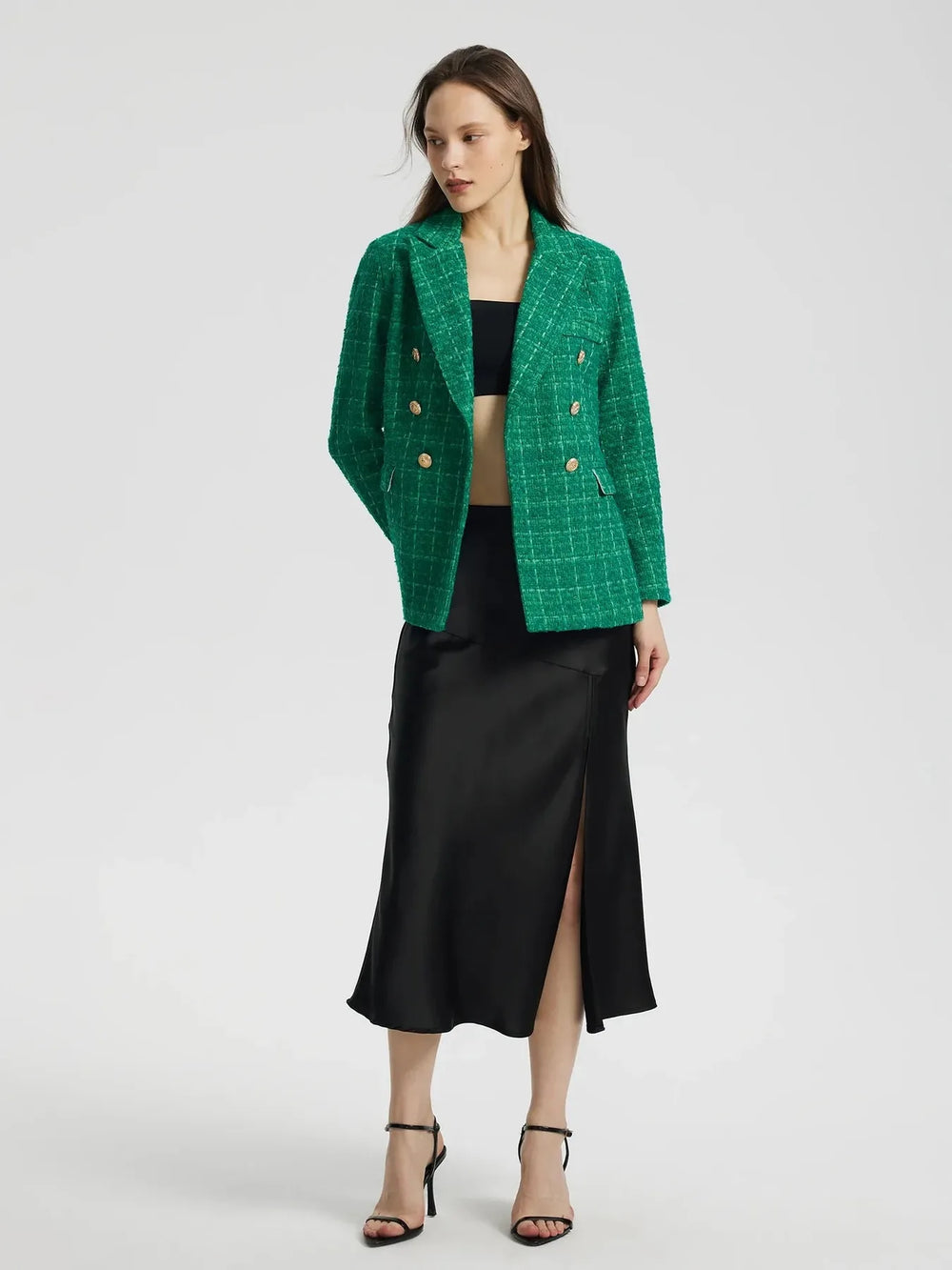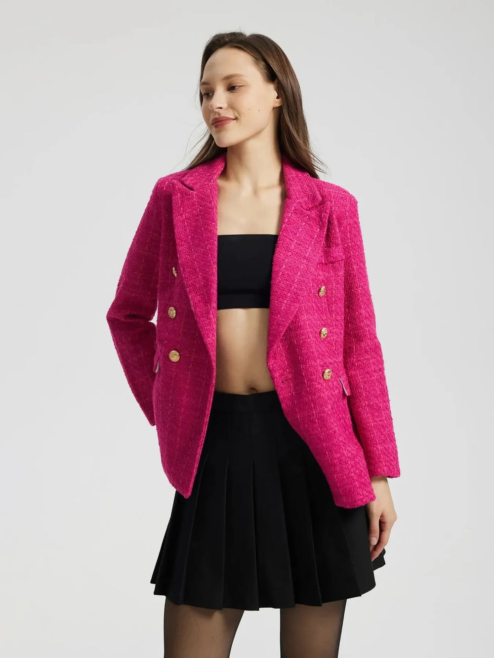 This blazer is crafted in a rich tweed texture and features a classic double-breasted front with polished gold buttons for a refined finish. The structured silhouette and vibrant colours feel both classy and modern making it stand out. Perfect for evenings where you want to shake things up.