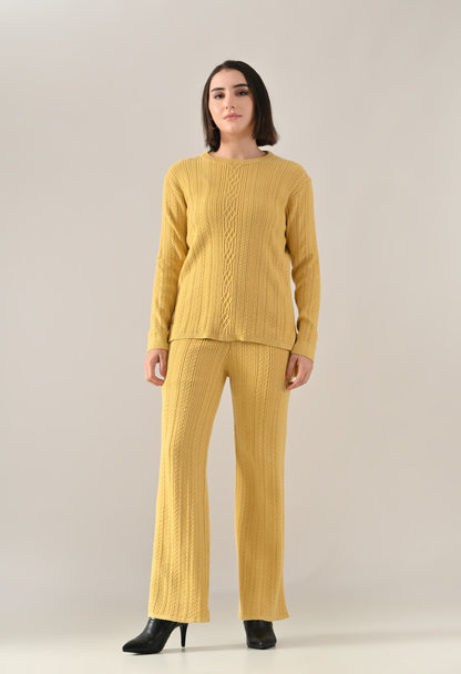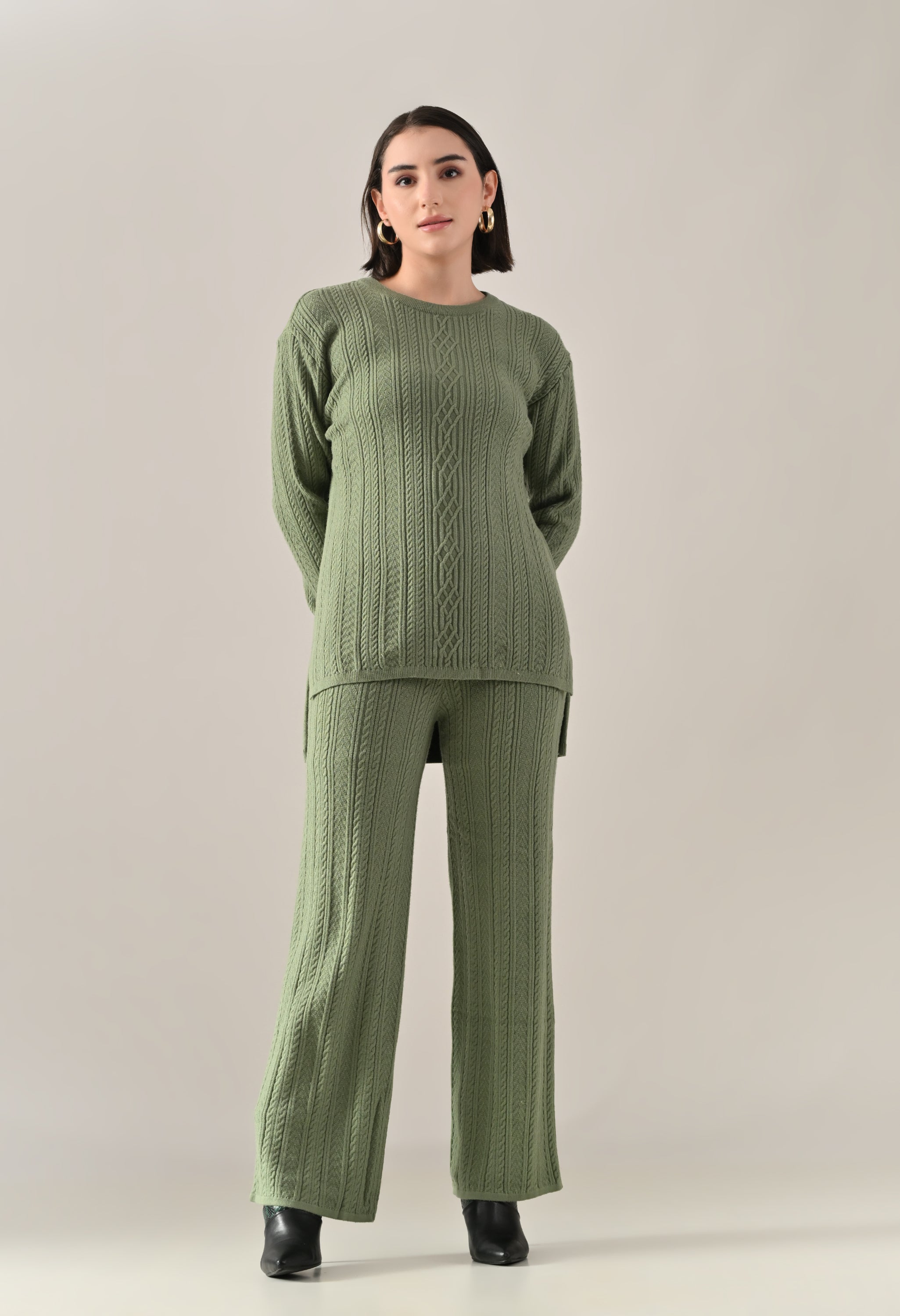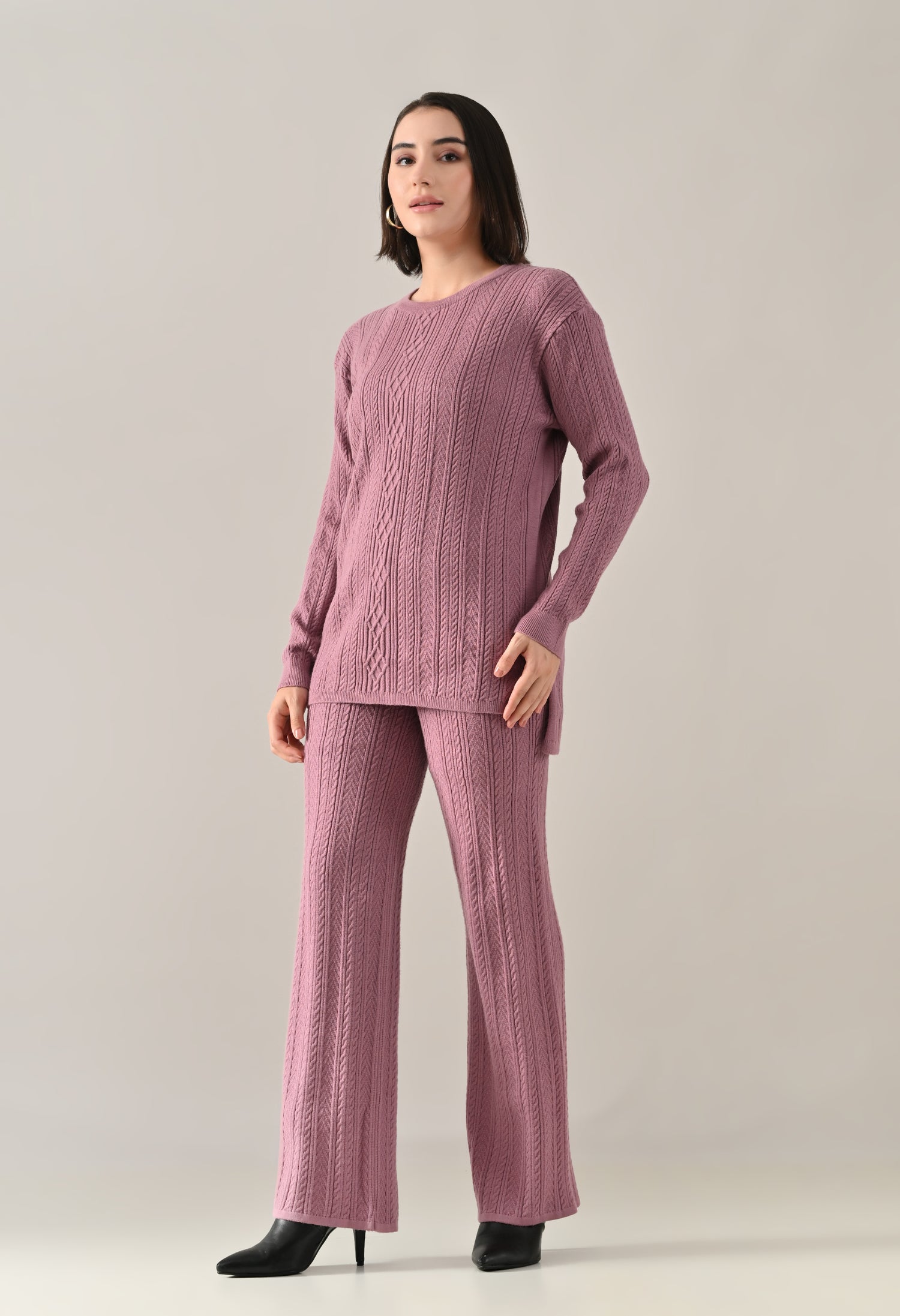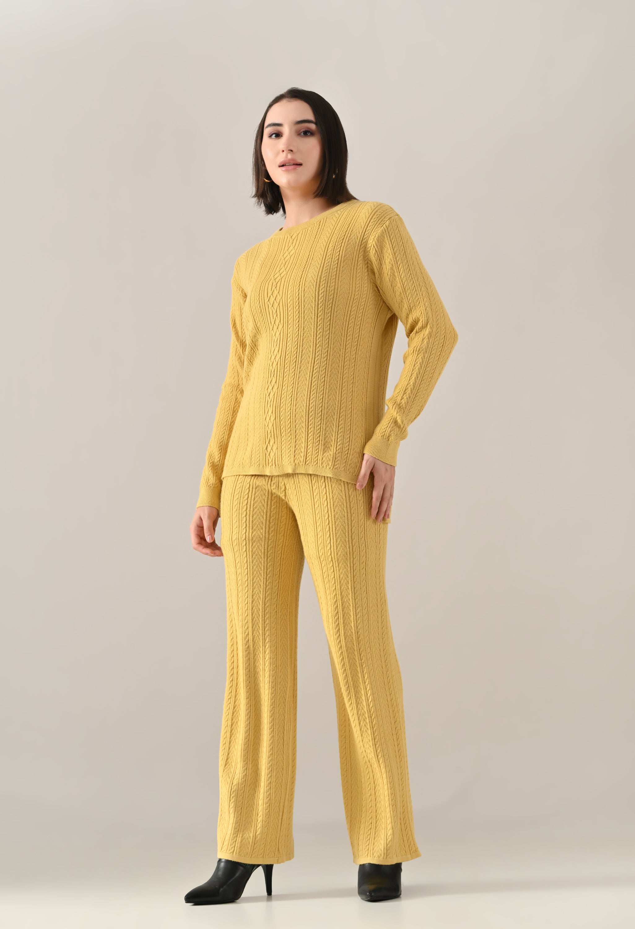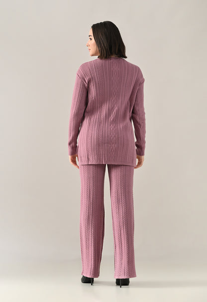 Elevate your knitwear game with this textured knitted co-ord set, blending comfort and chic design. The top features a round neckline with rib detailing, a high-low hem with side slits, and long fitted sleeves with ribbed cuffs for a sleek silhouette. Paired with textured straight lower, designed with a broad elasticated waistband and ribbed detailing at the waist and leg opening, this set offers a perfect mix of style and stretch. Crafted from soft, comfortable fabric, it’s ideal for effortless everyday elegance.