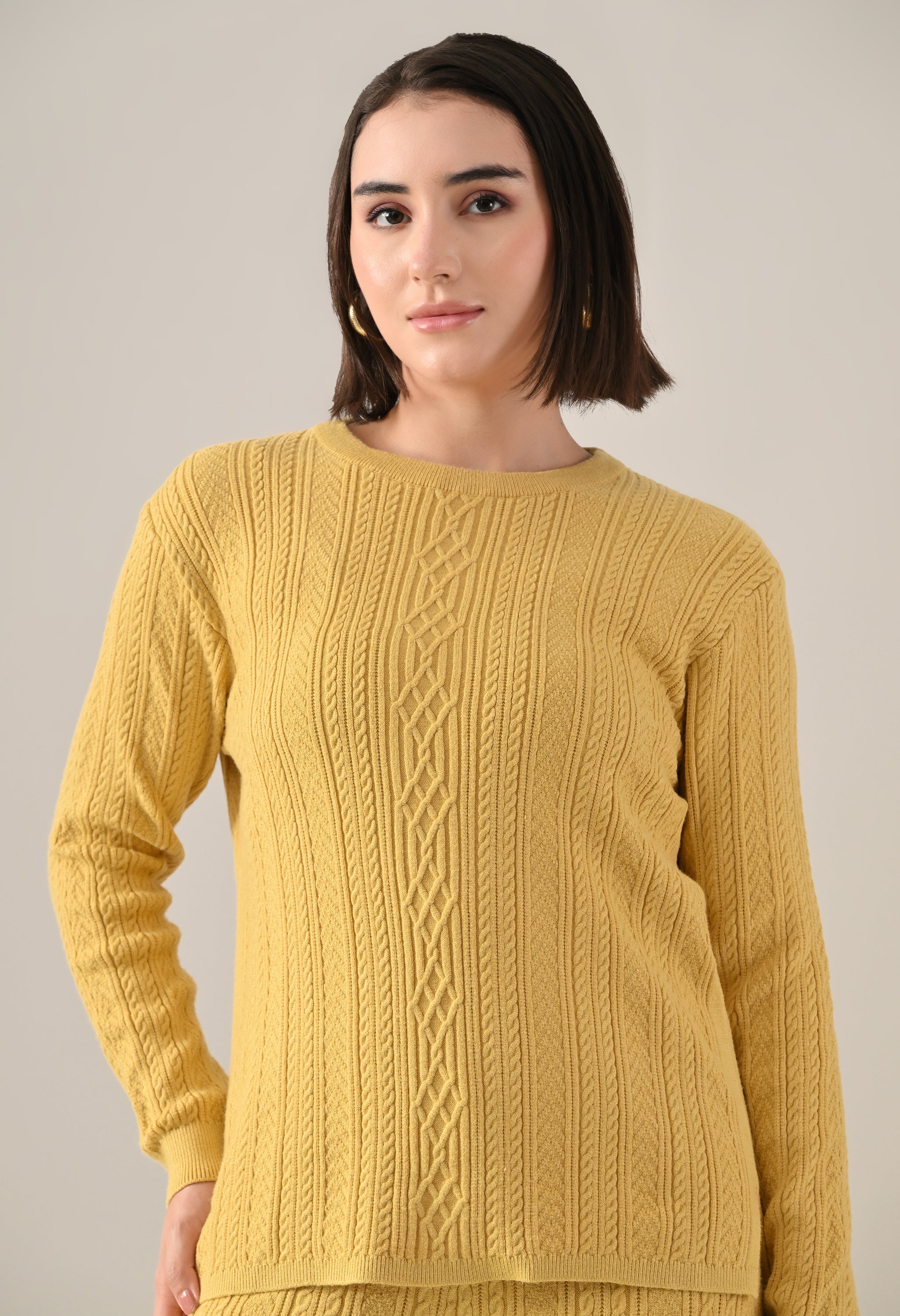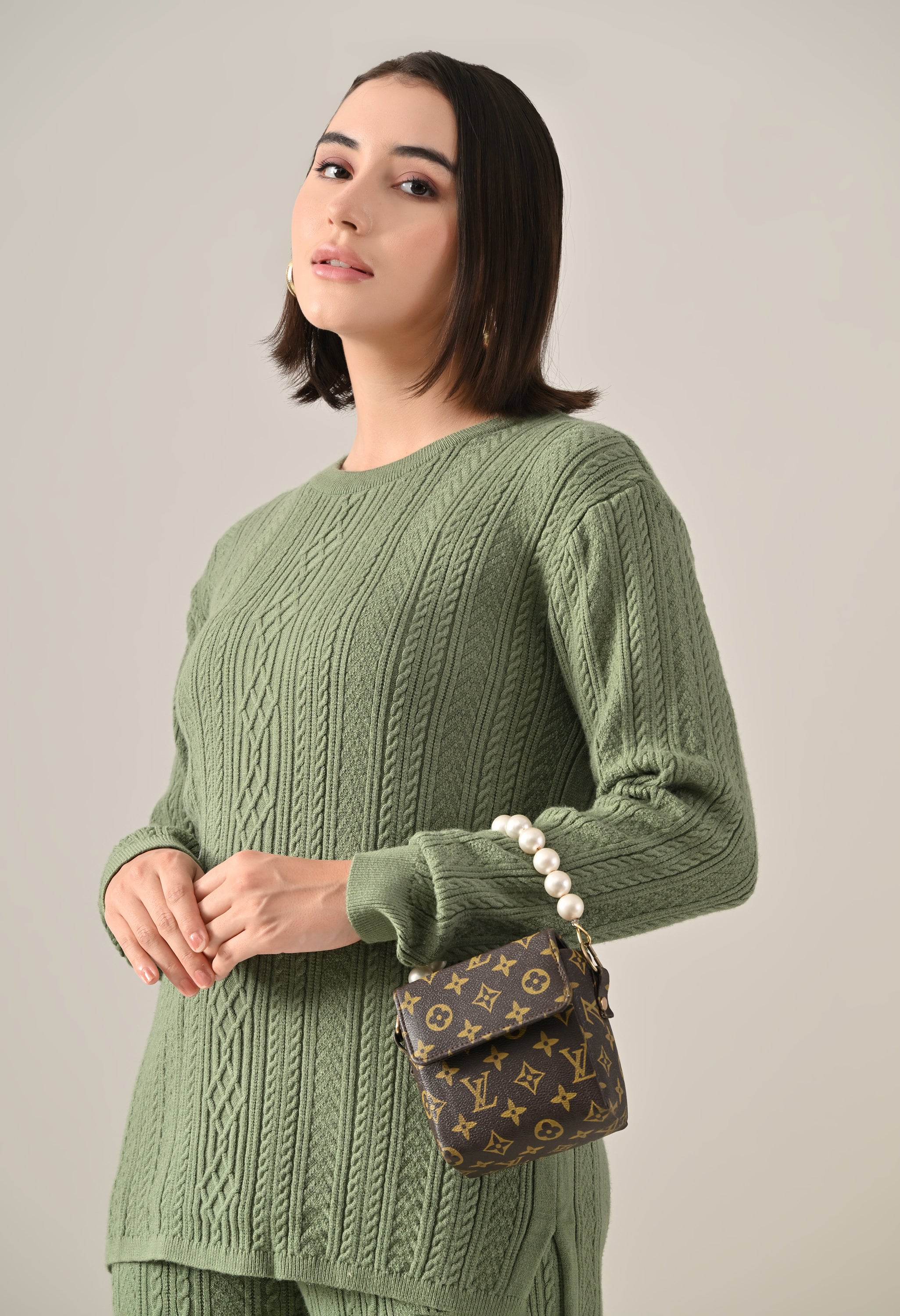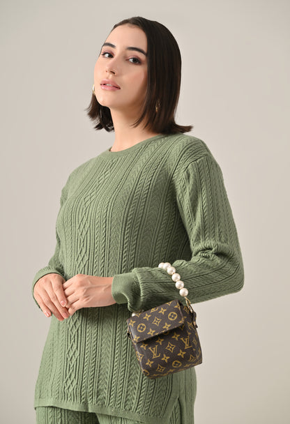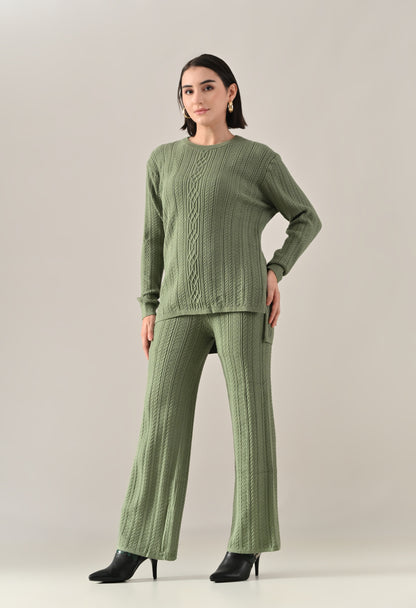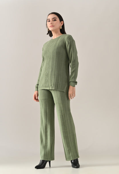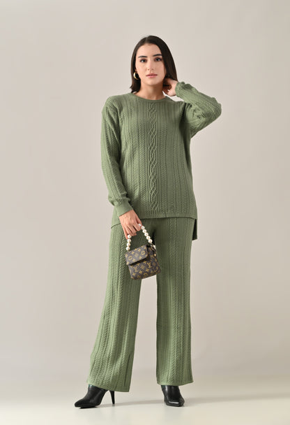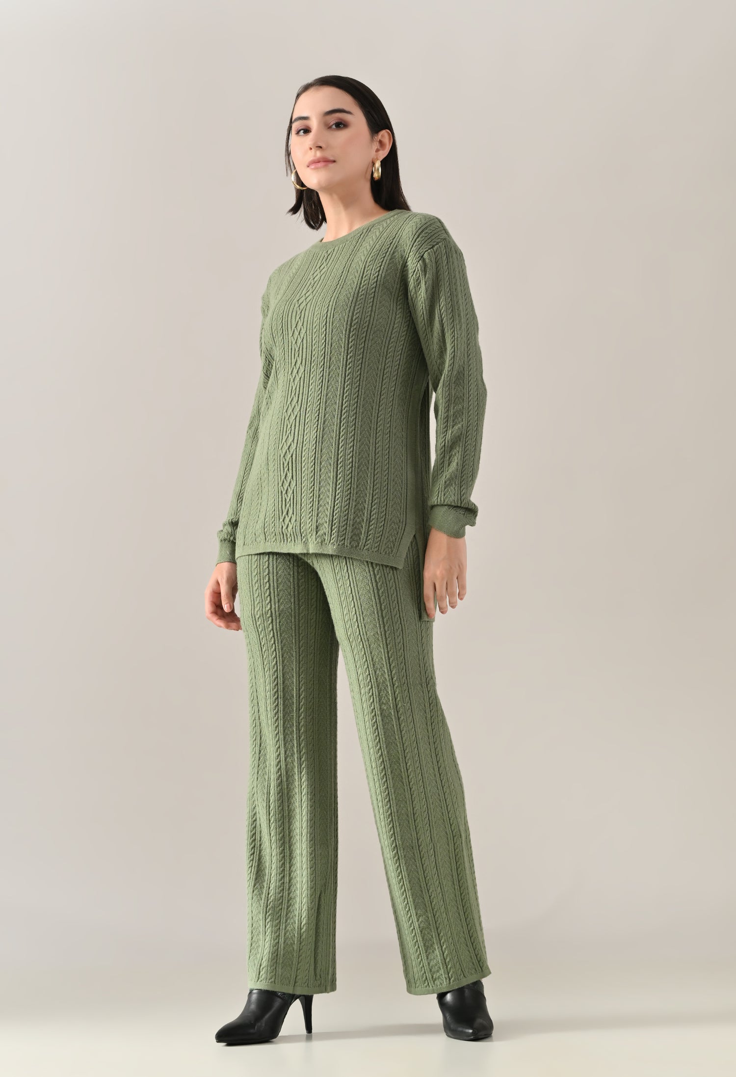 Elevate your knitwear game with this textured knitted co-ord set, blending comfort and chic design. The top features a round neckline with rib detailing, a high-low hem with side slits, and long fitted sleeves with ribbed cuffs for a sleek silhouette. Paired with textured straight lower, designed with a broad elasticated waistband and ribbed detailing at the waist and leg opening, this set offers a perfect mix of style and stretch. Crafted from soft, comfortable fabric, it’s ideal for effortless everyday elegance.