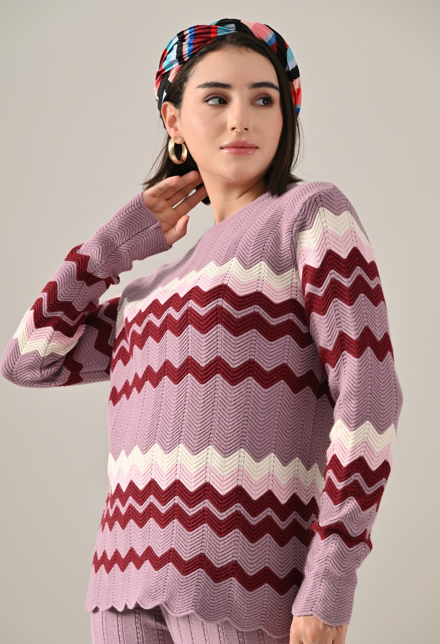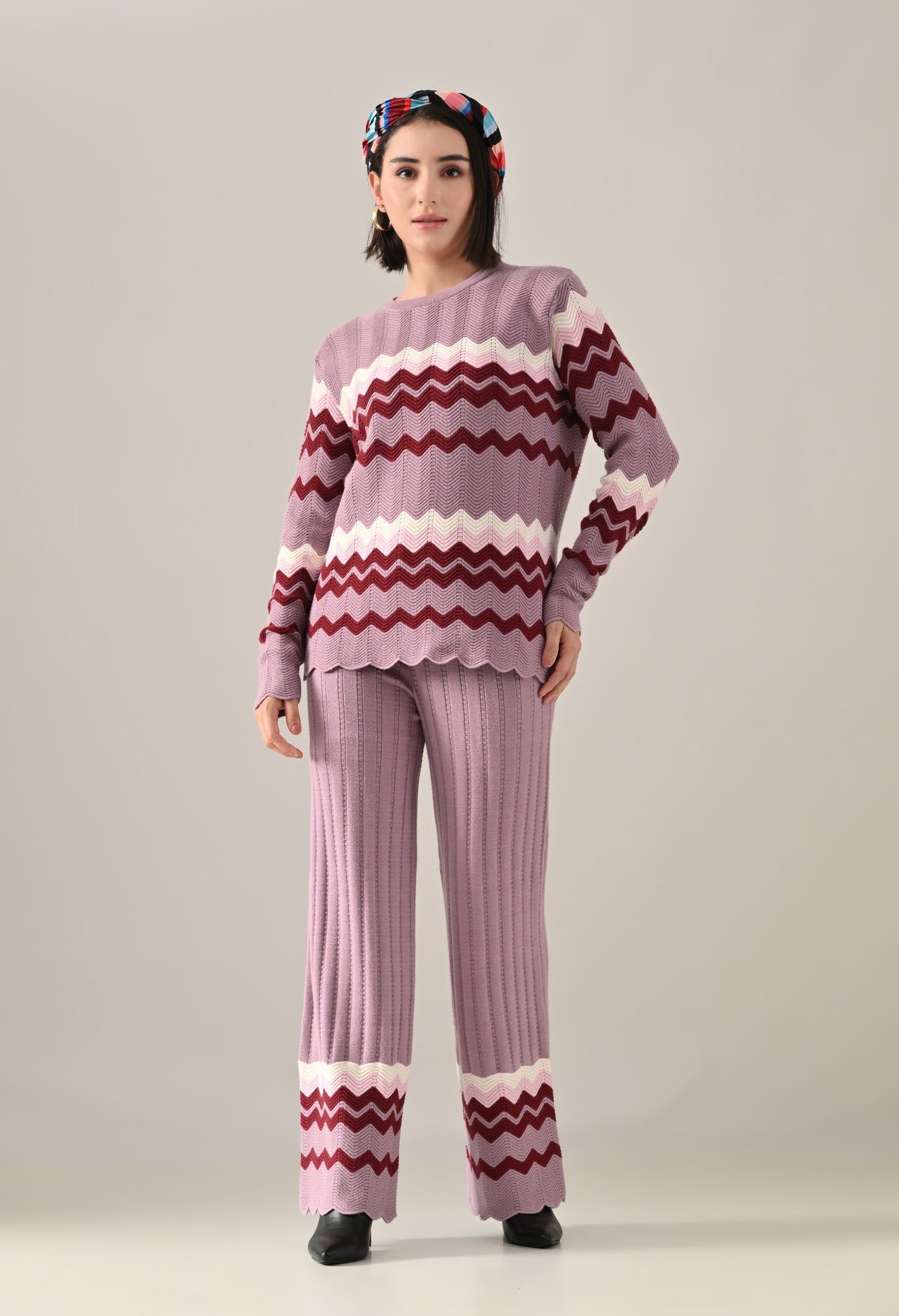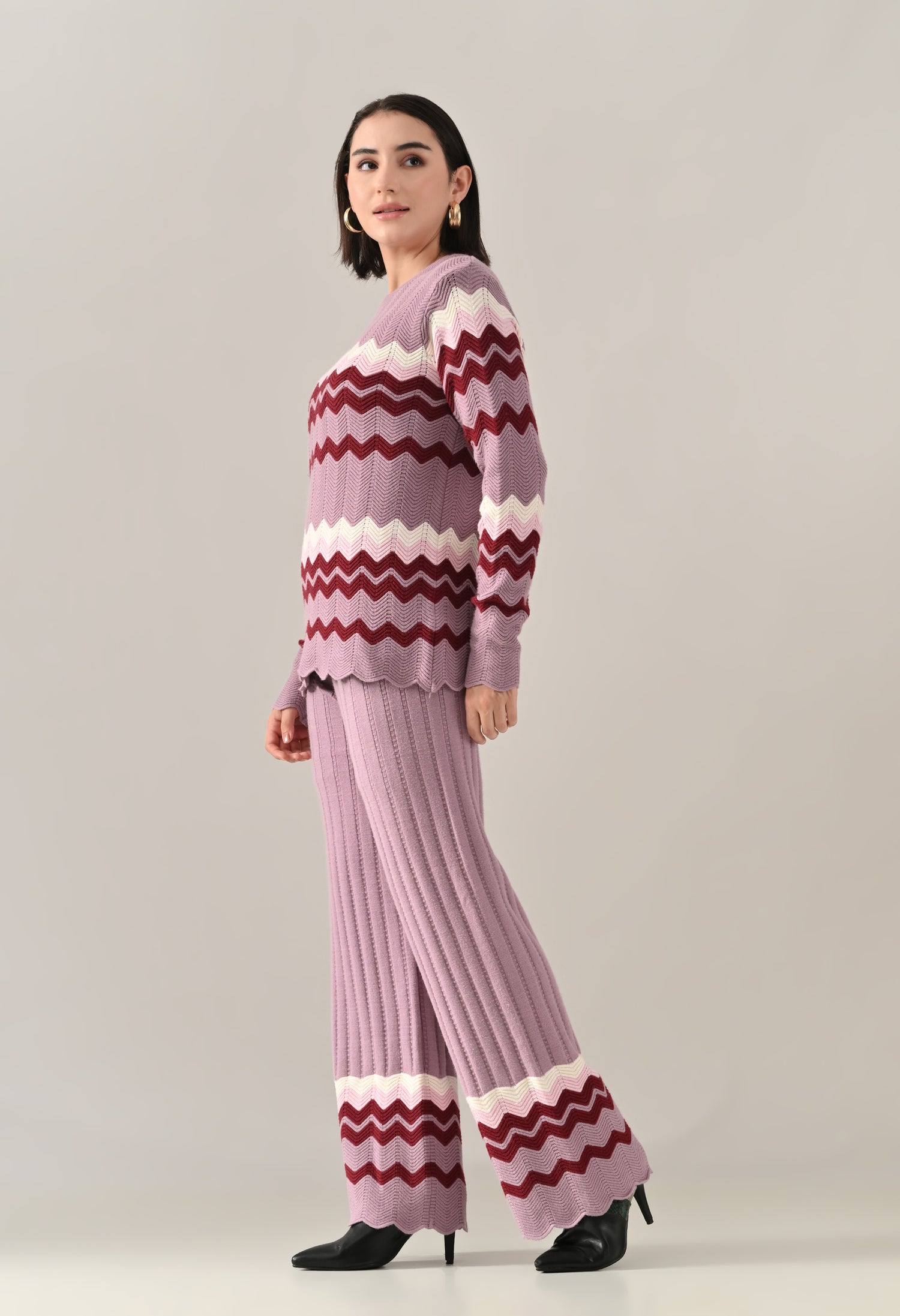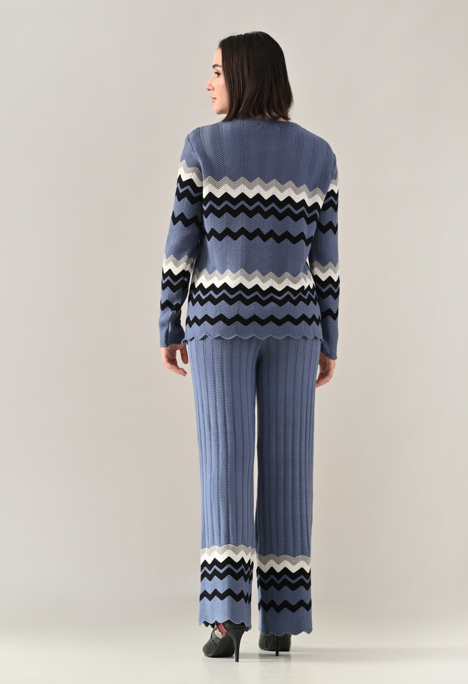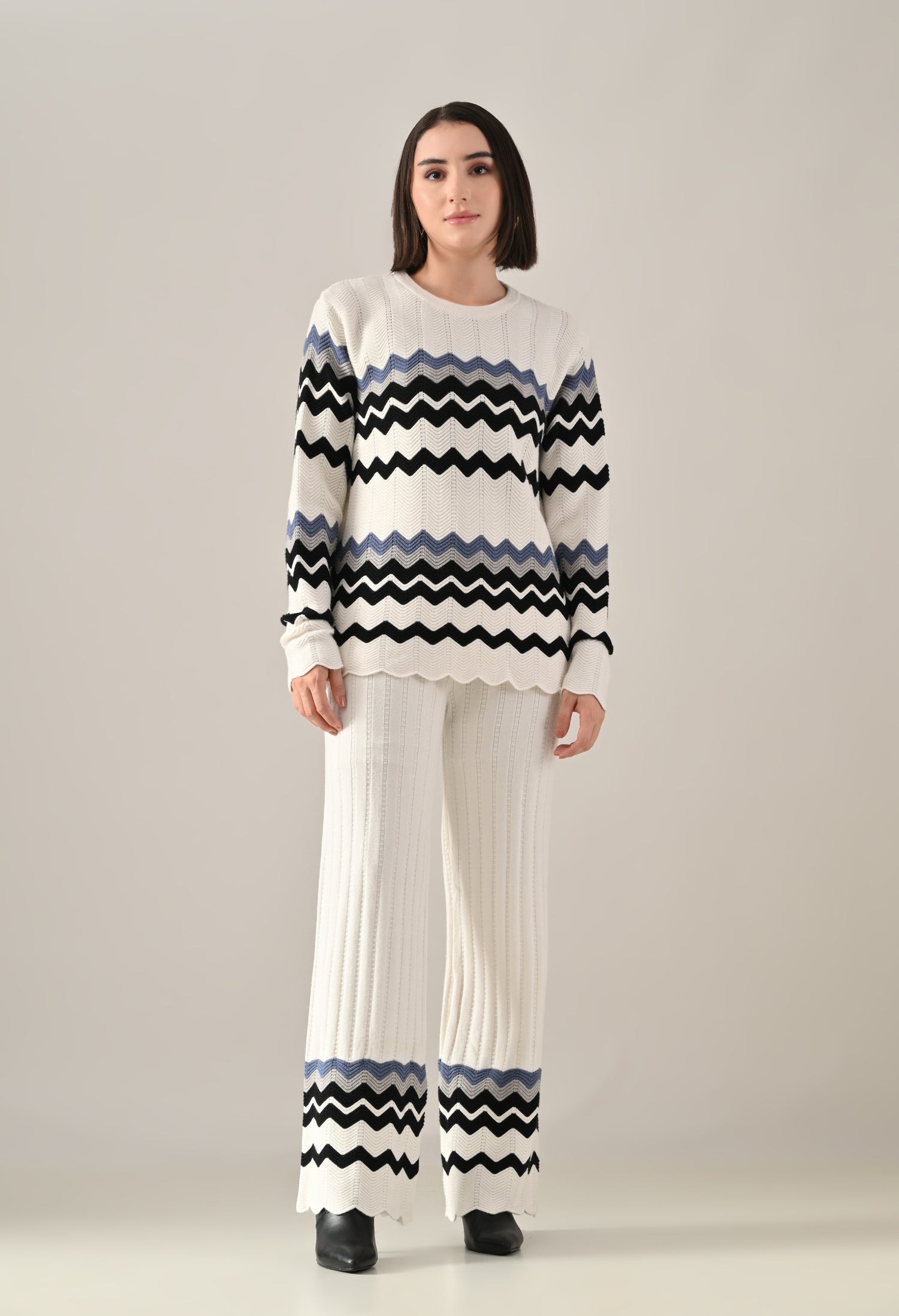 A stylish textured knitted co-ord set featuring a round neckline with rib detail and long fitted sleeves for a sleek, flattering fit. Enhanced with scalloped hem and sleeve openings for a touch of elegance, and an all-over zig-zag pattern that adds visual texture. Paired with flared trousers featuring a broad elasticated waist for comfort and ease. Crafted from soft, comfortable, and stretchable fabric, this set offers a perfect blend of coziness and contemporary style.