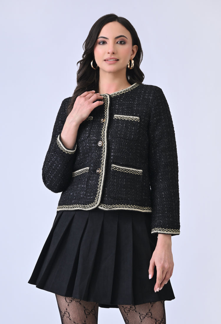 This sophisticated tweed jacket showcases a timeless, structured silhouette with a rich textured finish. Crafted in a classic black tone, it is elevated with contrast braided trim along the neckline, front placket, pocket edges, and hem for a refined, couture-inspired look. The jacket features decorative gold-tone buttons at the front, adding an elegant accent. Designed with multiple pockets, it blends classic tailoring with modern chic appeal—perfect for polished day-to-evening styling.
