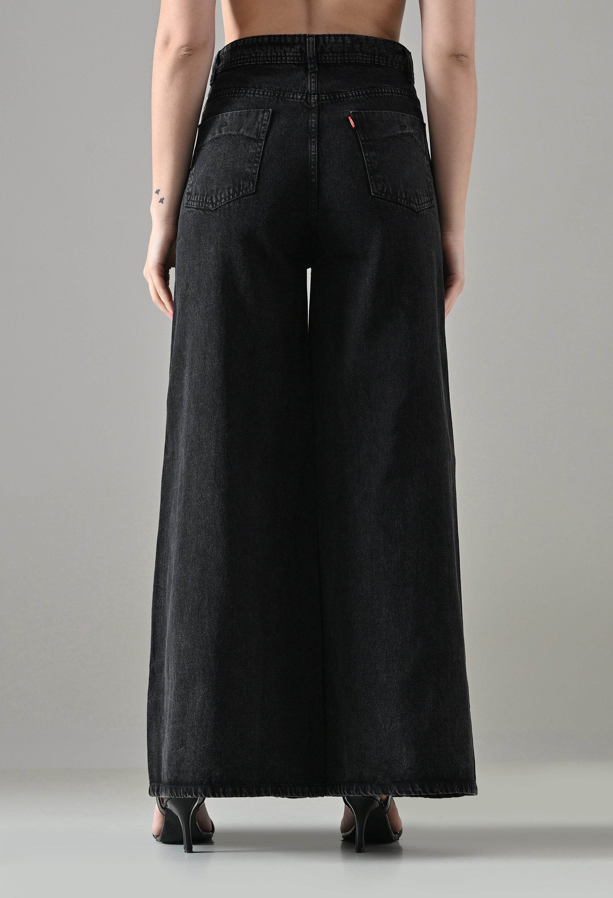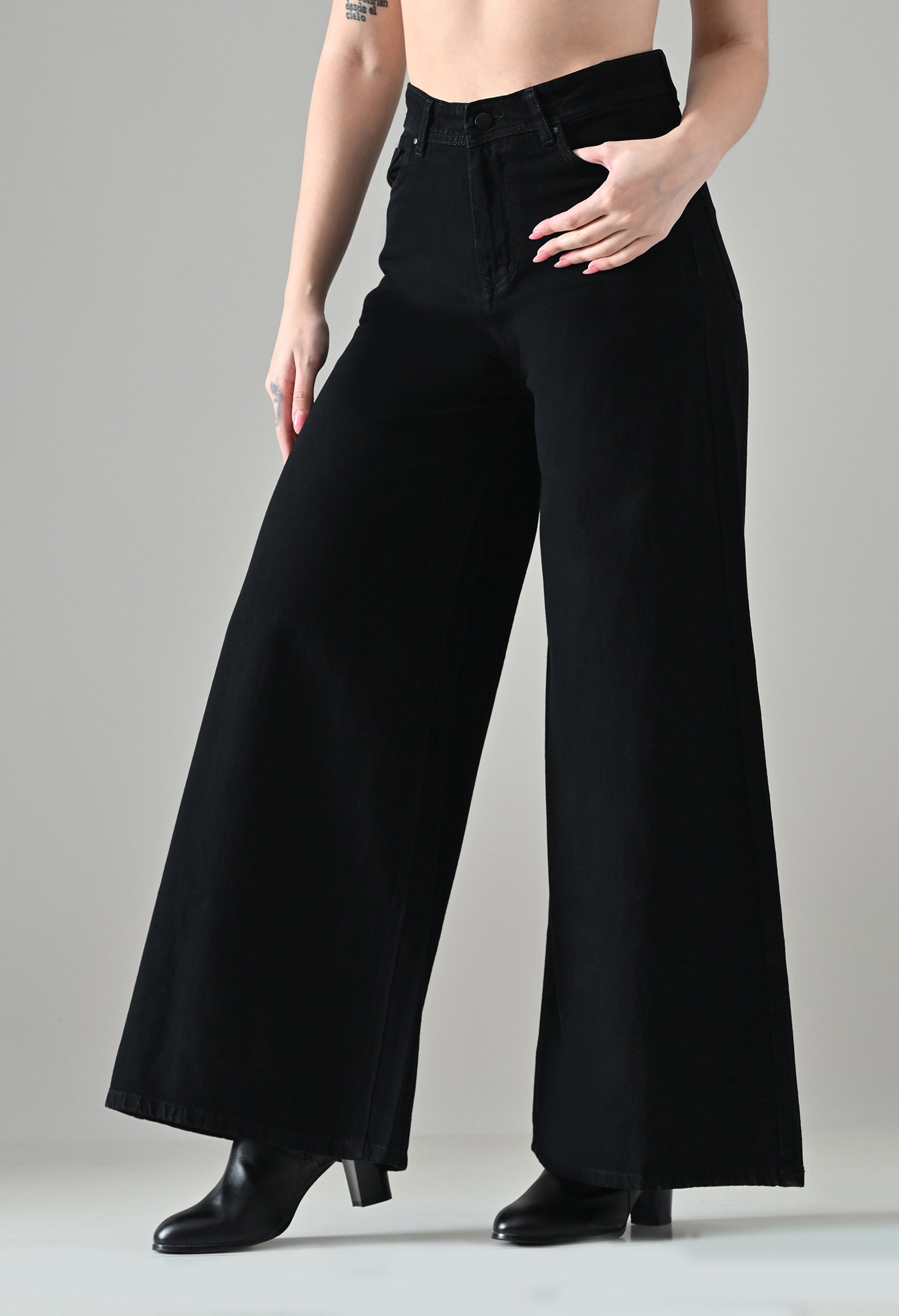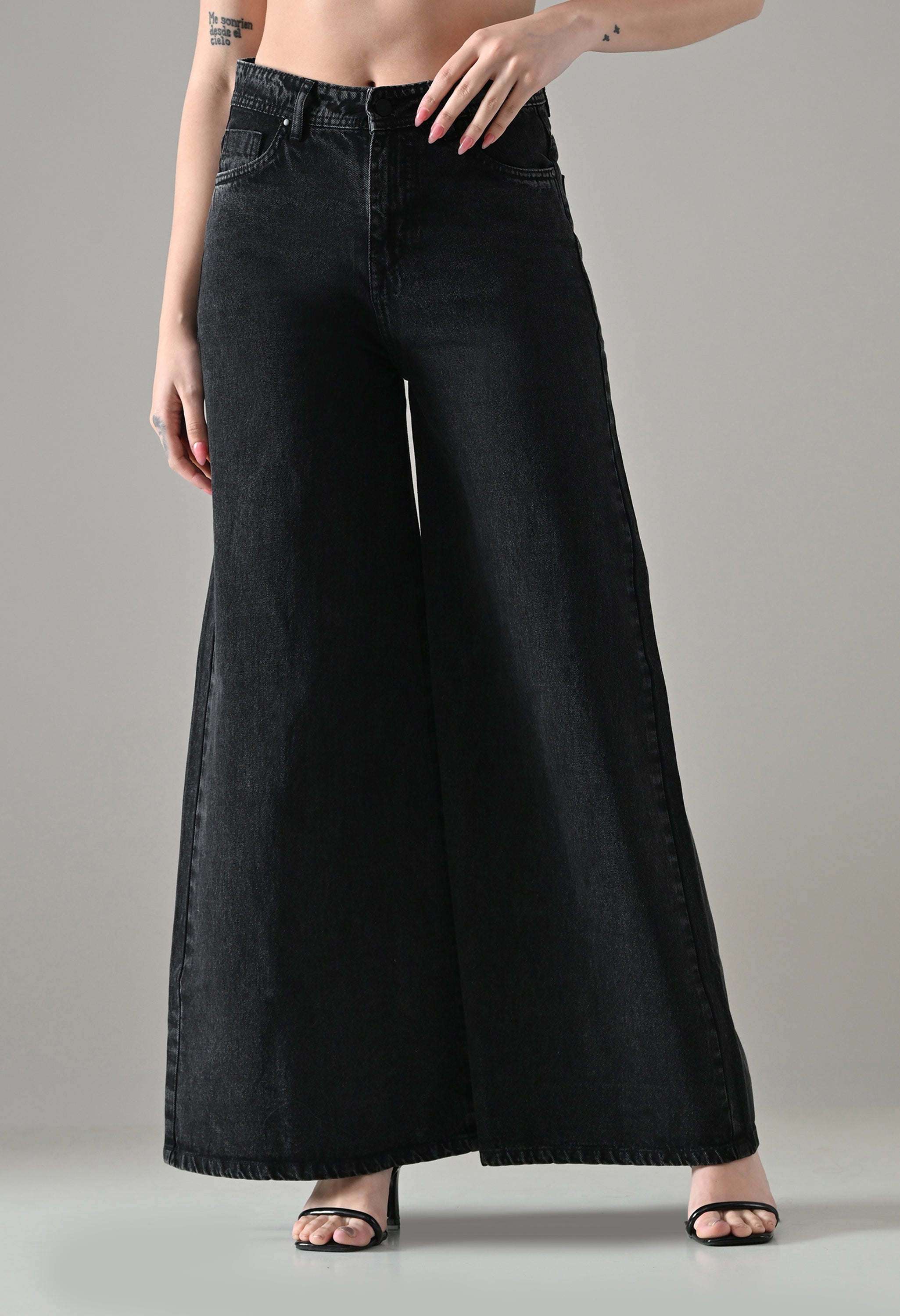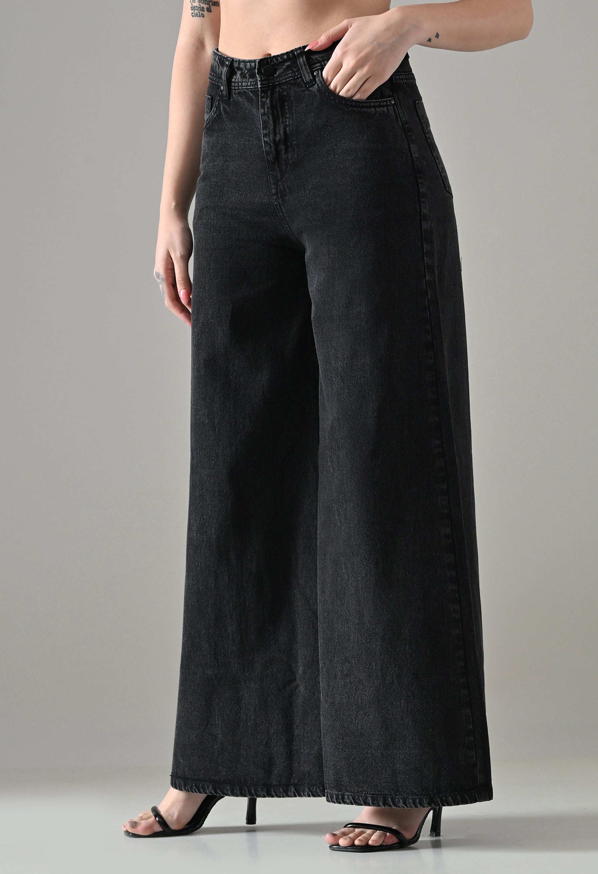 These denim jeans feature a bold wide-leg silhouette with a relaxed fit, delivering an effortlessly cool, trend-forward look. Designed with a high-rise waist and structured denim finish, they create a flattering shape while offering comfort and ease of movement. The deep black wash adds a sleek, versatile edge, making them a staple for street style, casual outings, and statement everyday wear.