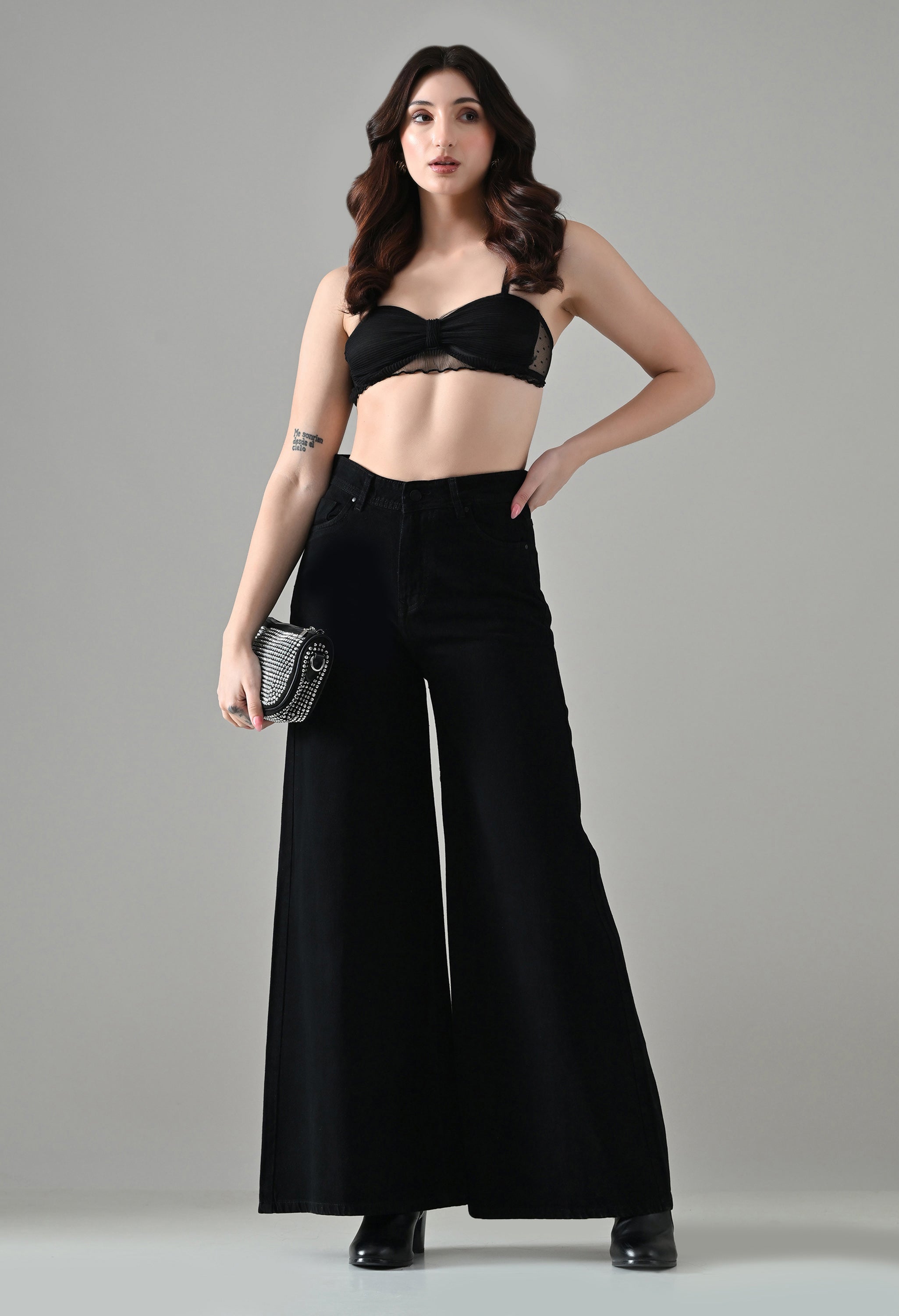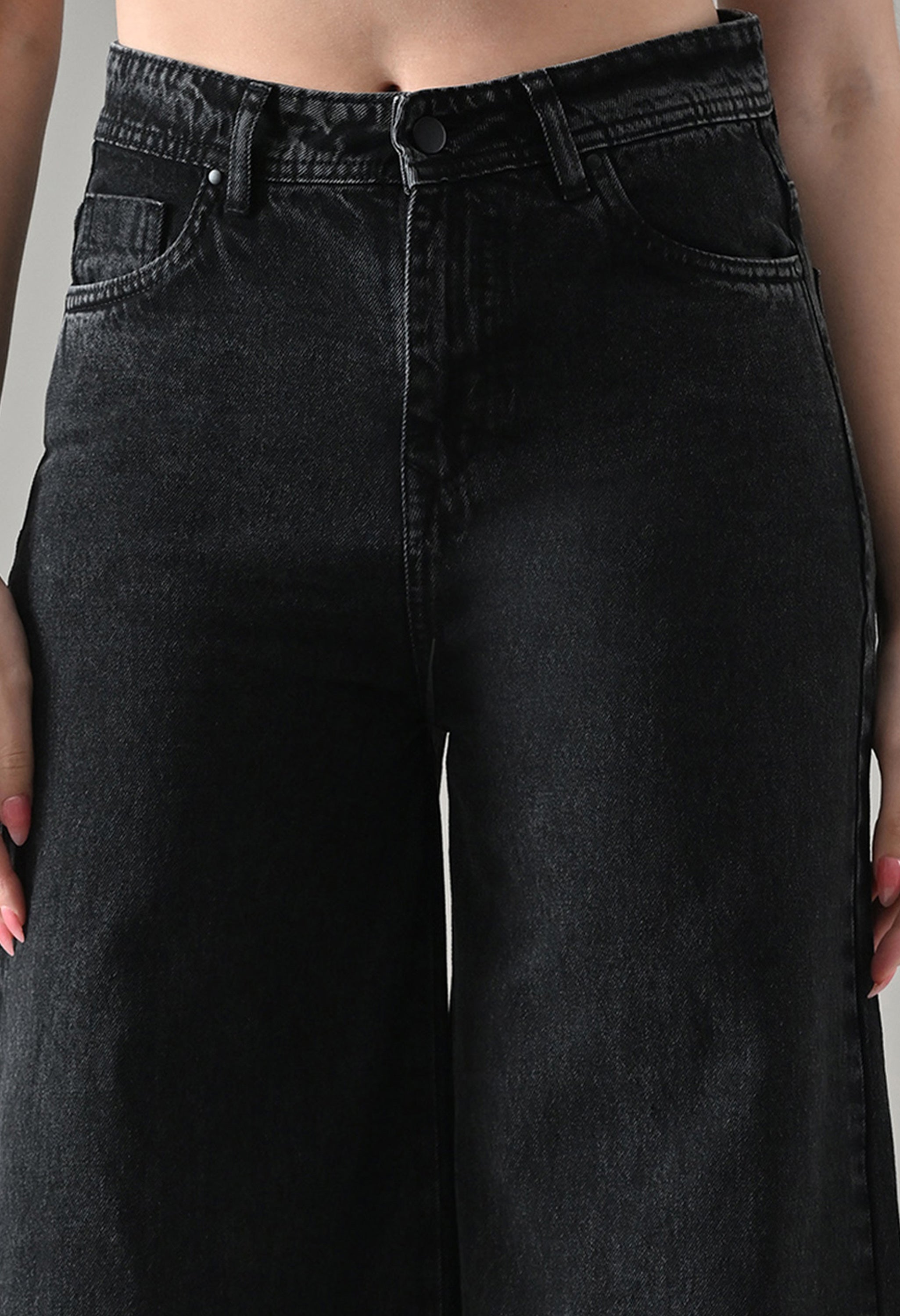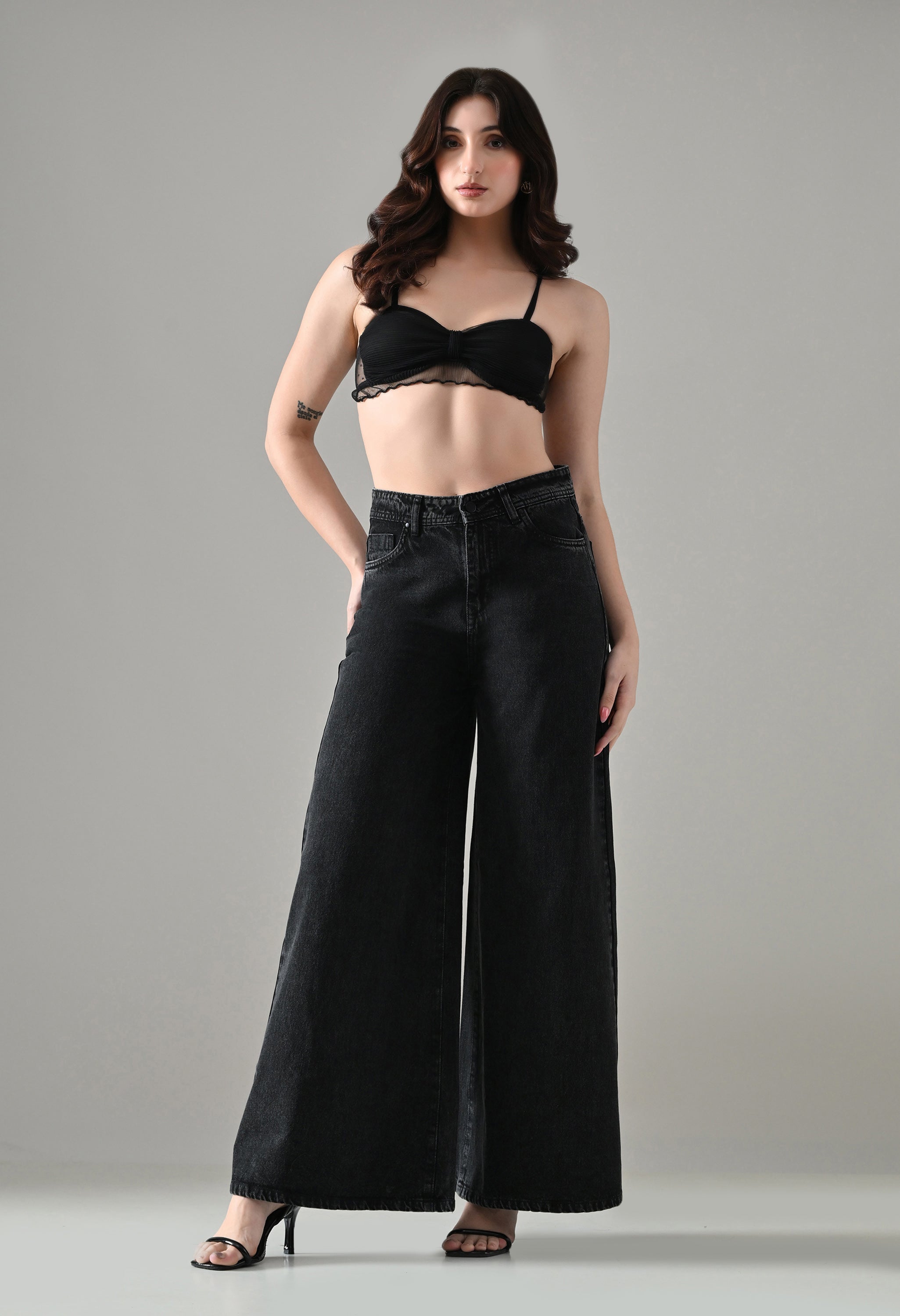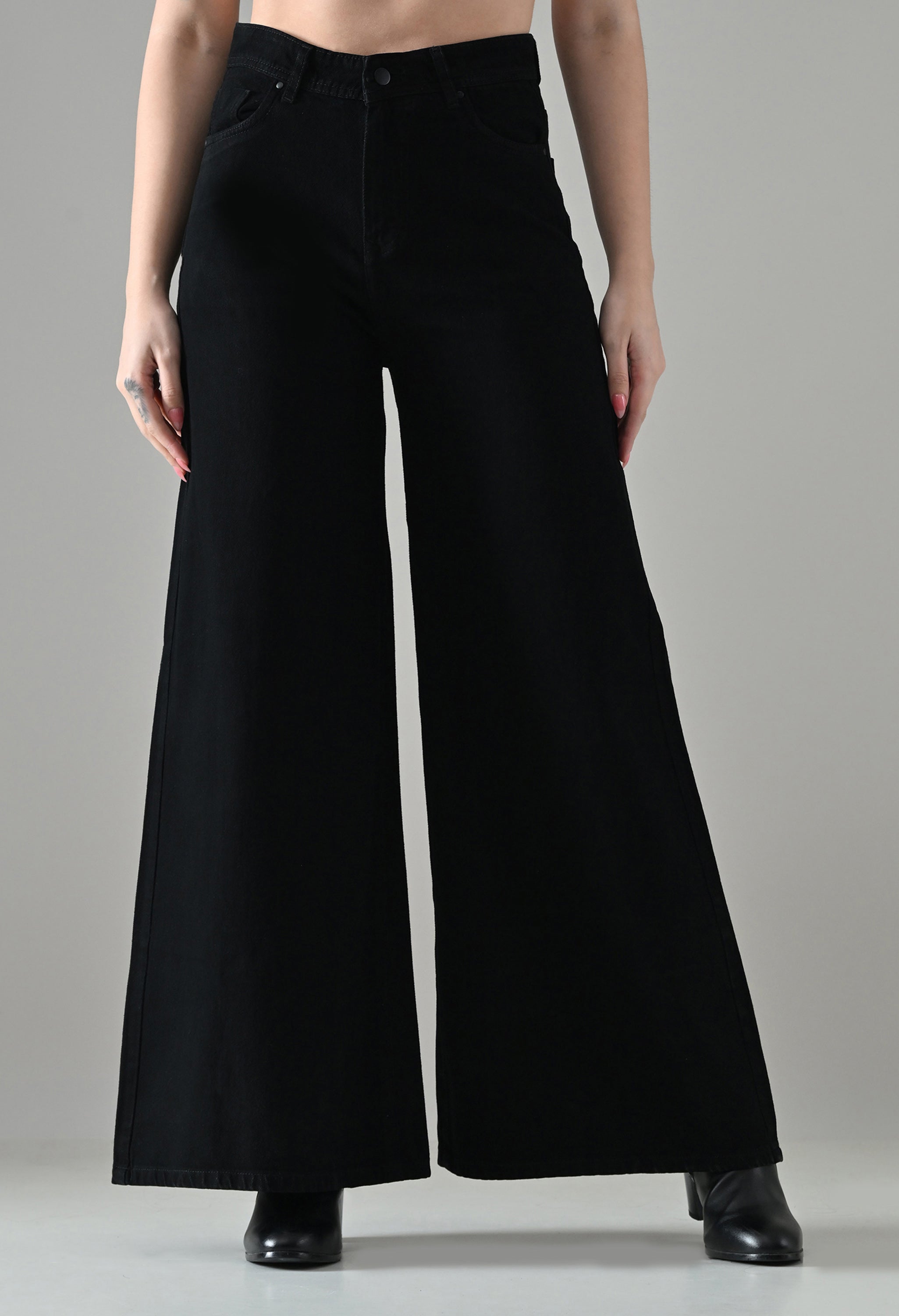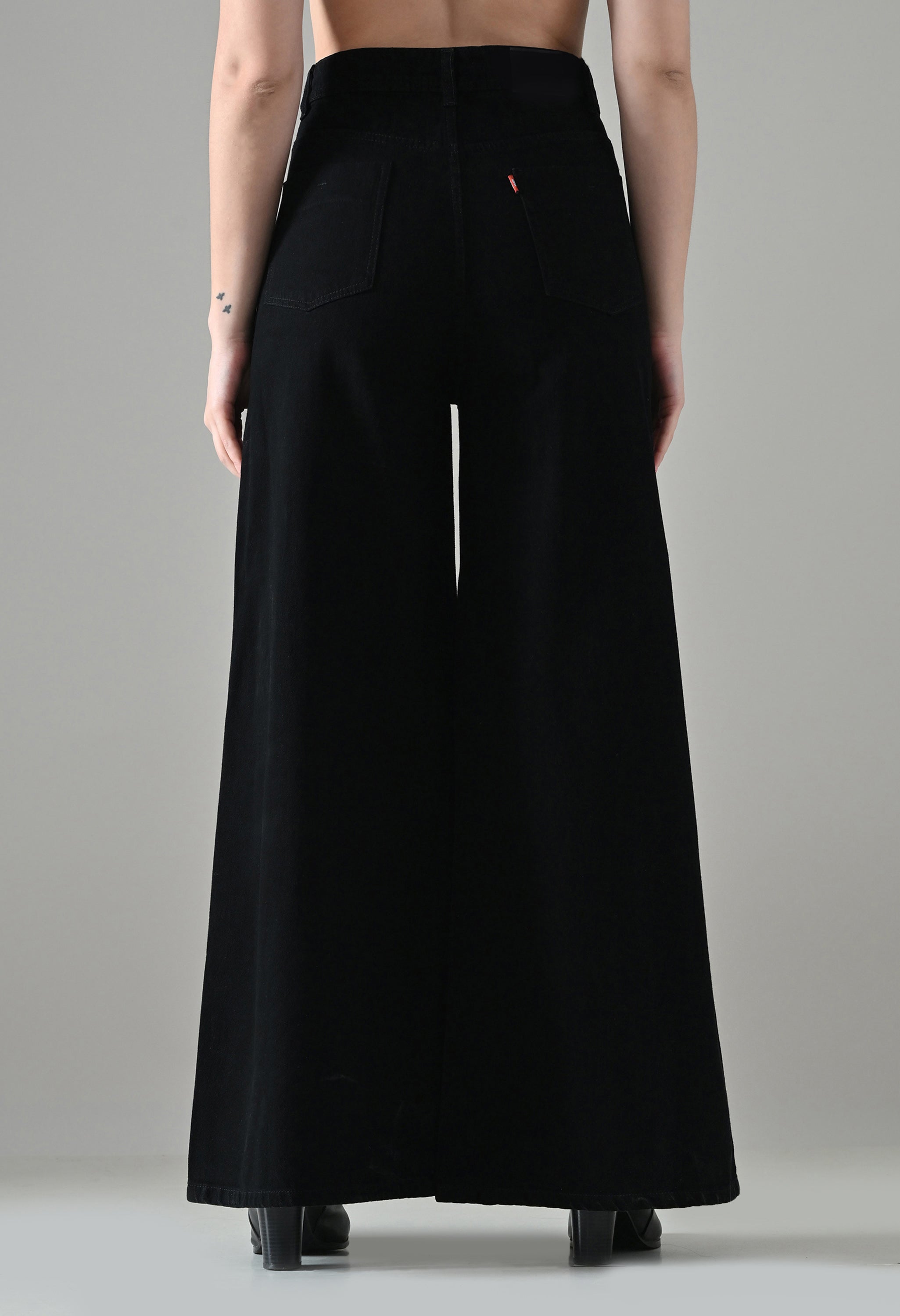 These denim jeans feature a bold wide-leg silhouette with a relaxed fit, delivering an effortlessly cool, trend-forward look. Designed with a high-rise waist and structured denim finish, they create a flattering shape while offering comfort and ease of movement. The deep black wash adds a sleek, versatile edge, making them a staple for street style, casual outings, and statement everyday wear.