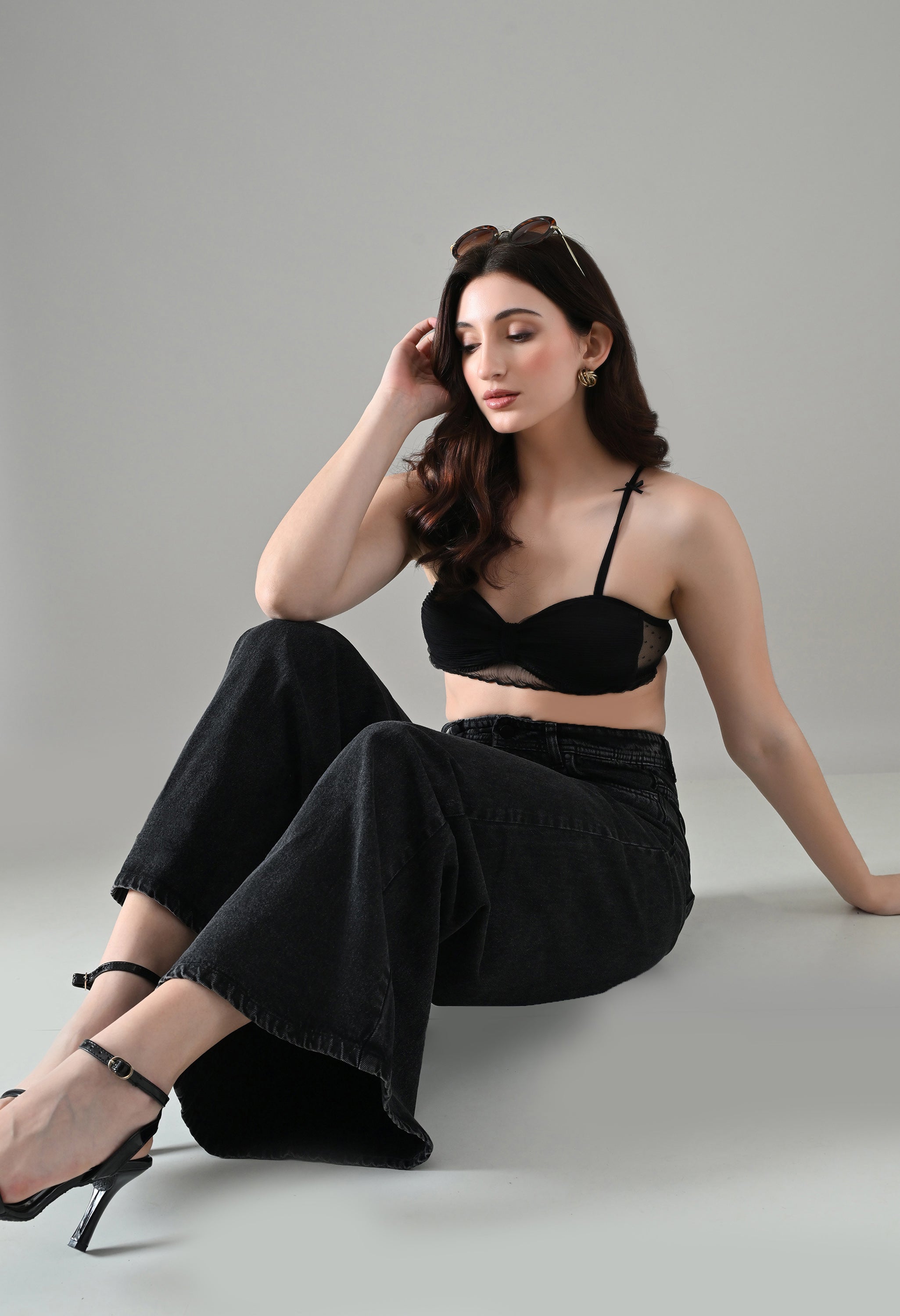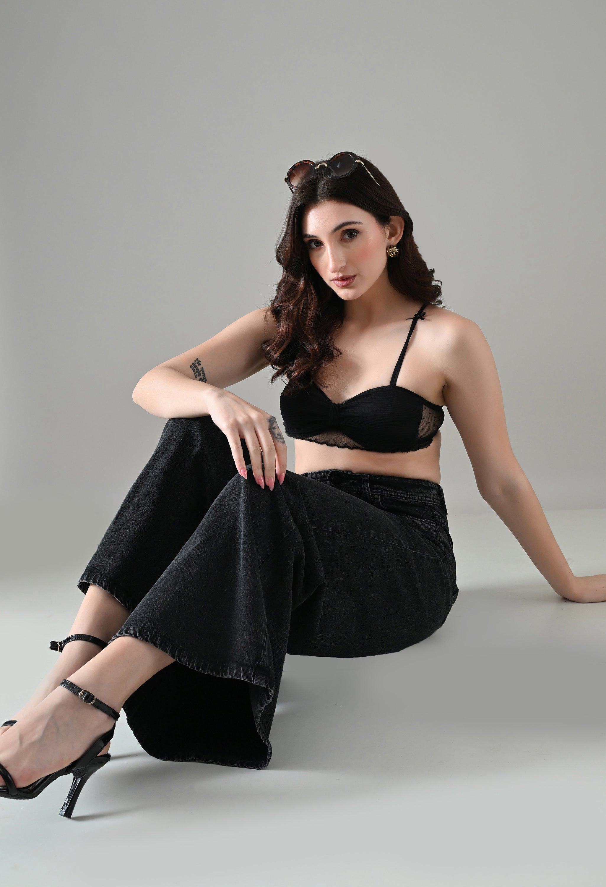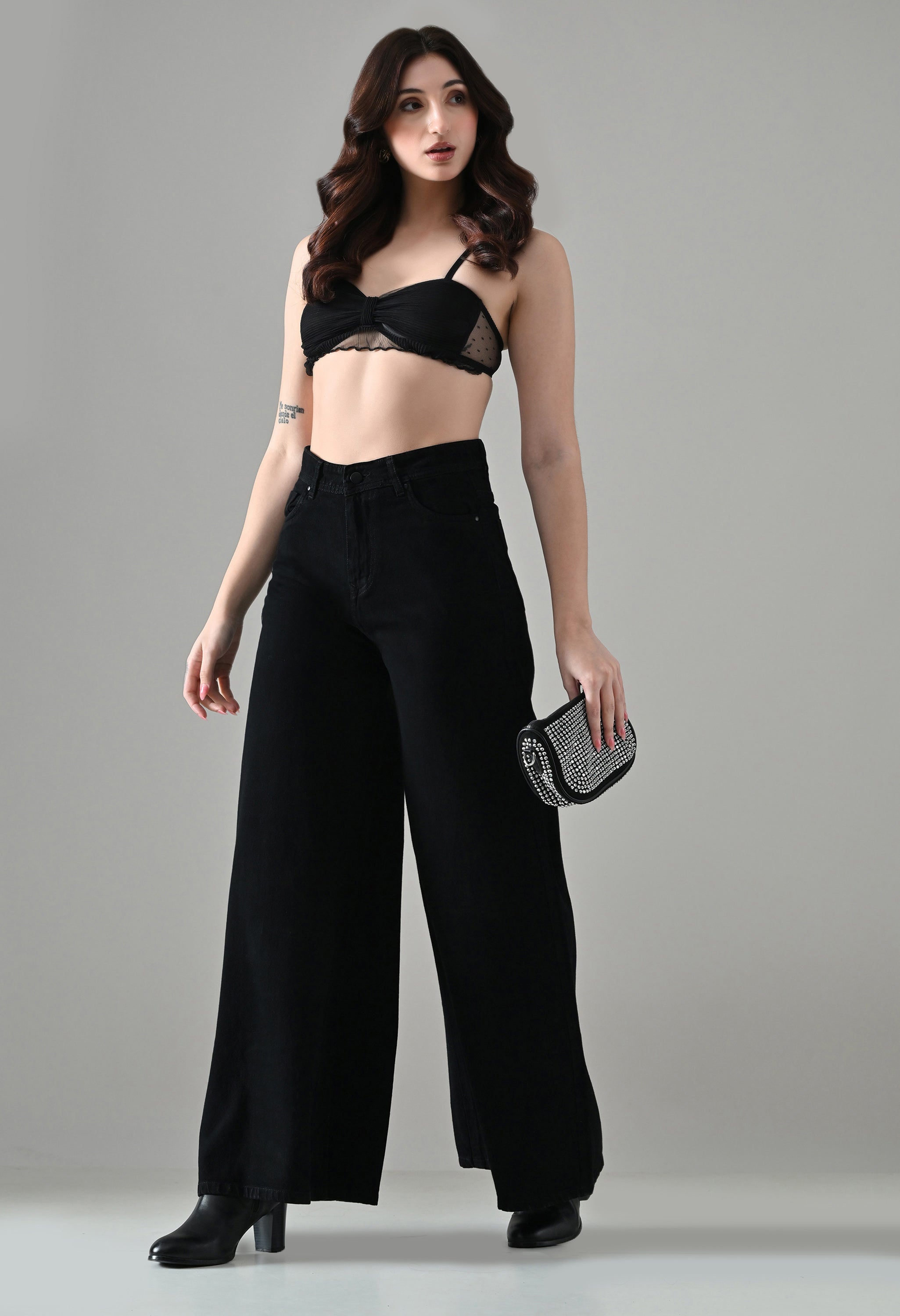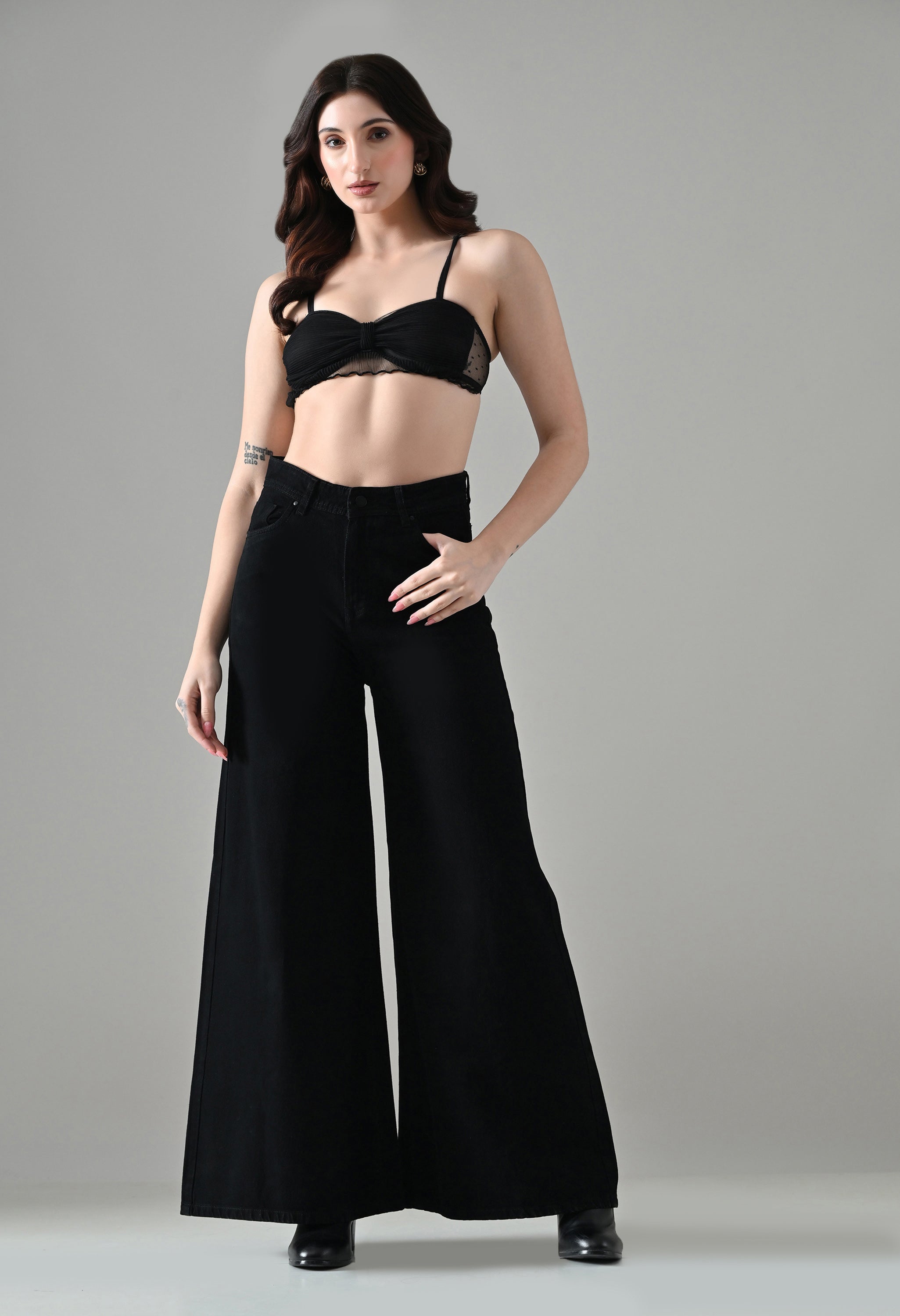These denim jeans feature a bold wide-leg silhouette with a relaxed fit, delivering an effortlessly cool, trend-forward look. Designed with a high-rise waist and structured denim finish, they create a flattering shape while offering comfort and ease of movement. The deep black wash adds a sleek, versatile edge, making them a staple for street style, casual outings, and statement everyday wear.