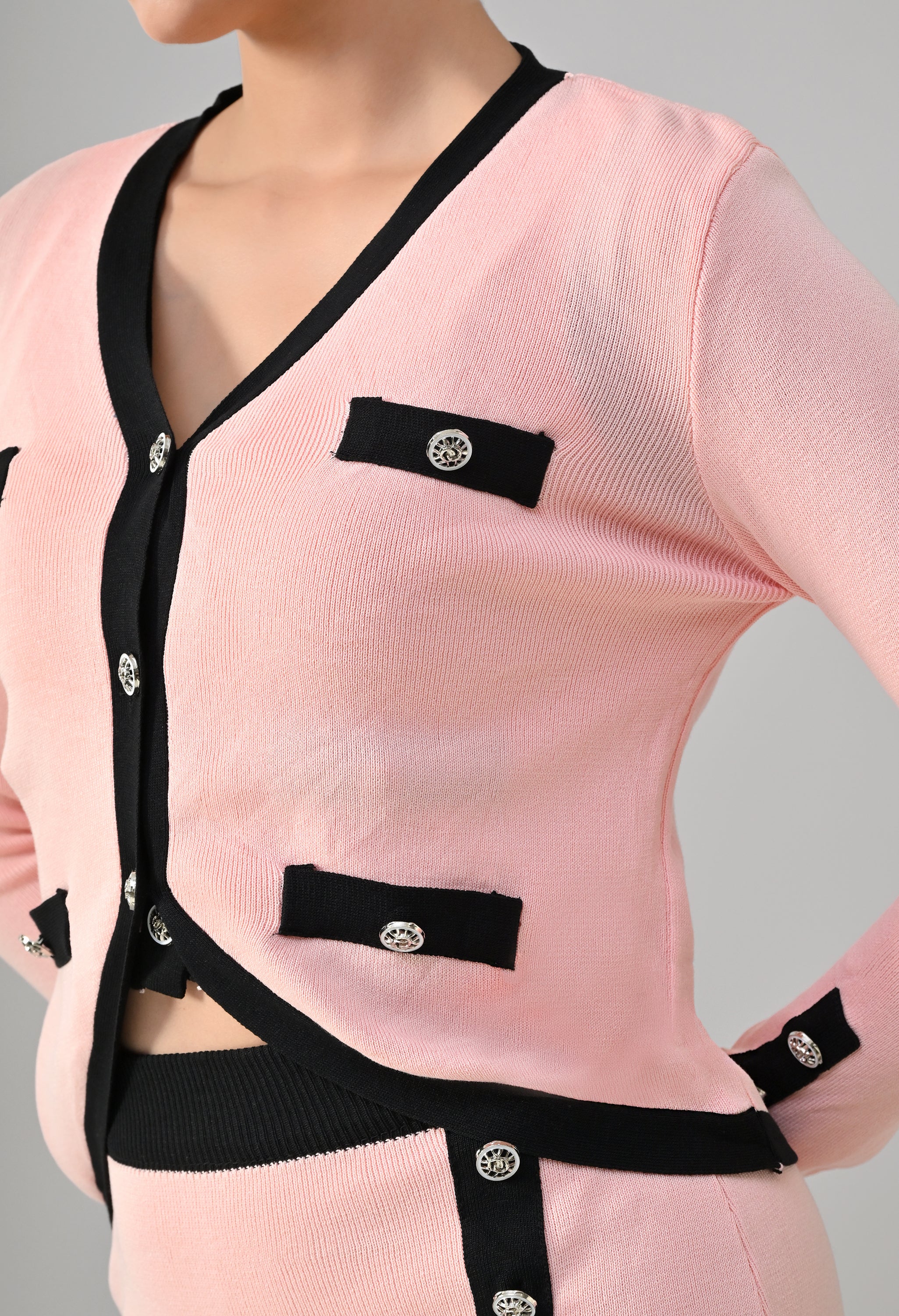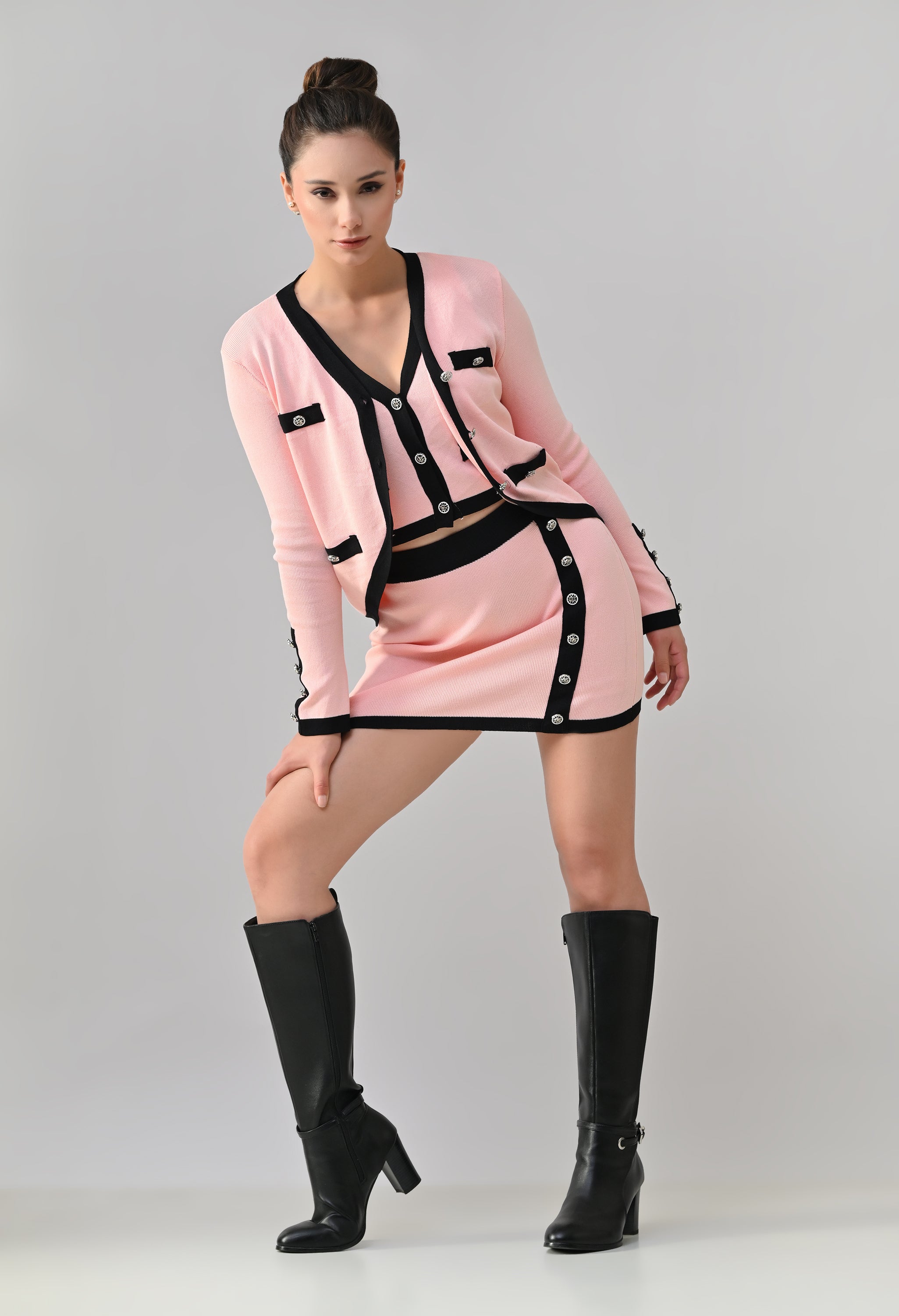 Chic 3-piece woolen knit set featuring a sleeveless V-neck top, buttoned cardigan, and matching mini length skirt. The top comes with metallic button detailing and showy front pockets. The cardigan showcases a V-neckline, functional button closure, showy pockets, and five decorative sleeve buttons with a pointed front hem. The skirt completes the look with an elasticated waistband and showy front button detailing for a coordinated, elegant finish.