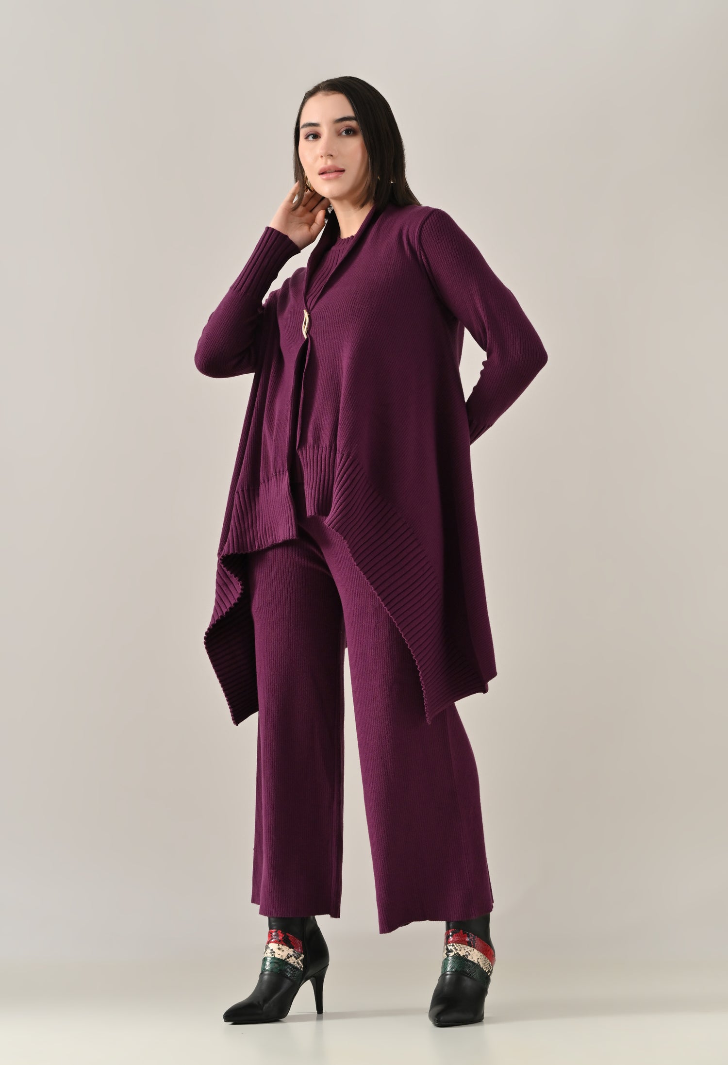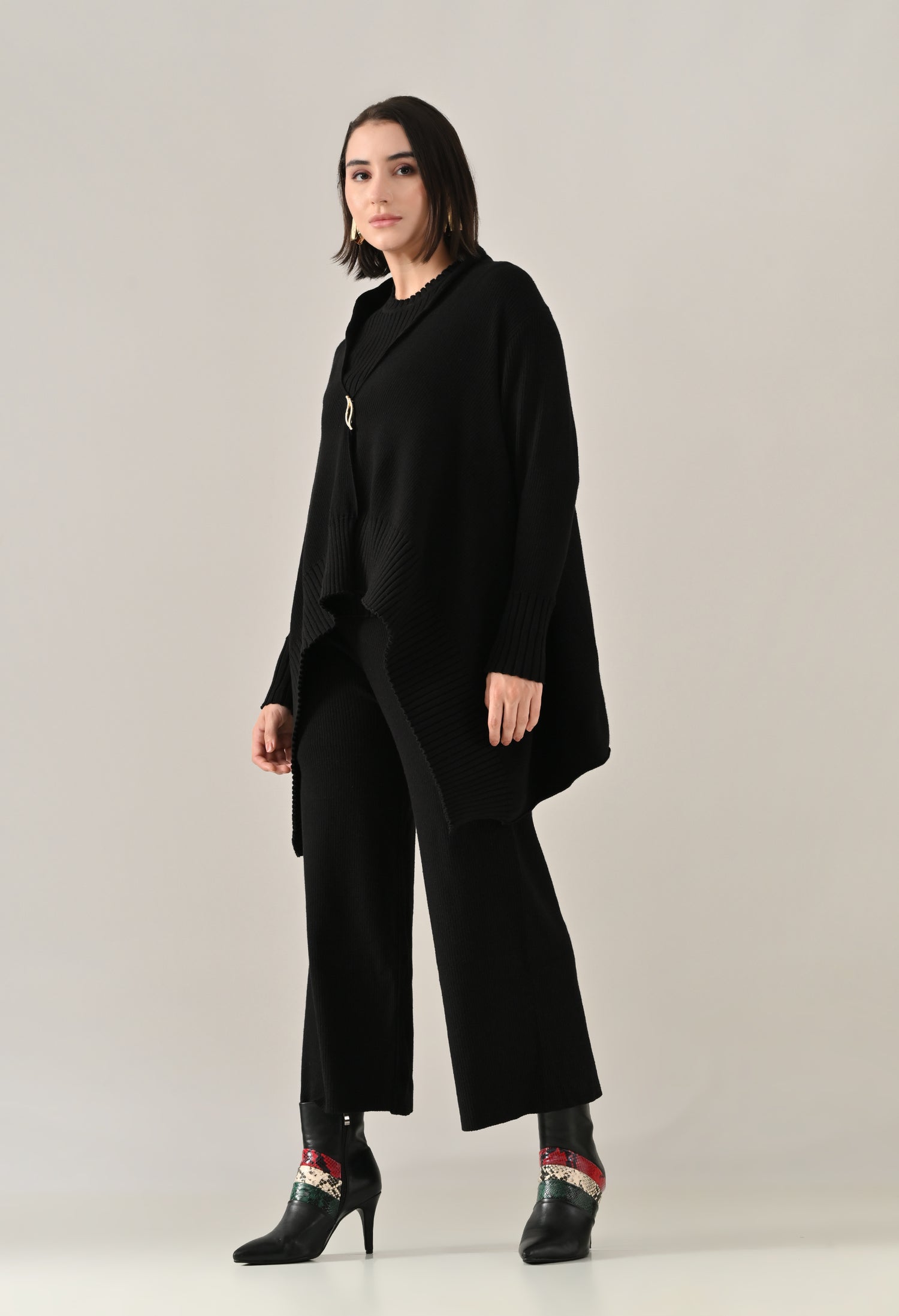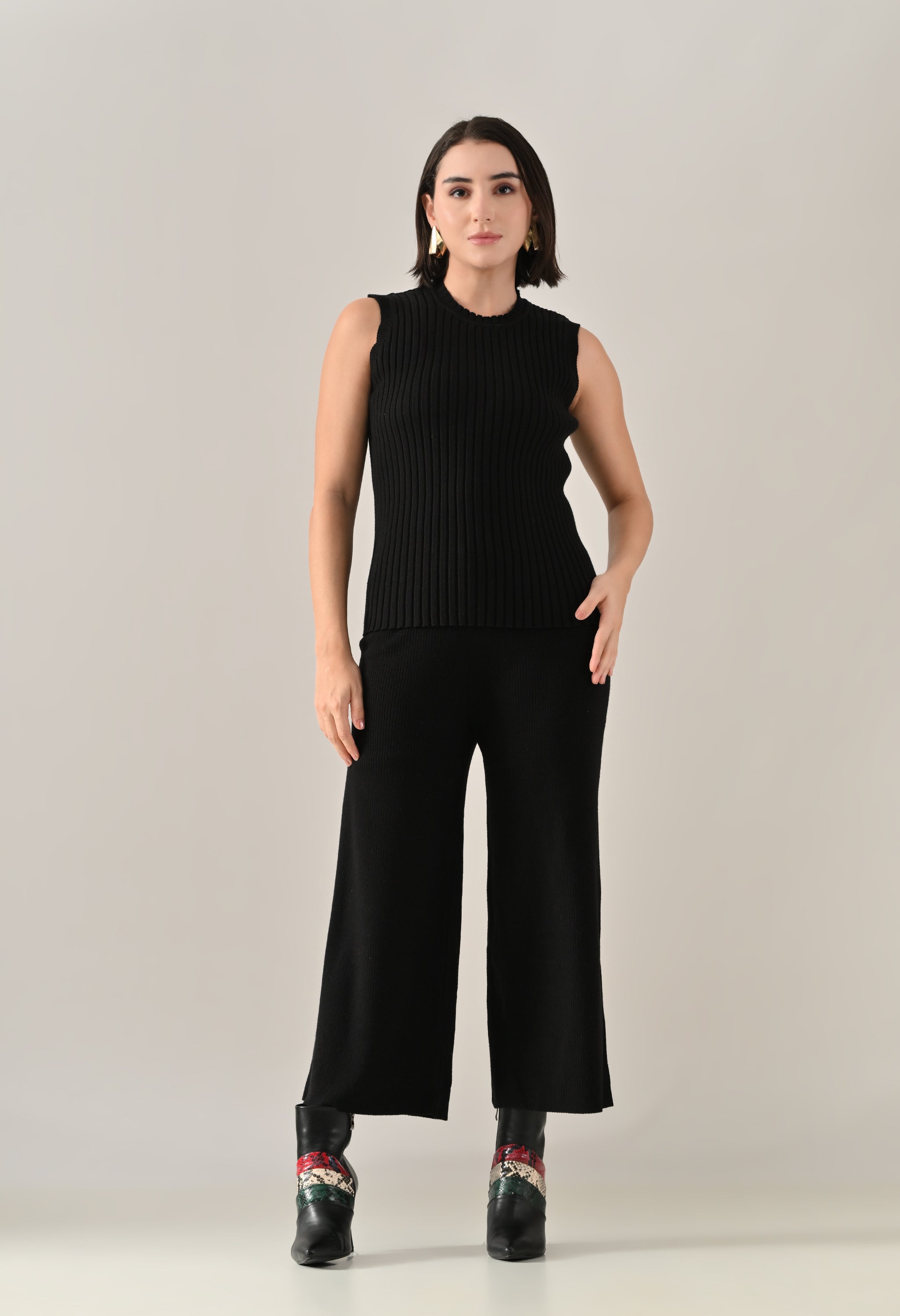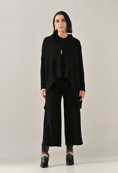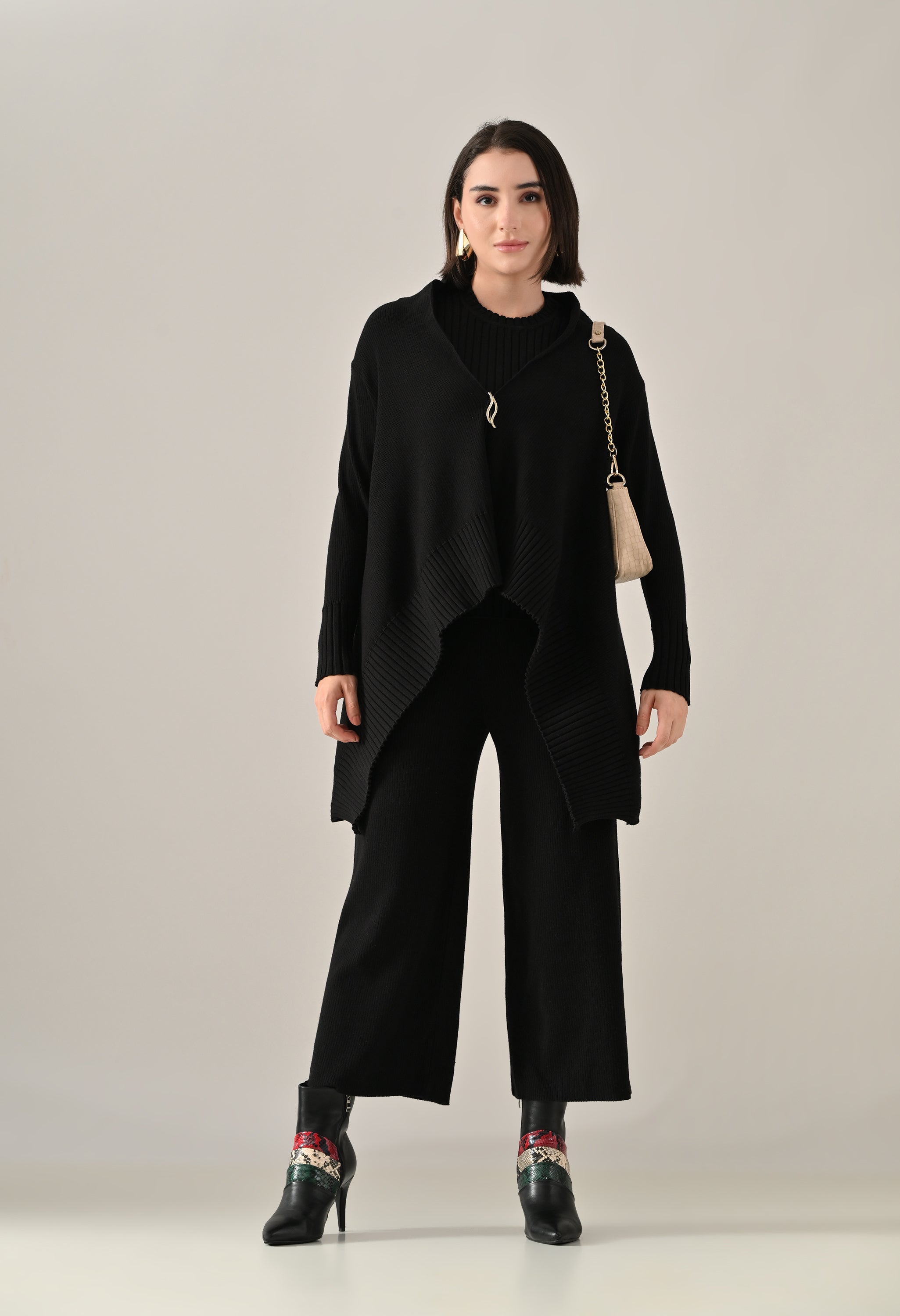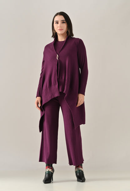 A chic and versatile co-ord set featuring a sleeveless rib-knit vest top with a round neckline, perfectly paired with a rib sweater shrug designed with a straight neck, open front, and long fitted sleeves. The look is accentuated with an eye-shaped brooch at the center front, adding a touch of elegance. Completing the ensemble with rib sweater straight comfortable pants with a broad elasticated waist for a flattering and comfortable fit. Crafted from a soft, stretchable fabric, this set blends comfort with contemporary style — perfect for elevating your everyday look.