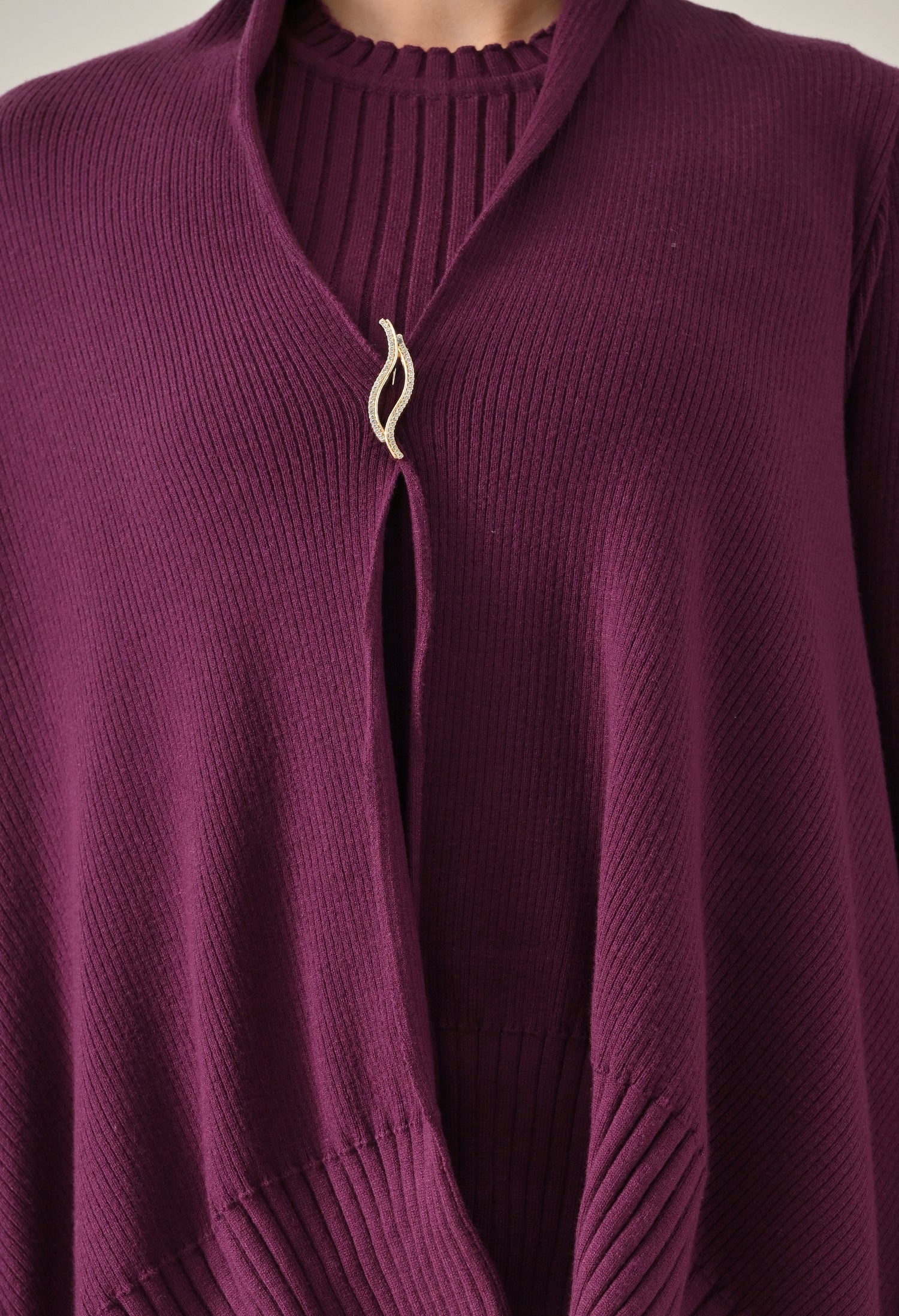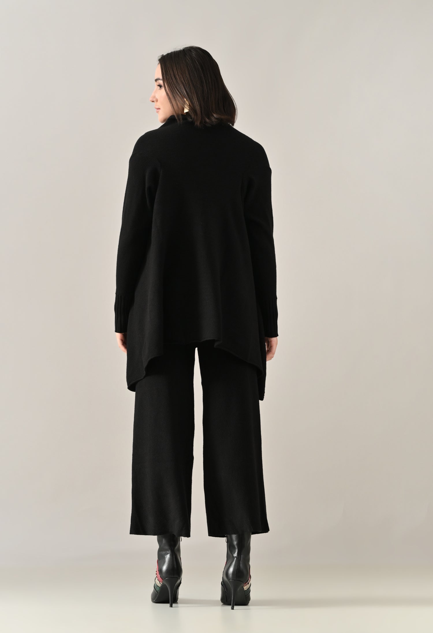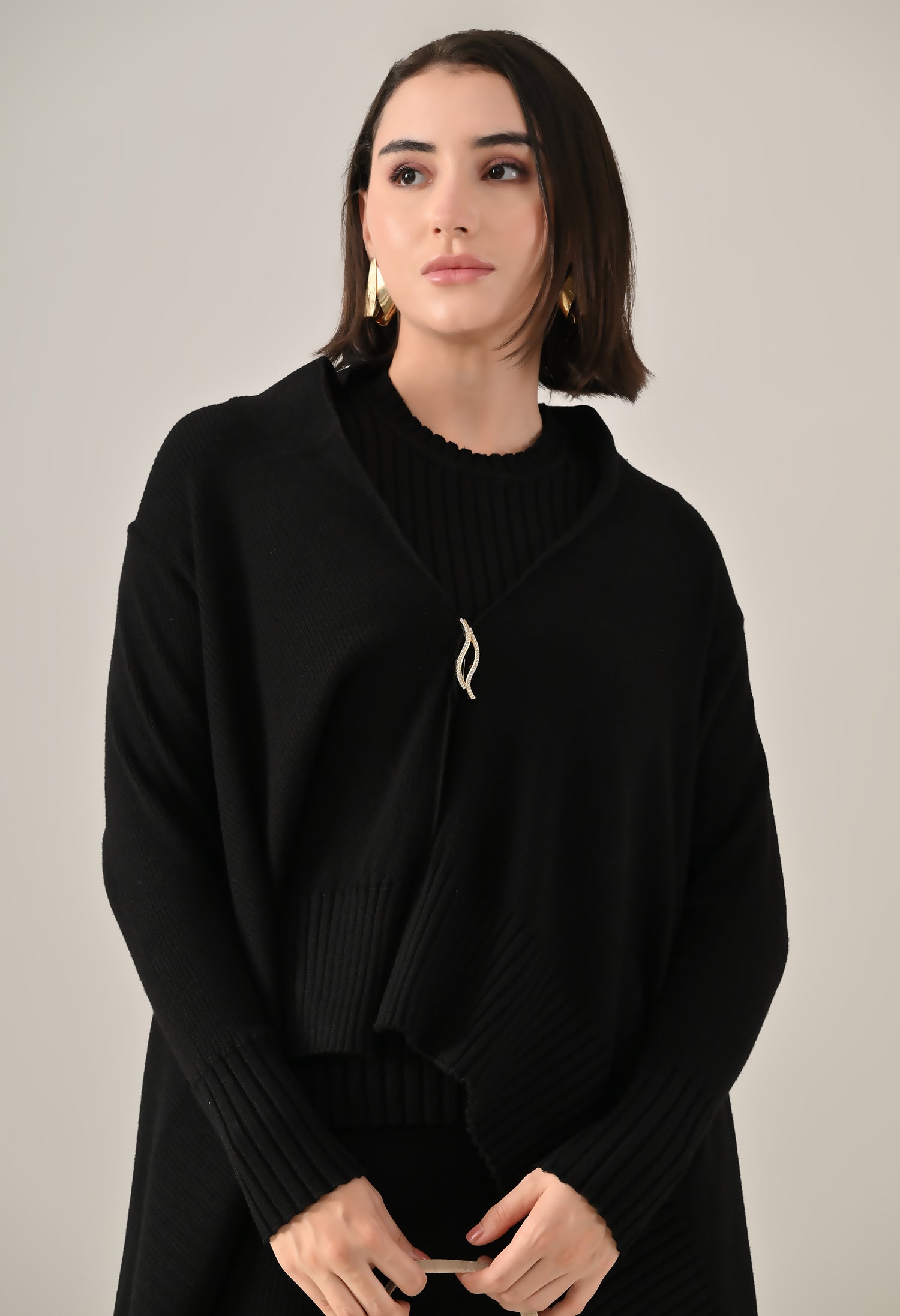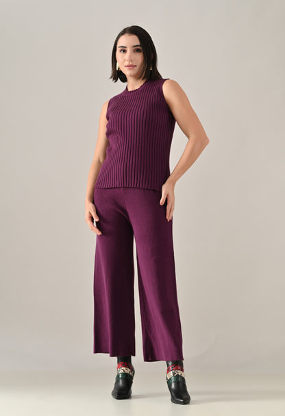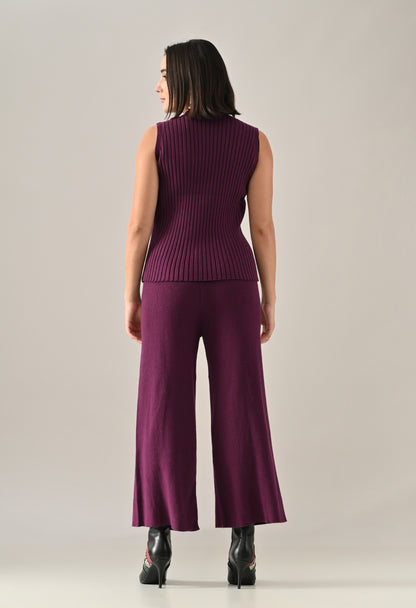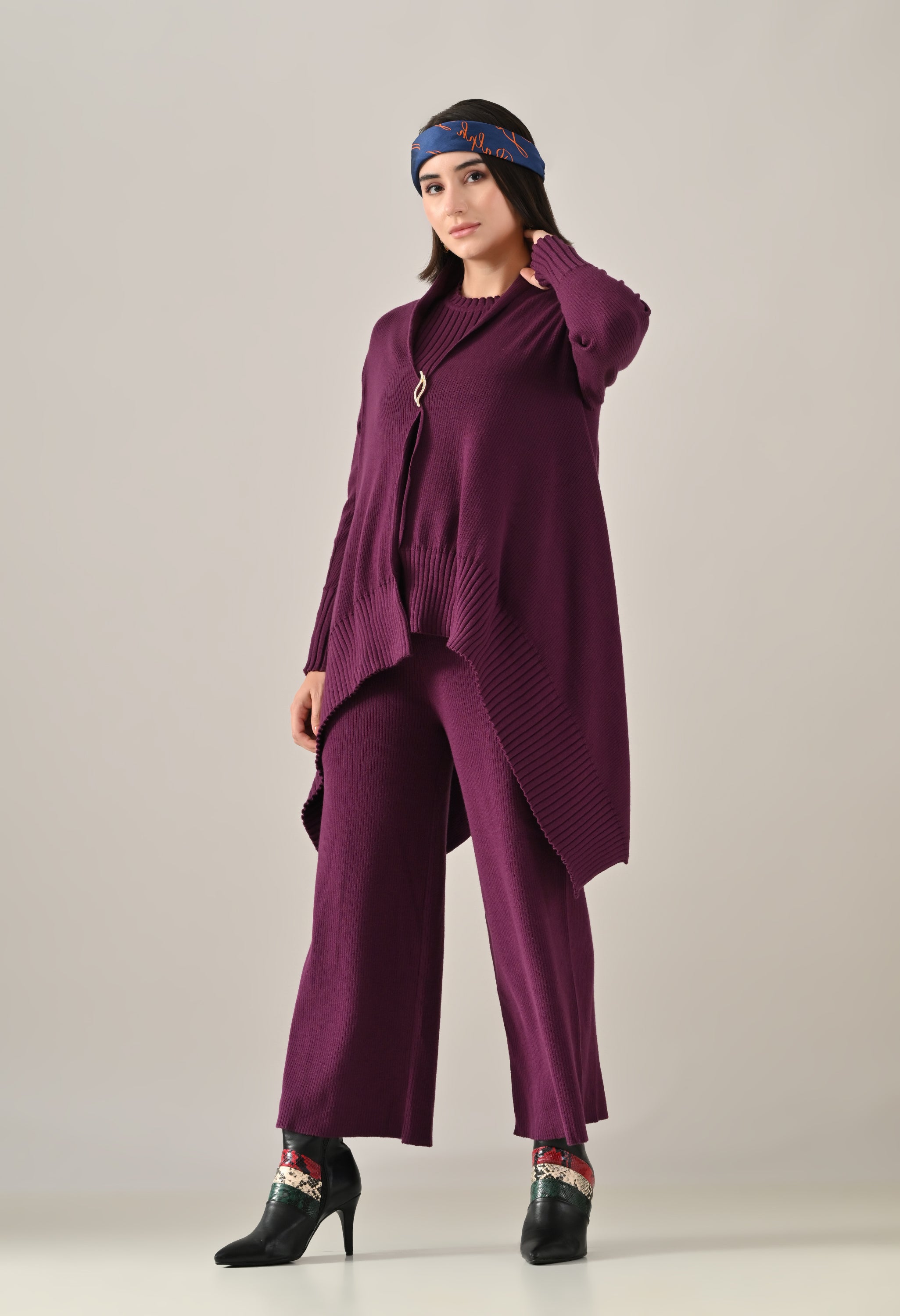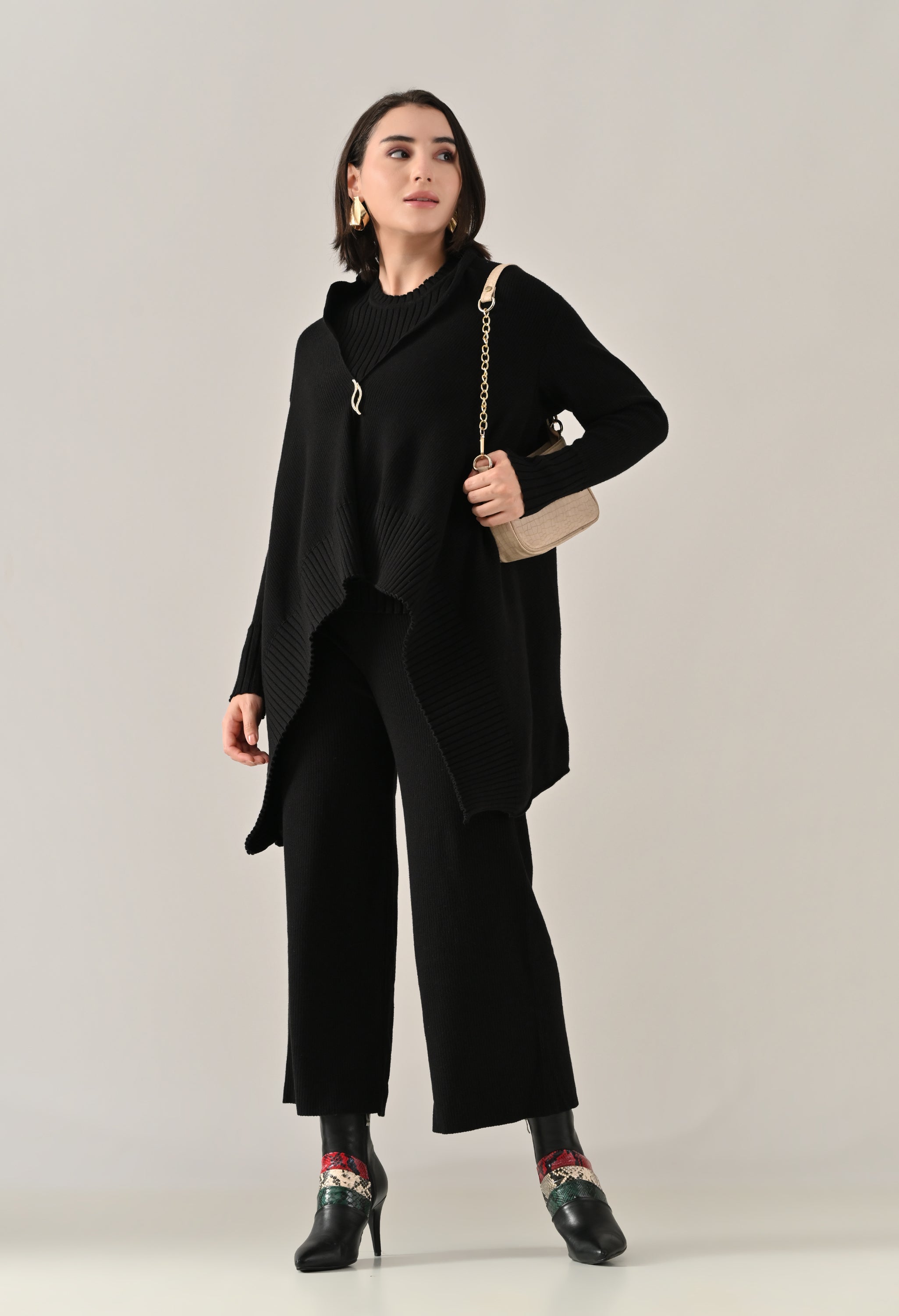 A chic and versatile co-ord set featuring a sleeveless rib-knit vest top with a round neckline, perfectly paired with a rib sweater shrug designed with a straight neck, open front, and long fitted sleeves. The look is accentuated with an eye-shaped brooch at the center front, adding a touch of elegance. Completing the ensemble with rib sweater straight comfortable pants with a broad elasticated waist for a flattering and comfortable fit. Crafted from a soft, stretchable fabric, this set blends comfort with contemporary style — perfect for elevating your everyday look.