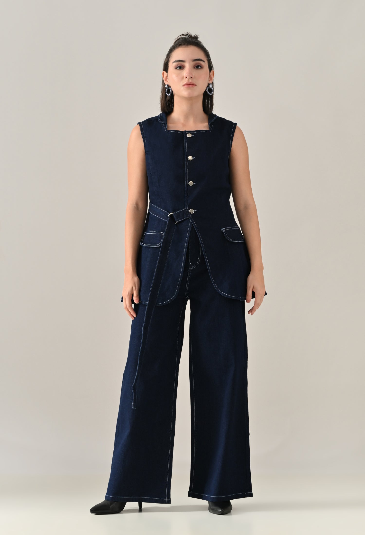 A stylish enzyme-wash denim cord set featuring a straight neckline with band collar and sleeveless design for a clean, structured look. The top includes an open front with eye kaaj and silver button, adjustable front strap, and two showy pocket flaps that add a utilitarian charm. Designed with princess seams at front and back for a flattering fit. The coordinating bottoms feature a waistband with open fly and zipper, silver rivets and shank button, five belt loops, and functional pockets including two front, two back, and one coin pocket. Finished with contrast stitching details, this set offers a soft, comfortable, and stretchable feel — blending classic denim texture with modern appeal.