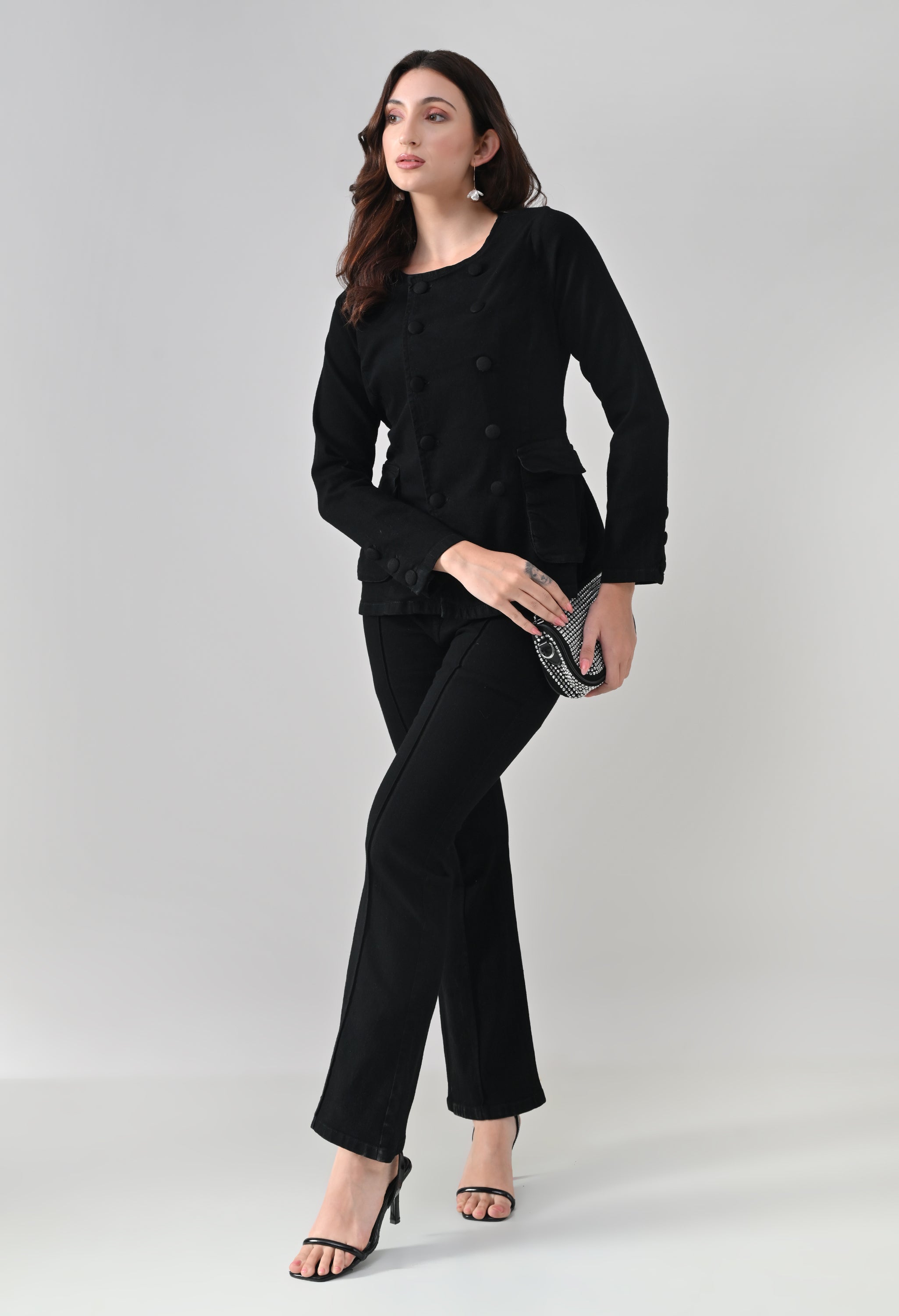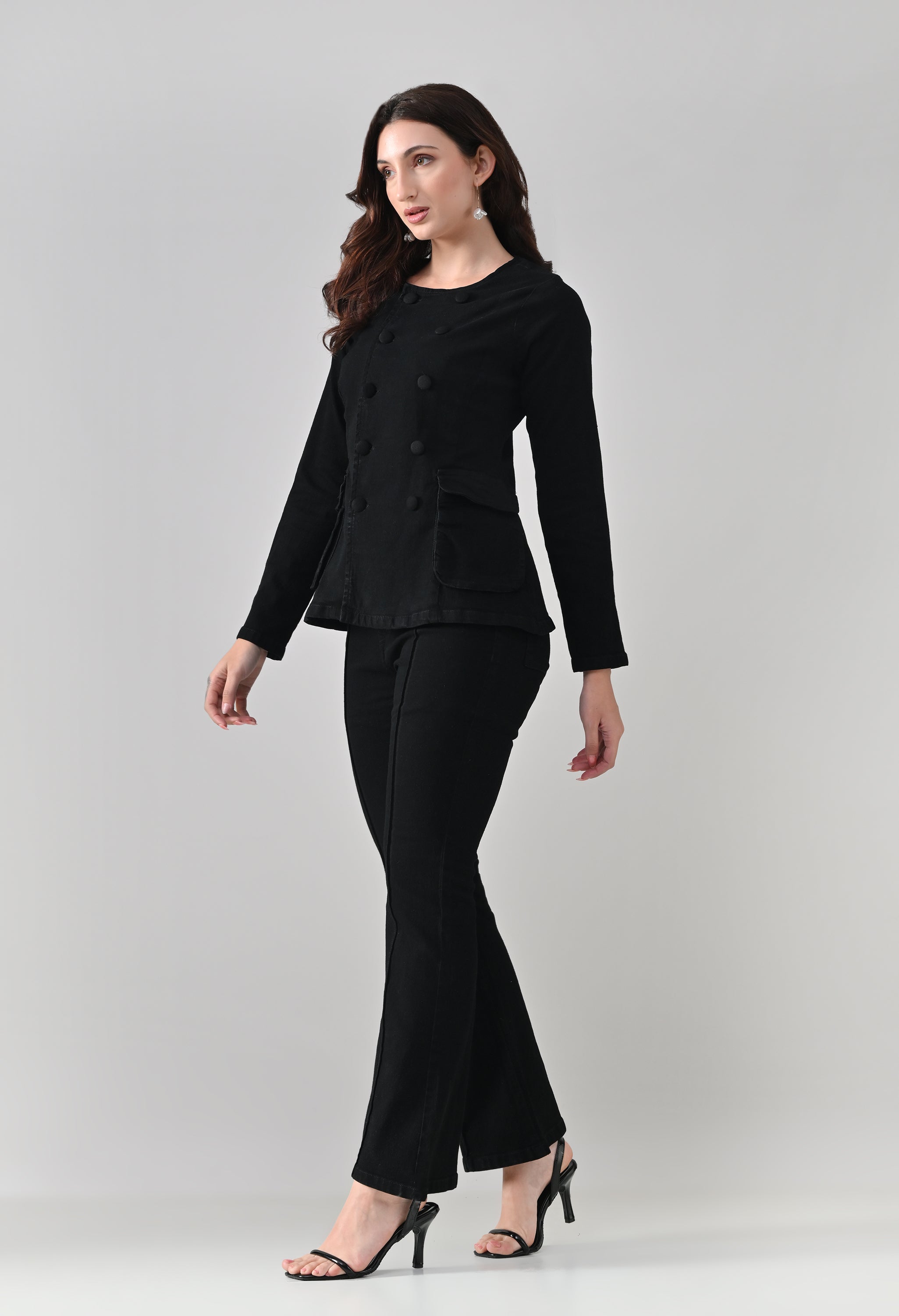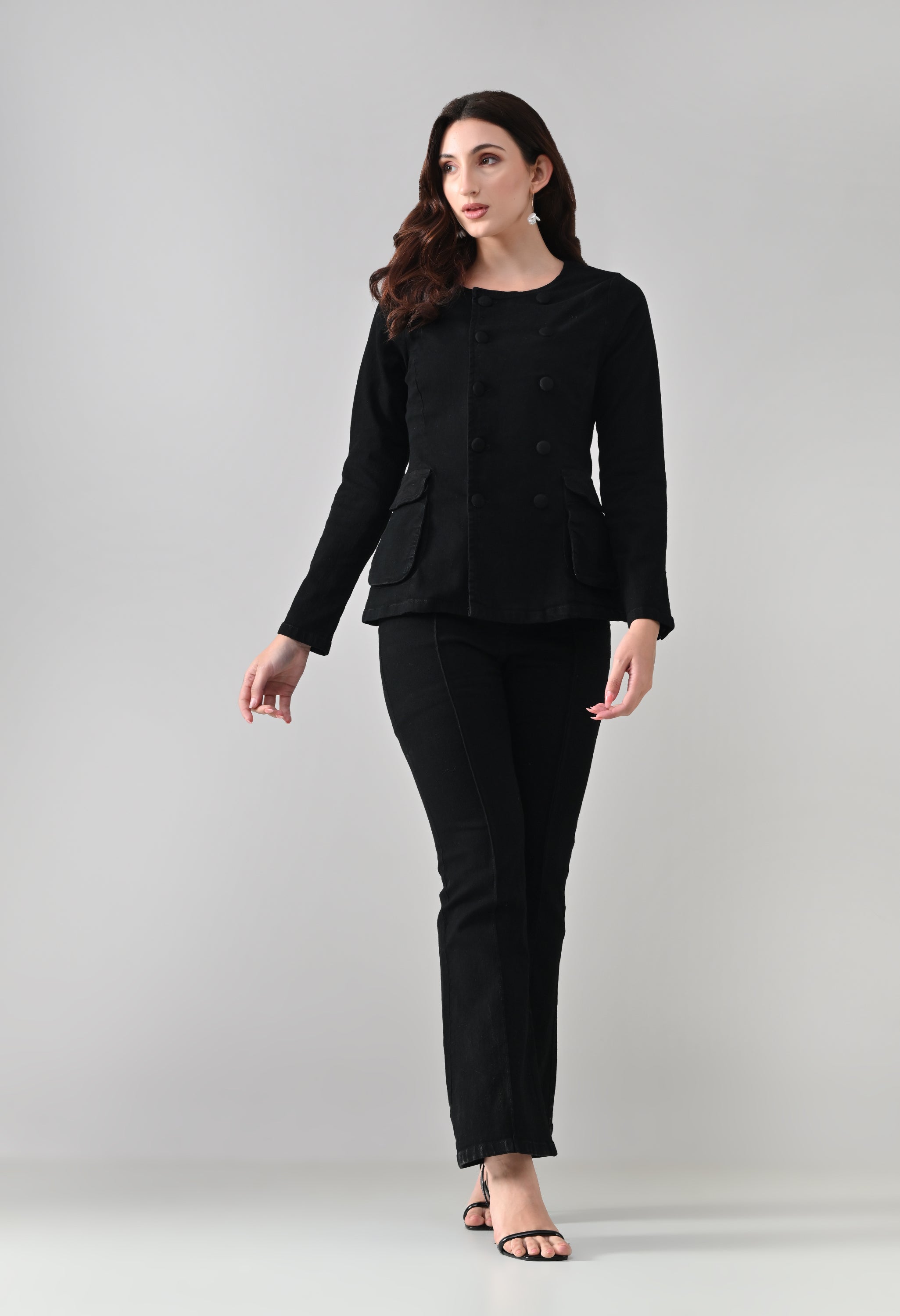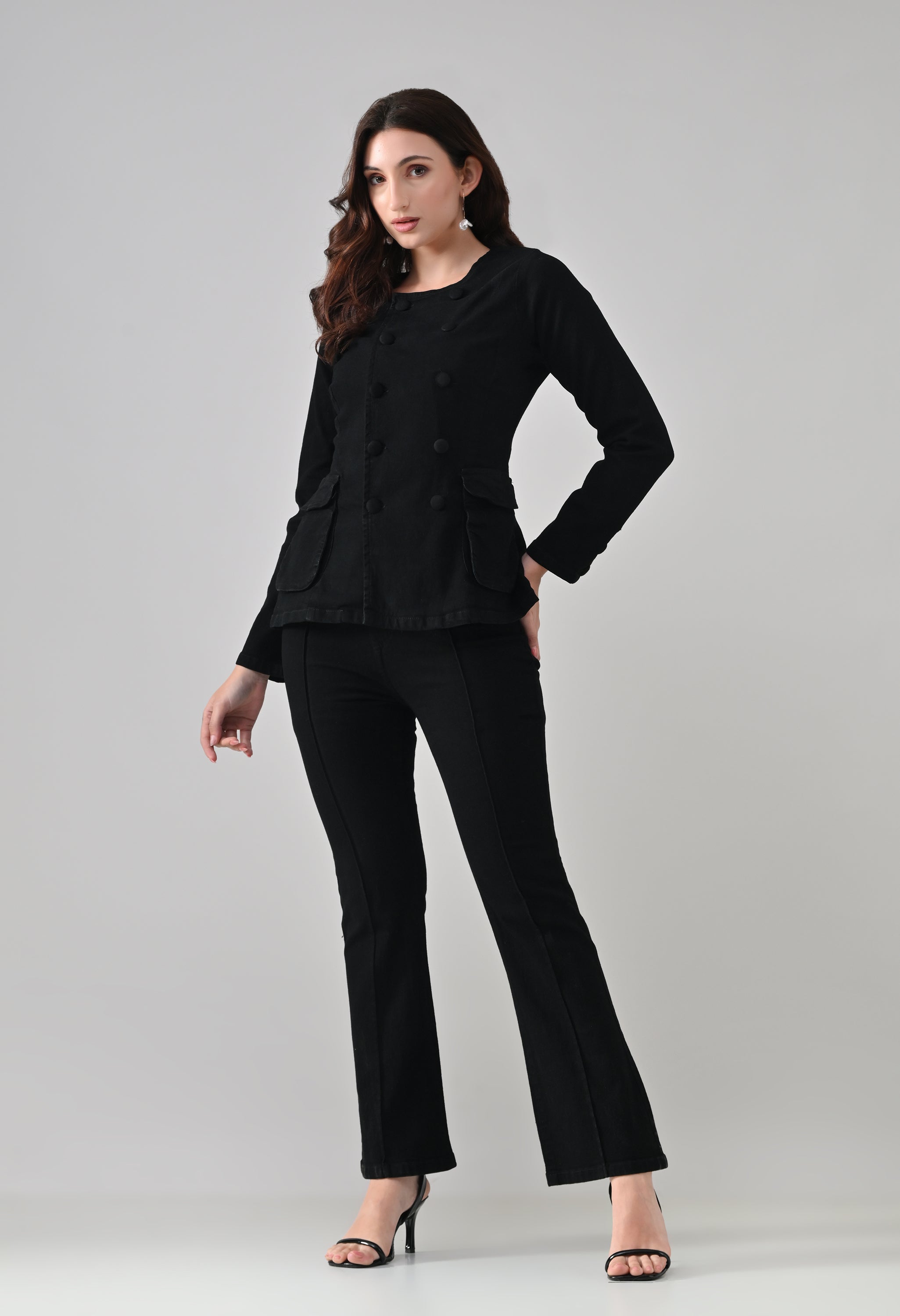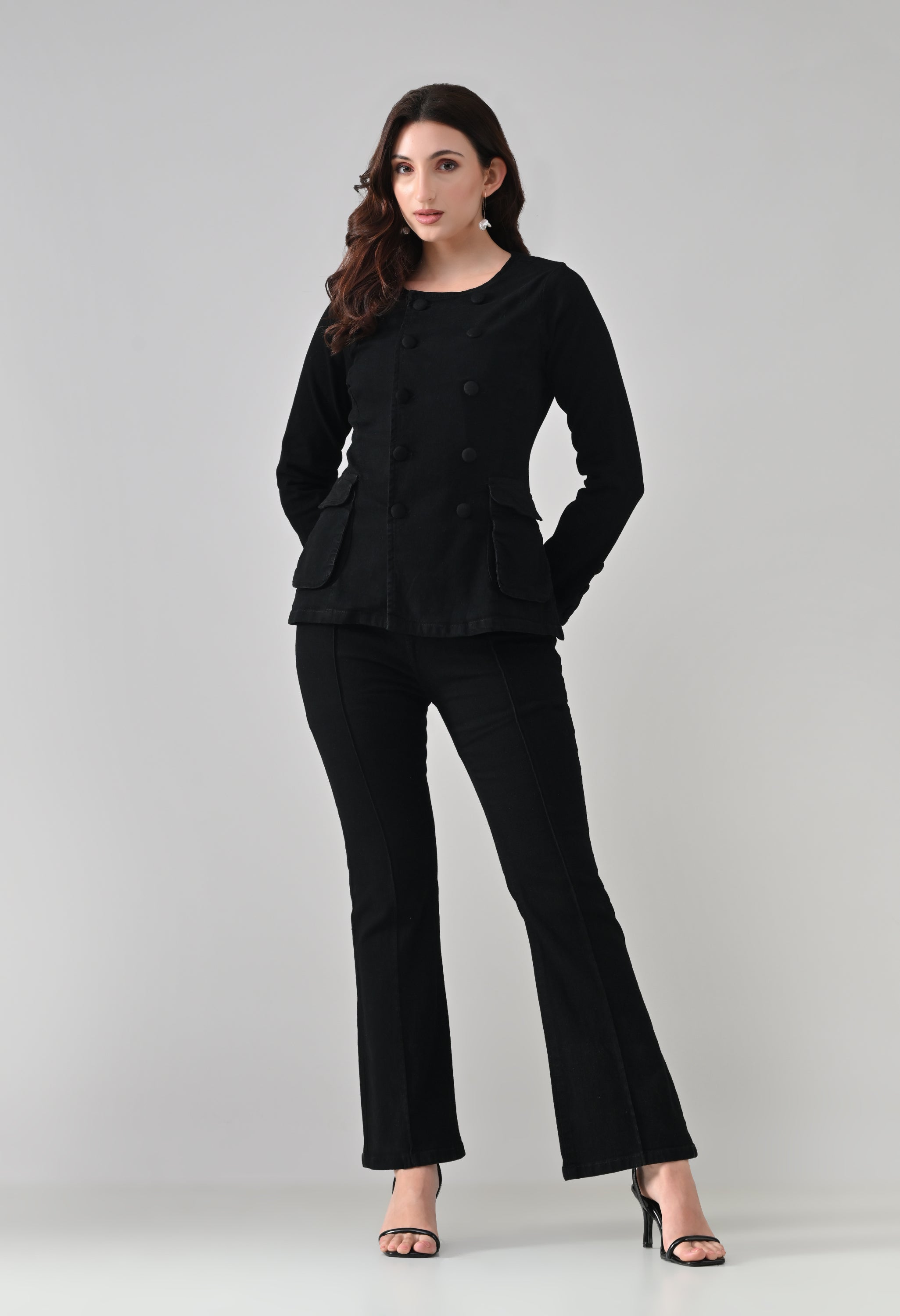 This co-ord set blends sharp tailoring with a timeless, structured silhouette. The jacket features a round neckline with a double-breasted button design that adds a refined, statement look, while the tailored fit enhances the waist. Functional flap pockets and button-detailed cuffs elevate its utility appeal. Paired with matching straight-to-slightly-flared trousers featuring front seam detailing, the set creates a sleek, elongated profile. Ideal for power dressing, evening outings, or elevated casual styling.