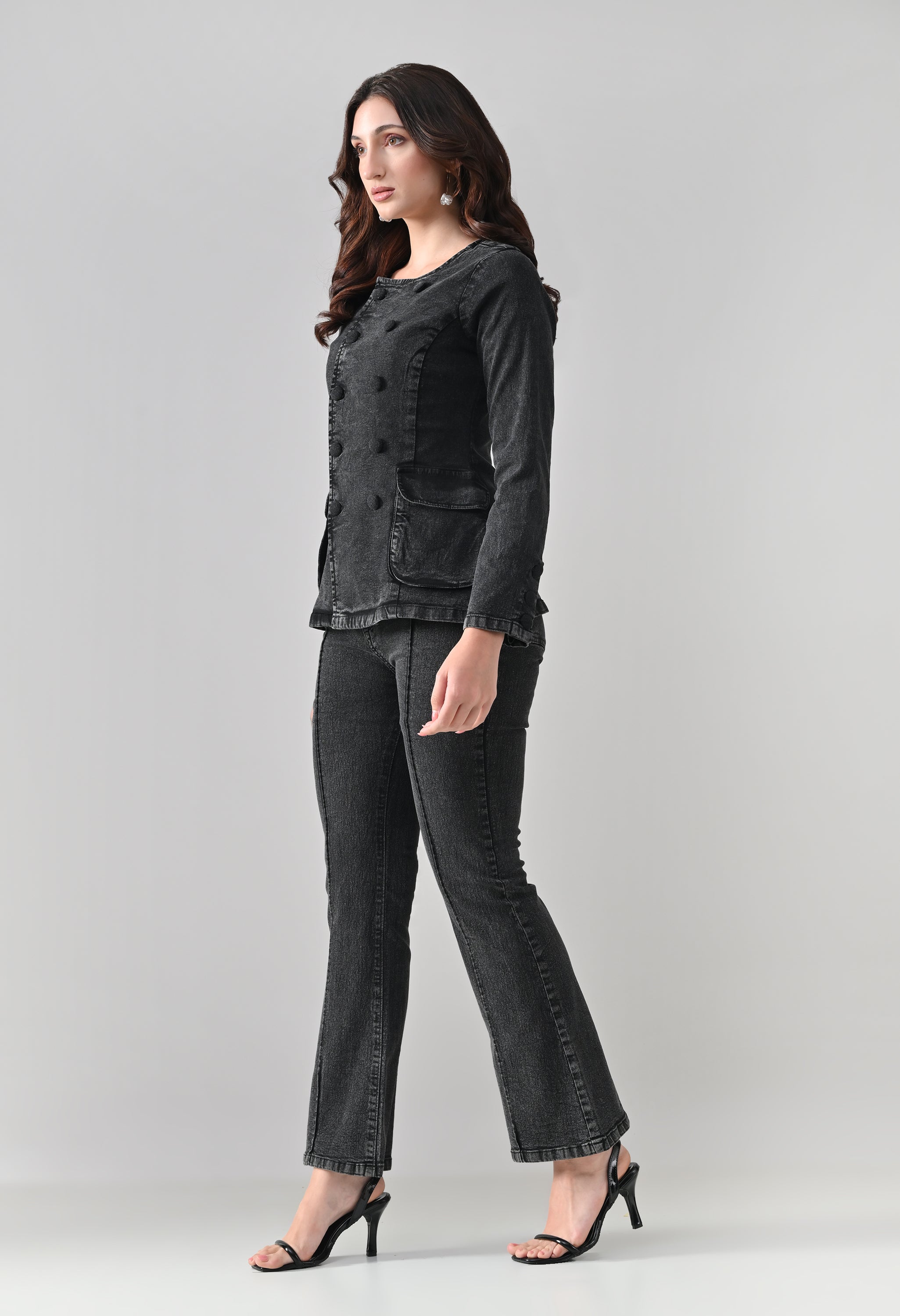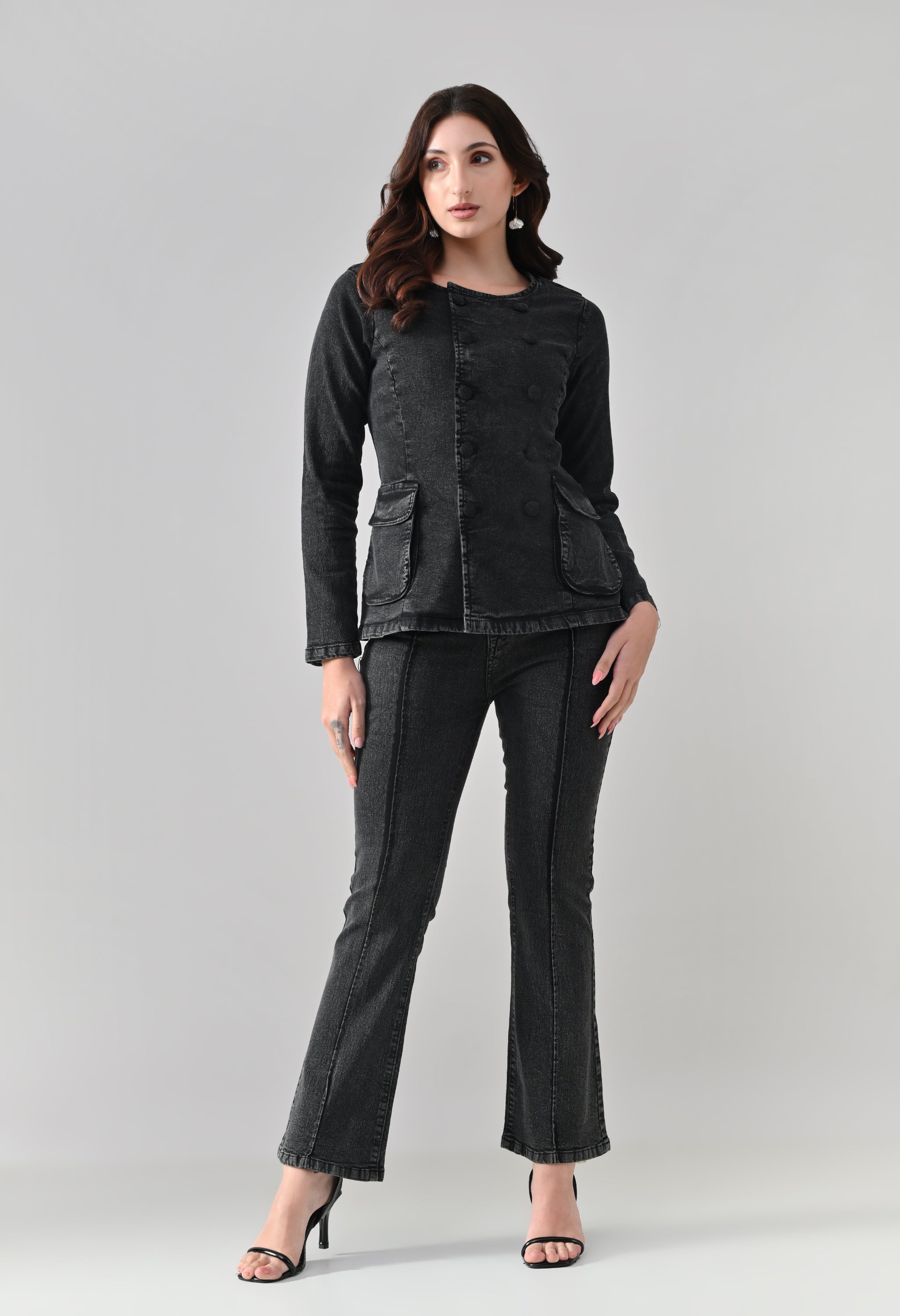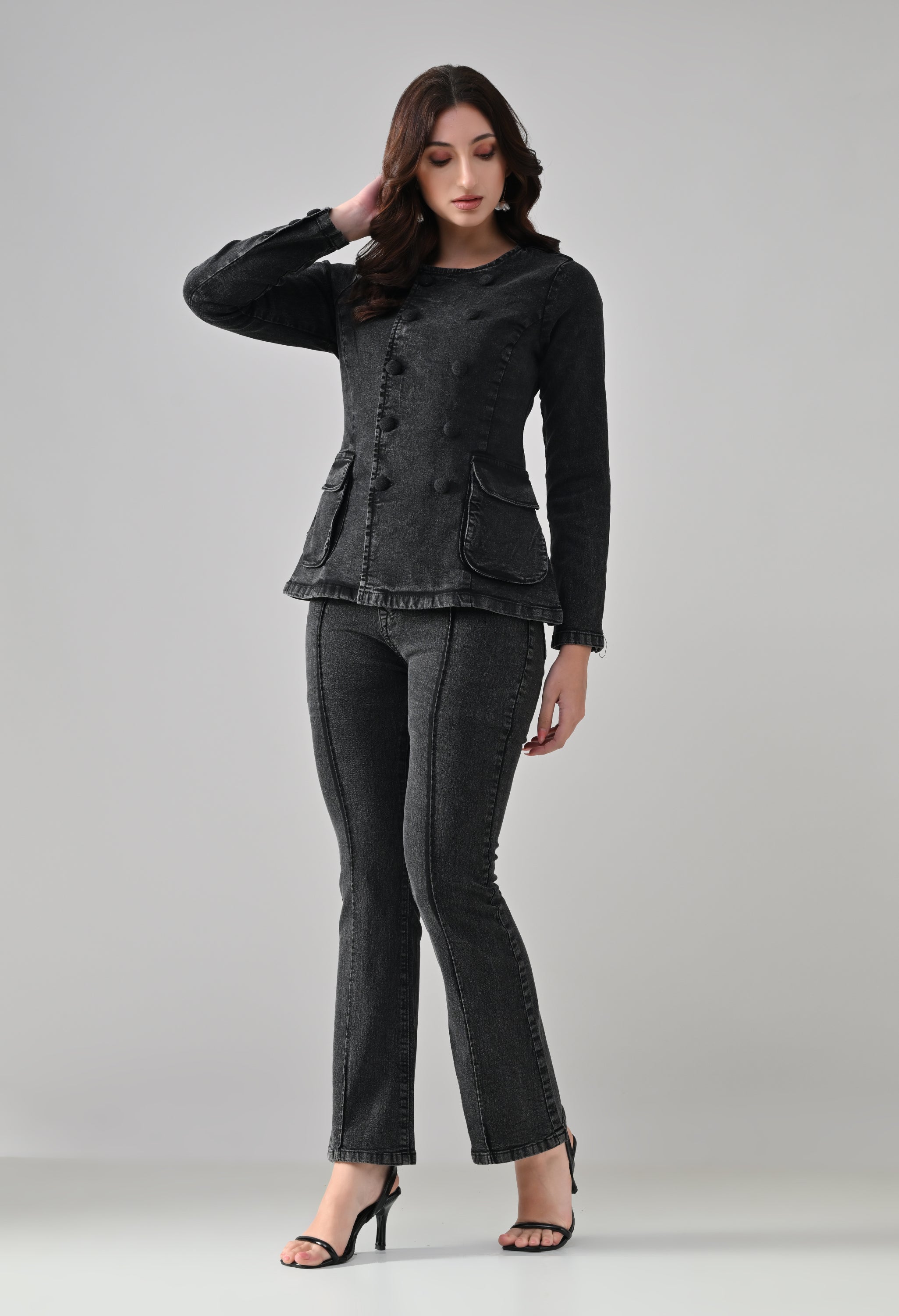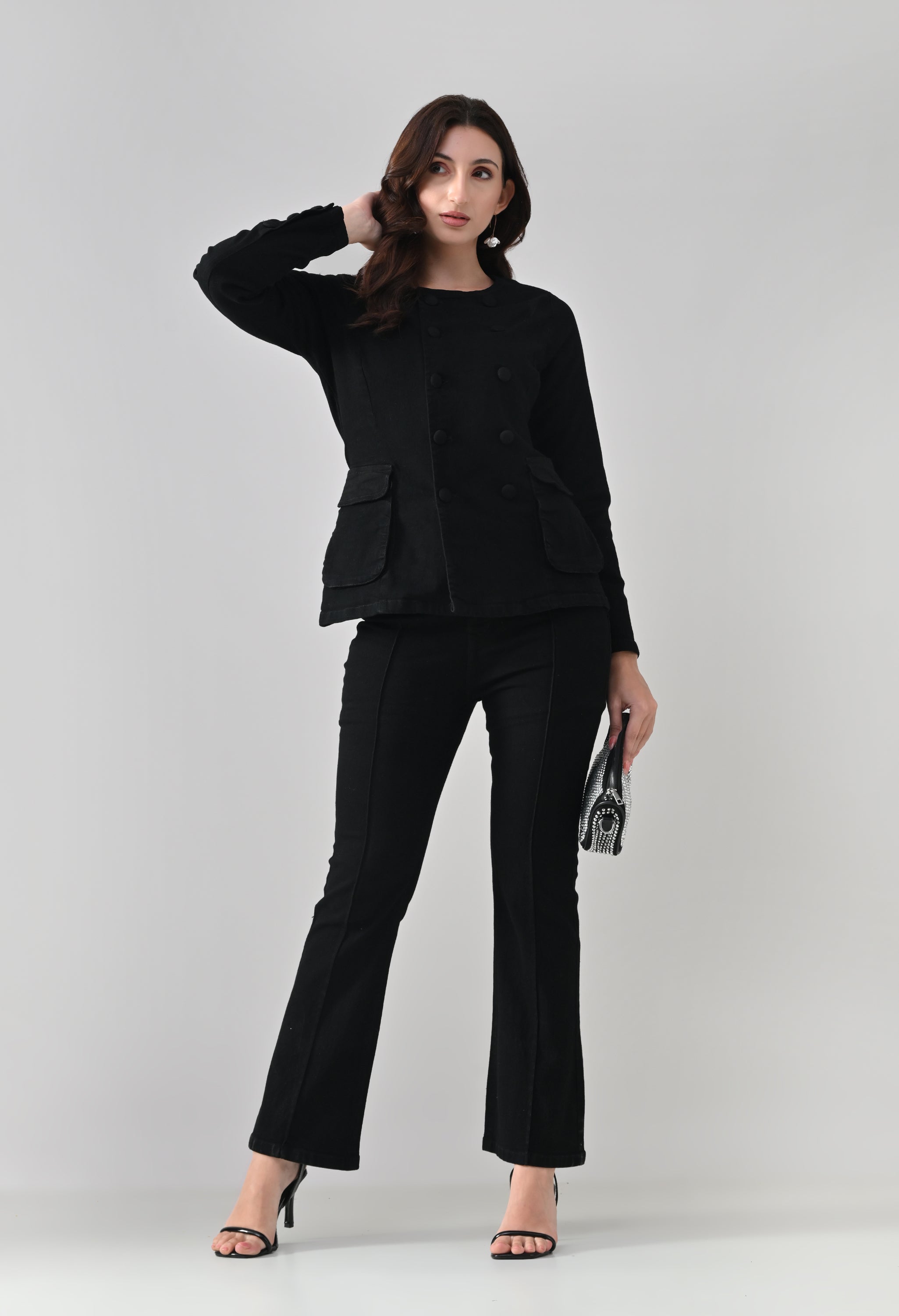 This co-ord set blends sharp tailoring with a timeless, structured silhouette. The jacket features a round neckline with a double-breasted button design that adds a refined, statement look, while the tailored fit enhances the waist. Functional flap pockets and button-detailed cuffs elevate its utility appeal. Paired with matching straight-to-slightly-flared trousers featuring front seam detailing, the set creates a sleek, elongated profile. Ideal for power dressing, evening outings, or elevated casual styling.
