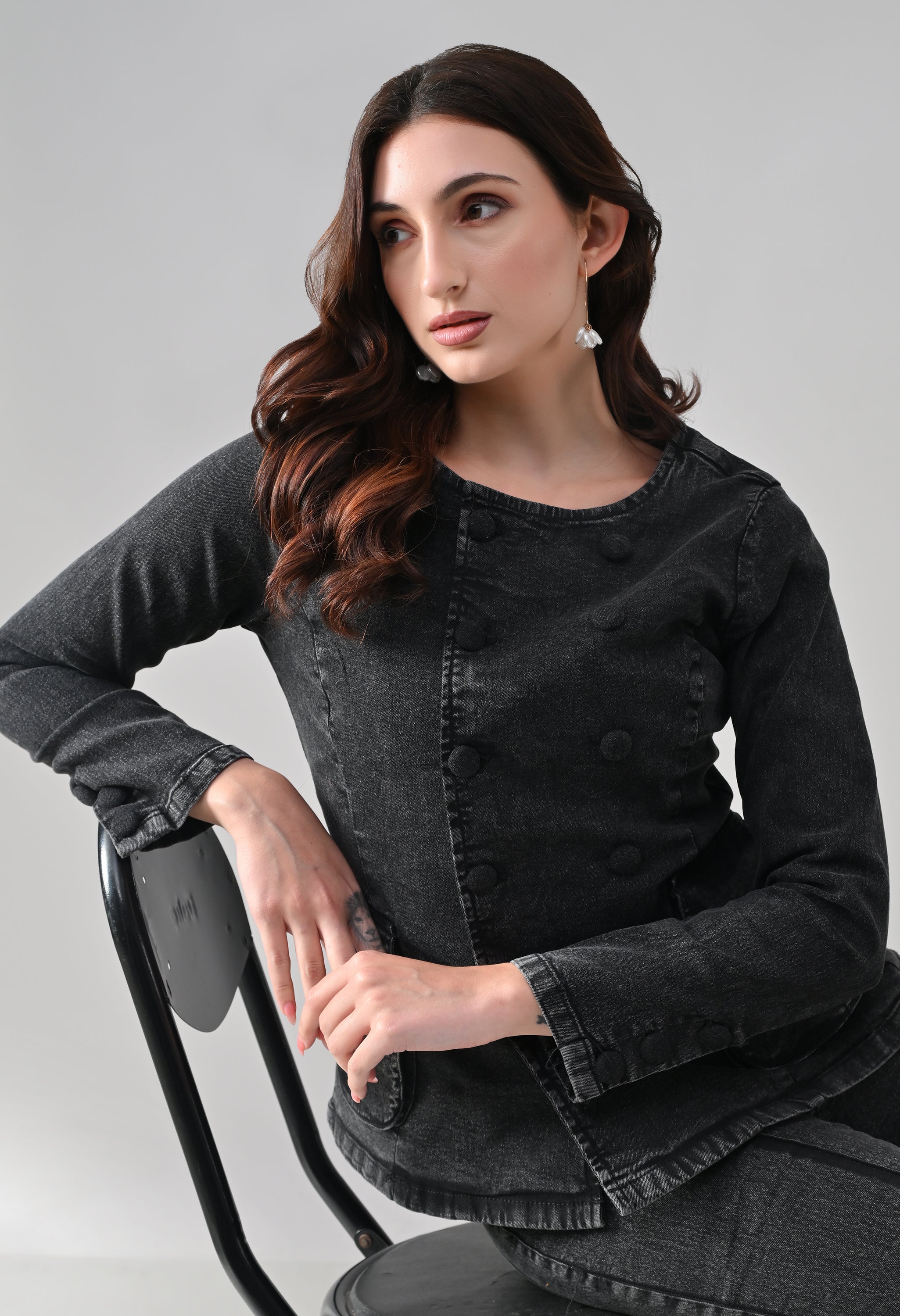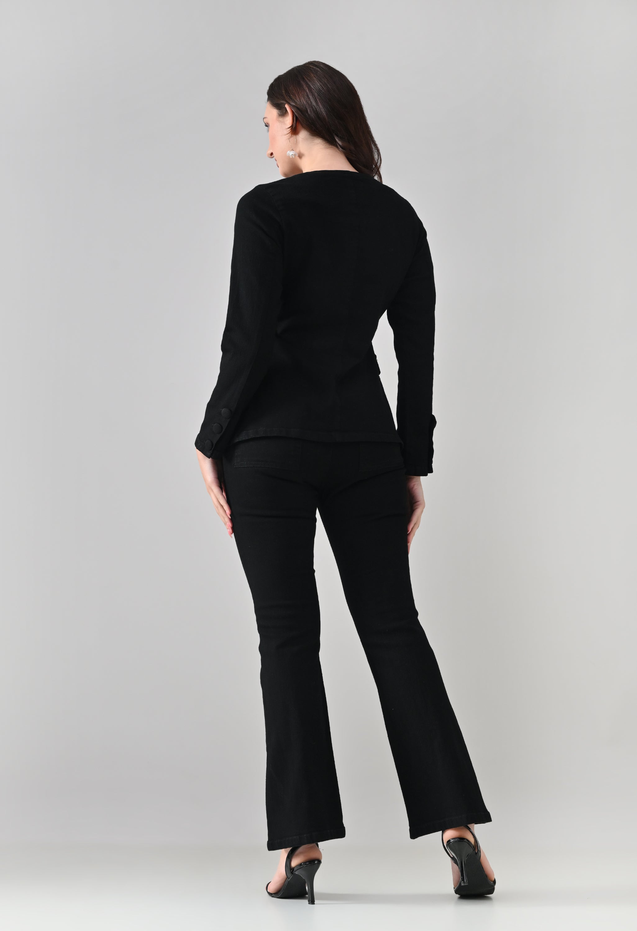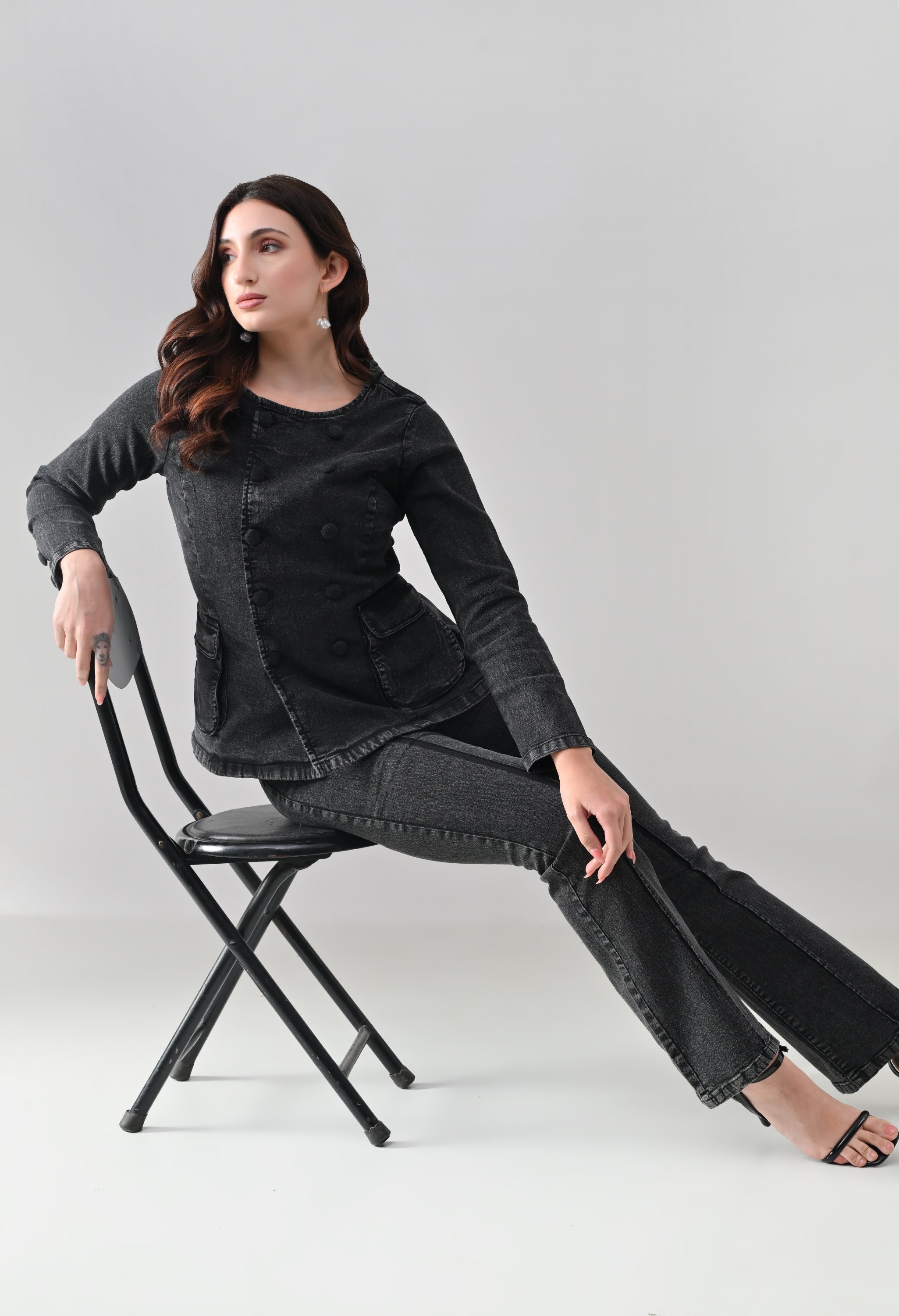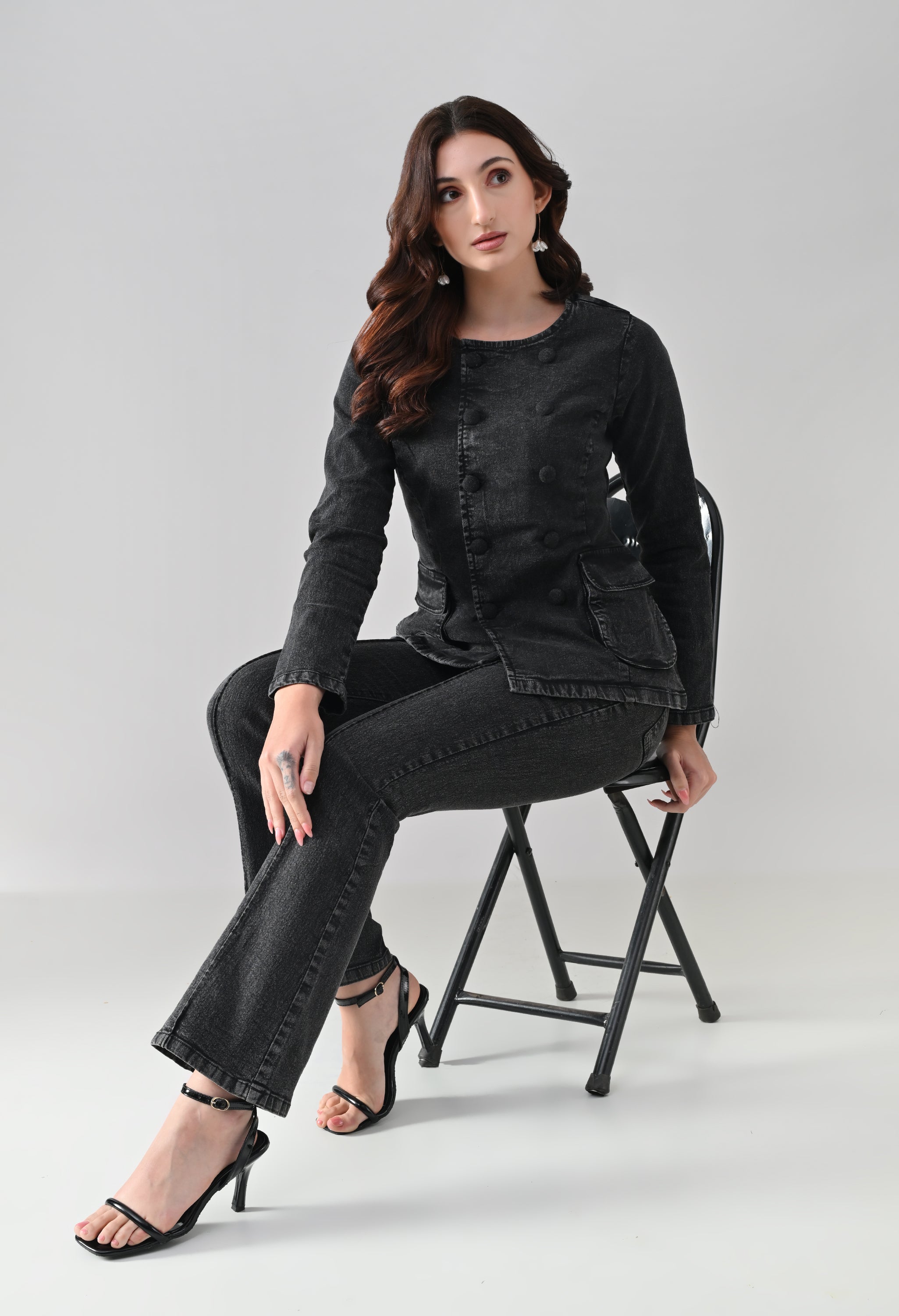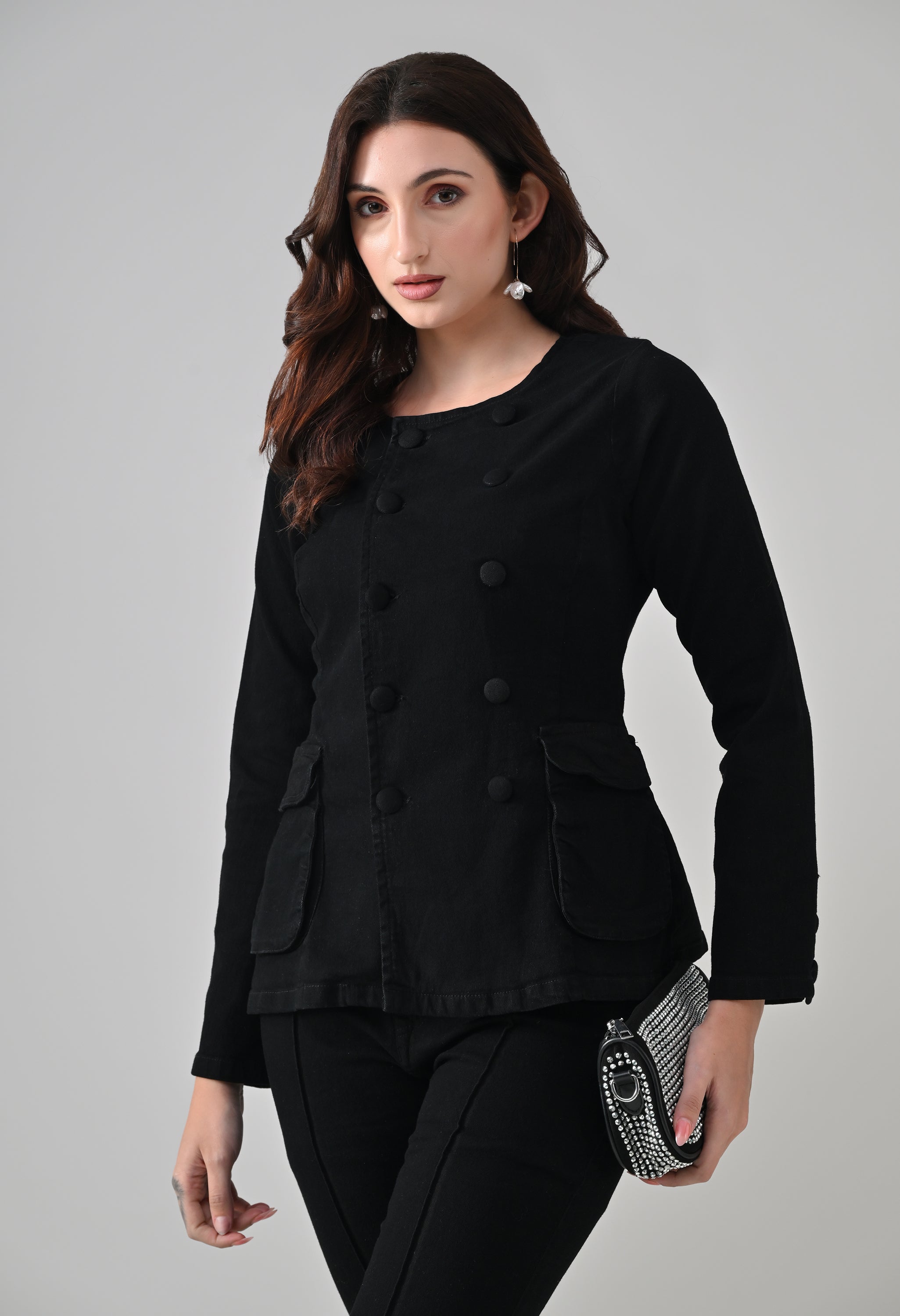 This co-ord set blends sharp tailoring with a timeless, structured silhouette. The jacket features a round neckline with a double-breasted button design that adds a refined, statement look, while the tailored fit enhances the waist. Functional flap pockets and button-detailed cuffs elevate its utility appeal. Paired with matching straight-to-slightly-flared trousers featuring front seam detailing, the set creates a sleek, elongated profile. Ideal for power dressing, evening outings, or elevated casual styling.