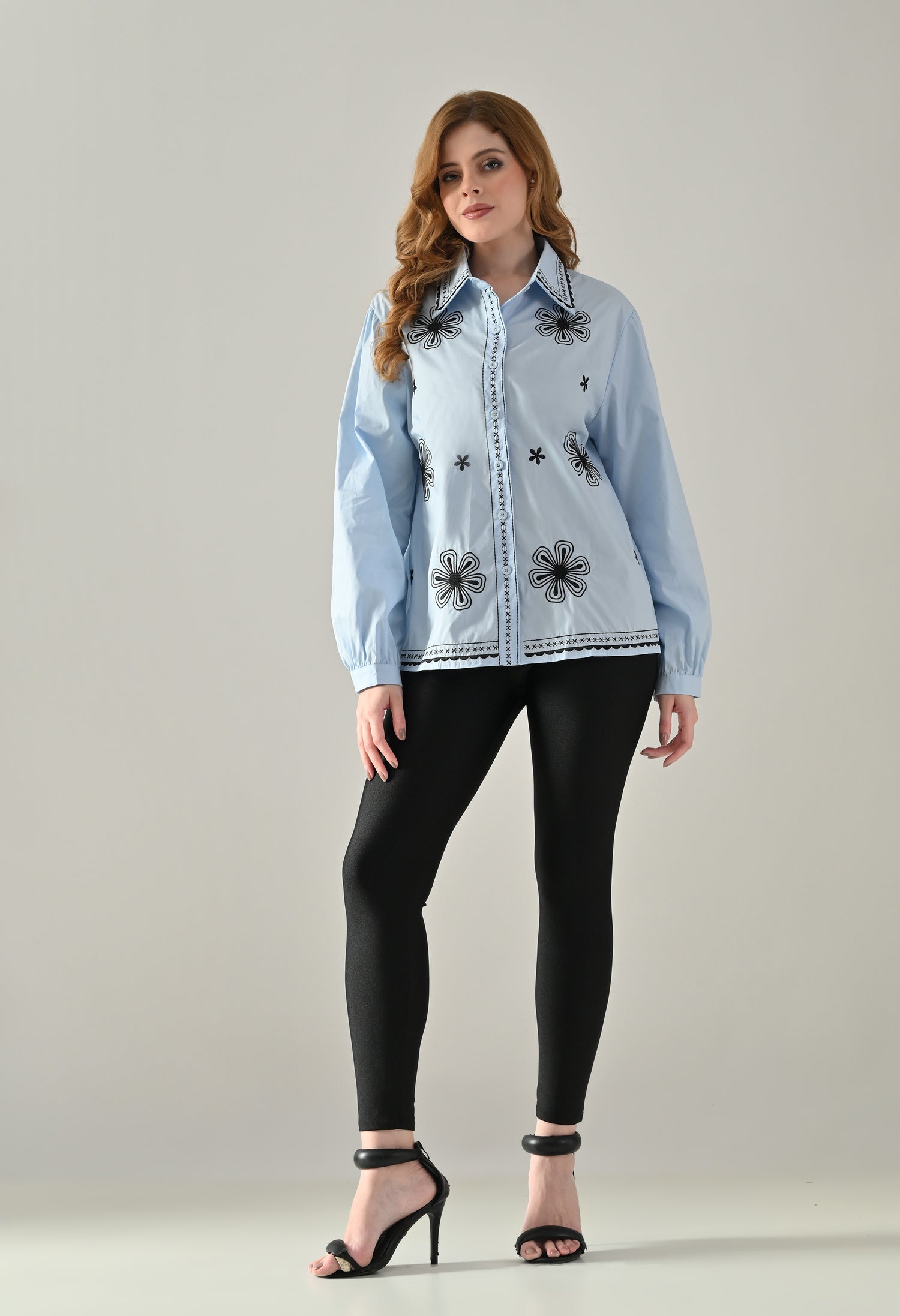 The Bloom Embroidered Shirt is crafted in a relaxed fit with classic turn-down collars and full button closure from top to bottom. Featuring delicate embroidered floral motifs across the front and collar, this shirt brings a soft yet striking charm. Designed with comfortable full sleeves and a versatile silhouette, it’s a timeless piece with modern detailing, perfect to pair with skirts, trousers, or denim for effortless day-to-night style.