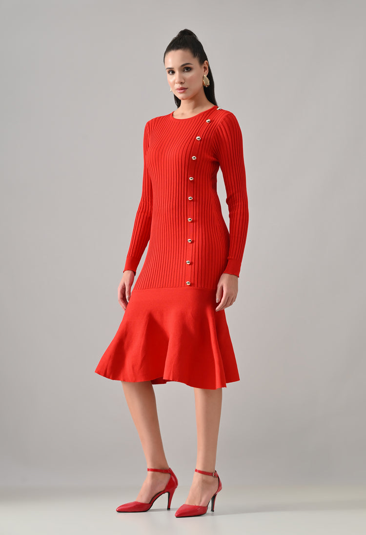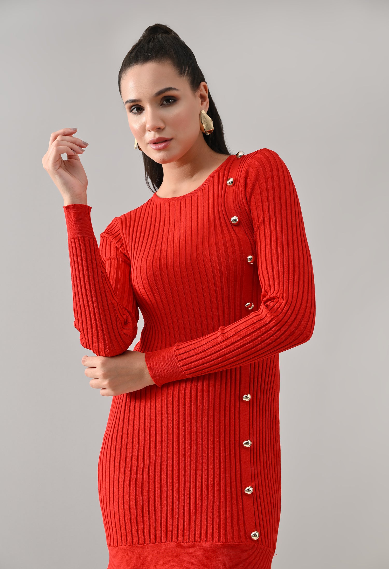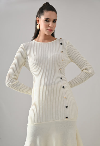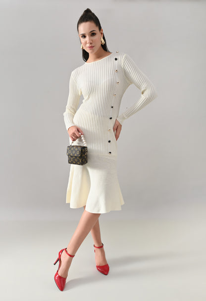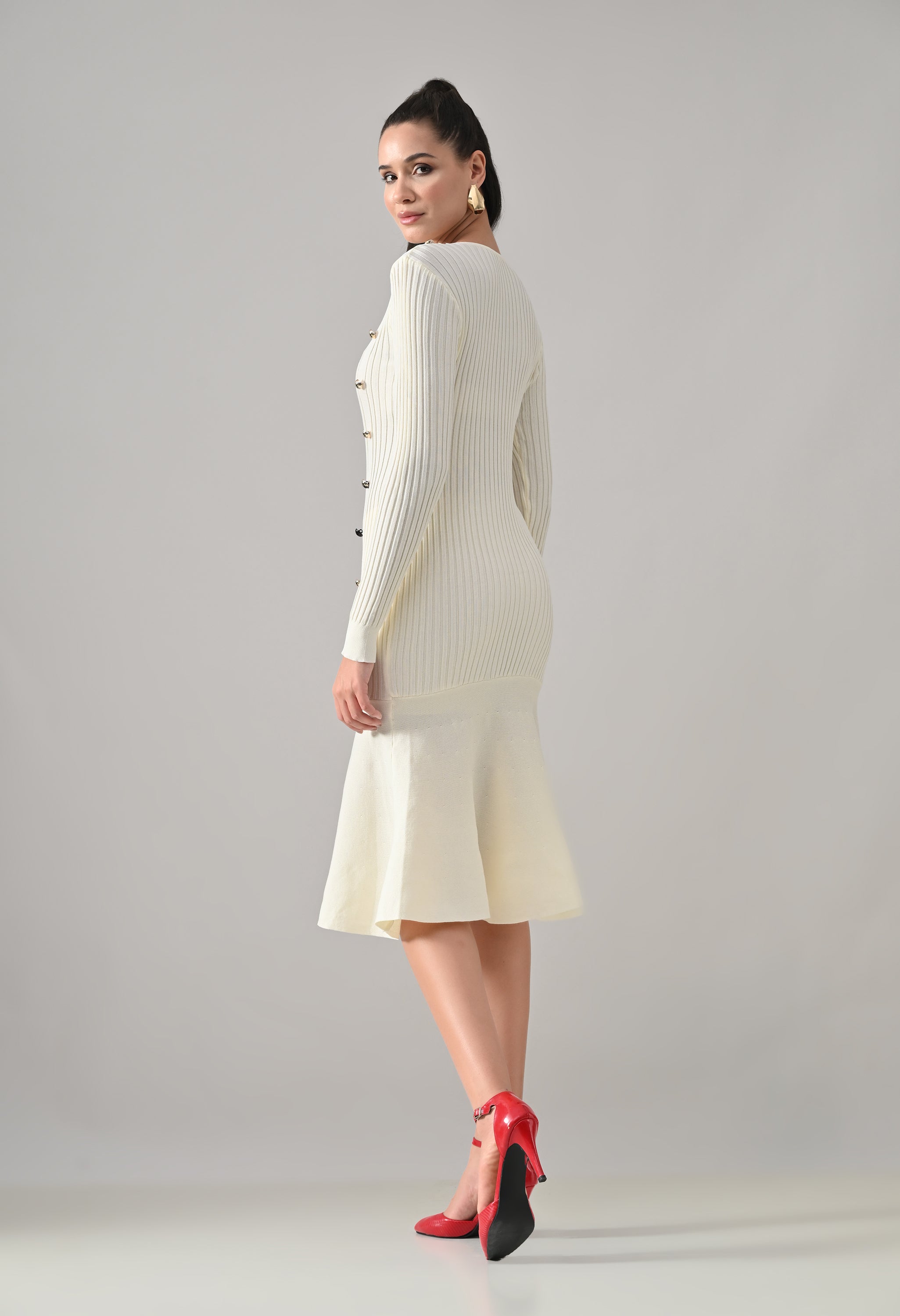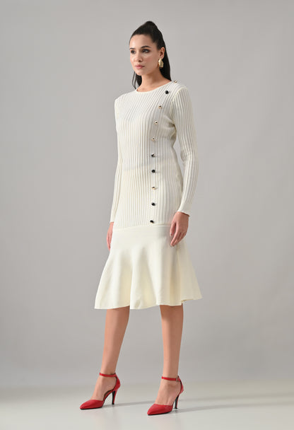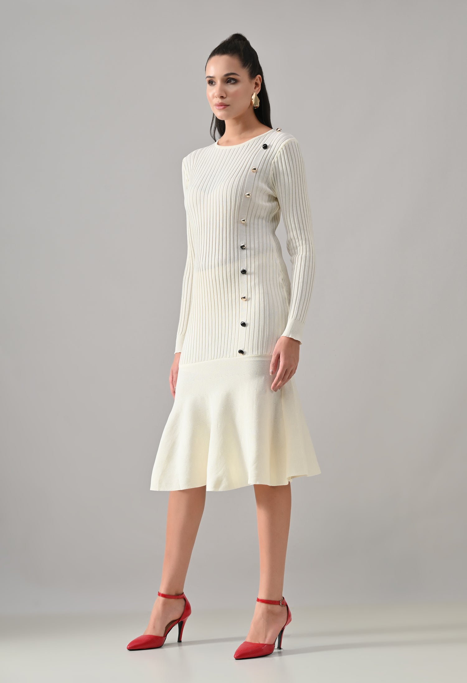 Effortlessly elegant, this ivory ribbed knit dress is designed to flatter with its slim-fit silhouette and soft stretch fabric. Featuring a round neckline and long sleeves, it offers both comfort and sophistication. Gold-tone decorative buttons along the front add a luxe touch, while the flared hem enhances movement and femininity. Perfect for both day-to-evening transitions.