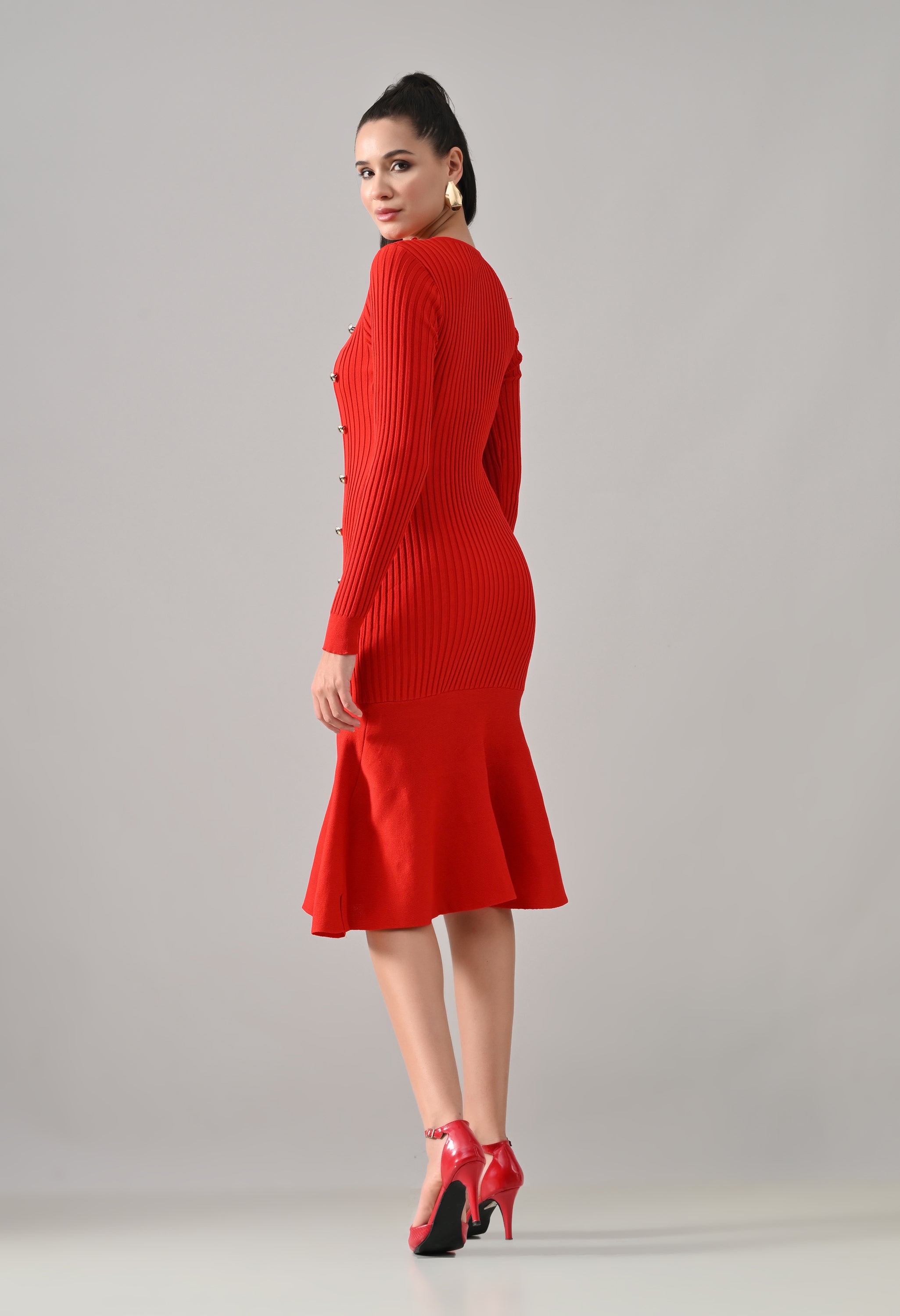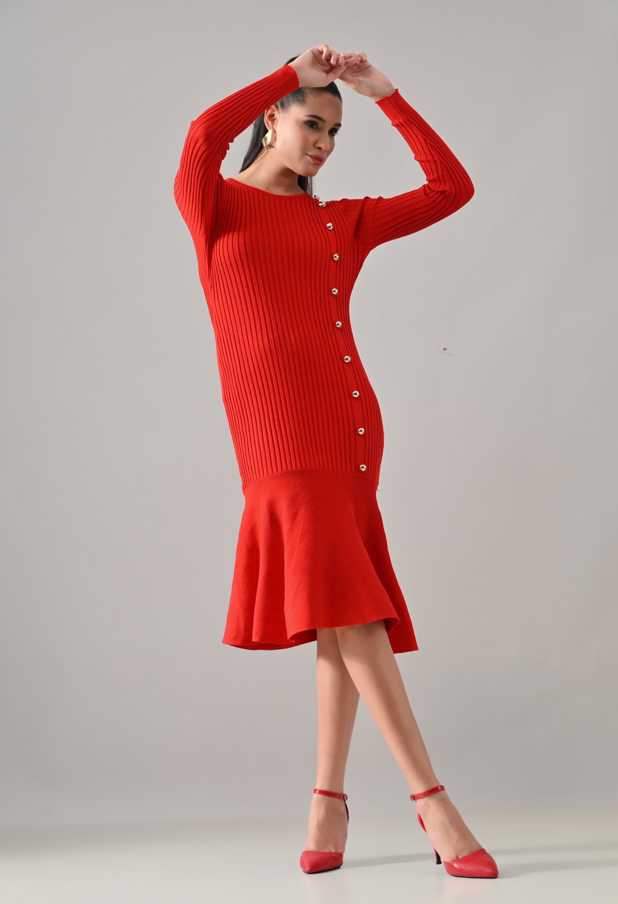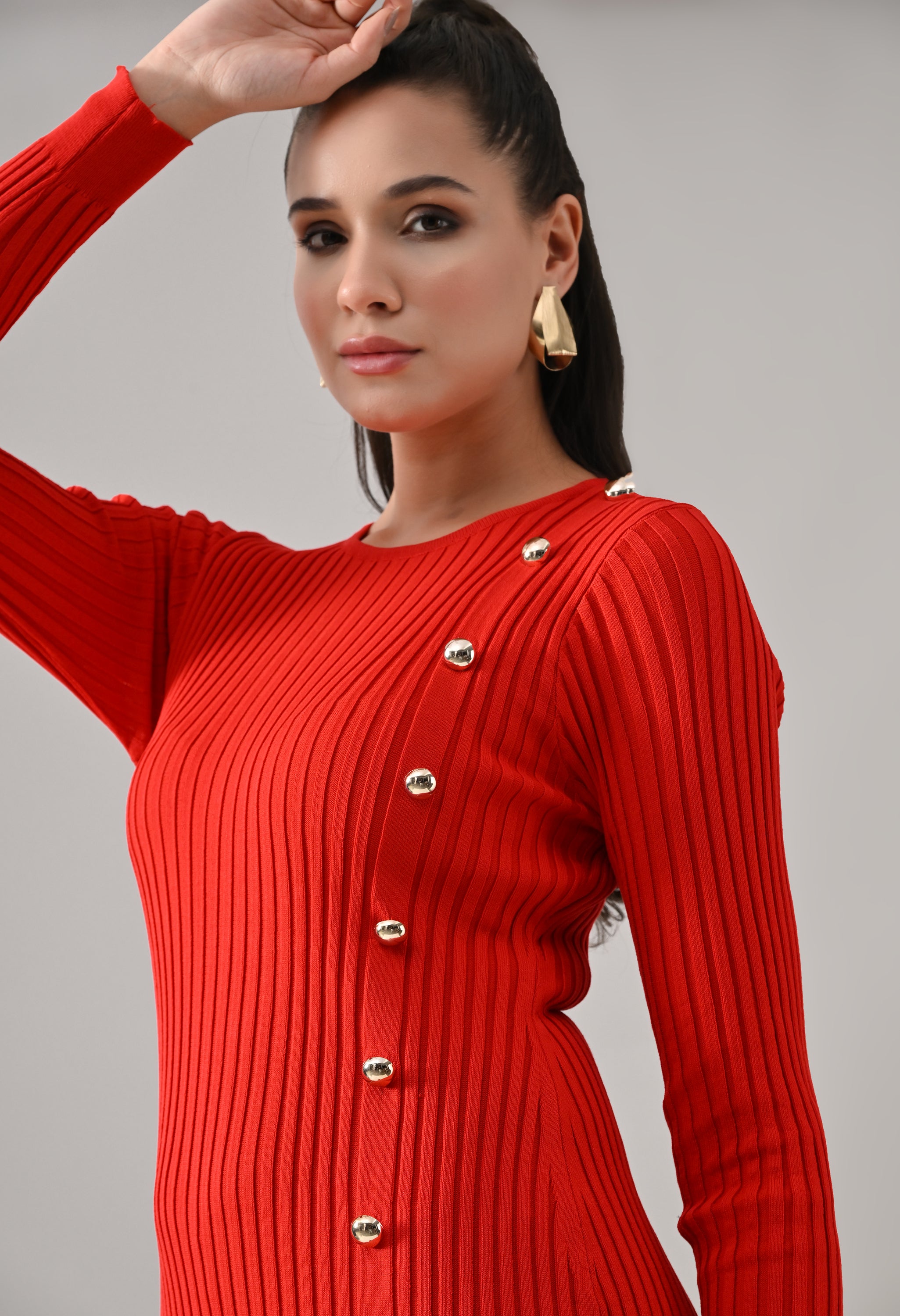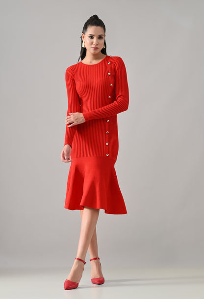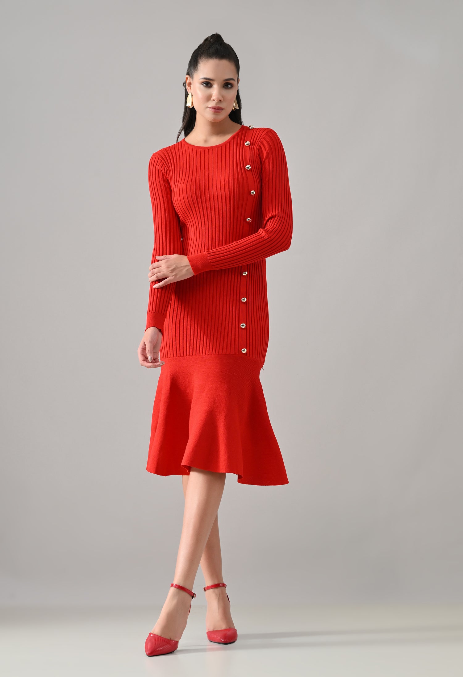 Effortlessly elegant, this ivory ribbed knit dress is designed to flatter with its slim-fit silhouette and soft stretch fabric. Featuring a round neckline and long sleeves, it offers both comfort and sophistication. Gold-tone decorative buttons along the front add a luxe touch, while the flared hem enhances movement and femininity. Perfect for both day-to-evening transitions.