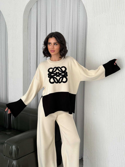 Elevate your style with our chic Colorblock Knitted Two-Piece Set – perfect for autumn and winter. Featuring a round neckline, side-slit top, and elasticated waistband pants, it’s your go-to for casual days, cozy evenings, or holiday lounging
