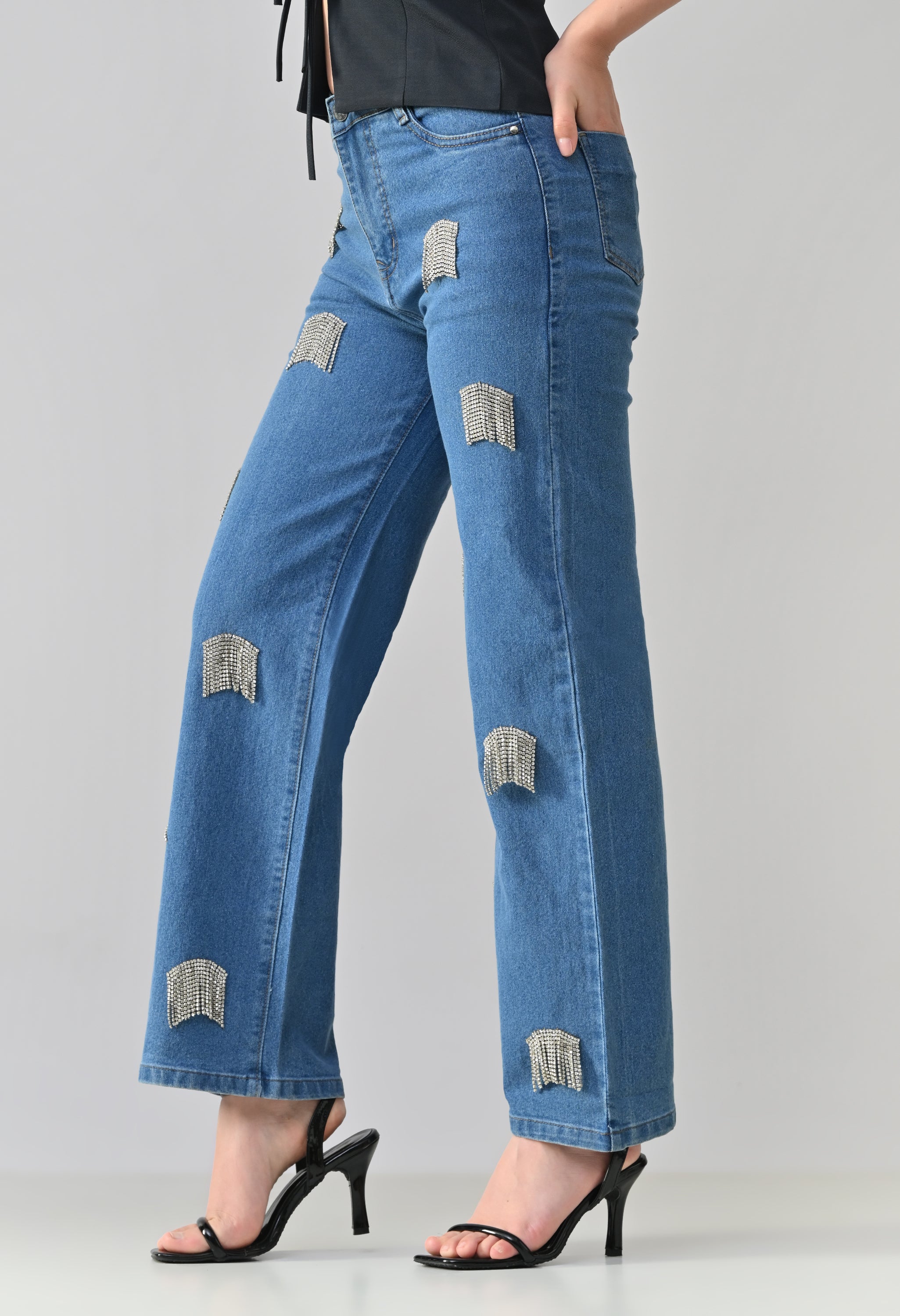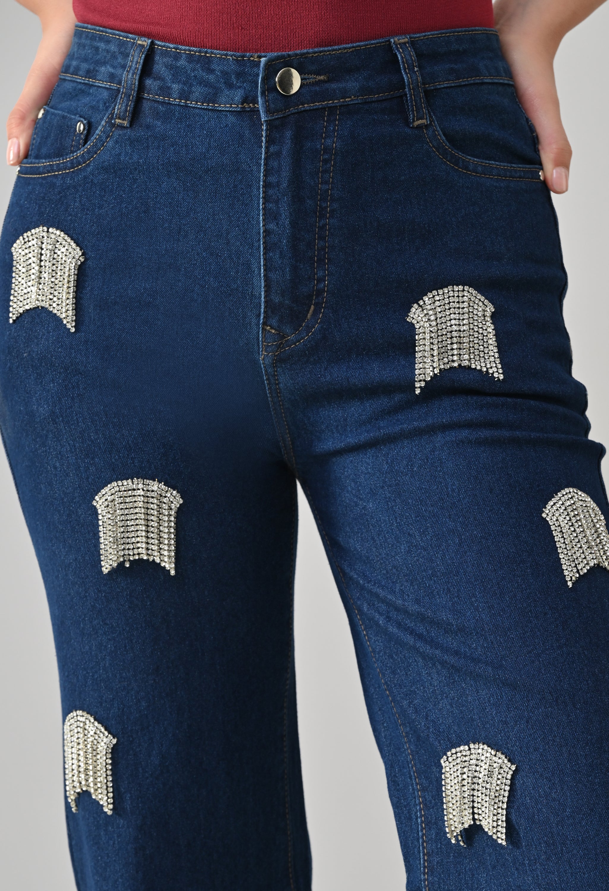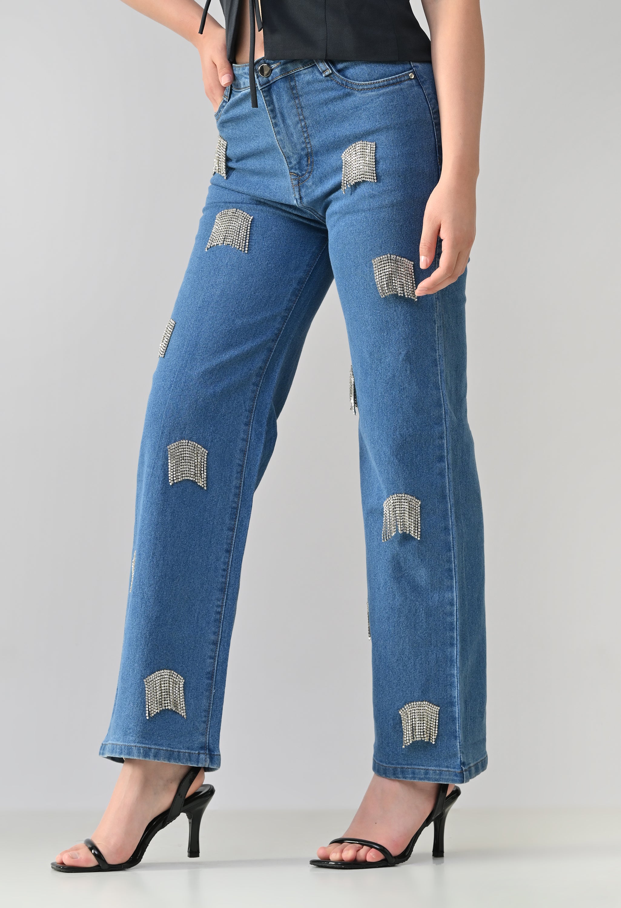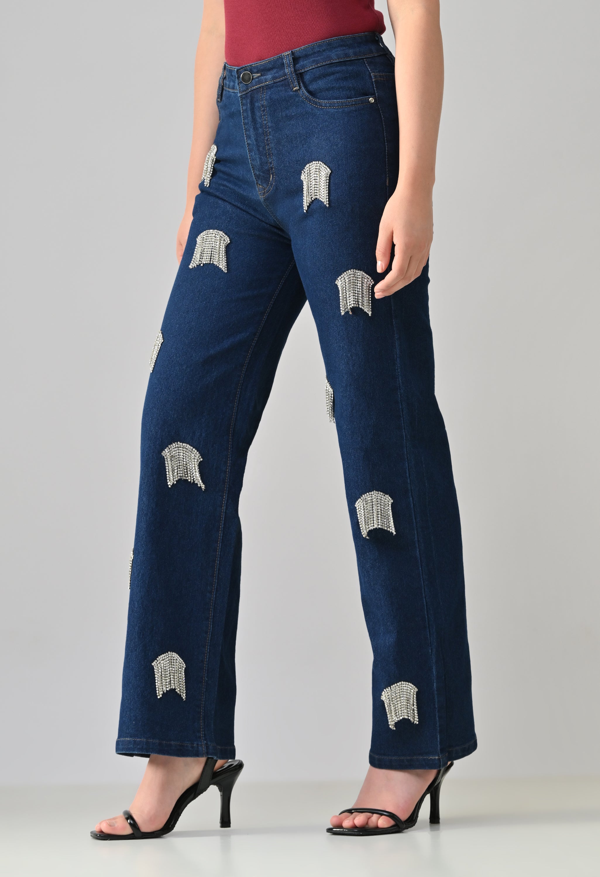 Elevate your denim look with these statement straight-leg jeans featuring intricate crystal embellishments. Crafted from sturdy blue denim, the jeans showcase multiple hand-done hanging crystal motifs placed across the front, adding a bold, artistic sparkle. The classic five-pocket construction and structured waistband keep the silhouette timeless, while the embellishments bring a high-fashion edge.
