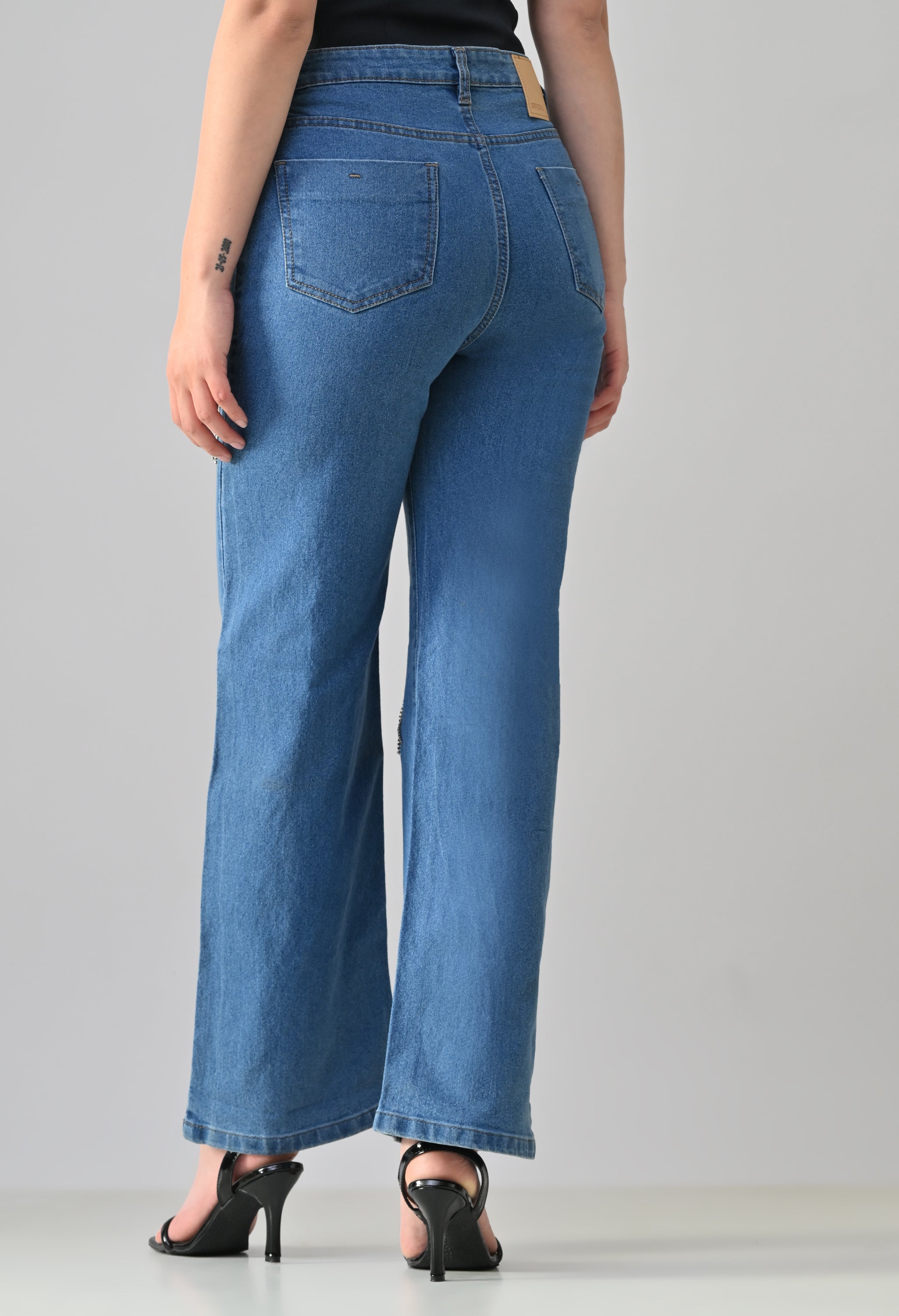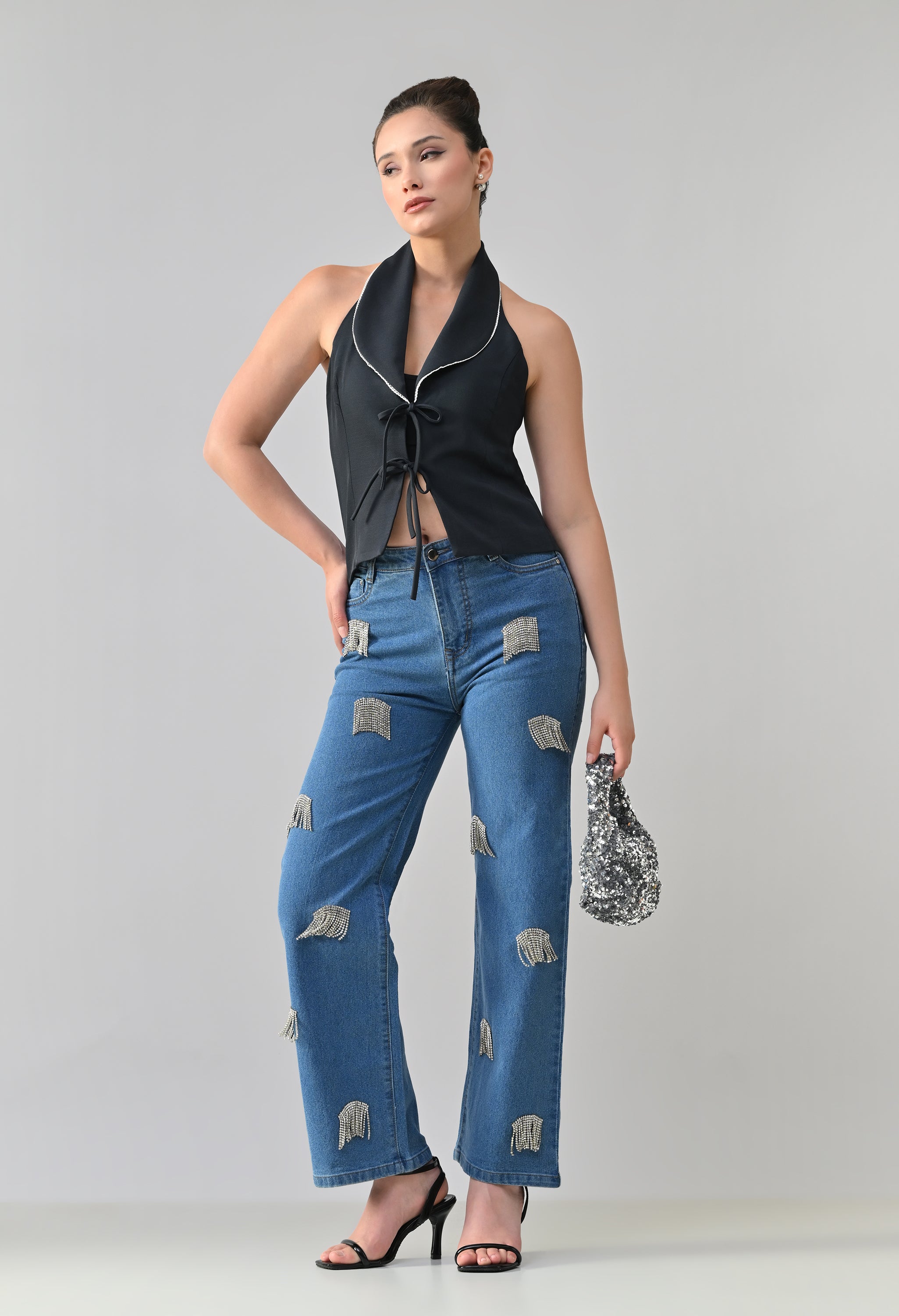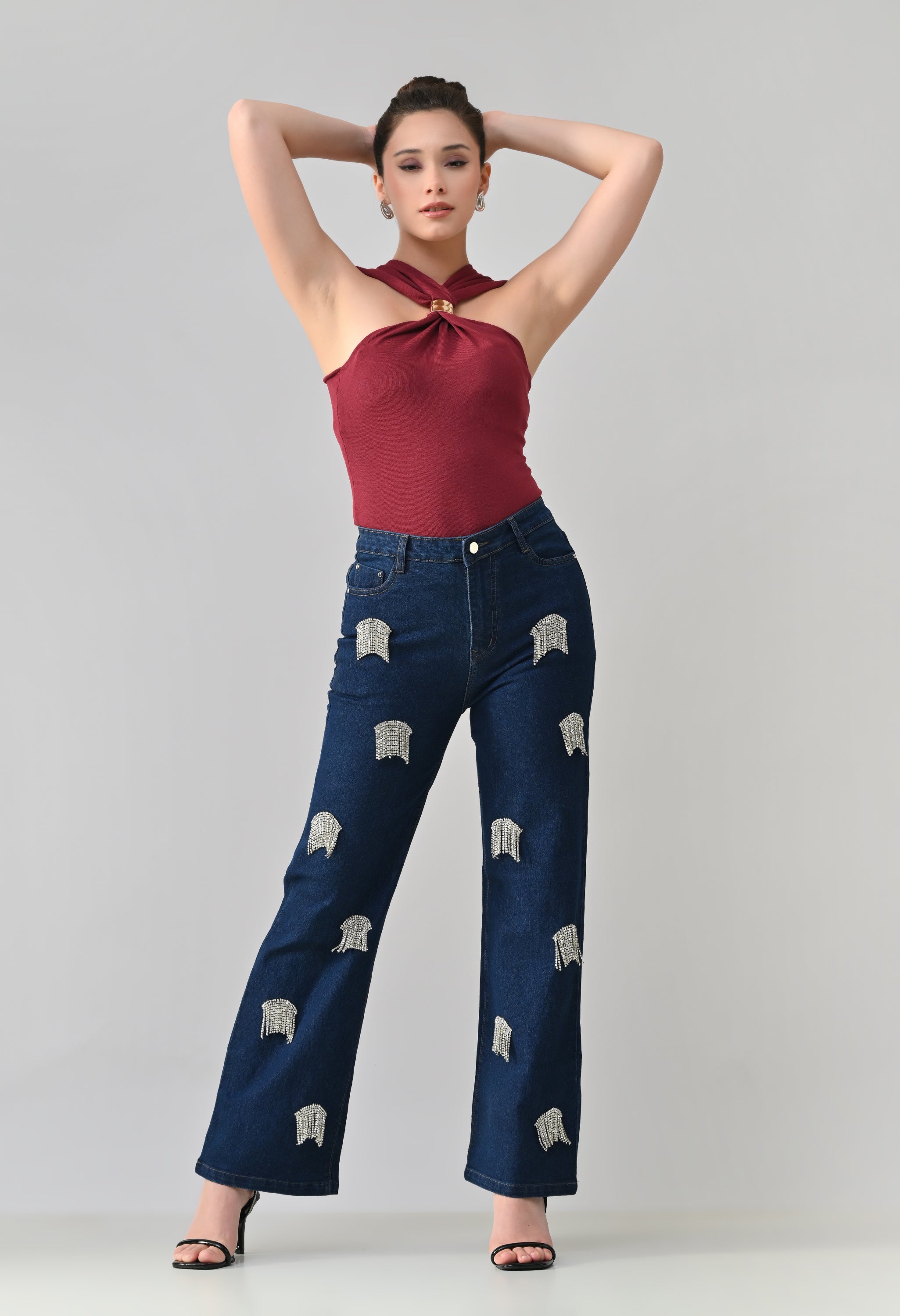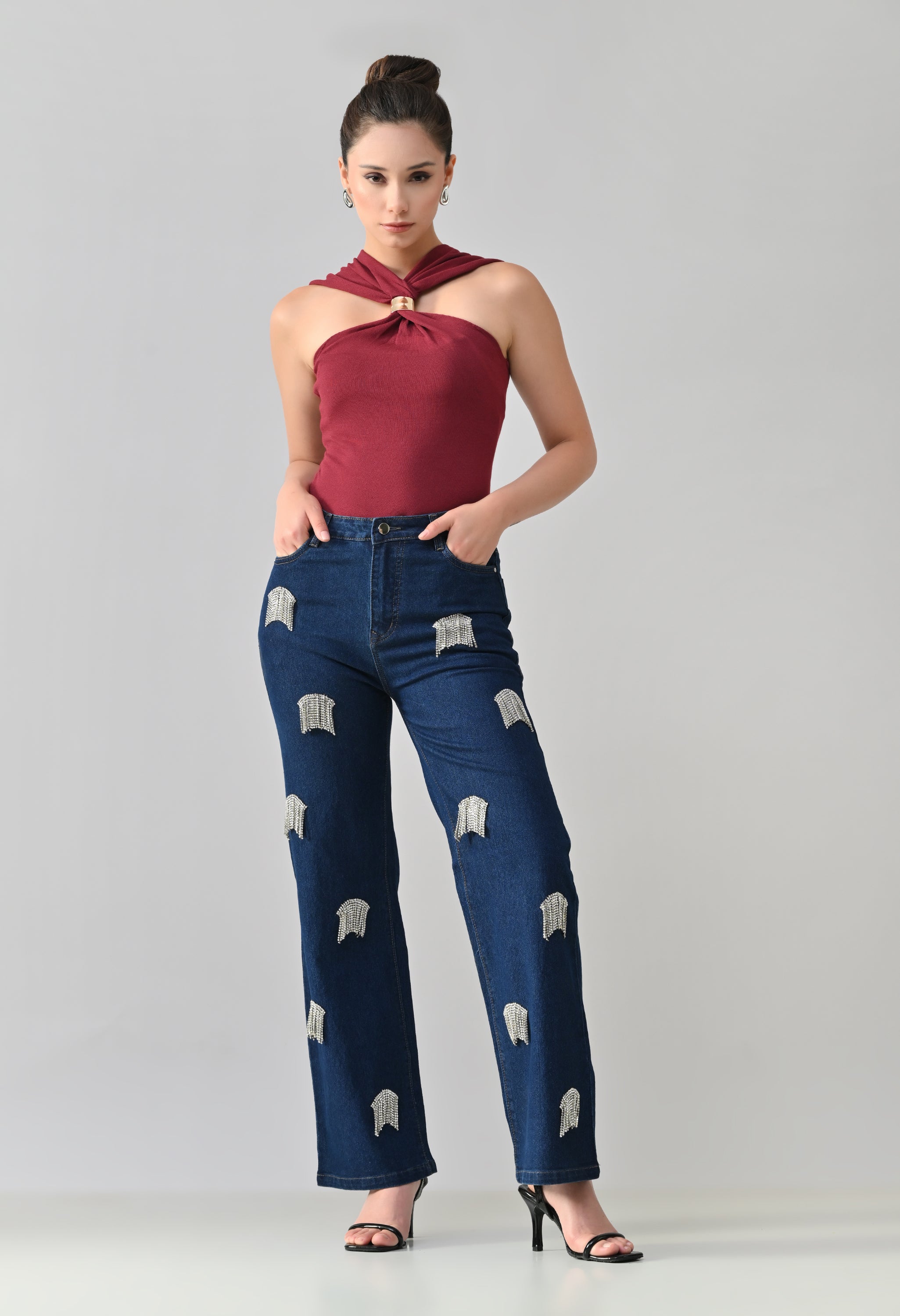 Elevate your denim look with these statement straight-leg jeans featuring intricate crystal embellishments. Crafted from sturdy blue denim, the jeans showcase multiple hand-done hanging crystal motifs placed across the front, adding a bold, artistic sparkle. The classic five-pocket construction and structured waistband keep the silhouette timeless, while the embellishments bring a high-fashion edge.