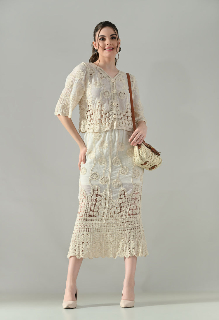 Elevate your summer wardrobe with the Crochet Charm Co-ord Set, a stylish two-piece ensemble blending elegance and comfort. The short top features a flattering V-neckline, buttoned placket, and 3/4 sleeves, designed in a half-crochet pattern for breezy sophistication. Paired with an elasticated skirt, also crafted in a half-crochet design with a soft lining, the set is finished with a delicate scalloped hem that adds timeless charm. Perfect for both casual outings and chic evenings, this non-stretchable co-ord offers a relaxed yet refined look.