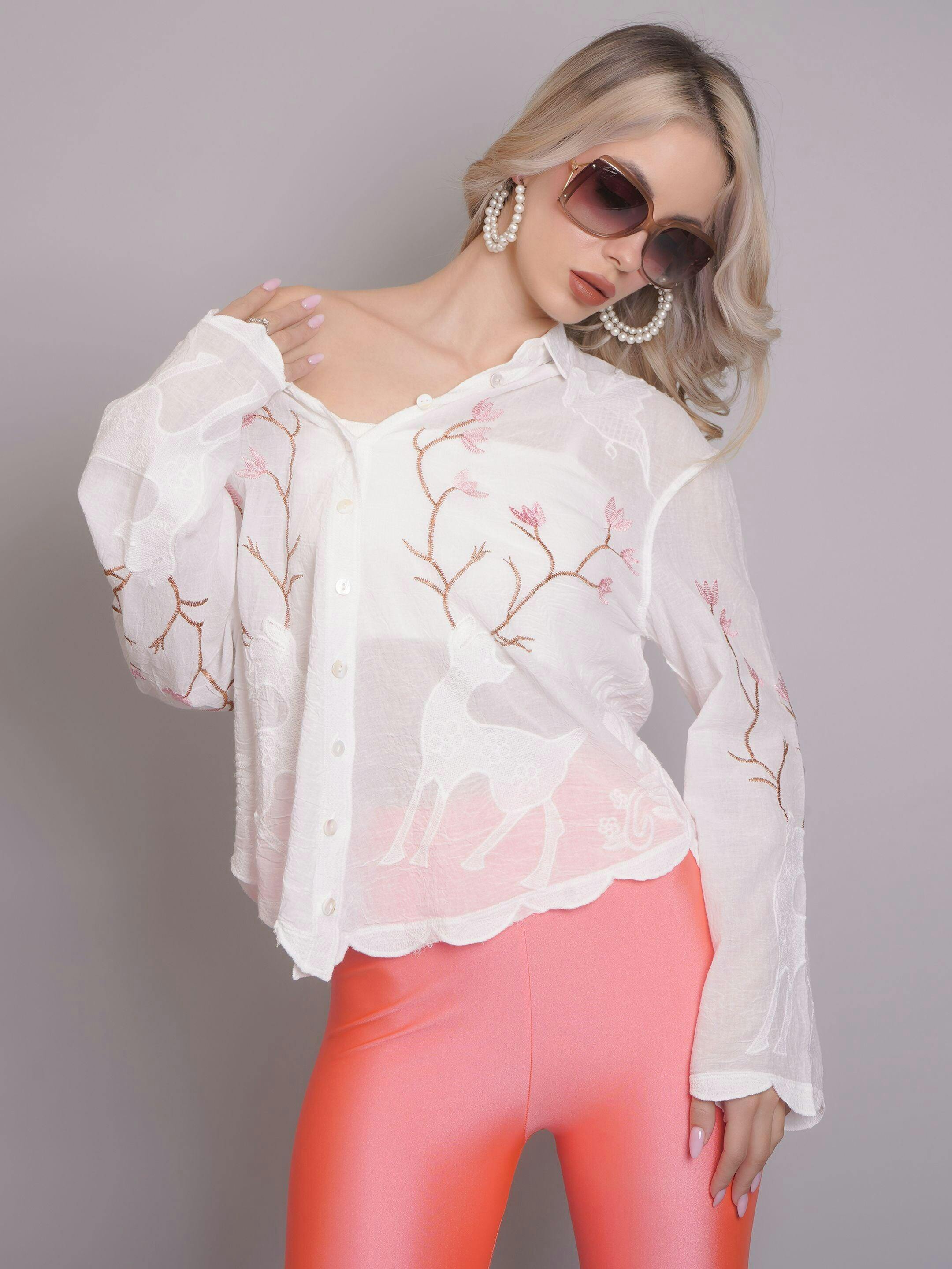 This Deer Embroidered Shirt is a versatile addition to your wardrobe, perfect for everything from work to weekend outings. With chic deer embroidery, an asymmetrical scallop hem, and comfortable long sleeves, it offers elegance in a soft, non-stretch fabric for a relaxed yet stylish fit.