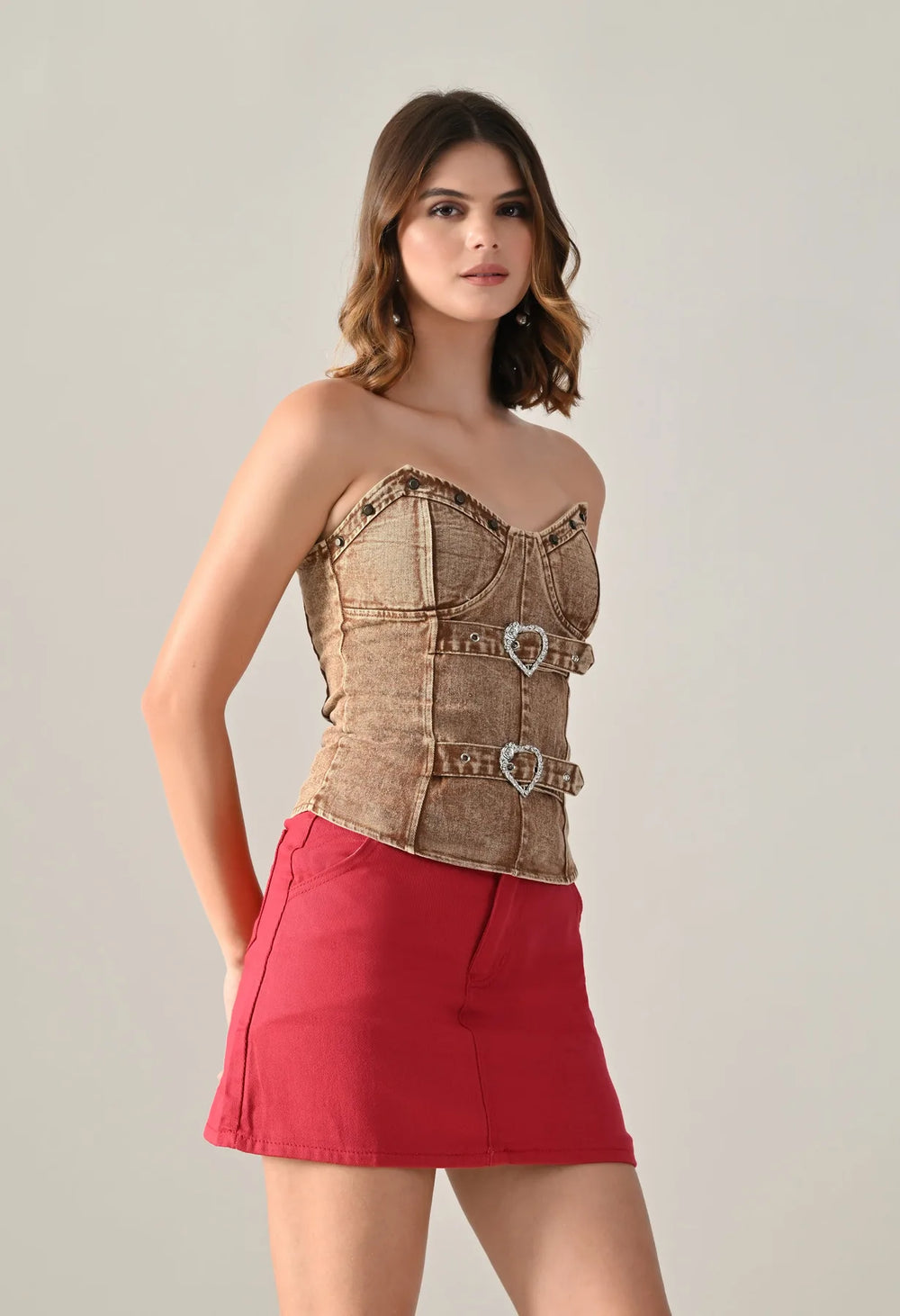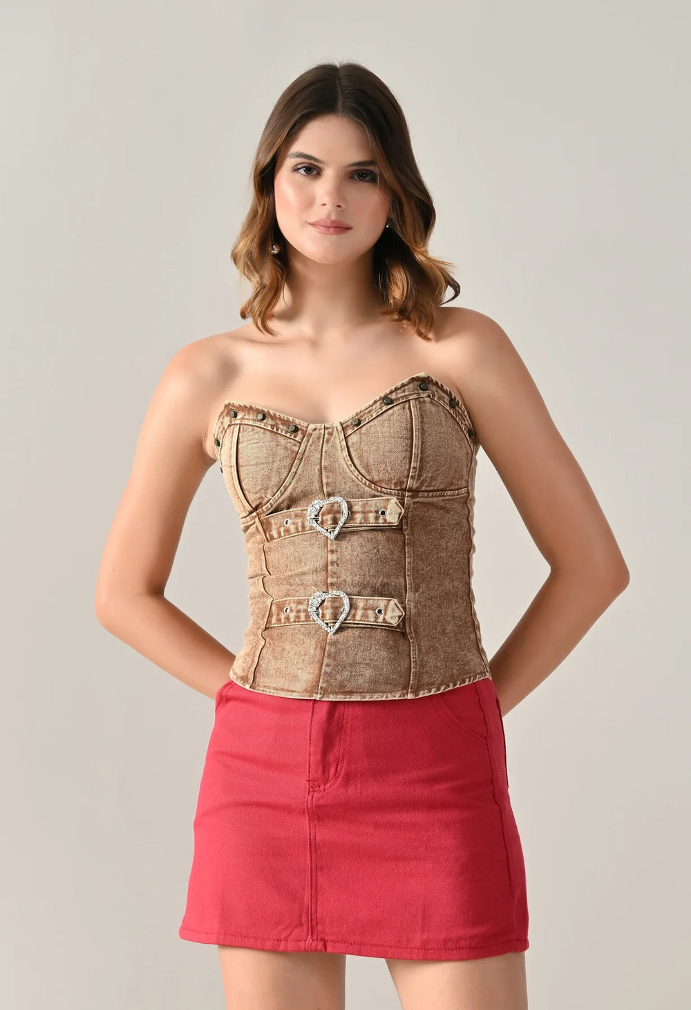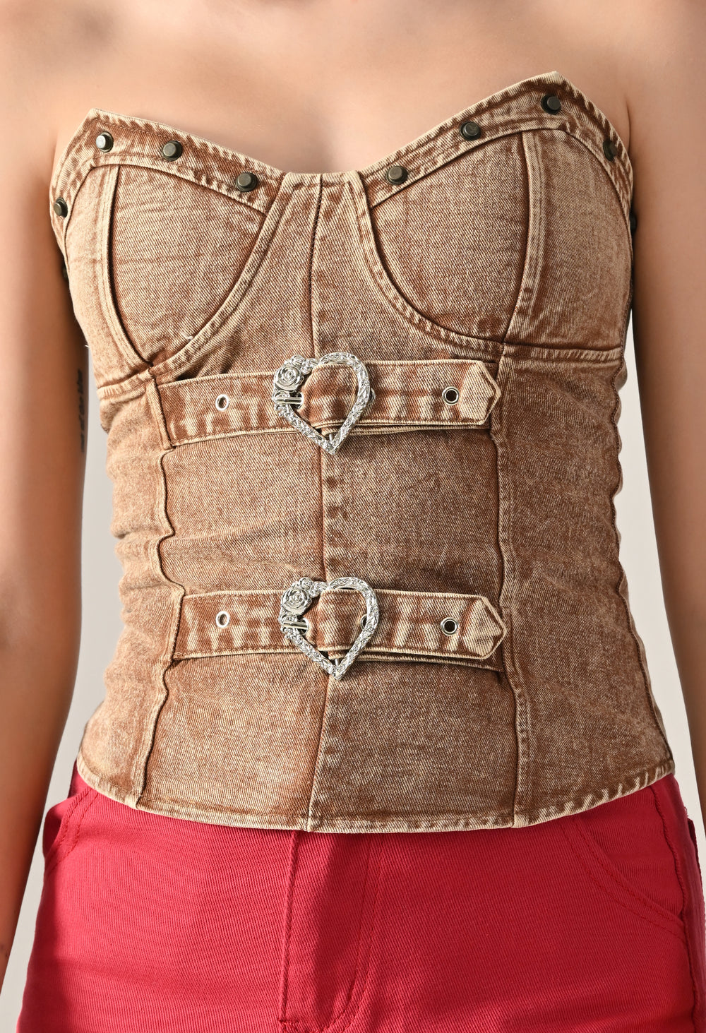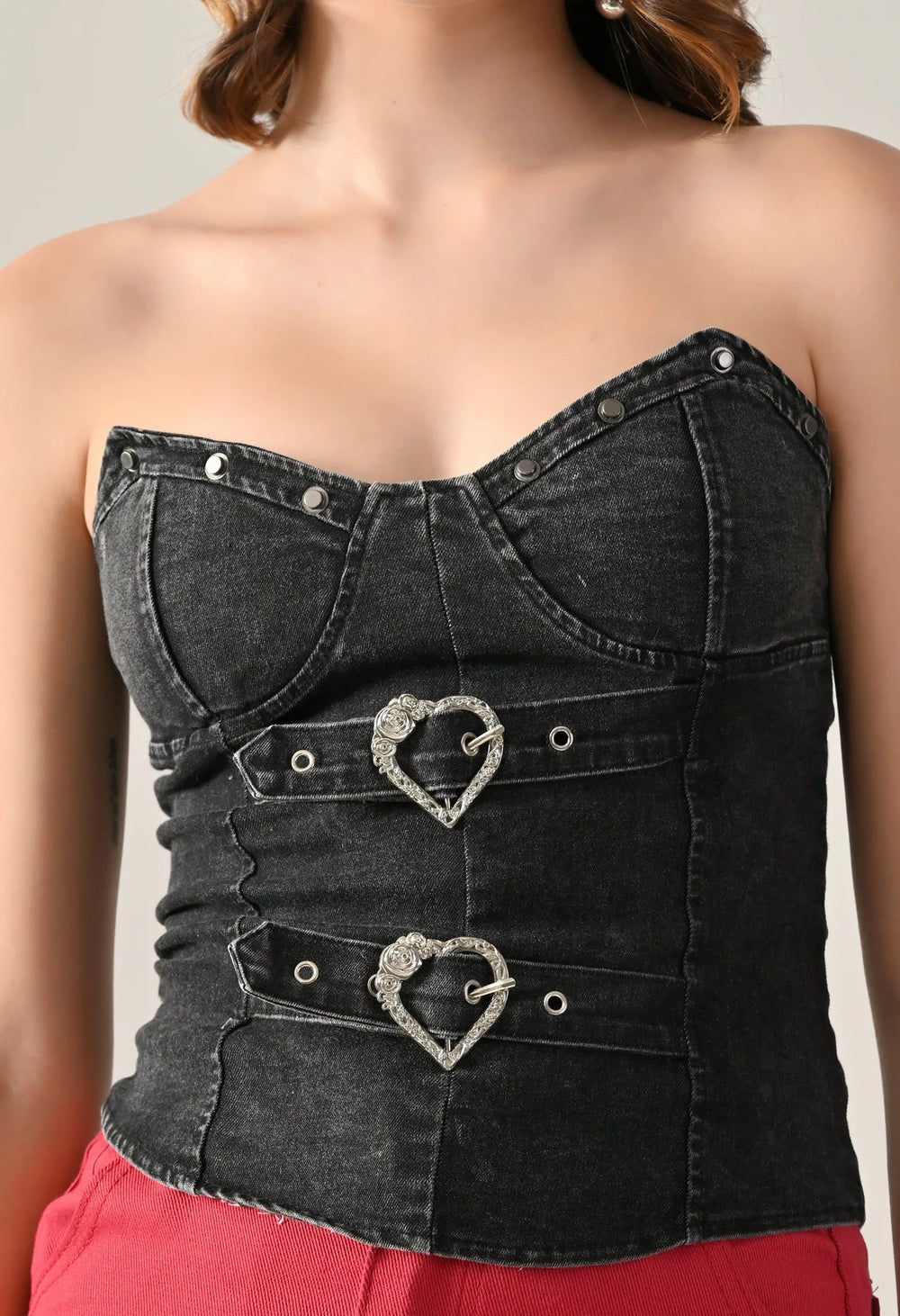 Denim corset top featuring a strapless sweetheart neckline and structured panel design for a flattering fit. Detailed with dual silver-tone heart buckle straps and stud accents for a bold look. Includes built-in bust pads for support and smocking at the center back for a contoured silhouette. Finished with a washed denim effect.