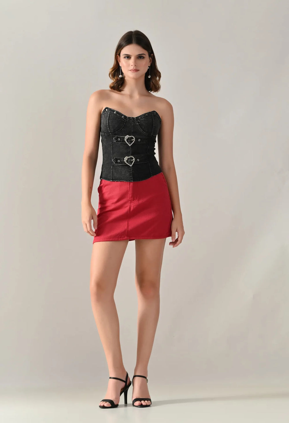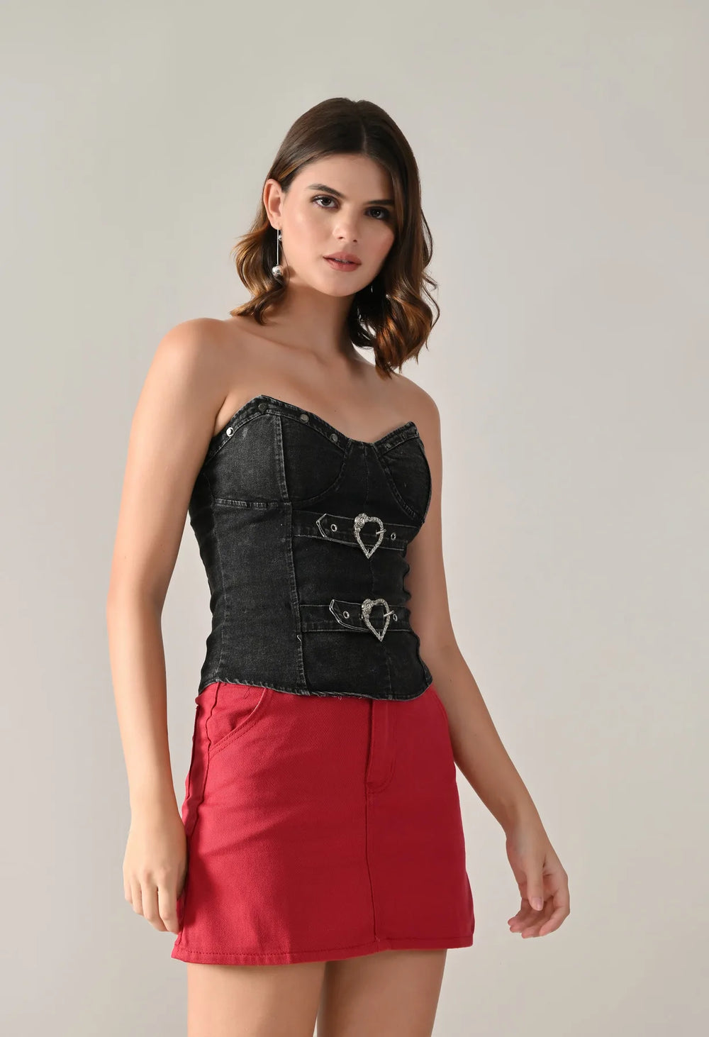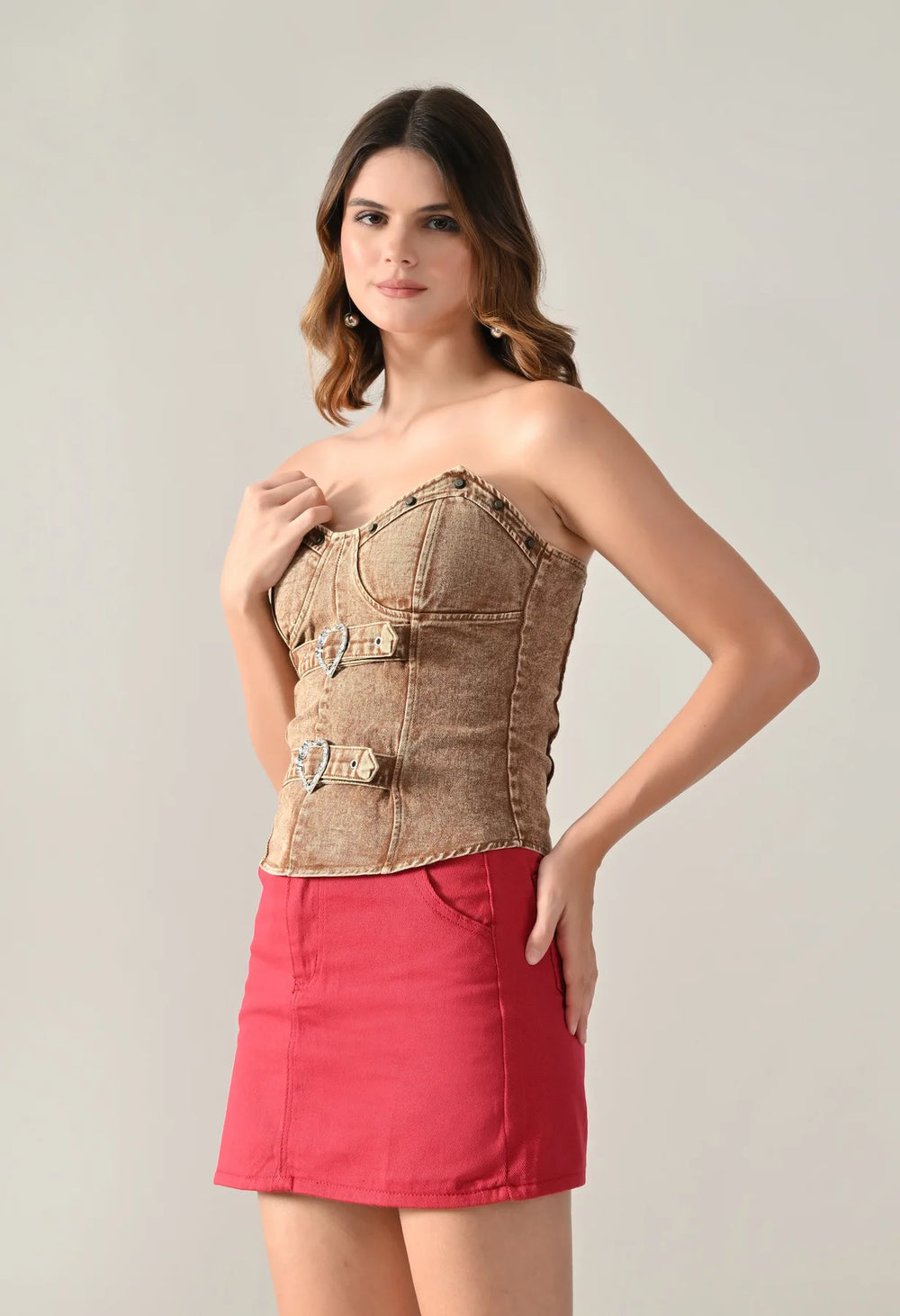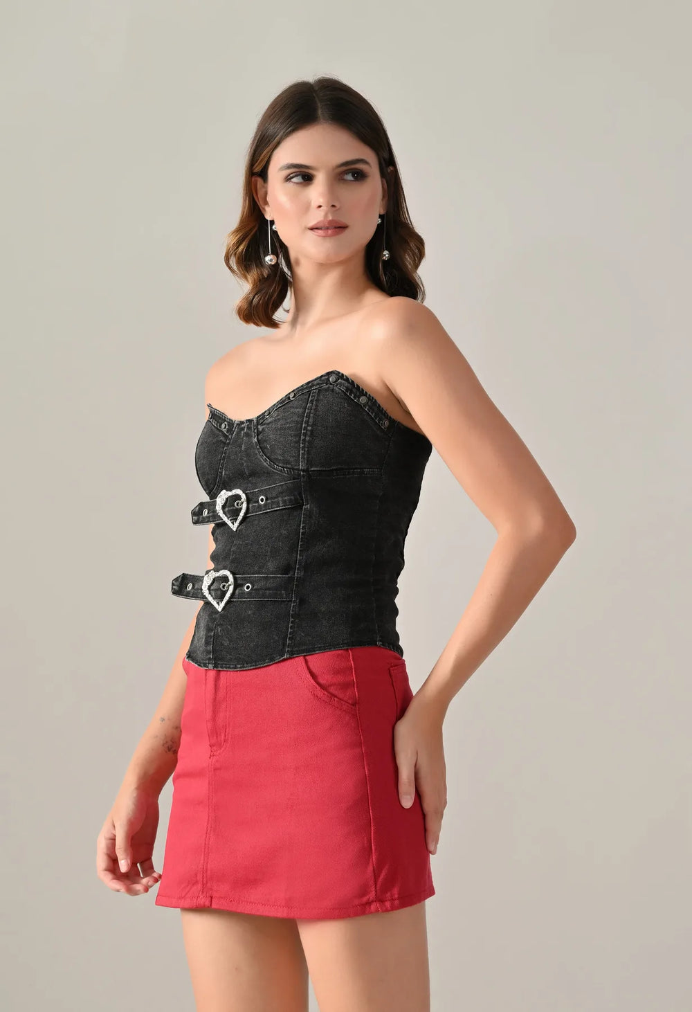 Denim corset top featuring a strapless sweetheart neckline and structured panel design for a flattering fit. Detailed with dual silver-tone heart buckle straps and stud accents for a bold look. Includes built-in bust pads for support and smocking at the center back for a contoured silhouette. Finished with a washed denim effect.