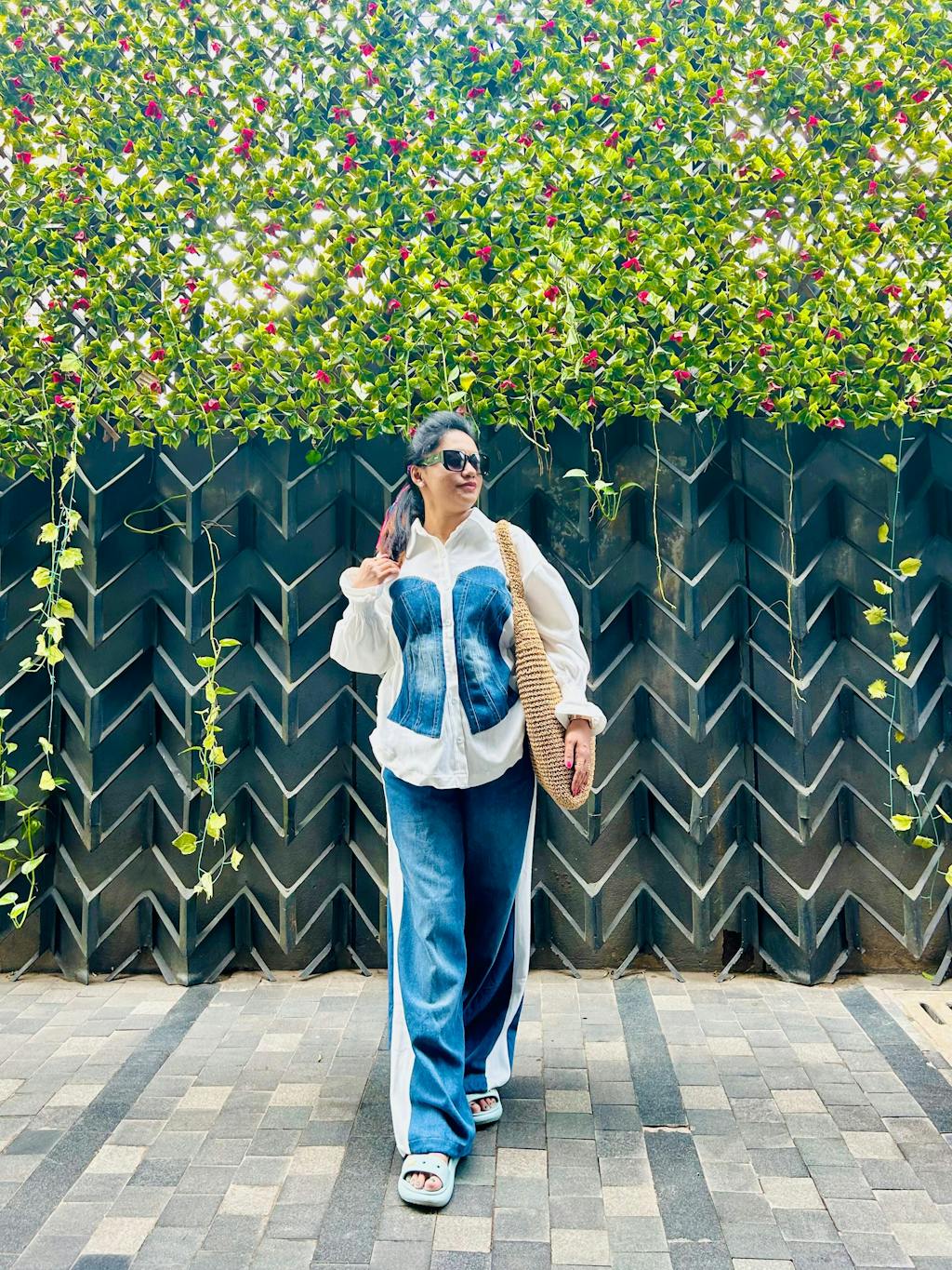This structured denim co-ord with a cinched waist creates a flattering hourglass silhouette. The shirt features contrast denim panels for a modern touch, paired with wide-leg trousers that add comfort and balance. Effortlessly stylish and bold, this set fits right into your relaxed coffee catch-ups with your girls.