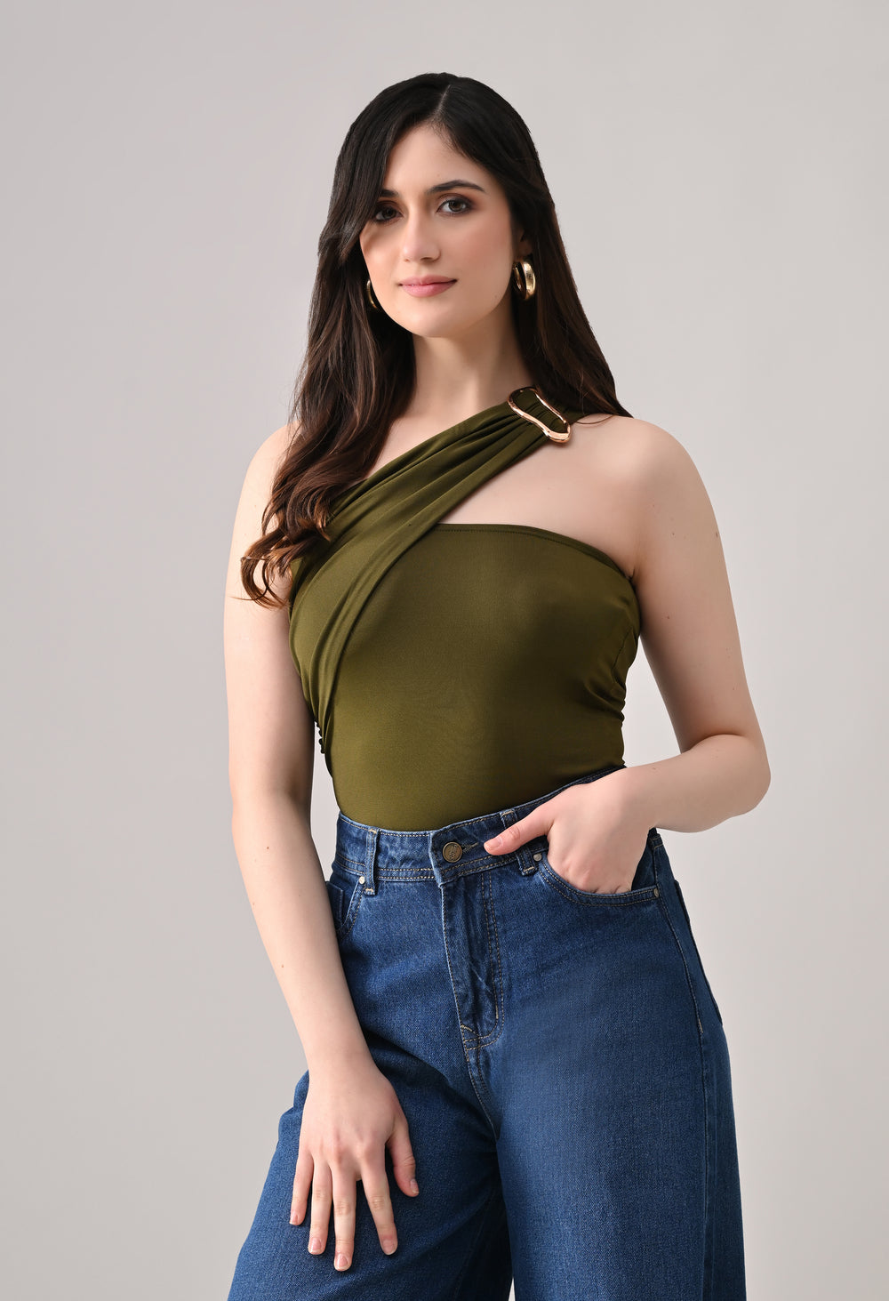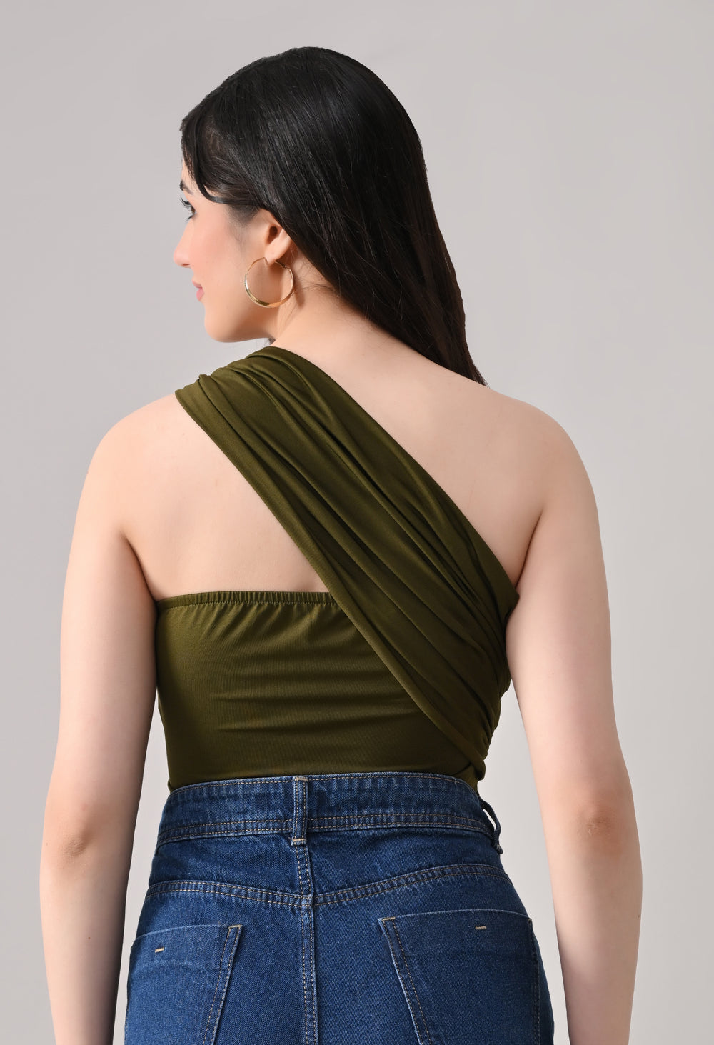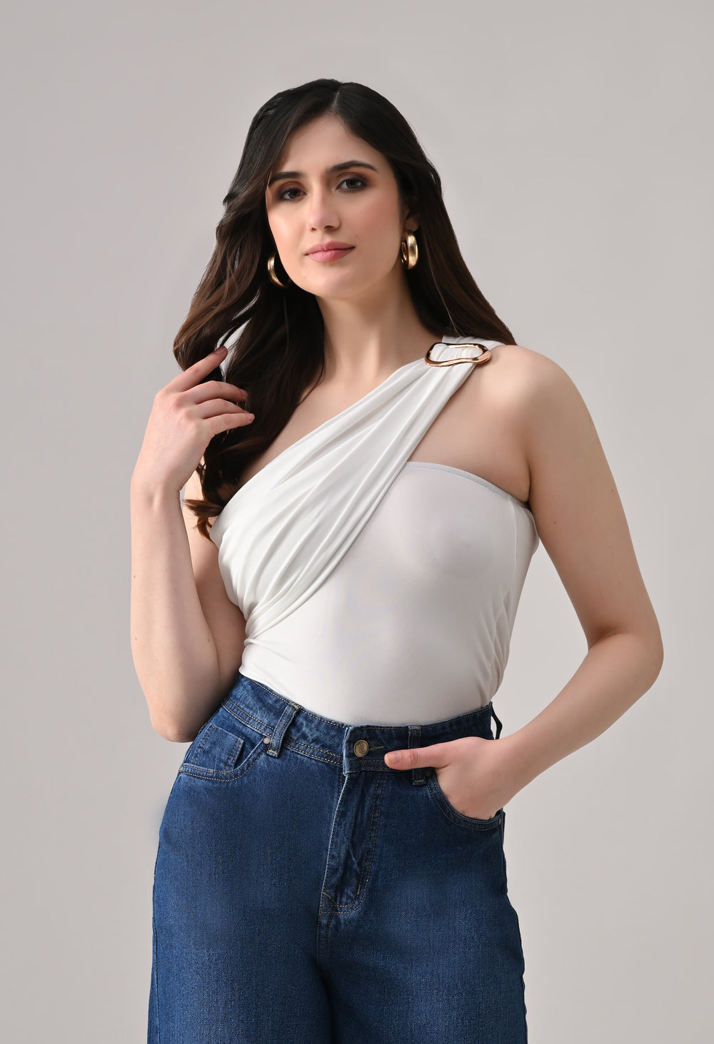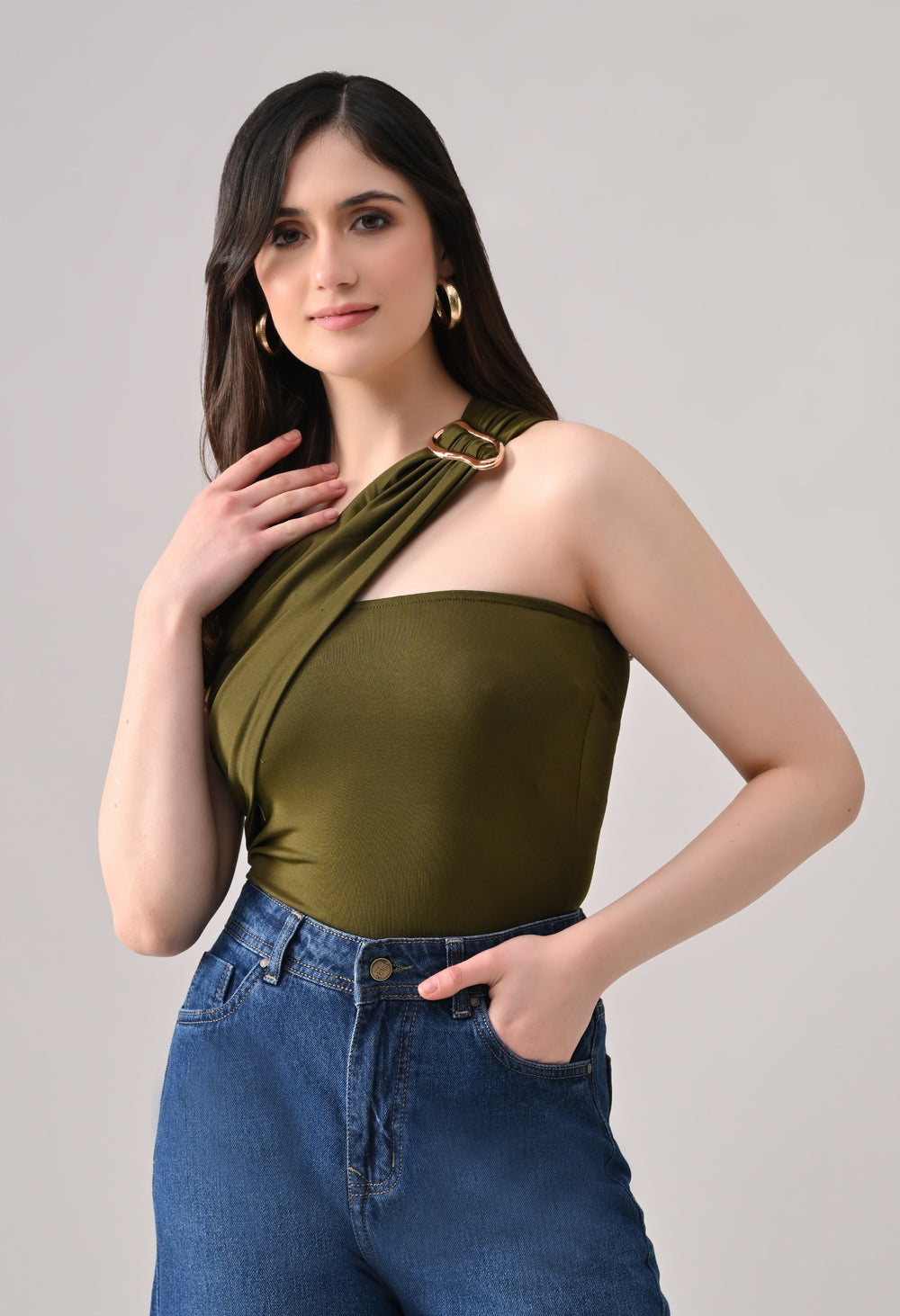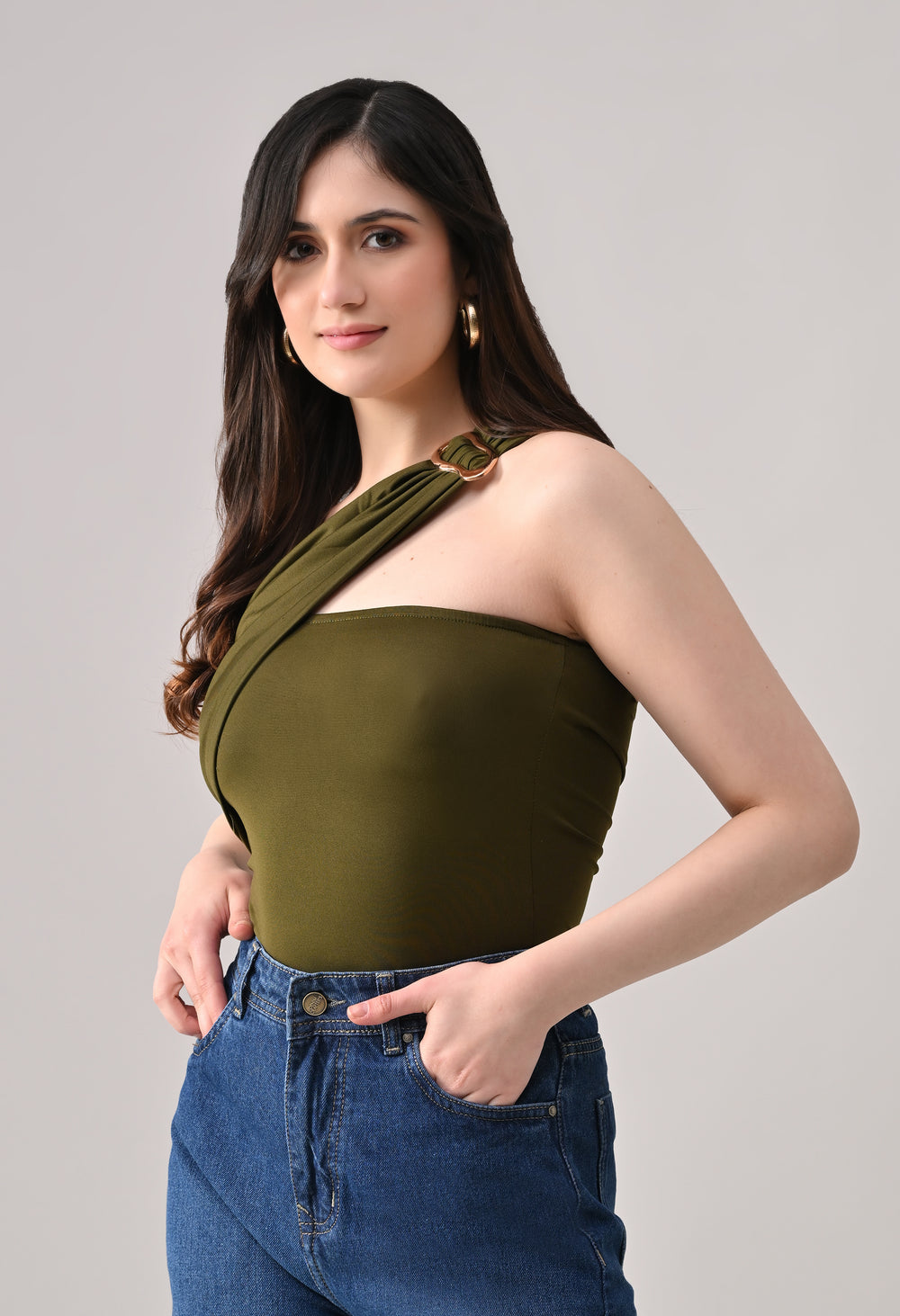 This one-shoulder bodysuit is crafted from soft stretchable fabric for a smooth, body-contouring fit, featuring an asymmetrical neckline with a statement metallic ring detail at the strap, gathered draping across the bodice for added texture and shape, and a secure snap-button closure at the base for comfortable and easy wear.
