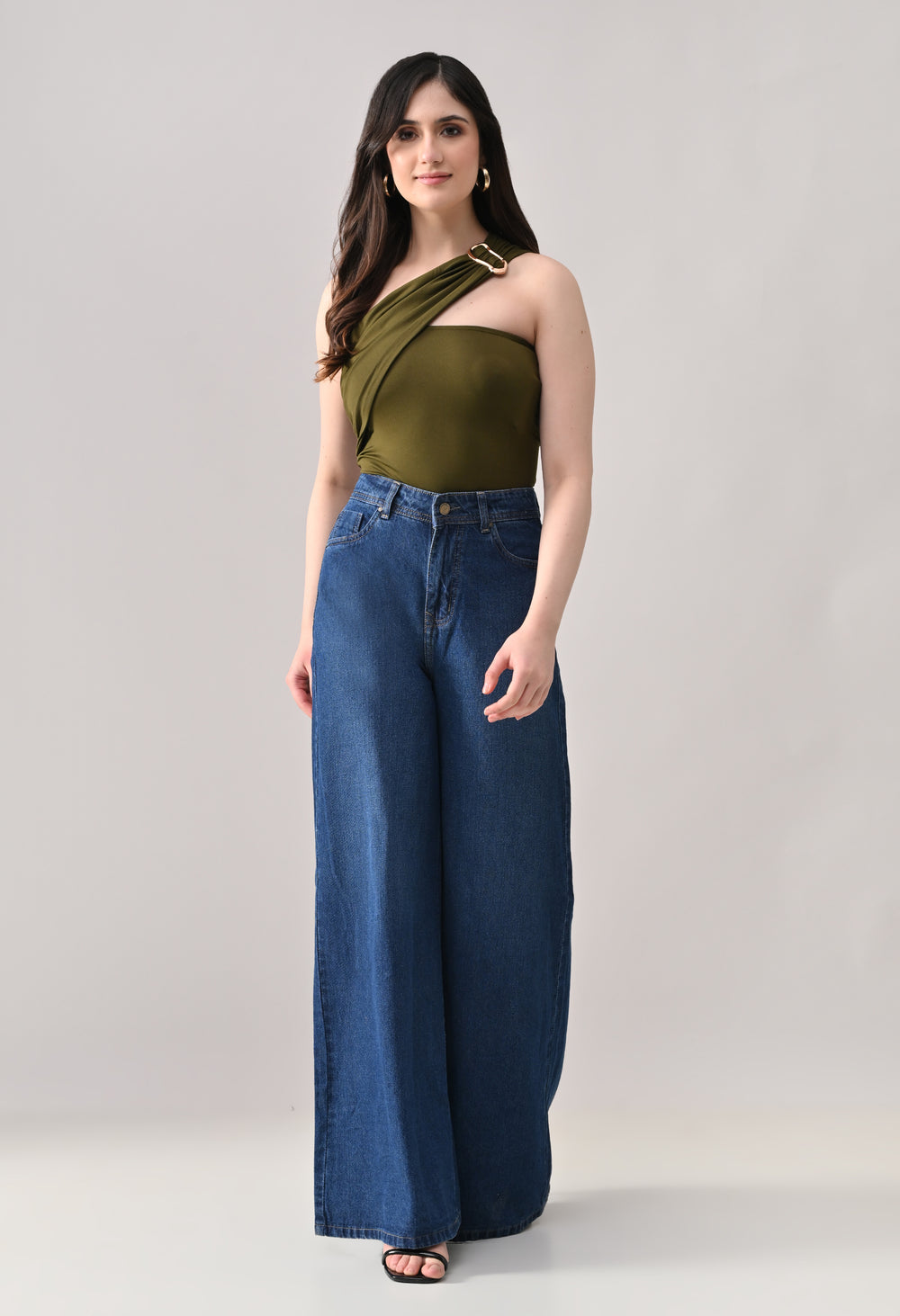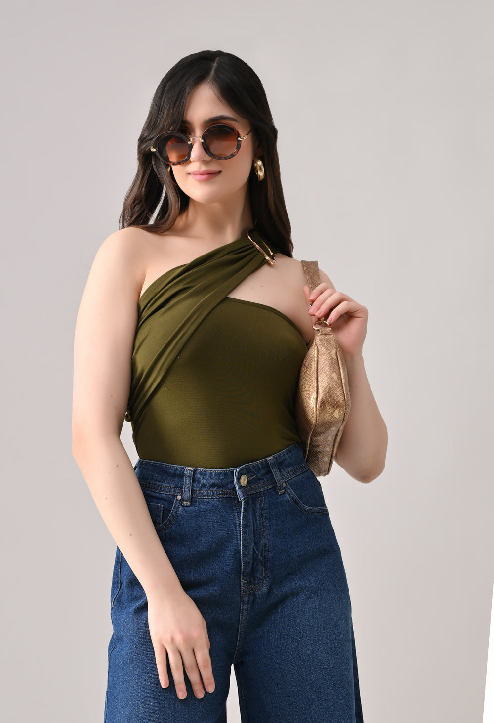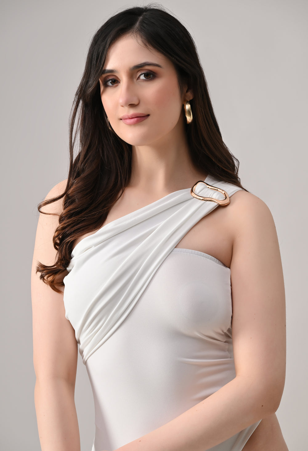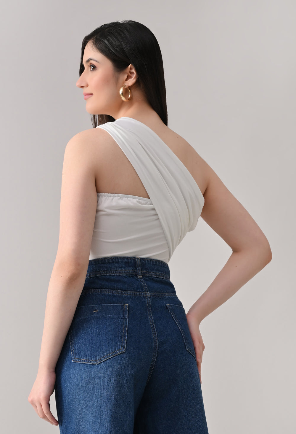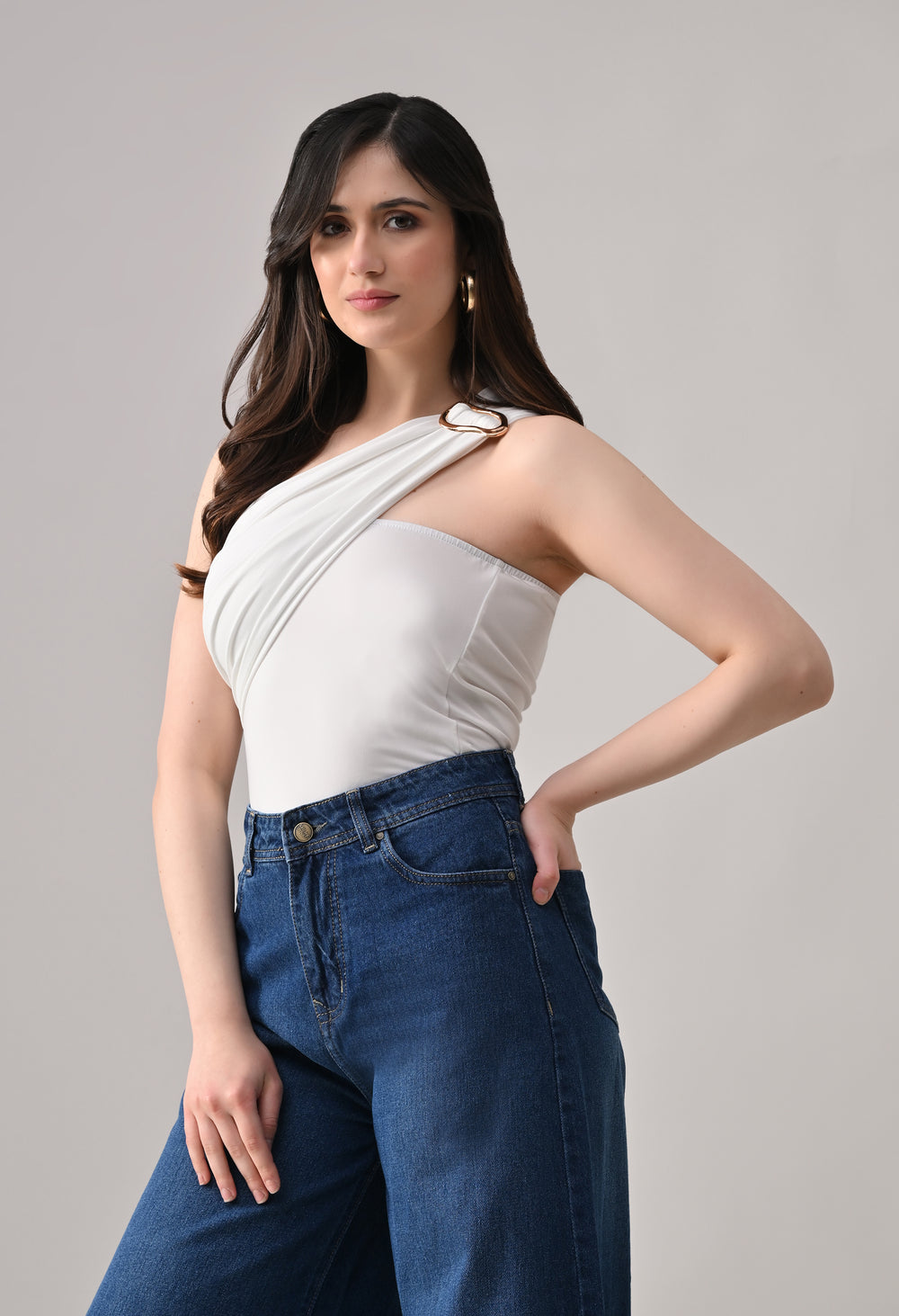 This one-shoulder bodysuit is crafted from soft stretchable fabric for a smooth, body-contouring fit, featuring an asymmetrical neckline with a statement metallic ring detail at the strap, gathered draping across the bodice for added texture and shape, and a secure snap-button closure at the base for comfortable and easy wear.