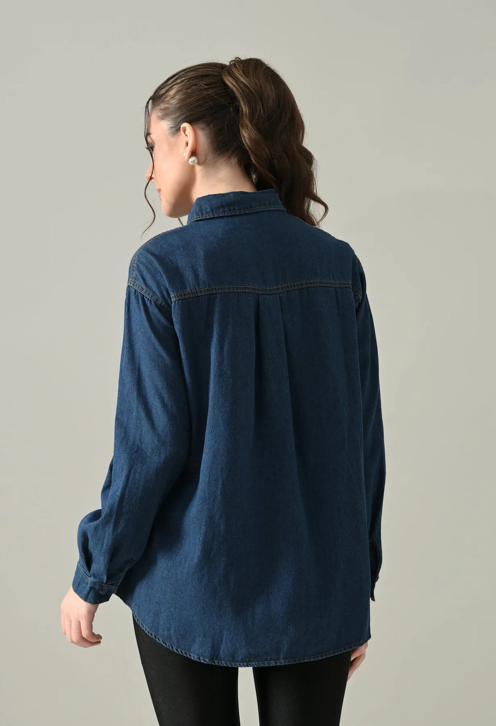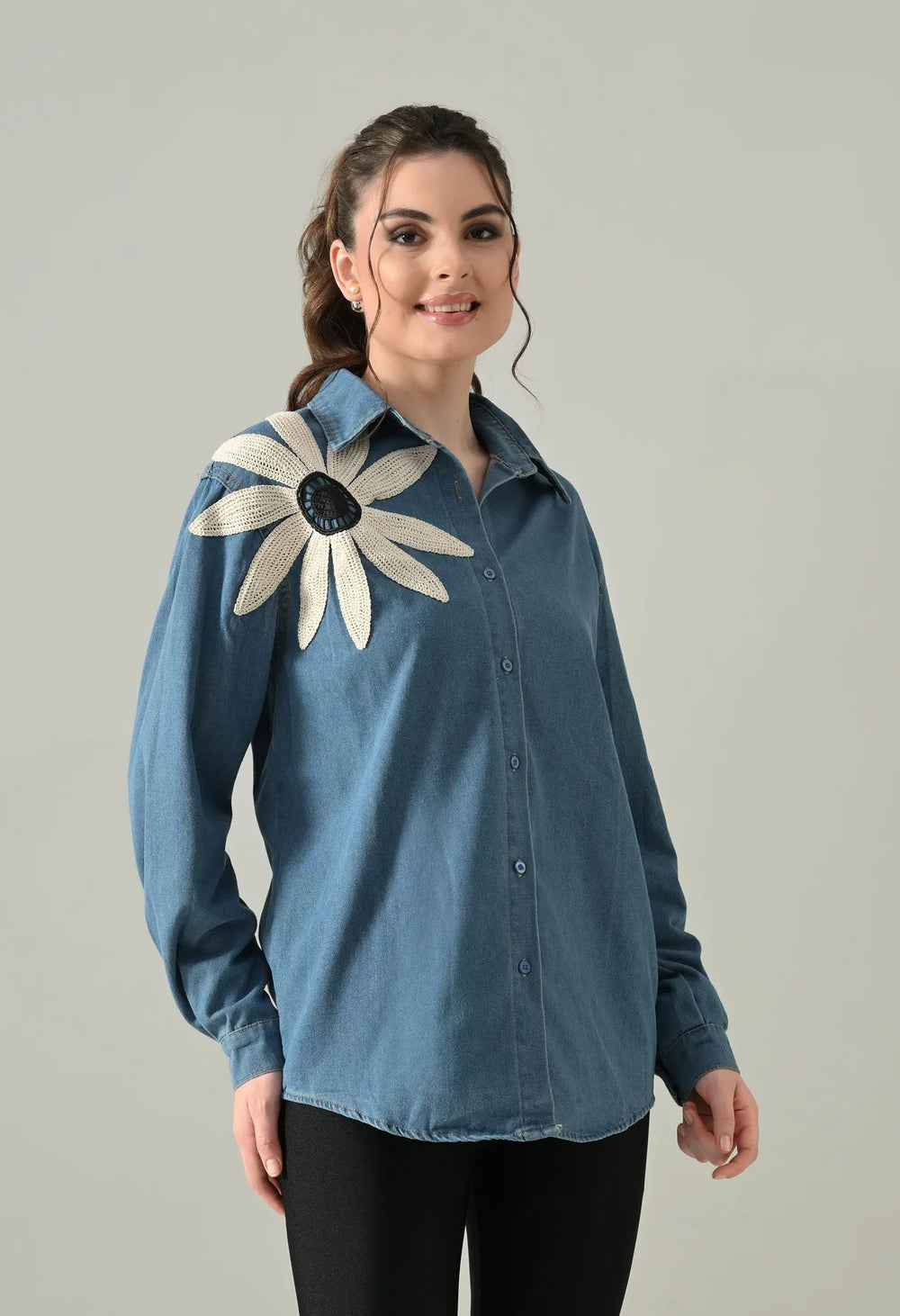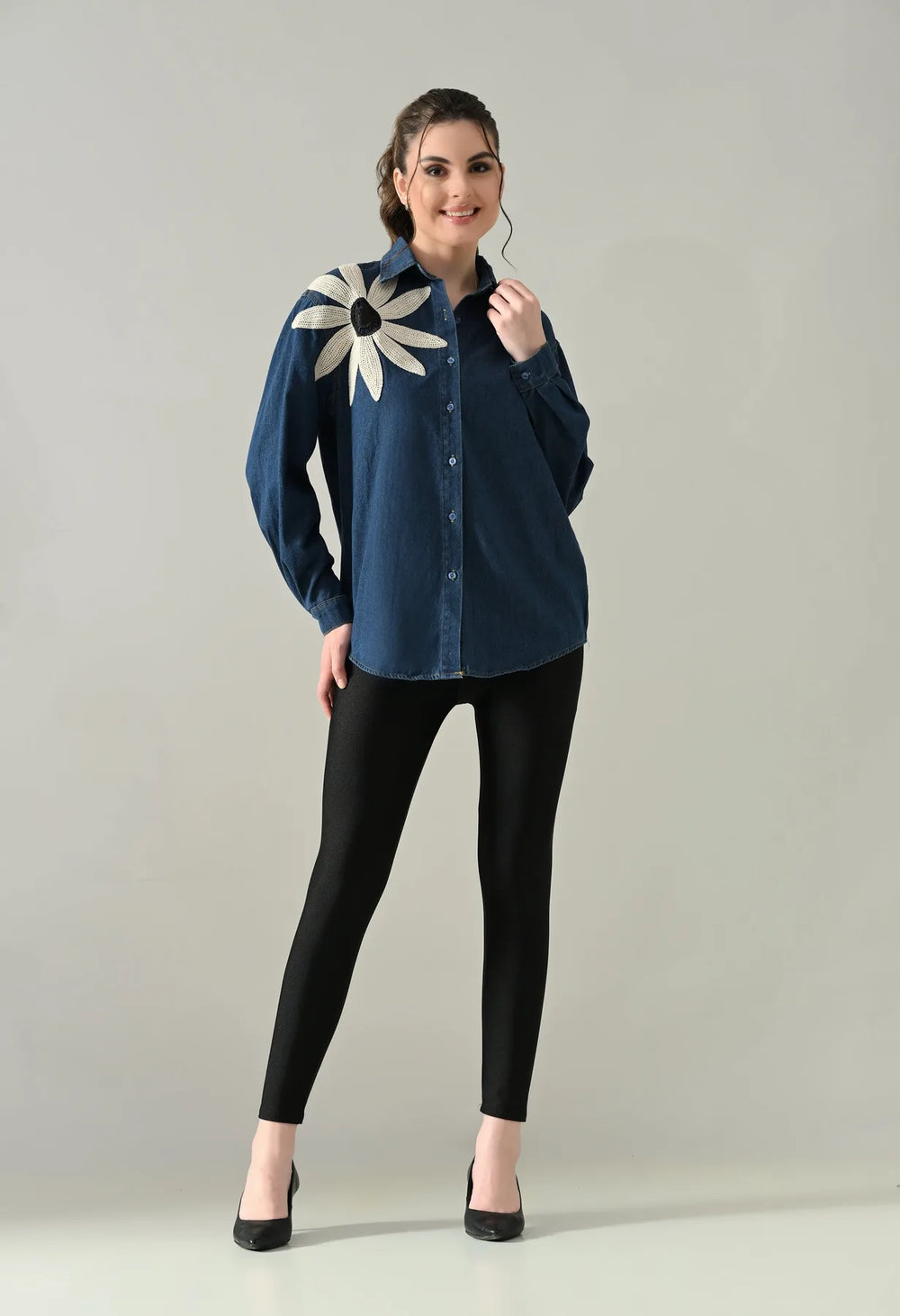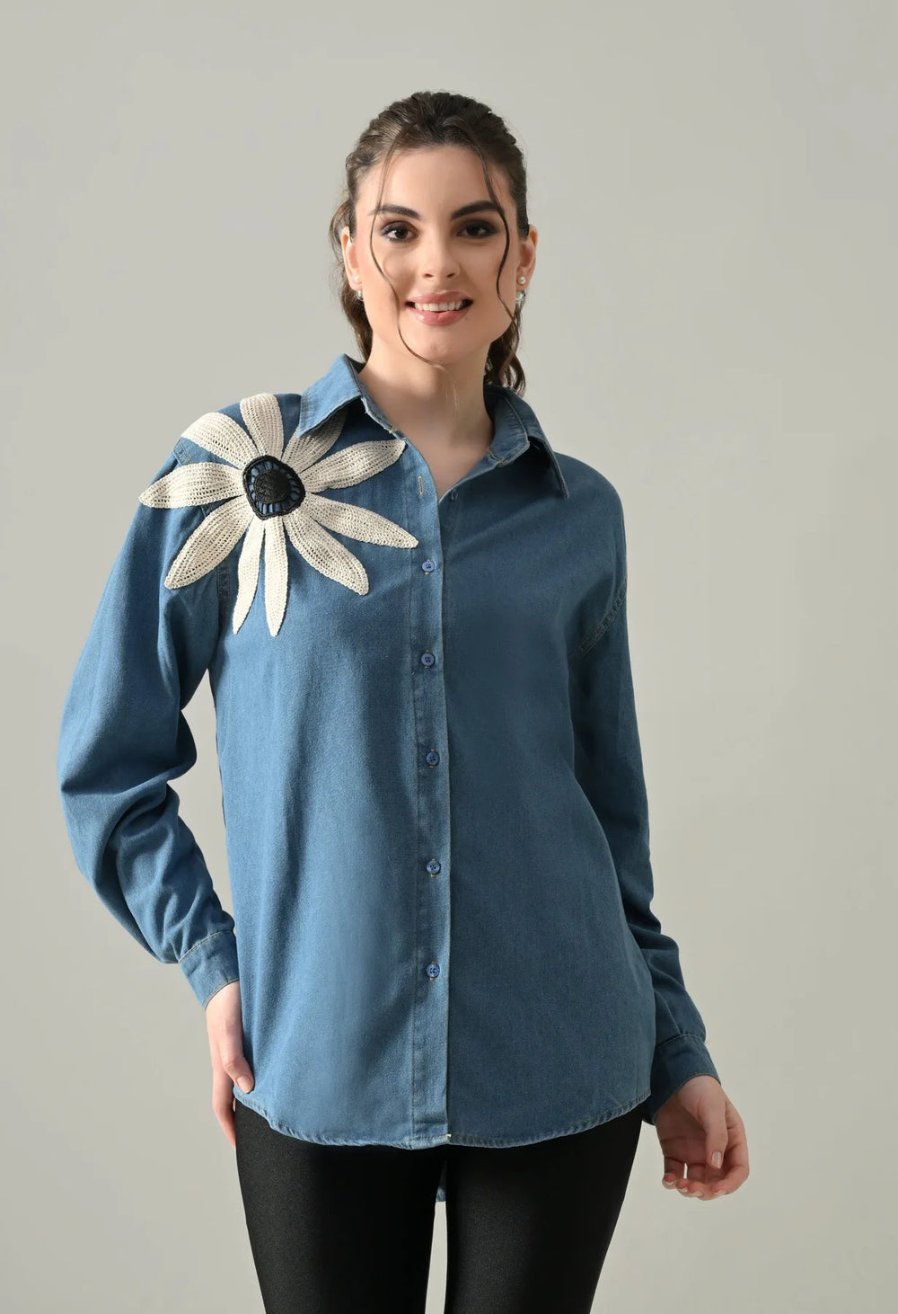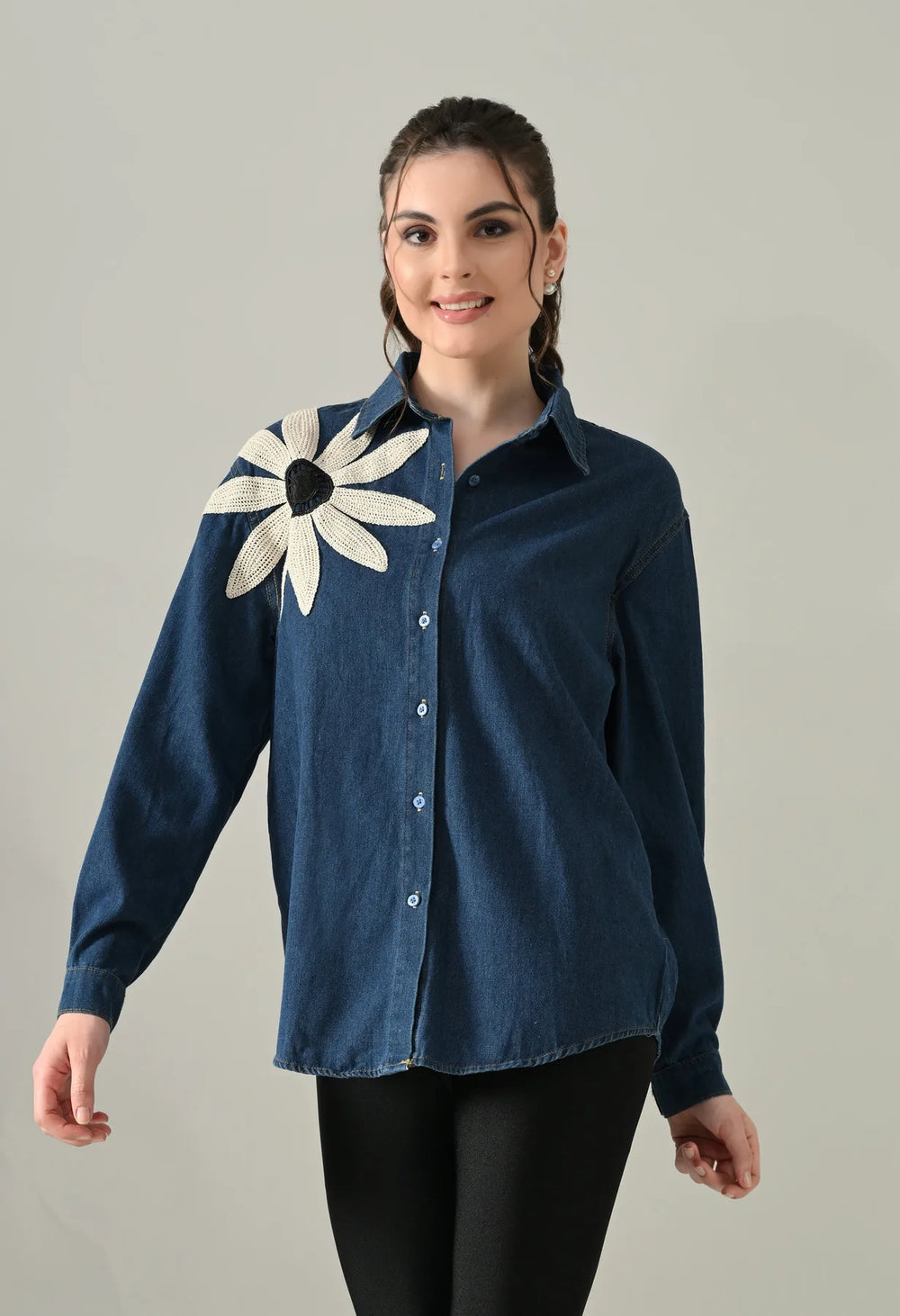 The Embroidered Denim Blossom Shirt comes in a regular loose style with a classic collar, front button opening, and full sleeves with cuff and button detail. Designed with a flattering U-hem and finished with a delicate floral patch on one side, this non-stretchable denim shirt is perfect for pairing with jeans, skirts, or layering for an effortlessly chic look.