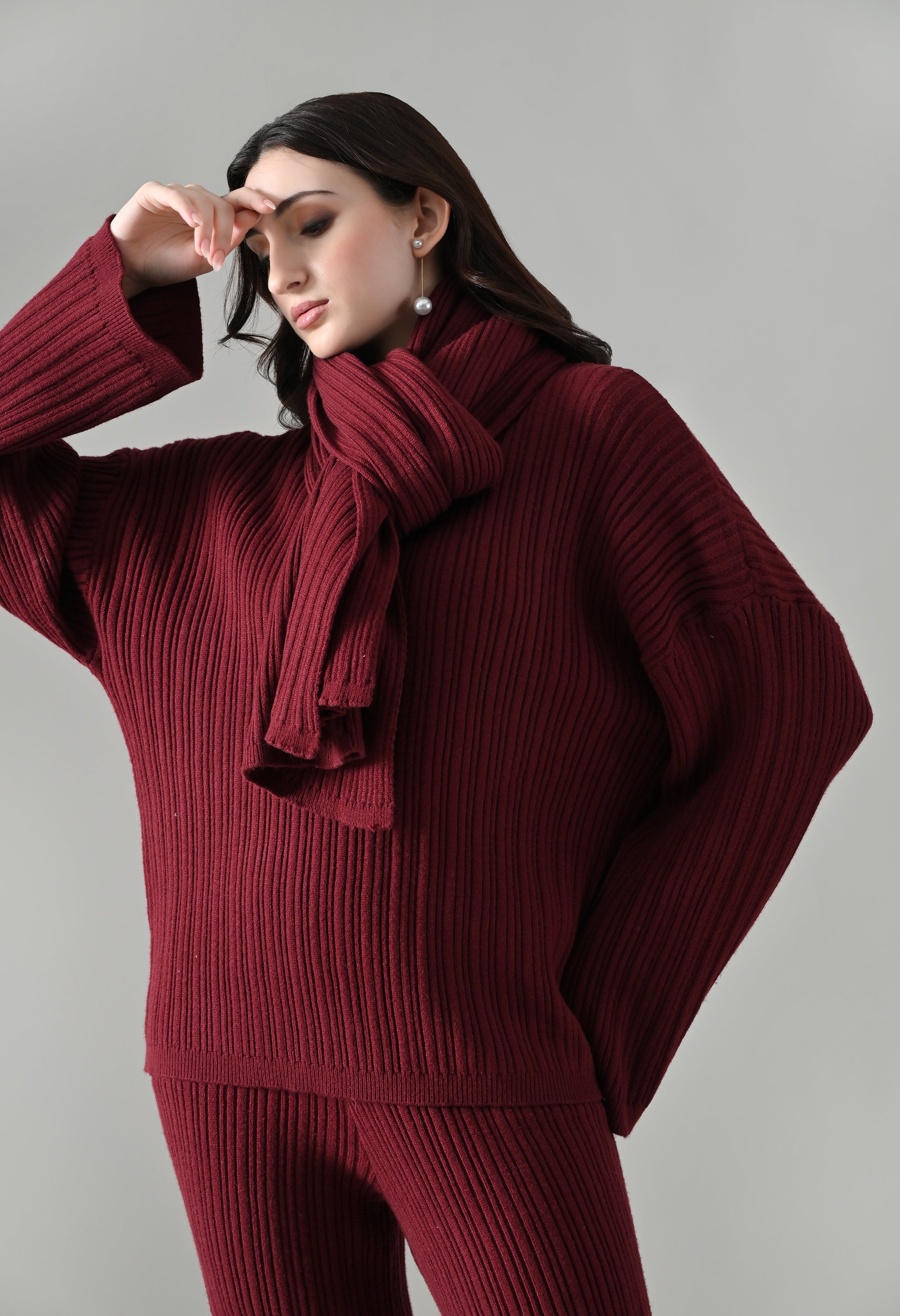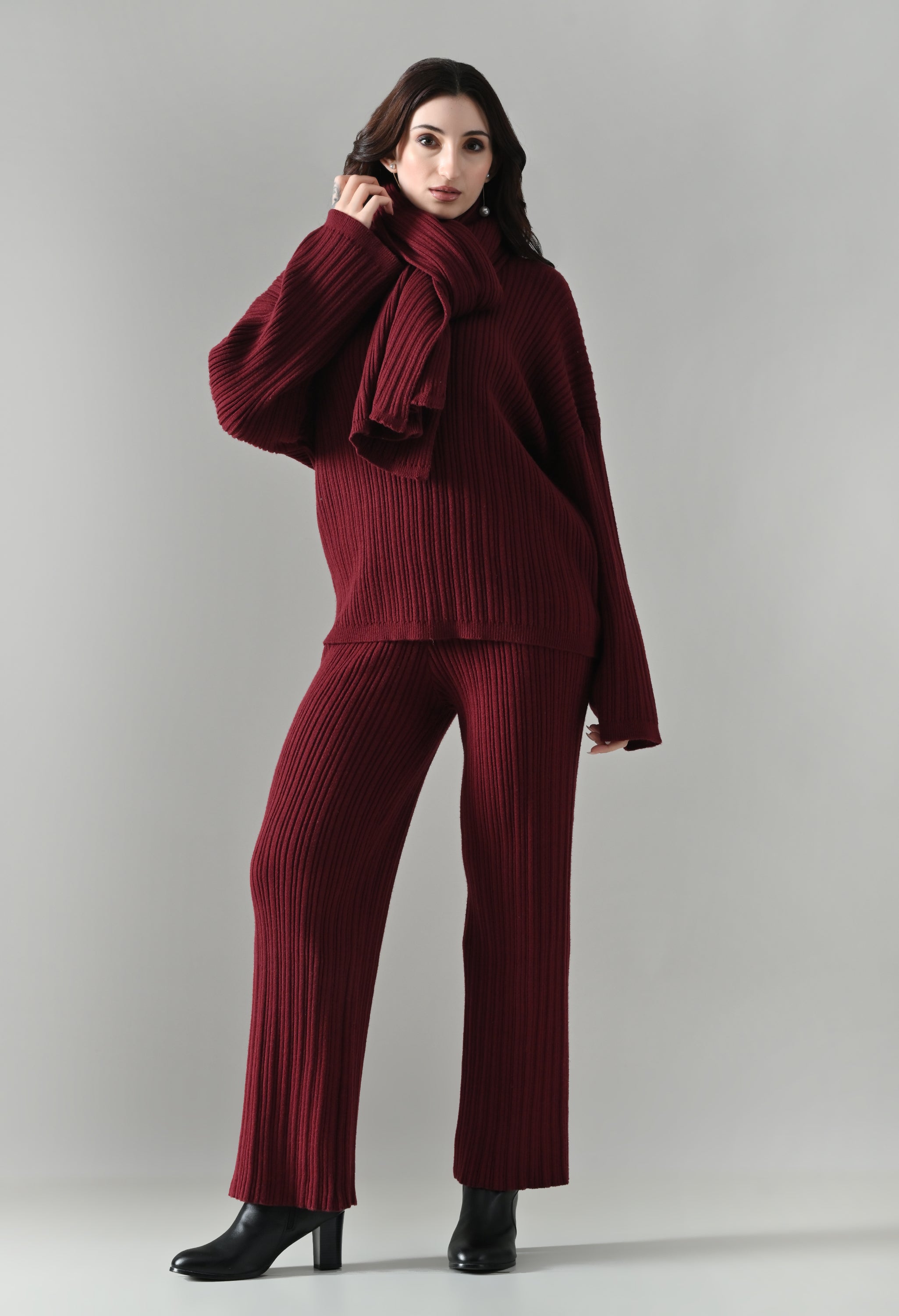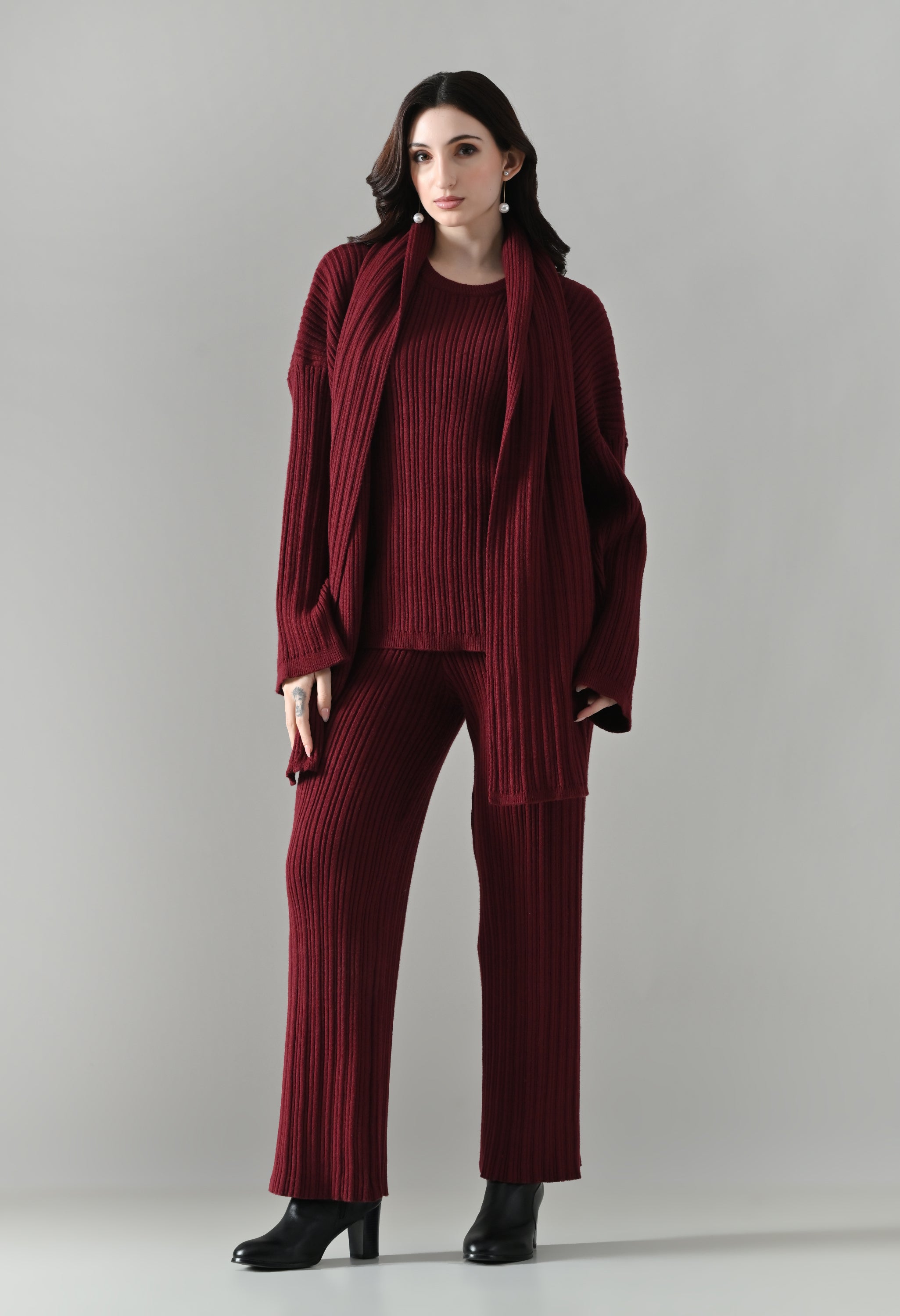 This cozy three-piece knit set includes a matching top, bottom, and muffler, designed for effortless winter comfort with a coordinated look. Crafted from a soft ribbed knit fabric, the set features a relaxed-fit top with a classic round neckline and three-quarter–length sleeves for easy, everyday wear. The matching bottoms are designed in a straight, comfortable silhouette with a clean finish, offering warmth without compromising on style. Completing the set is a coordinating ribbed muffler that adds extra coziness and a layered winter appeal. The rich solid tone enhances its versatile, lounge-to-outdoor styling potential, making it ideal for casual outings, travel, or relaxed winter days.